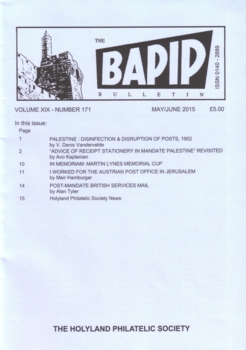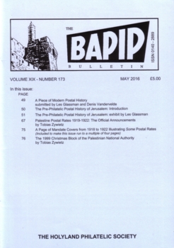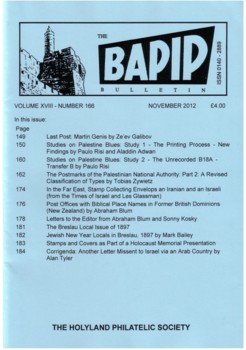 RE: BAPIP ; [request for information on triangular concession marks, project: Catalogue on Israel Military Handstamps and Postmarks] (Harris Rosenberg) | [2] | 10.180 |