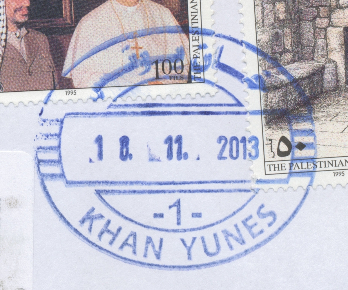 31°25' N, 34°21' E OpenStreetMap Google Maps Wikipedia | Seat of the Governorate with 49,751 inhabitants in 2006 (mid-year estimate) and 42,839 in the 1997 Census. The neighbouring refugee camp has a further 12,004 residents. The post office is situated on al-Shuhadaa street opposite the Cairo-Amman bank. The town's first post office was opened in 1948 under Egyptian rule (TPO postmark). A post office under control of the Israeli military occupation forces existed from 20.07.1967. | ||||||||||