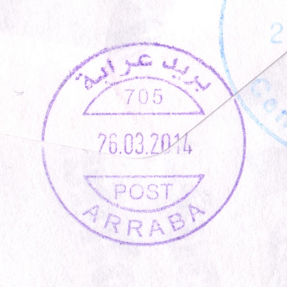 32°27' N, 35°10' E OpenStreetMap Google Maps Wikipedia | Agricultural town 13 km W of Jenin. Between the 1997 and 2007 censuses its population increased from 10,756 to 13,640. The office is opposite the municipality building. Jordanian authorities operated a post office (upgraded from a postal agency on 11.07.1960) from (?) . A post office under control of the Israeli military occupation forces existed from 3.09.1967.Surrounding office include al-Kafreyat, Arraba, Baqa esh-Sharqiyah, and Qafen. | ||||||||||