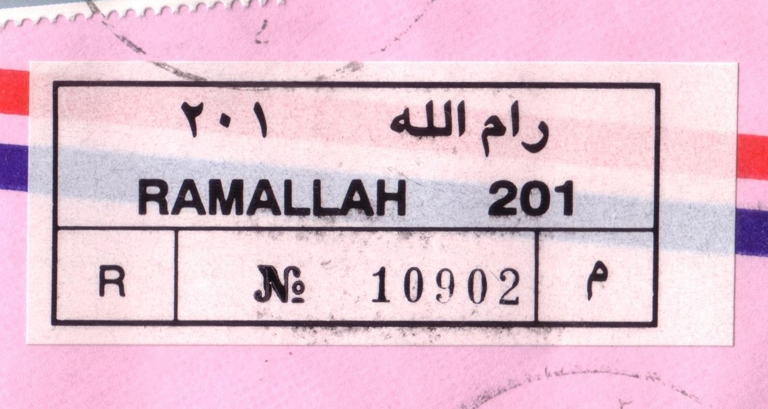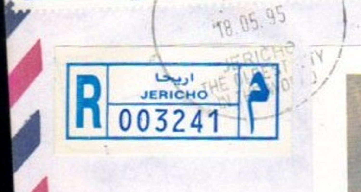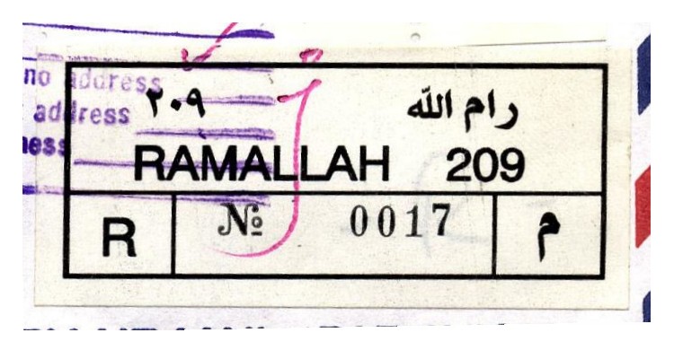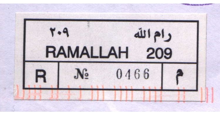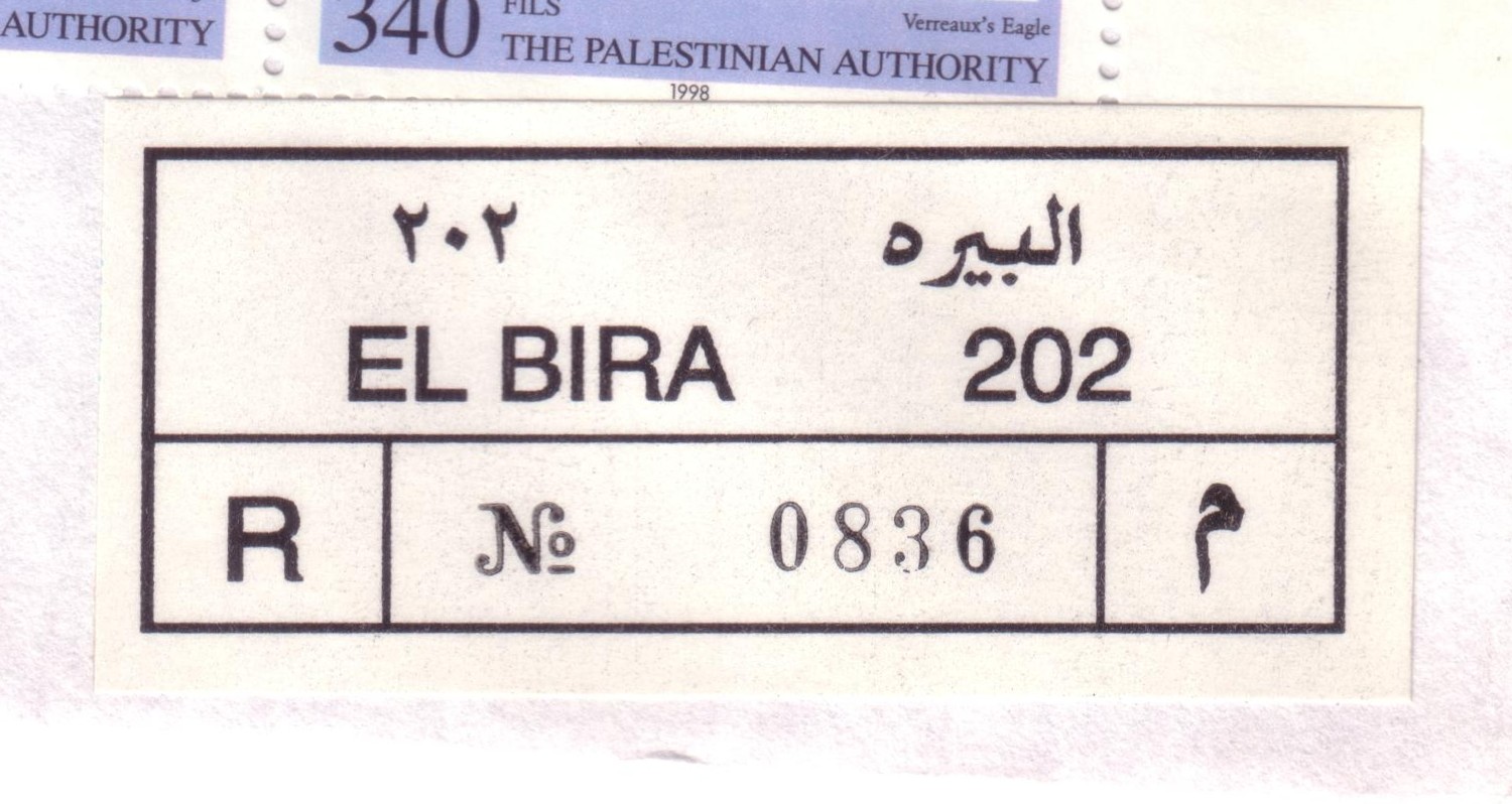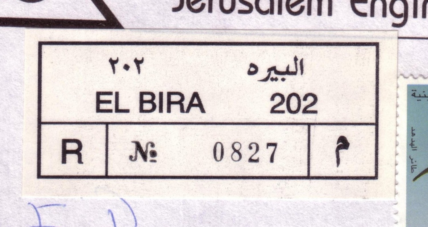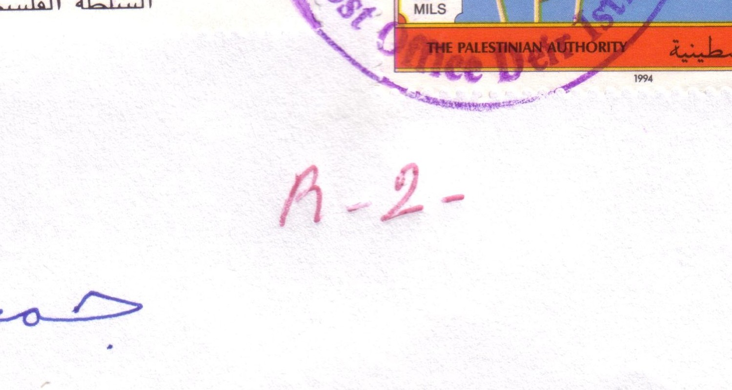 In 1995 the post offices under PNA control (ie. in the Gaza Strip and Jericho) were equipped with the B1 labels, and the newly opened offices during 1995 and 1996 in the Westbank were given labels B2, and from June 1996 A1. The former is common to both Gaza and the Westbank, whereas the latter is only used in the Westbank. Type B2x starts appearing in July 1995 in Jericho, with sporadic use only in Westbank offices (like Ramallah Central Sorting) but more widepread in the Gaza Strip. From June 1997, the A2 labels appear in smaller, often newly established offices, in Westbank towns. Use of A2 (apart from a few instances) ends in 1999.