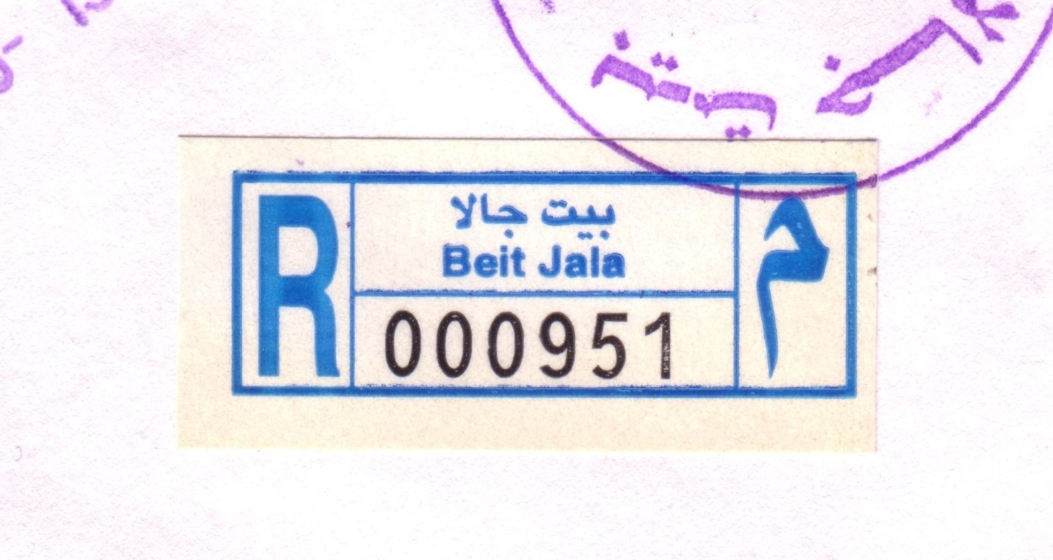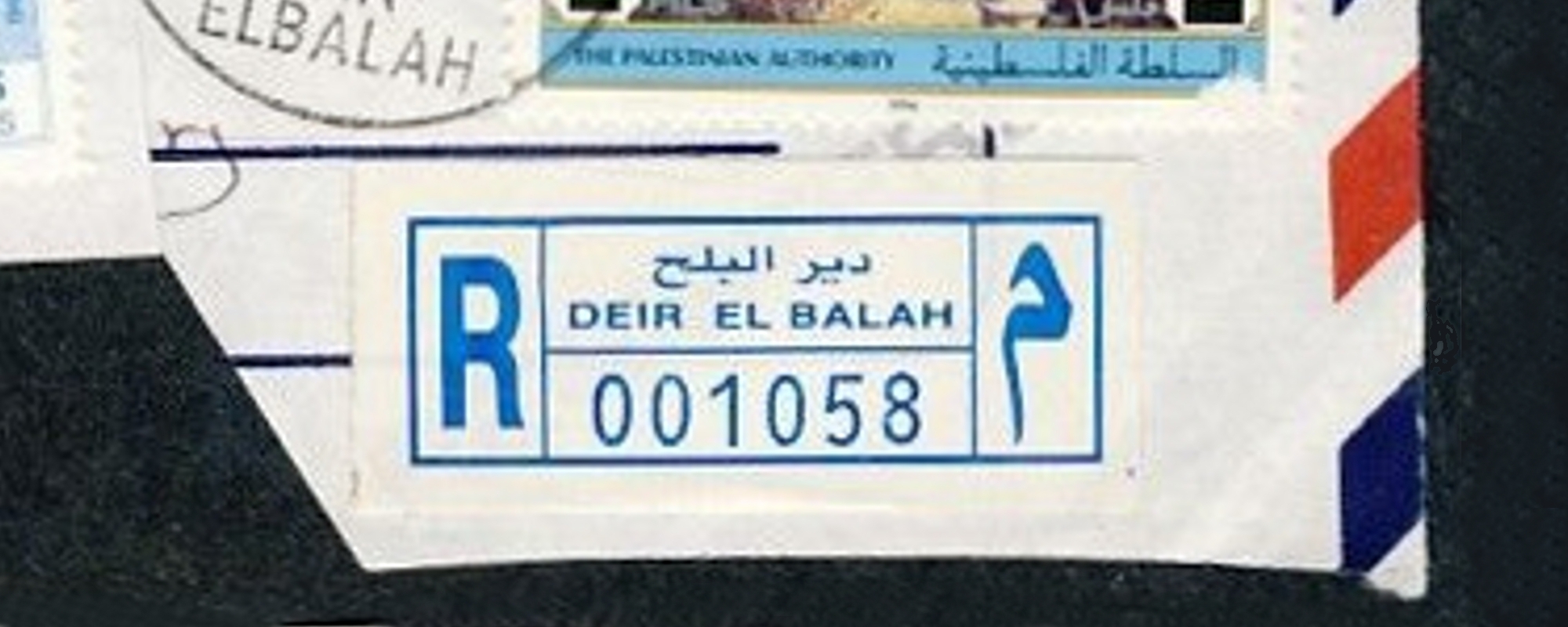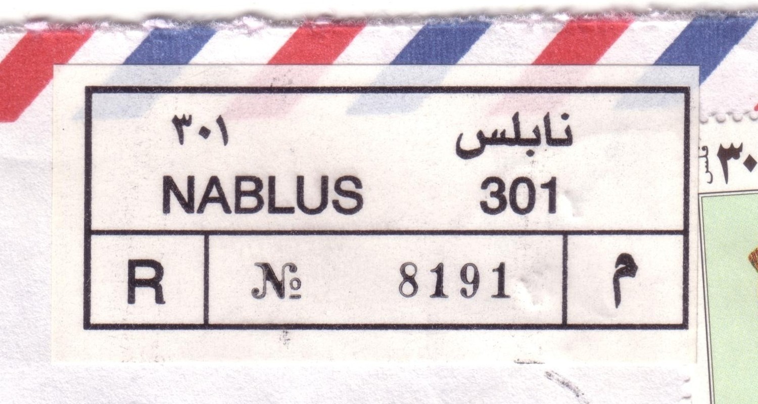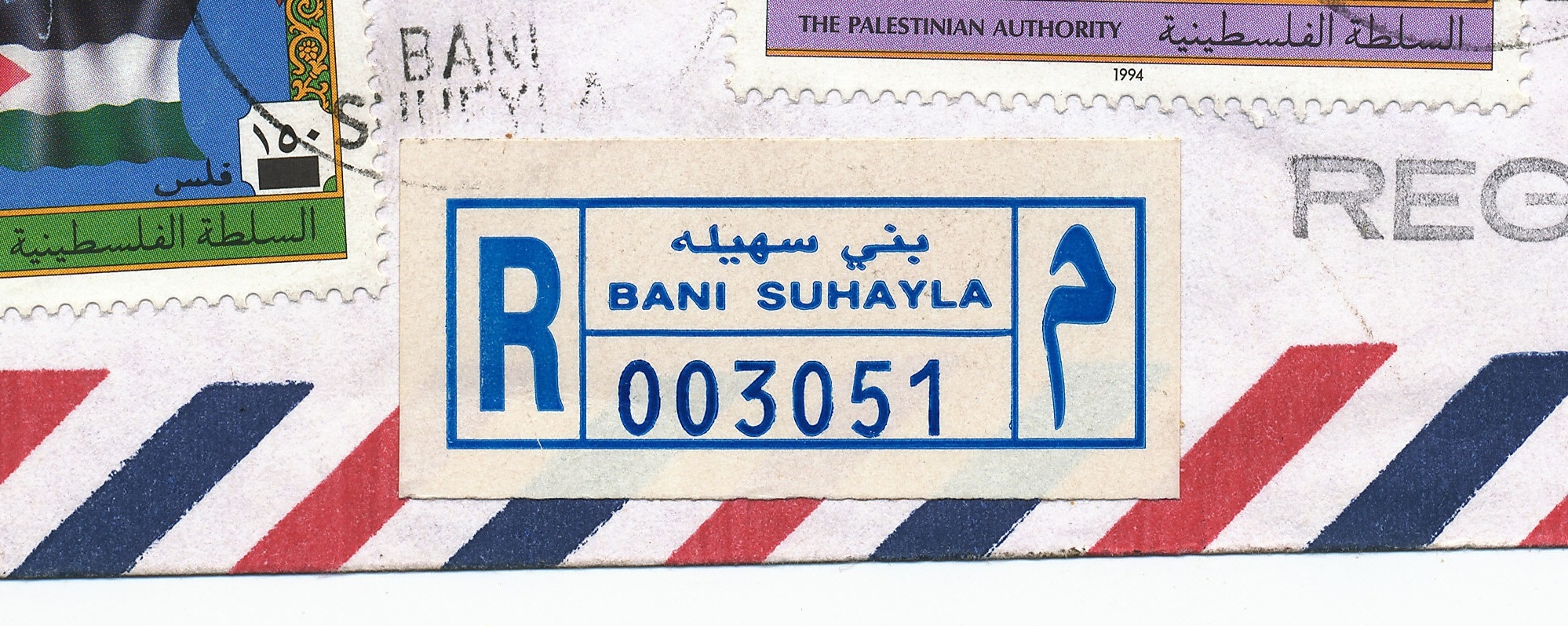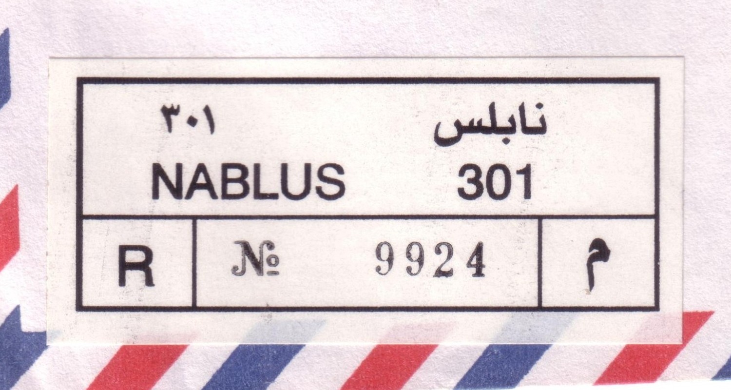 In 1995 the post offices under PNA control (ie. in the Gaza Strip and Jericho) were equipped with the B1 labels, and the newly opened offices during 1995 and 1996 in the Westbank were given labels B2, and from June 1996 A1. The former is common to both Gaza and the Westbank, whereas the latter is only used in the Westbank. Type B2x starts appearing in July 1995 in Jericho, with sporadic use only in Westbank offices (like Ramallah Central Sorting) but more widepread in the Gaza Strip. From June 1997, the A2 labels appear in smaller, often newly established offices, in Westbank towns. Use of A2 (apart from a few instances) ends in 1999.