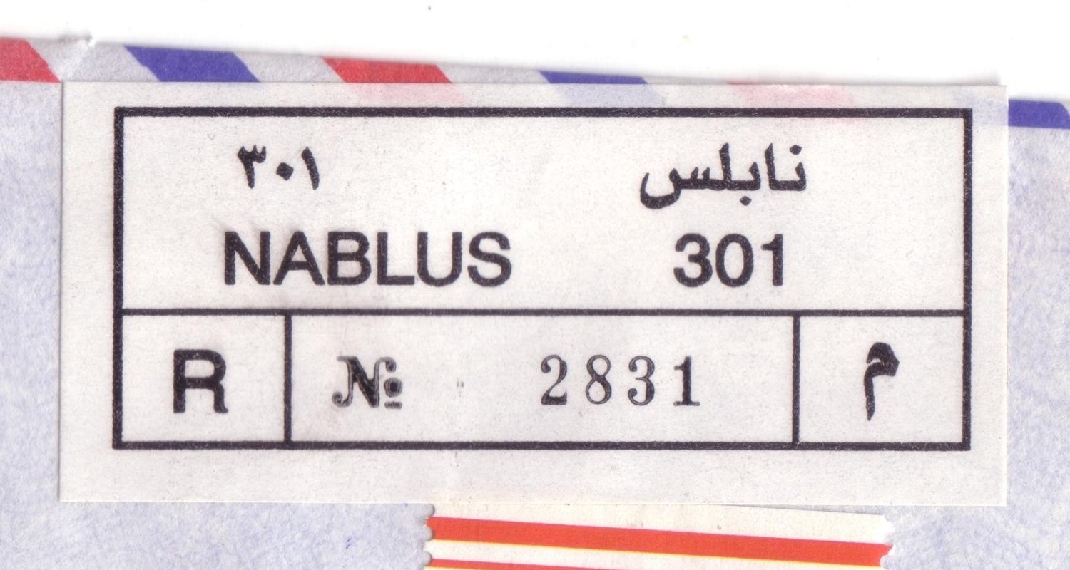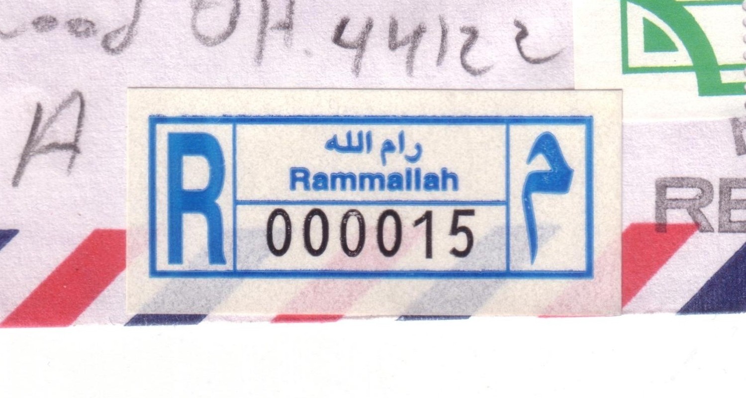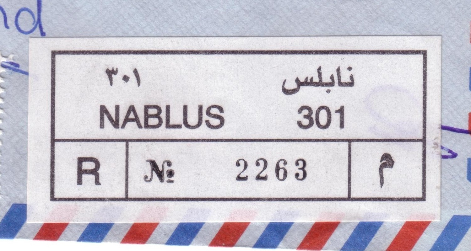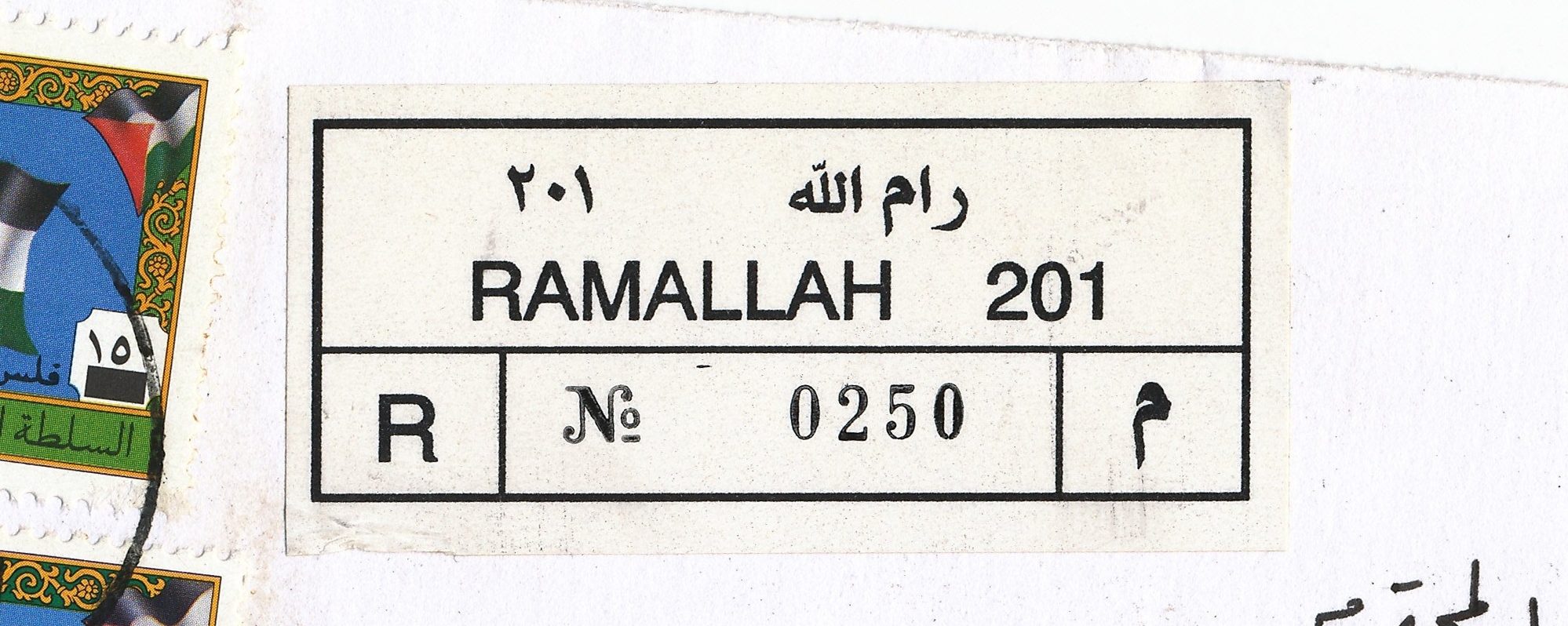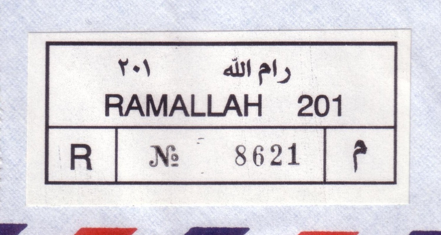 In 1995 the post offices under PNA control (ie. in the Gaza Strip and Jericho) were equipped with the B1 labels, and the newly opened offices during 1995 and 1996 in the Westbank were given labels B2, and from June 1996 A1. The former is common to both Gaza and the Westbank, whereas the latter is only used in the Westbank. Type B2x starts appearing in July 1995 in Jericho, with sporadic use only in Westbank offices (like Ramallah Central Sorting) but more widepread in the Gaza Strip. From June 1997, the A2 labels appear in smaller, often newly established offices, in Westbank towns. Use of A2 (apart from a few instances) ends in 1999.