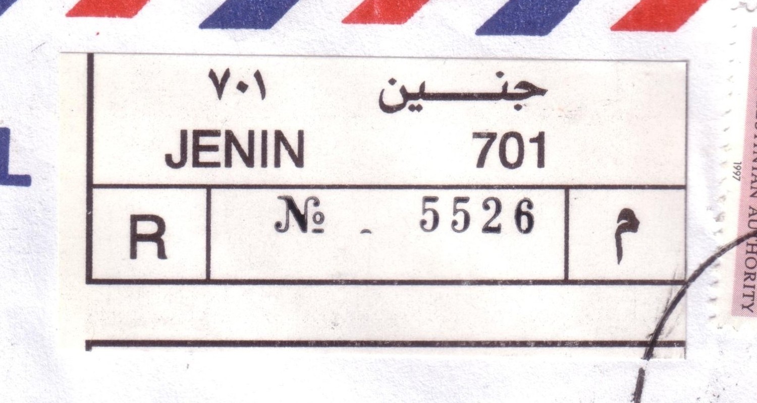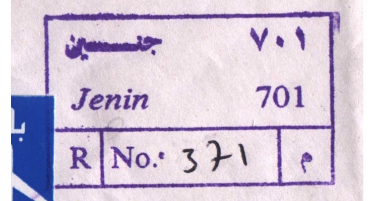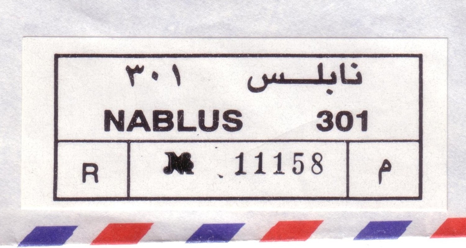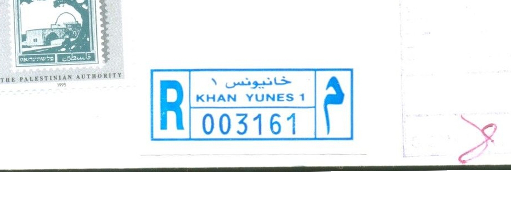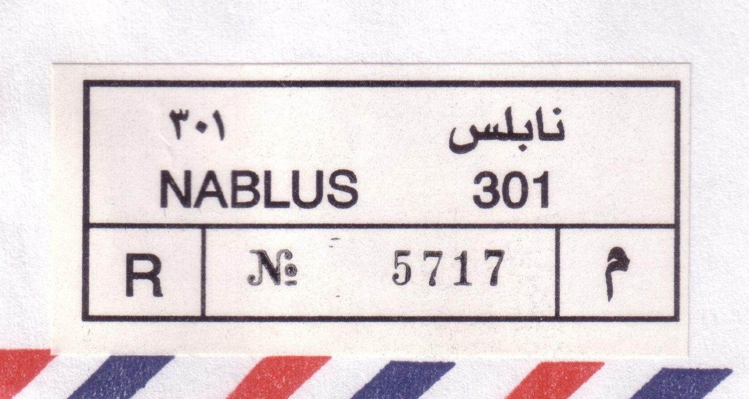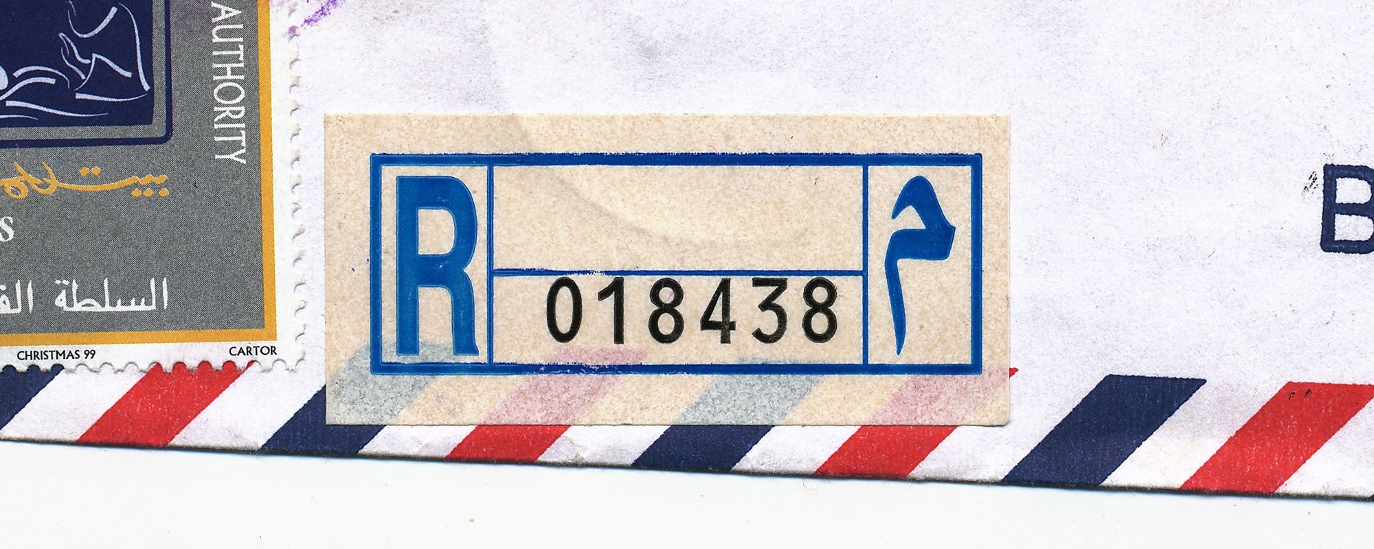 In 1995 the post offices under PNA control (ie. in the Gaza Strip and Jericho) were equipped with the B1 labels, and the newly opened offices during 1995 and 1996 in the Westbank were given labels B2, and from June 1996 A1. The former is common to both Gaza and the Westbank, whereas the latter is only used in the Westbank. Type B2x starts appearing in July 1995 in Jericho, with sporadic use only in Westbank offices (like Ramallah Central Sorting) but more widepread in the Gaza Strip. From June 1997, the A2 labels appear in smaller, often newly established offices, in Westbank towns. Use of A2 (apart from a few instances) ends in 1999.