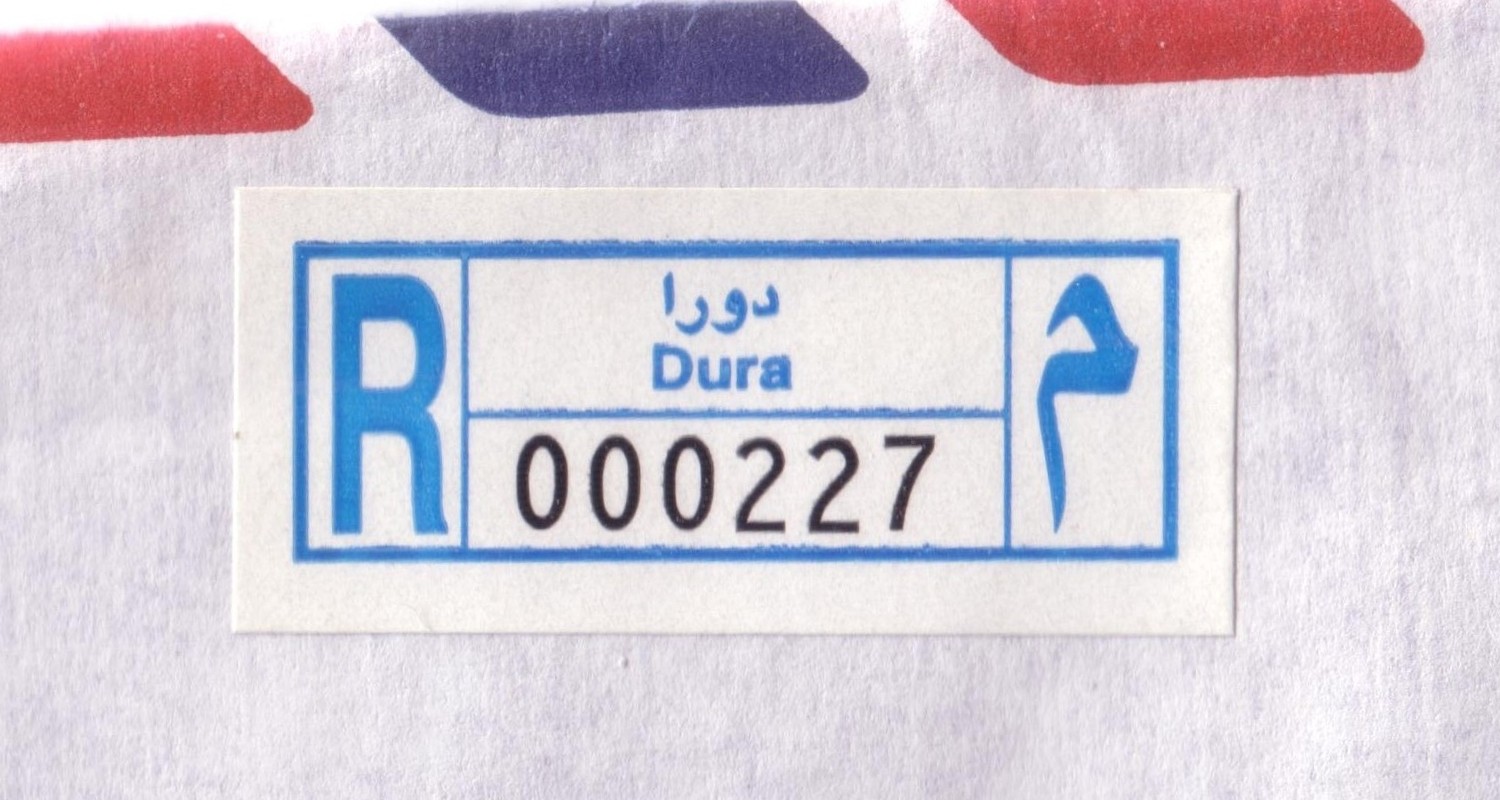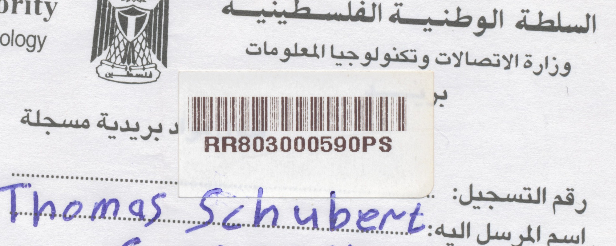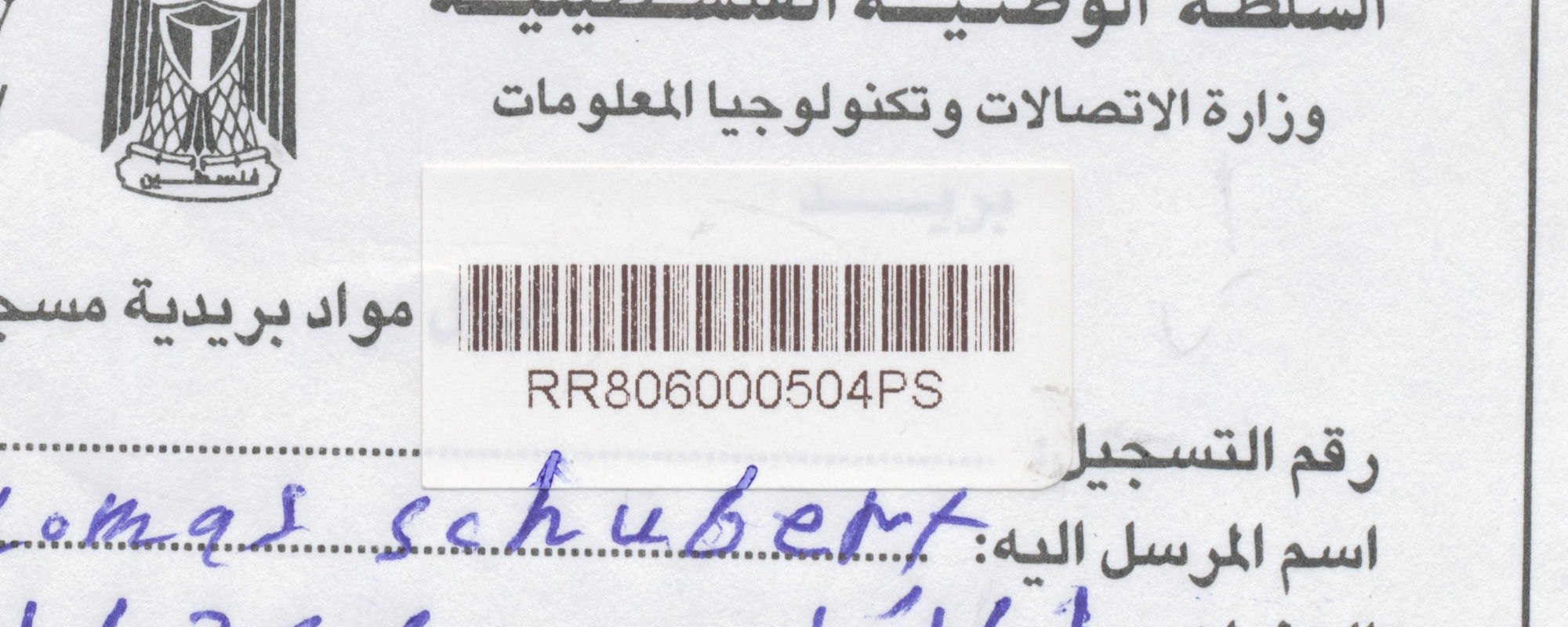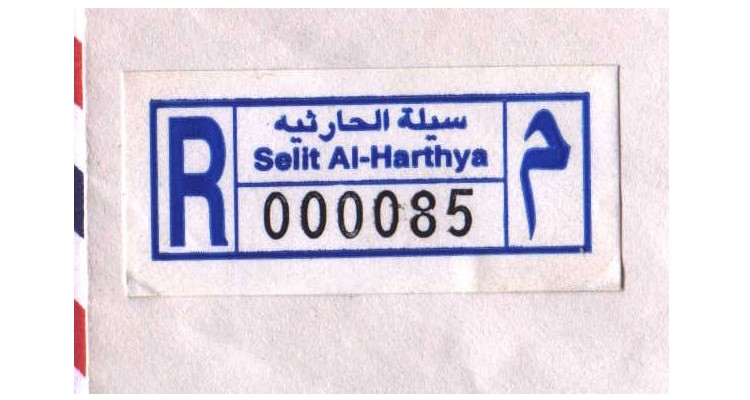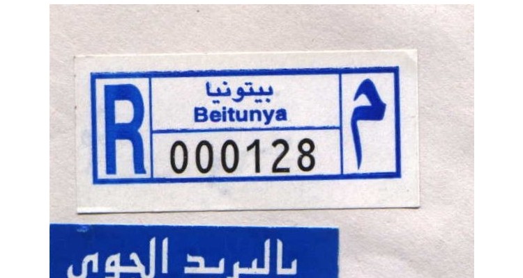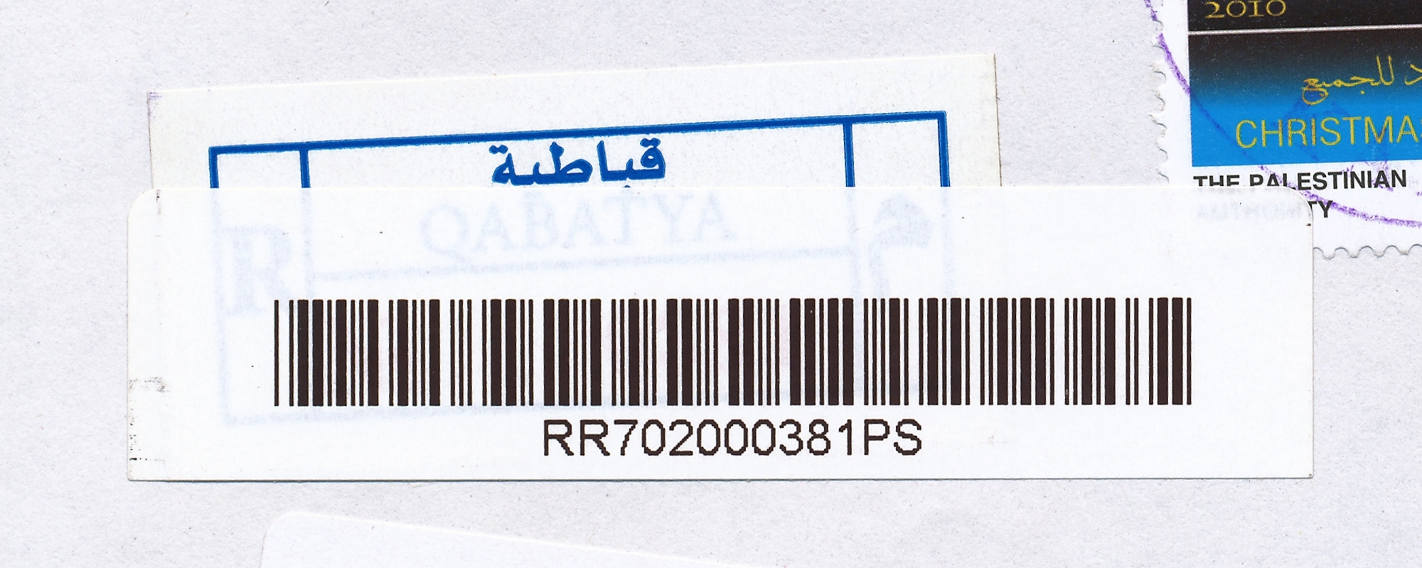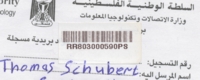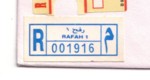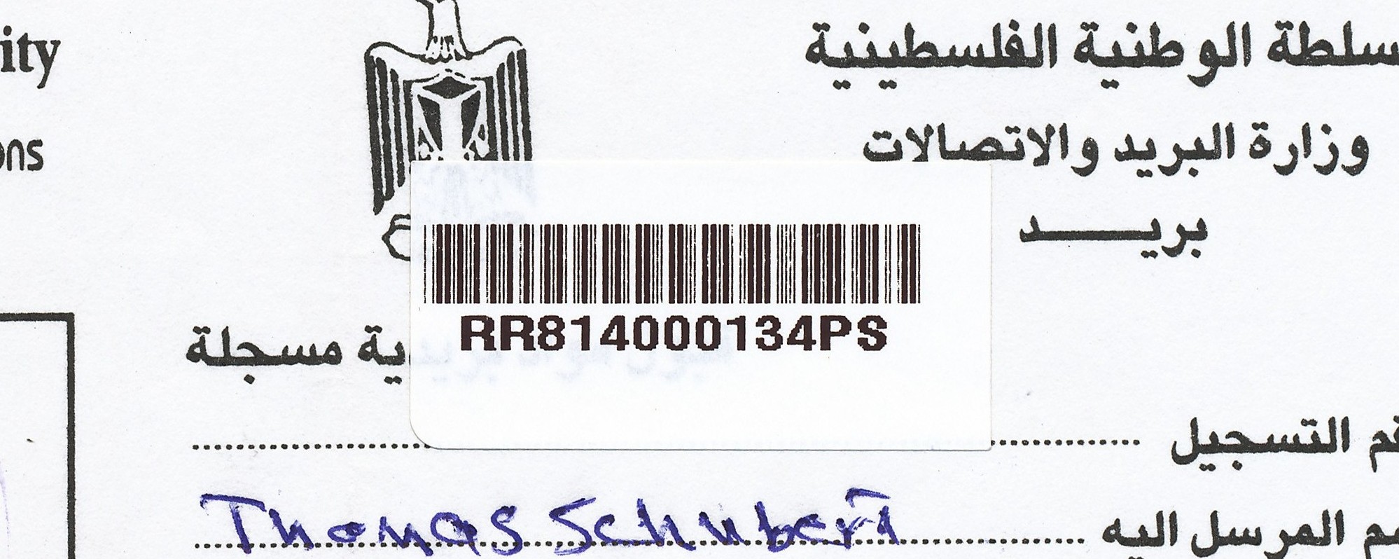 In March 2011, the Westbank's Palestine Post introduced the UPU software package "IPS Light" which resulted in the switch to computer-printed barcode labels (type D). In an early phase labels (types D1, D3, and D2) are applied at either head POs or central sorting as not all offices had yet been connected to the new system. Smaller offices actually apply old labels (mainly type B4), which are then labelled-over with IPS labels bearing a corresponding number. At some offices not supplied with 'old' labels a handwritten registration number sometimes appears besides the label itself.