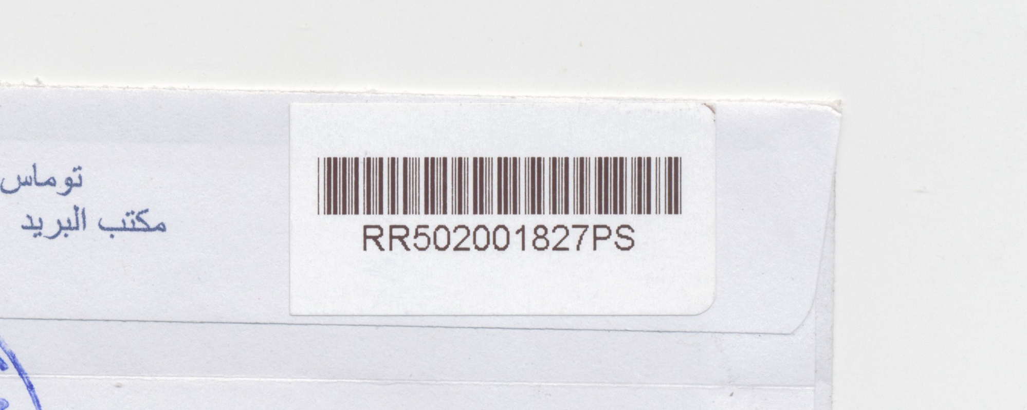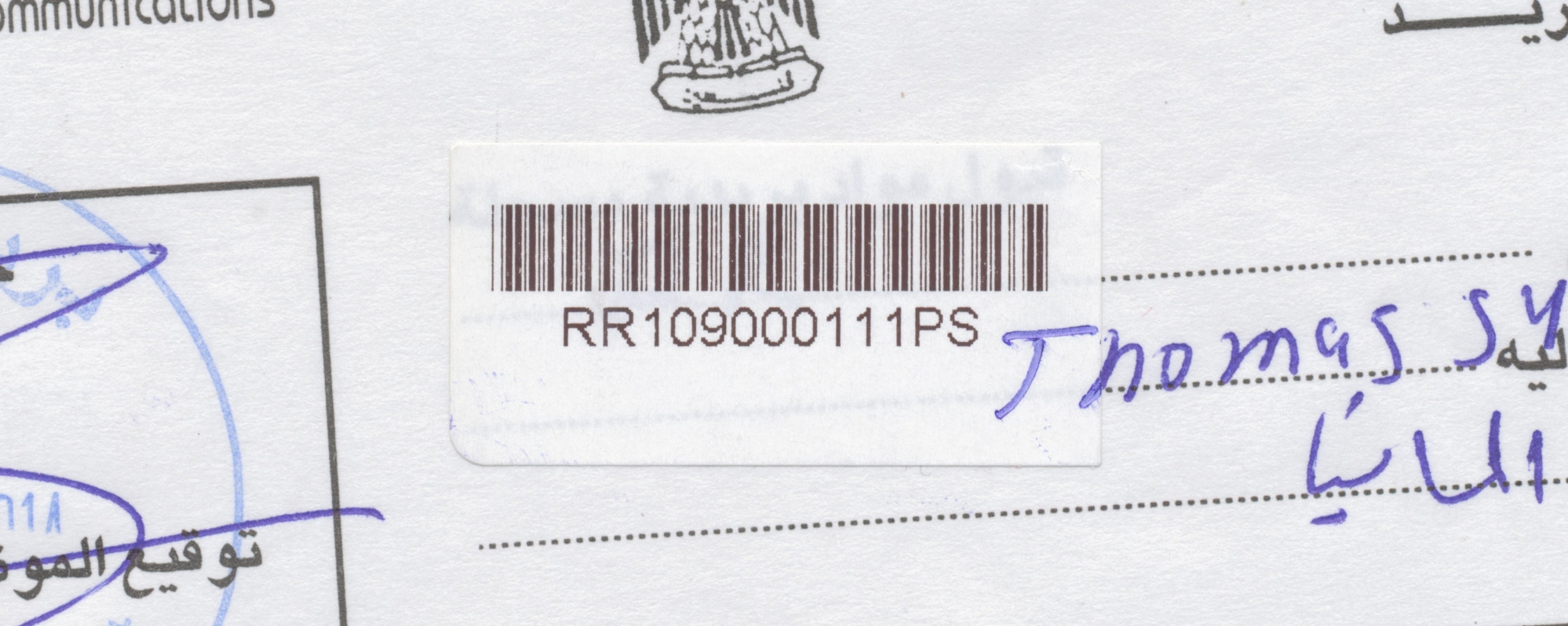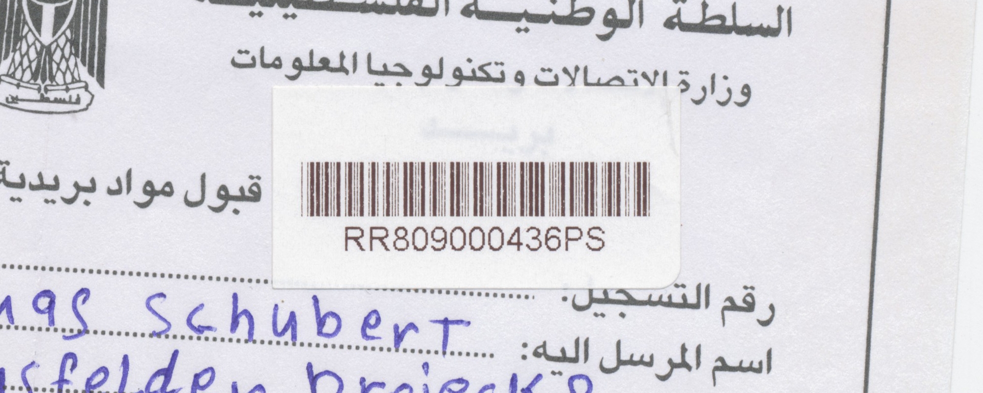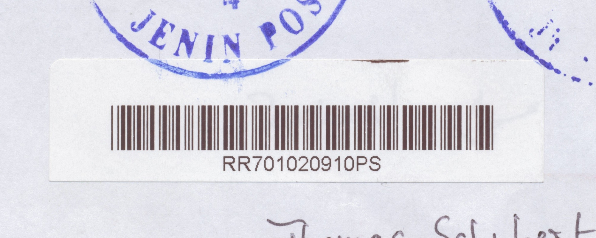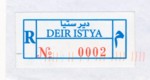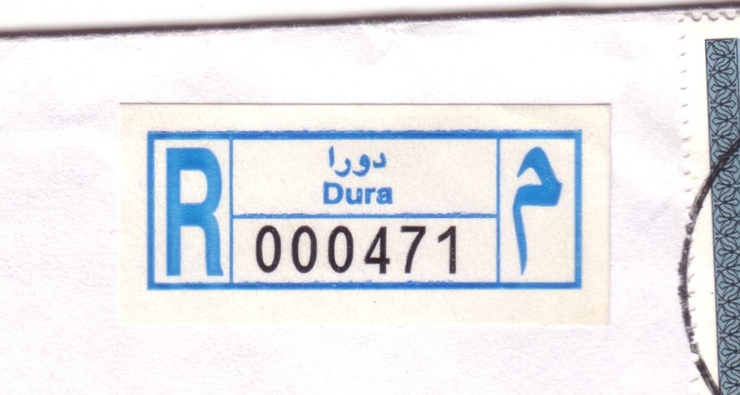 In March 2011, the Westbank's Palestine Post introduced the UPU software package "IPS Light" which resulted in the switch to computer-printed barcode labels (type D). In an early phase labels (types D1, D3, and D2) are applied at either head POs or central sorting as not all offices had yet been connected to the new system. Smaller offices actually apply old labels (mainly type B4), which are then labelled-over with IPS labels bearing a corresponding number. At some offices not supplied with 'old' labels a handwritten registration number sometimes appears besides the label itself.