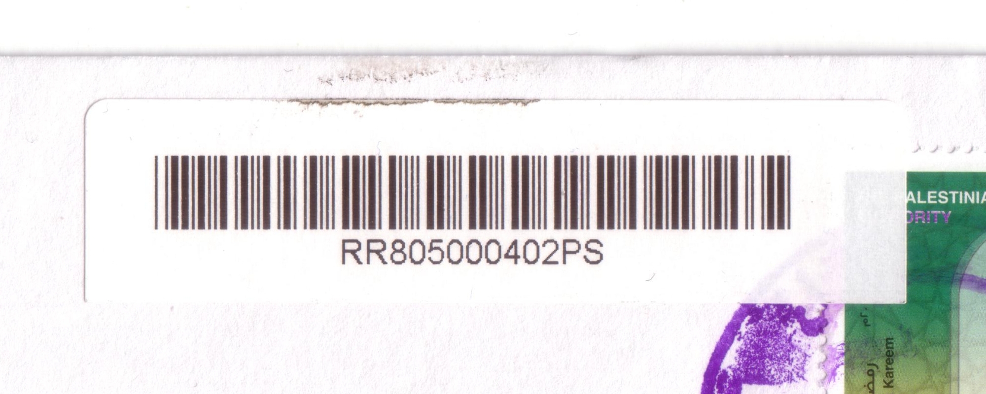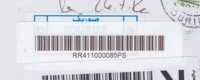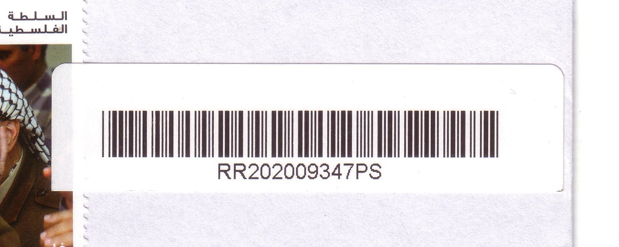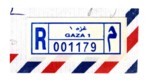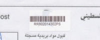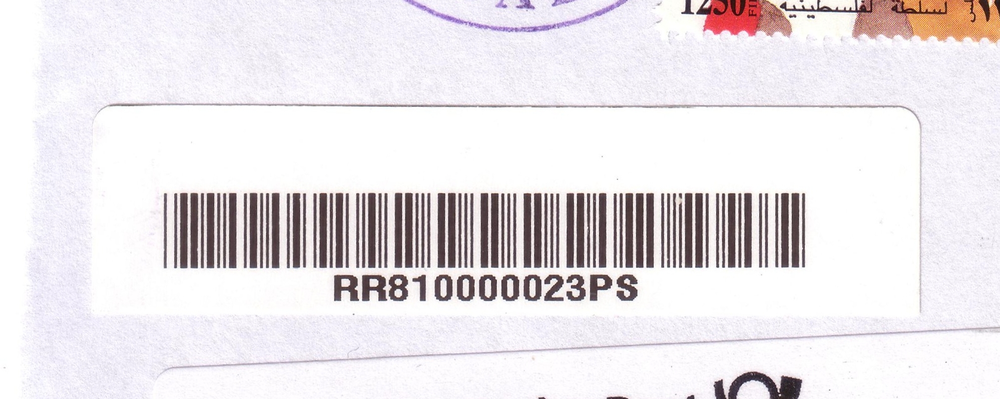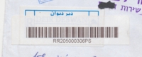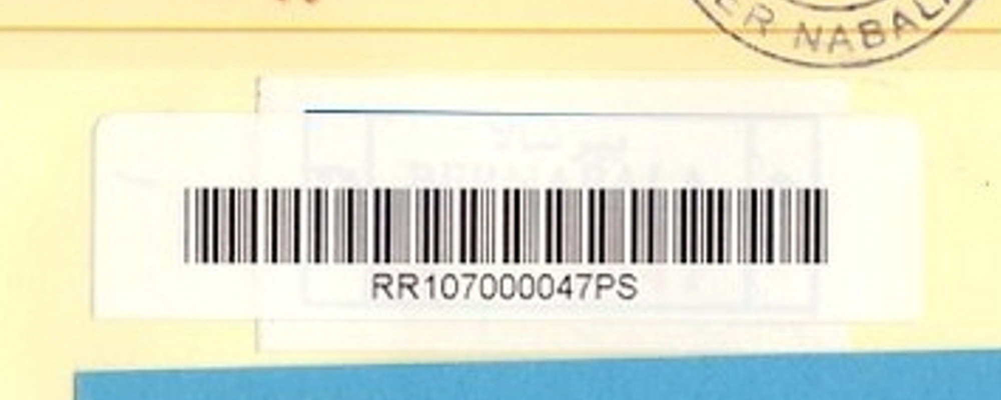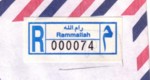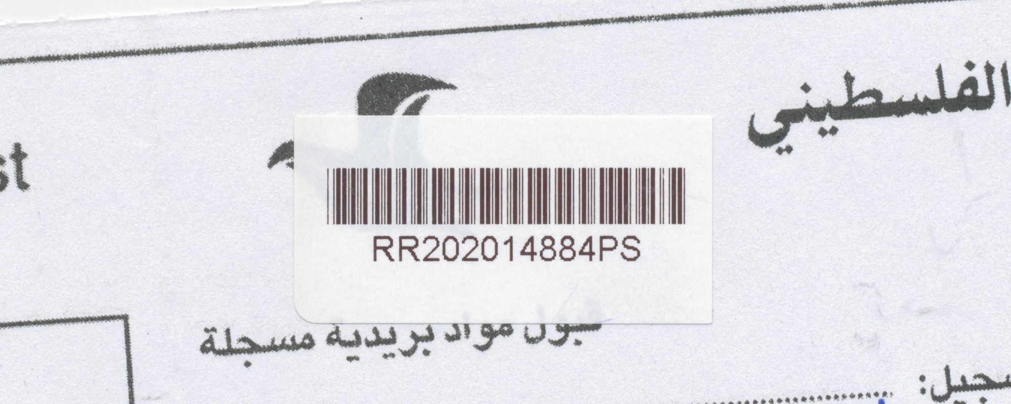 - white self-adhesive labels, printed in black. "IPS Light" linear barcode. With or without "Palestine Post" on top of imprinted numerator (9 digits) with prefixed RR and suffixed PS or ps. Label size varies.
