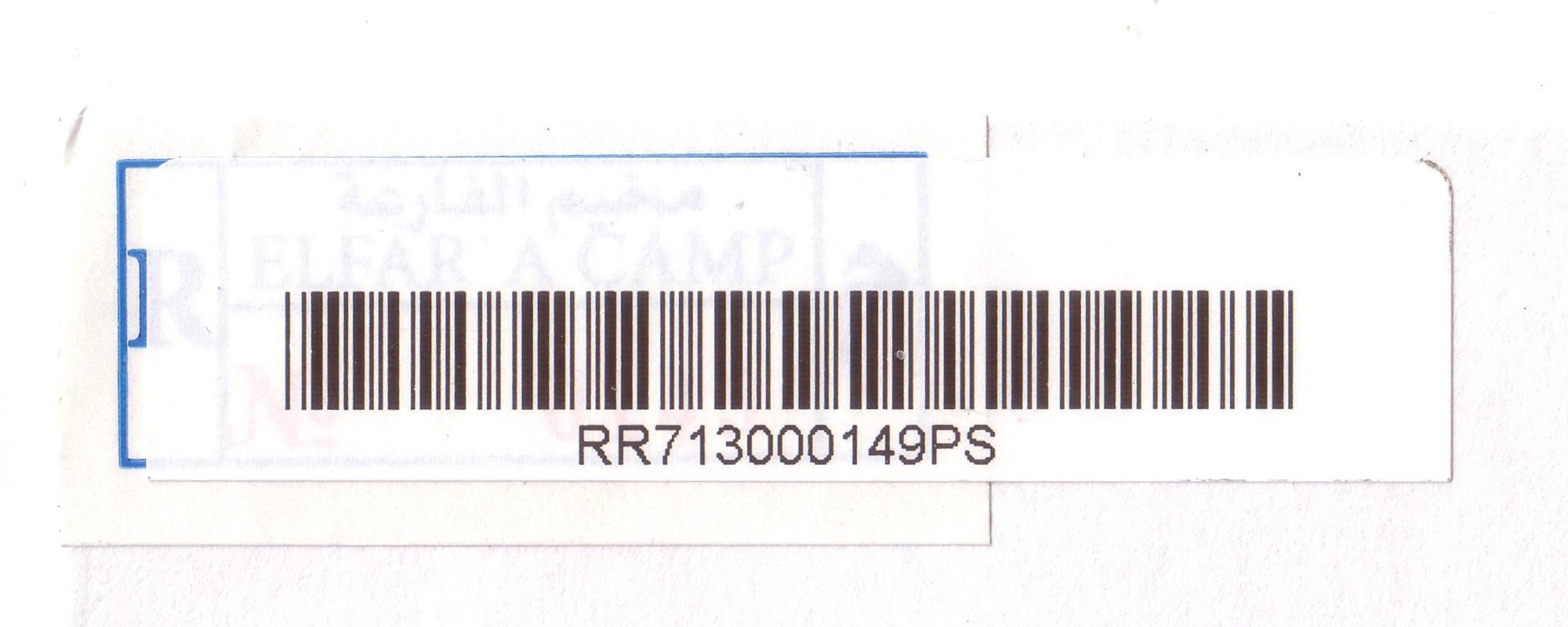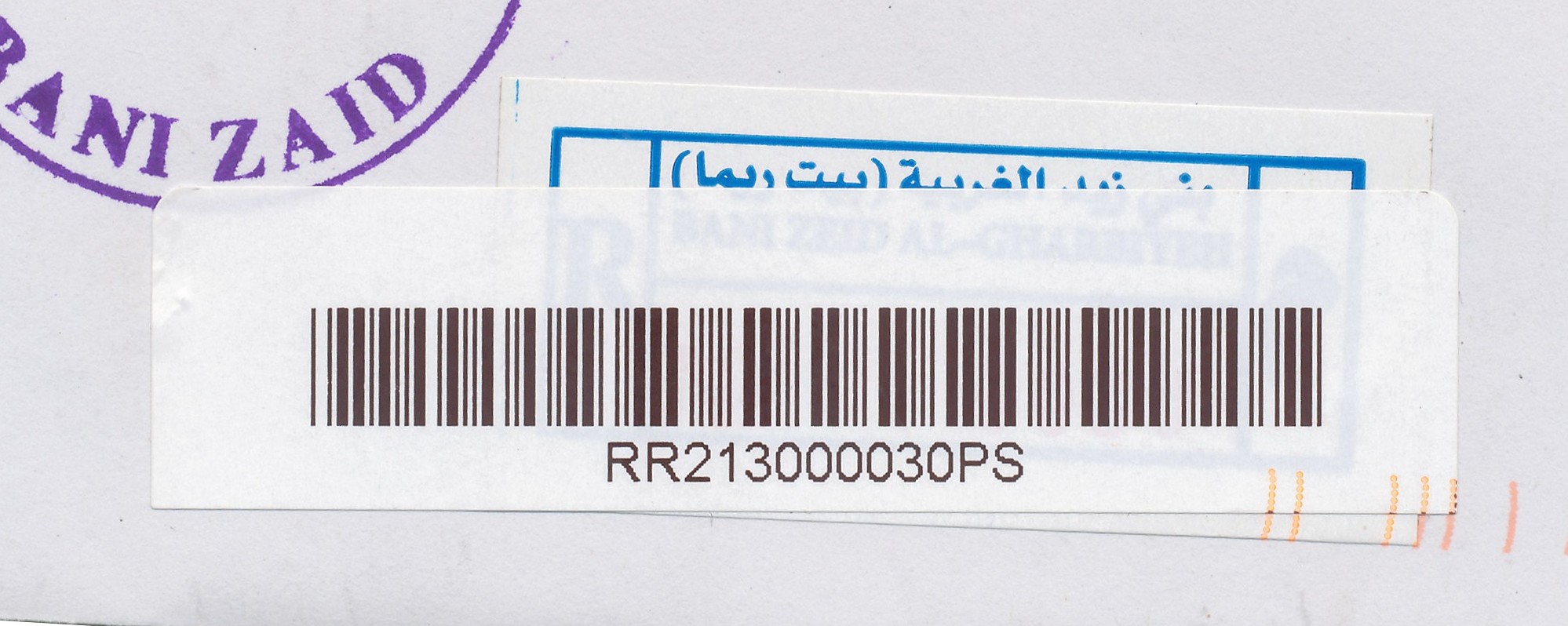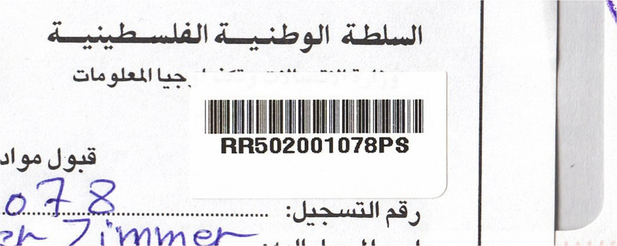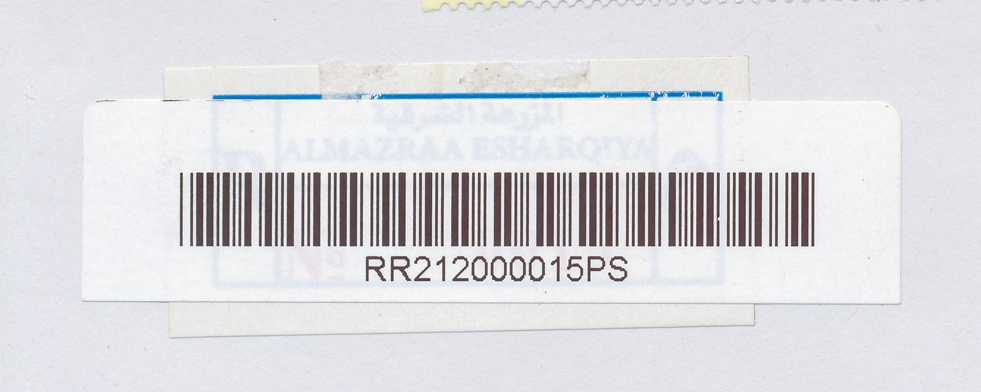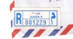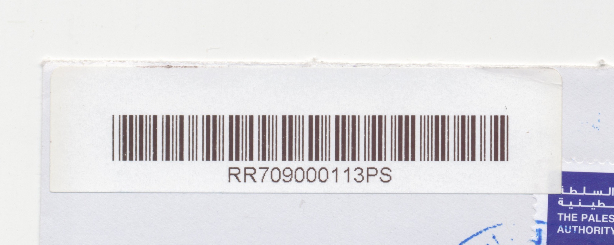 - white self-adhesive labels, printed in black. "IPS Light" linear barcode. With or without "Palestine Post" on top of imprinted numerator (9 digits) with prefixed RR and suffixed PS or ps. Label size varies.