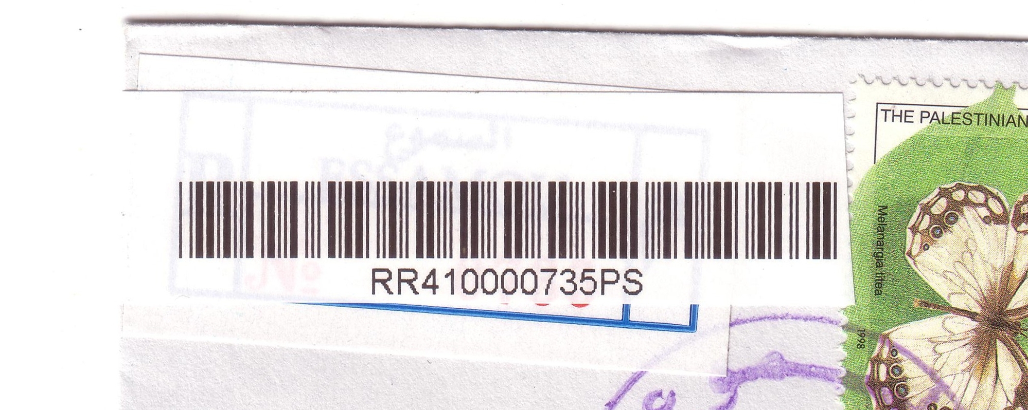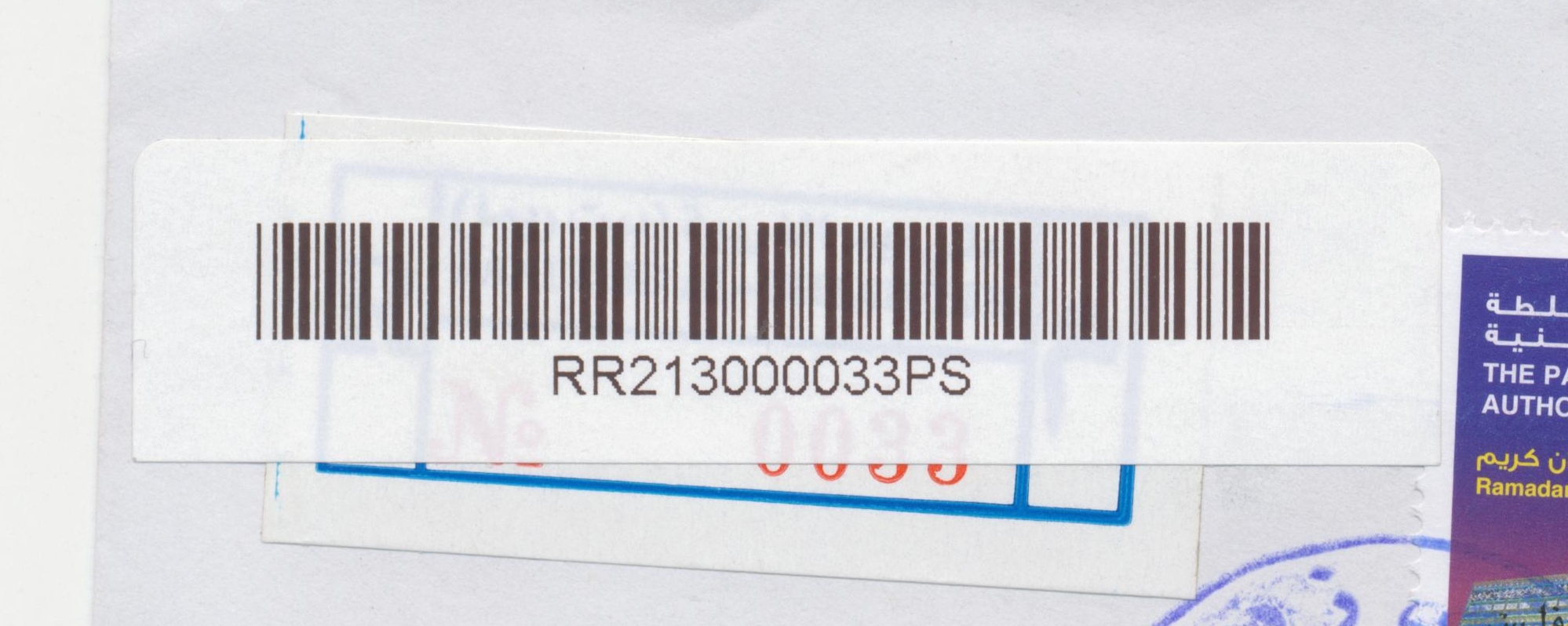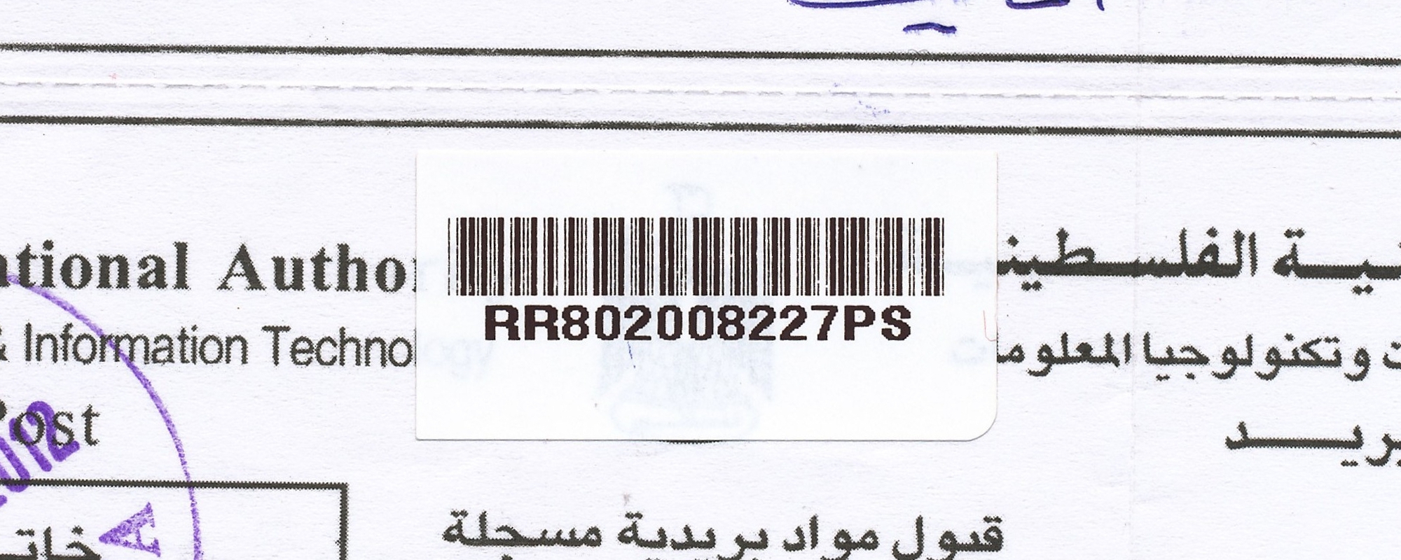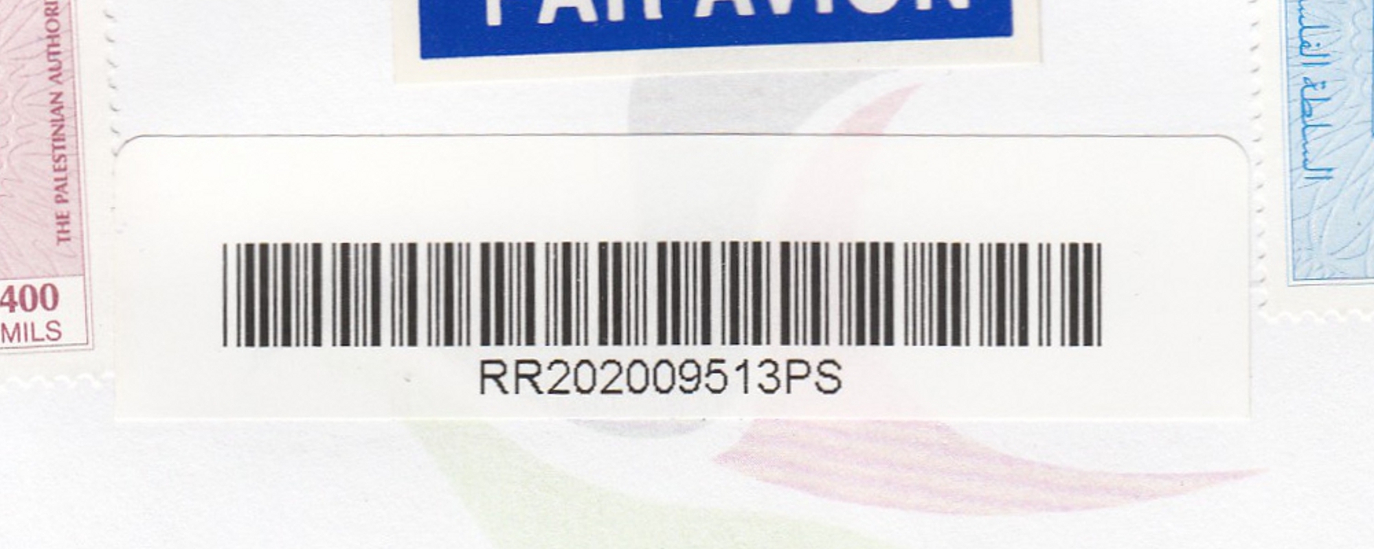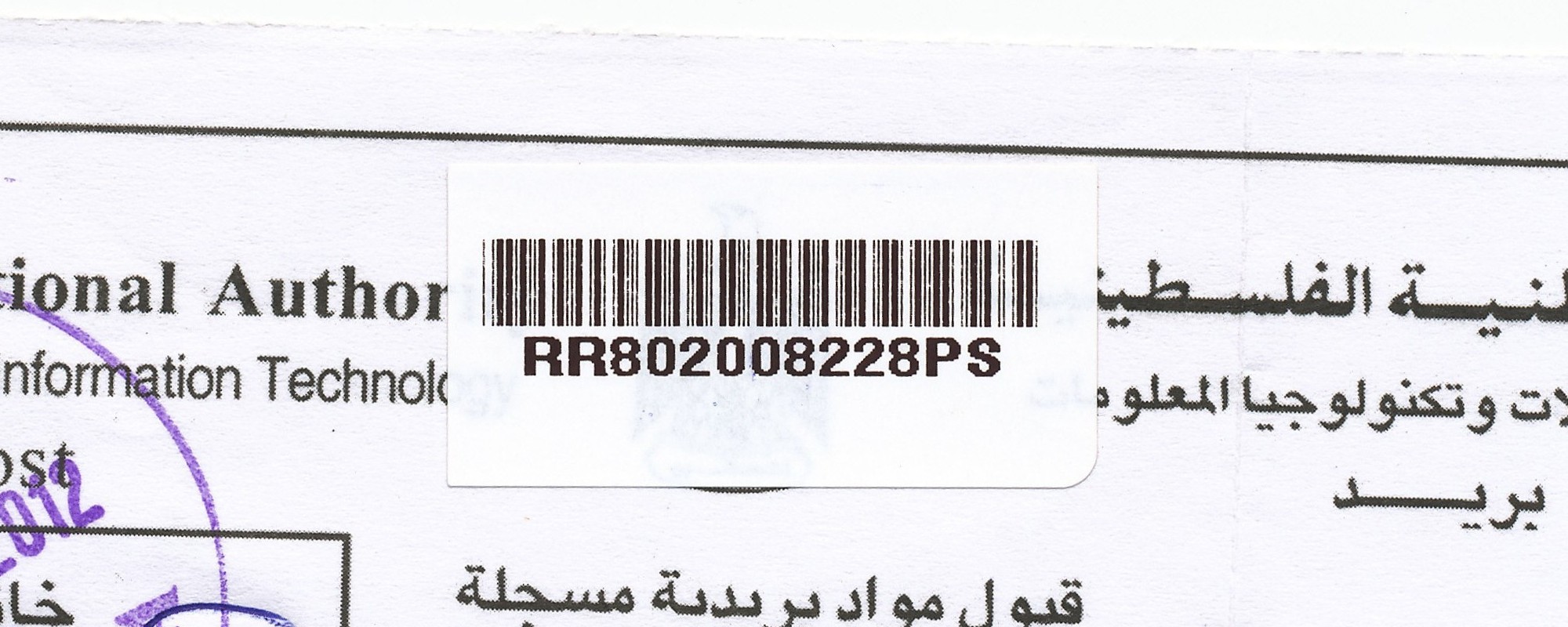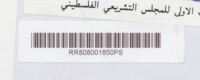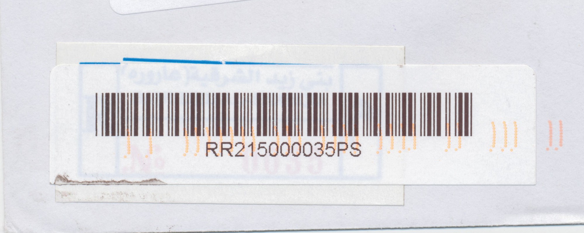 - white self-adhesive labels, printed in black. "IPS Light" linear barcode. With or without "Palestine Post" on top of imprinted numerator (9 digits) with prefixed RR and suffixed PS or ps. Label size varies.