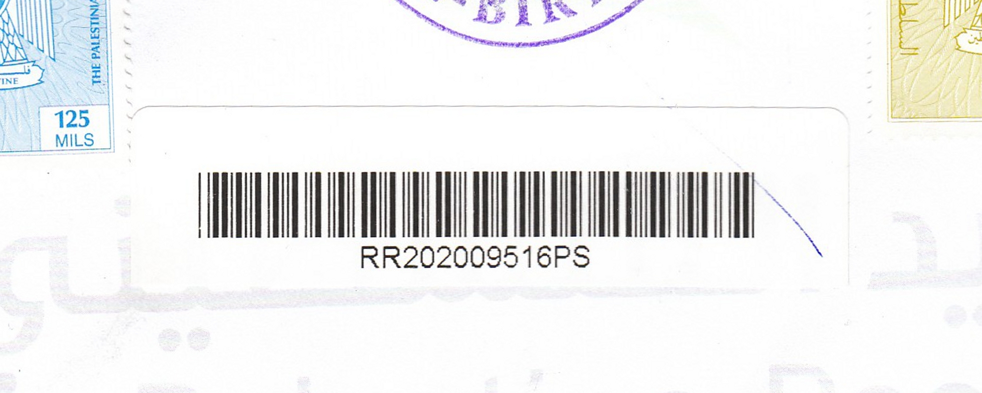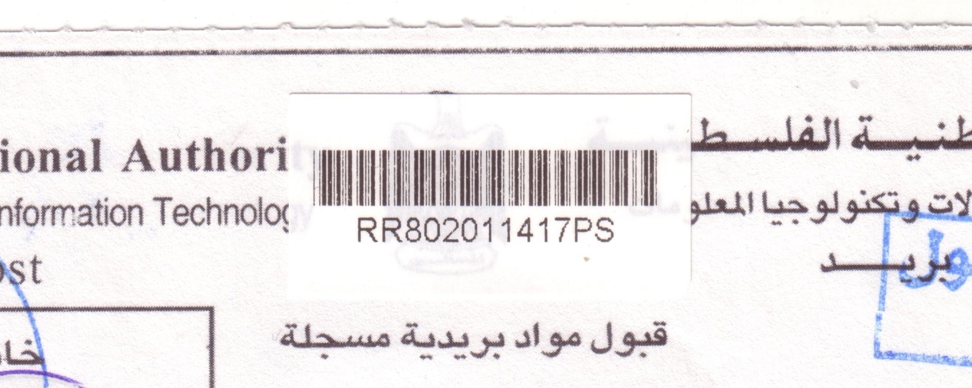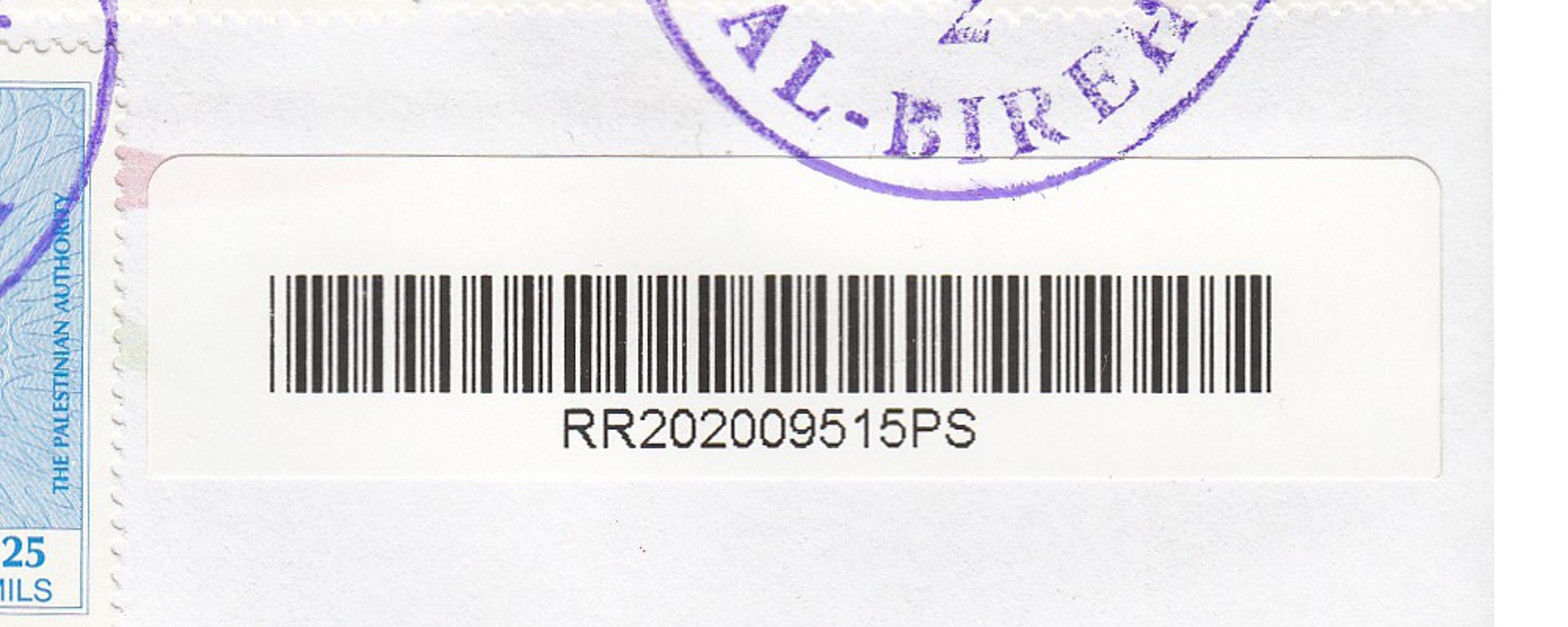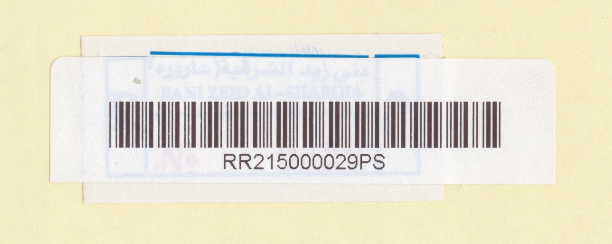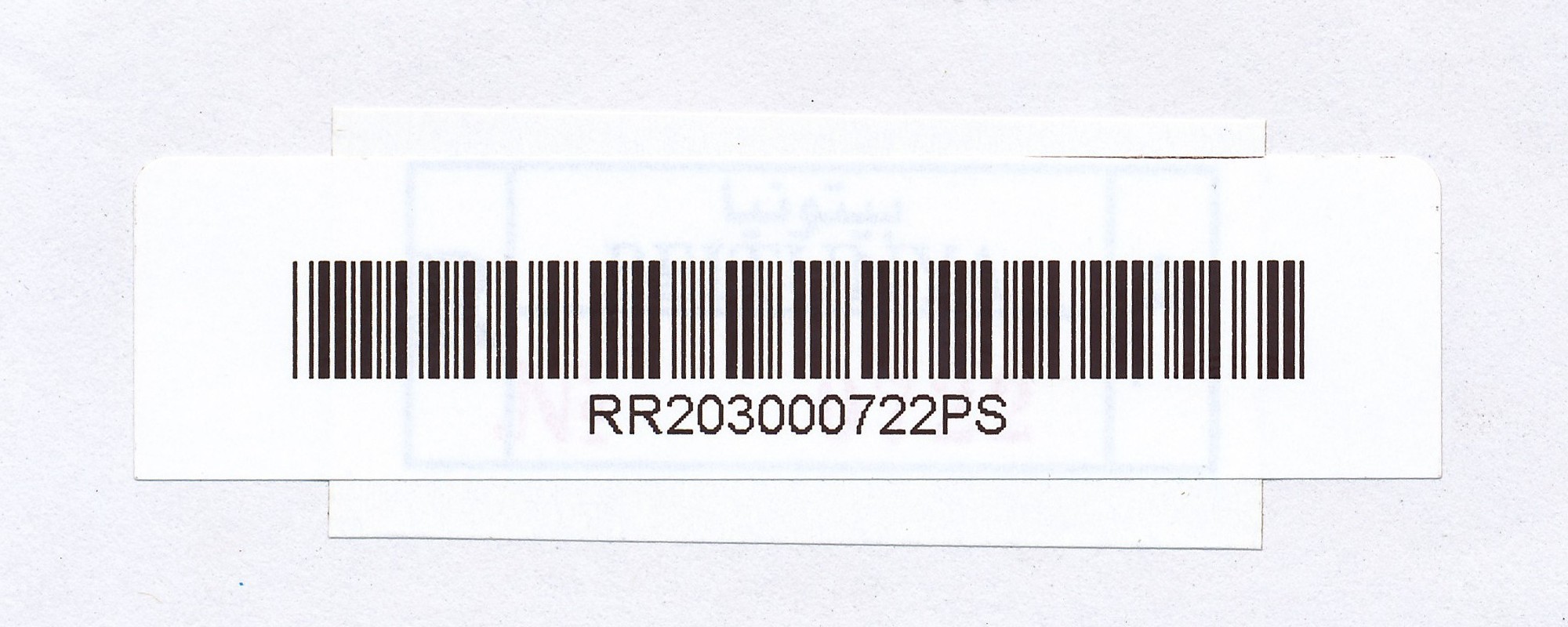 - white self-adhesive labels, printed in black. "IPS Light" linear barcode. With or without "Palestine Post" on top of imprinted numerator (9 digits) with prefixed RR and suffixed PS or ps. Label size varies.