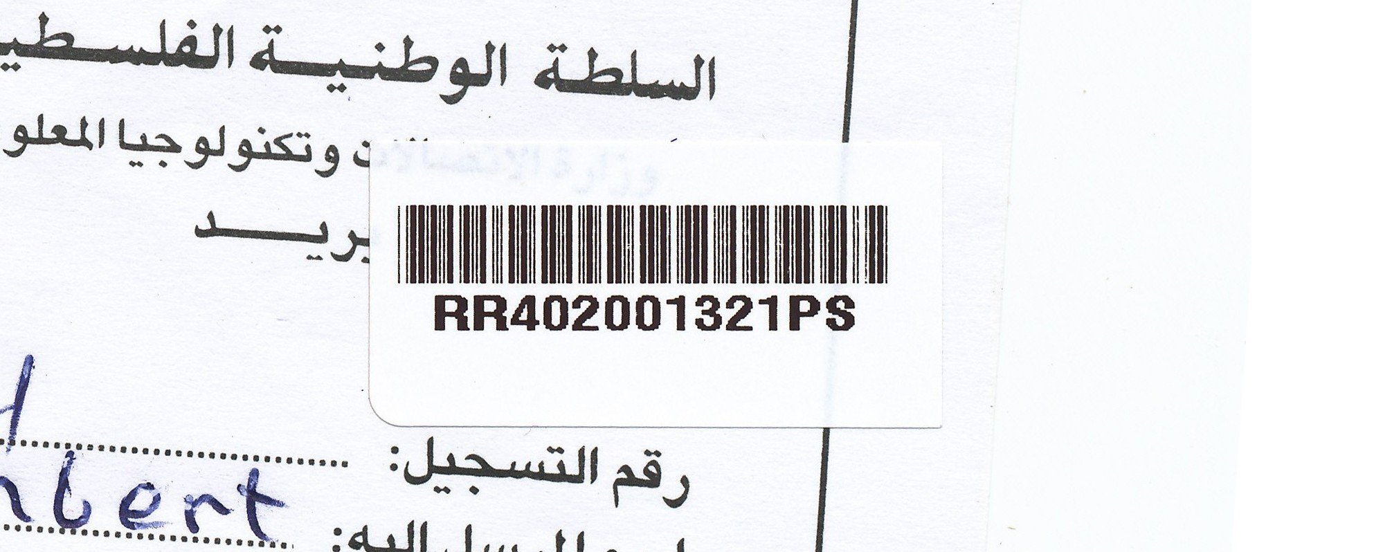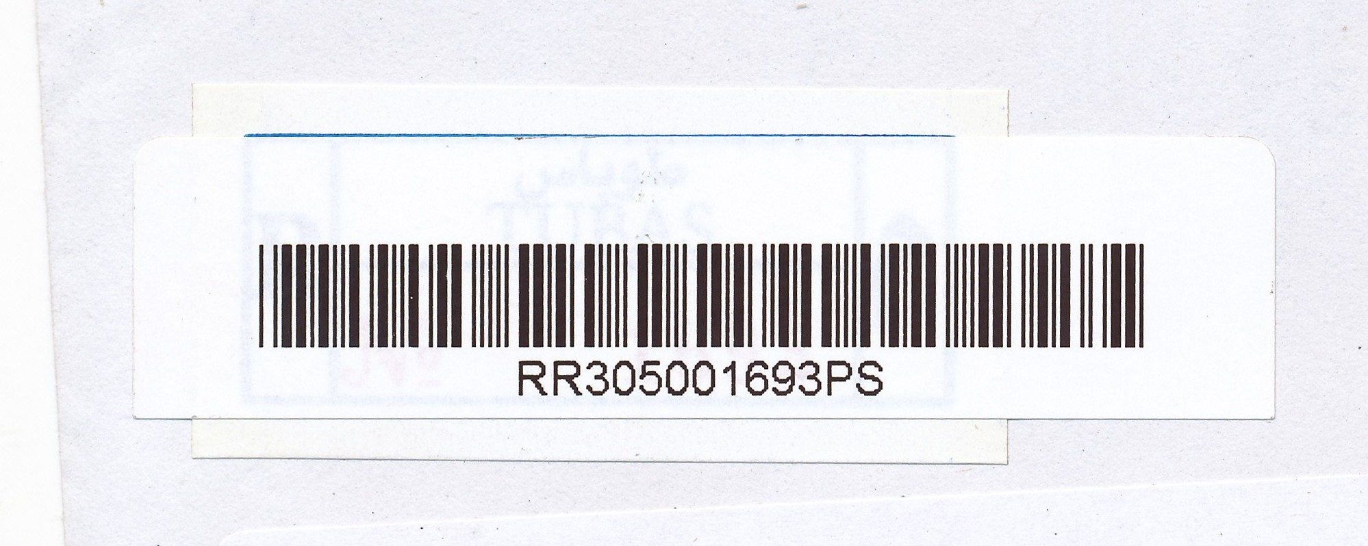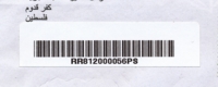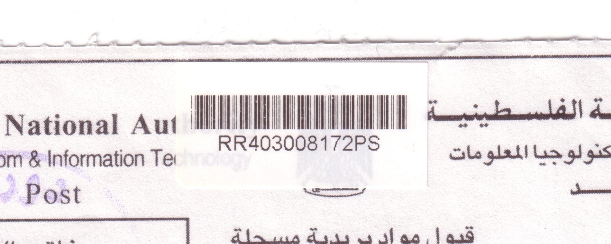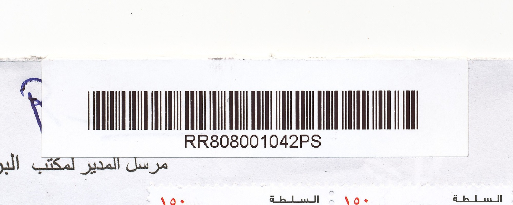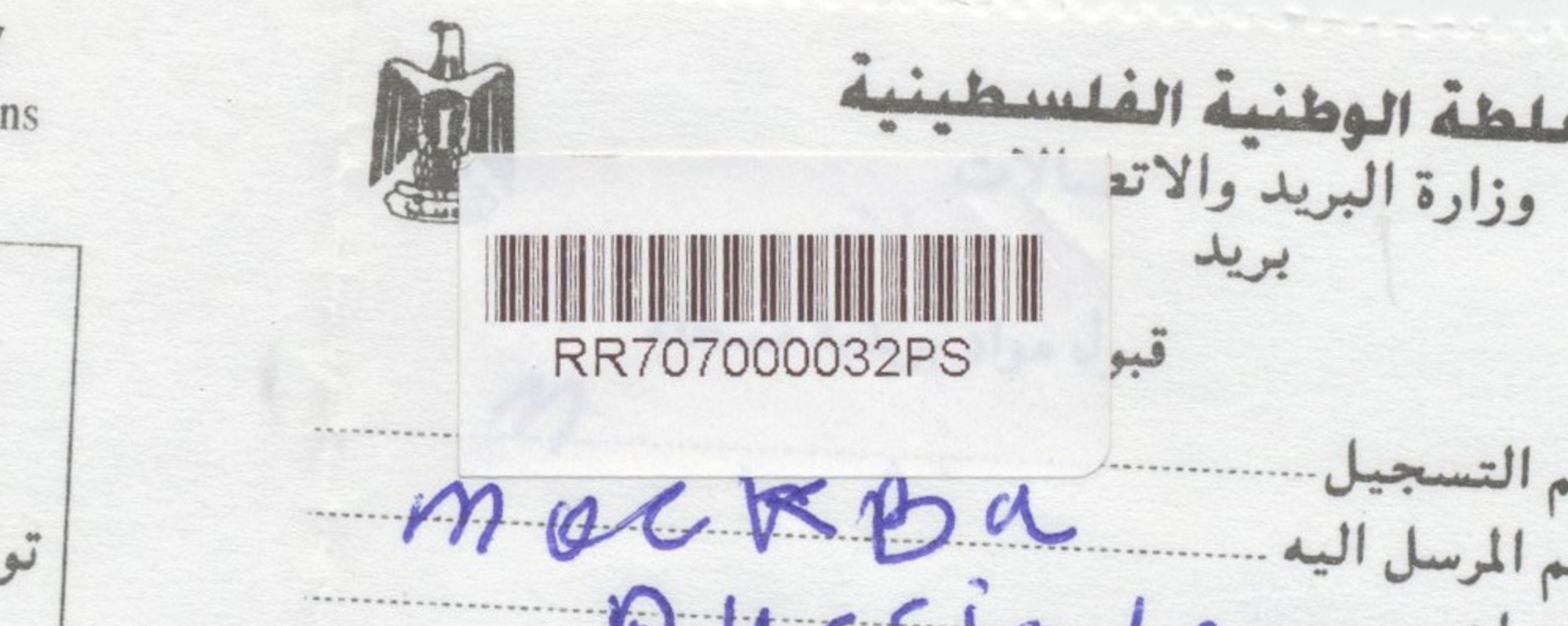 - white self-adhesive labels, printed in black. "IPS Light" linear barcode. With or without "Palestine Post" on top of imprinted numerator (9 digits) with prefixed RR and suffixed PS or ps. Label size varies.