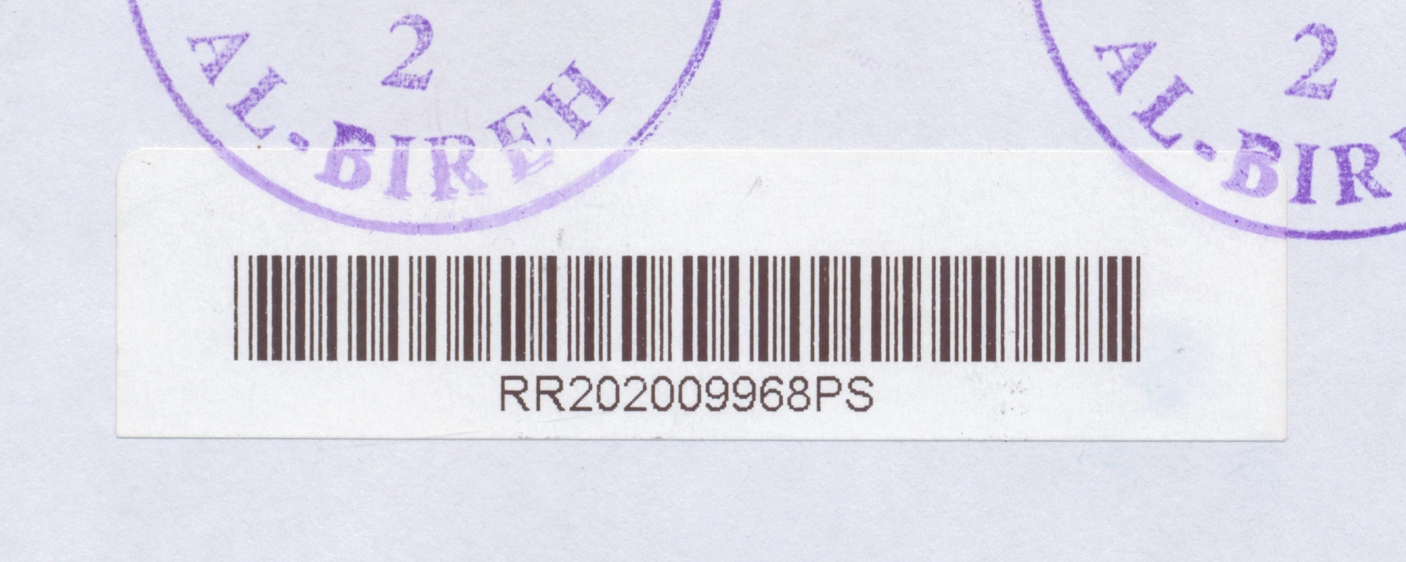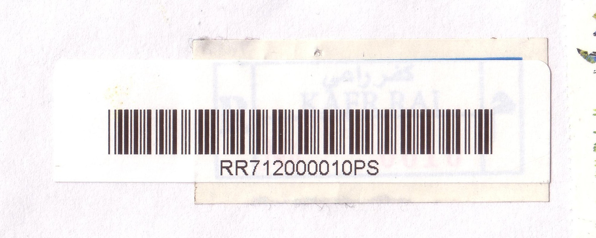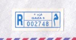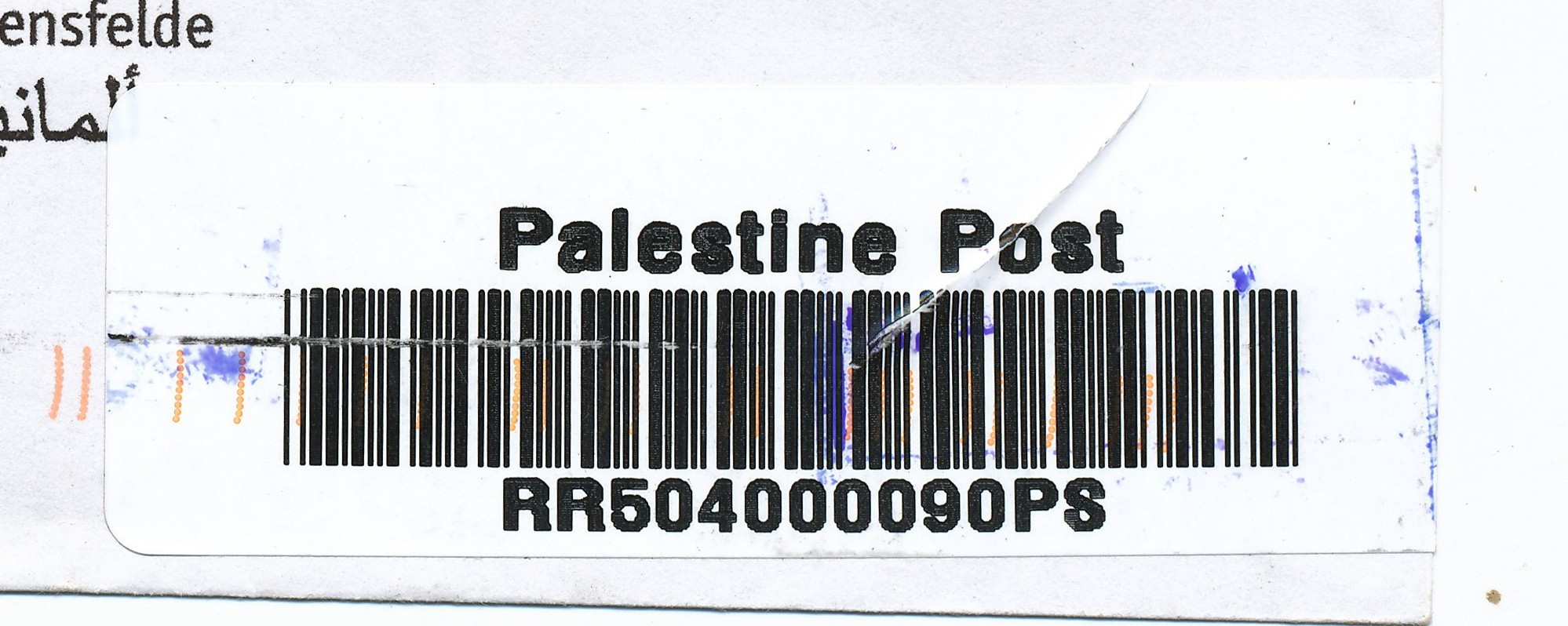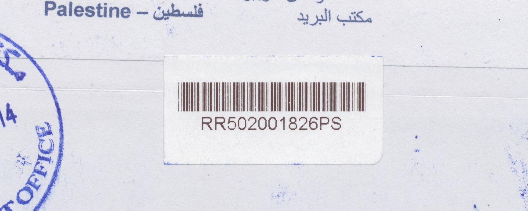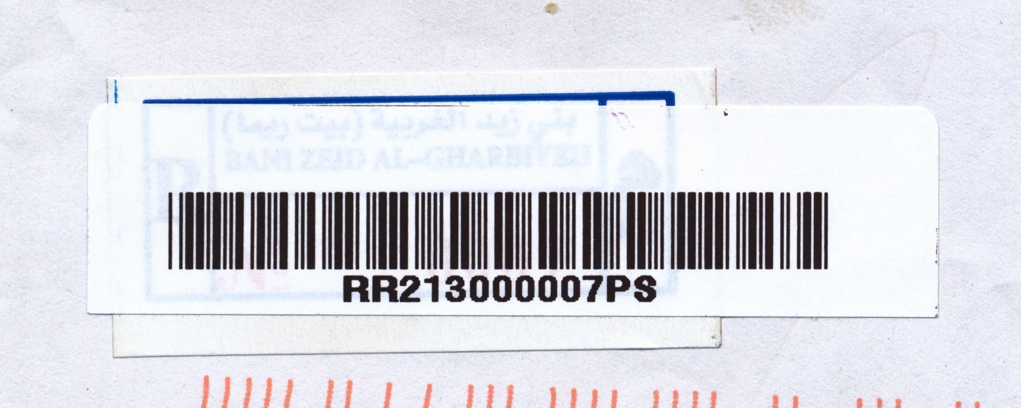 - white self-adhesive labels, printed in black. "IPS Light" linear barcode. With or without "Palestine Post" on top of imprinted numerator (9 digits) with prefixed RR and suffixed PS or ps. Label size varies.