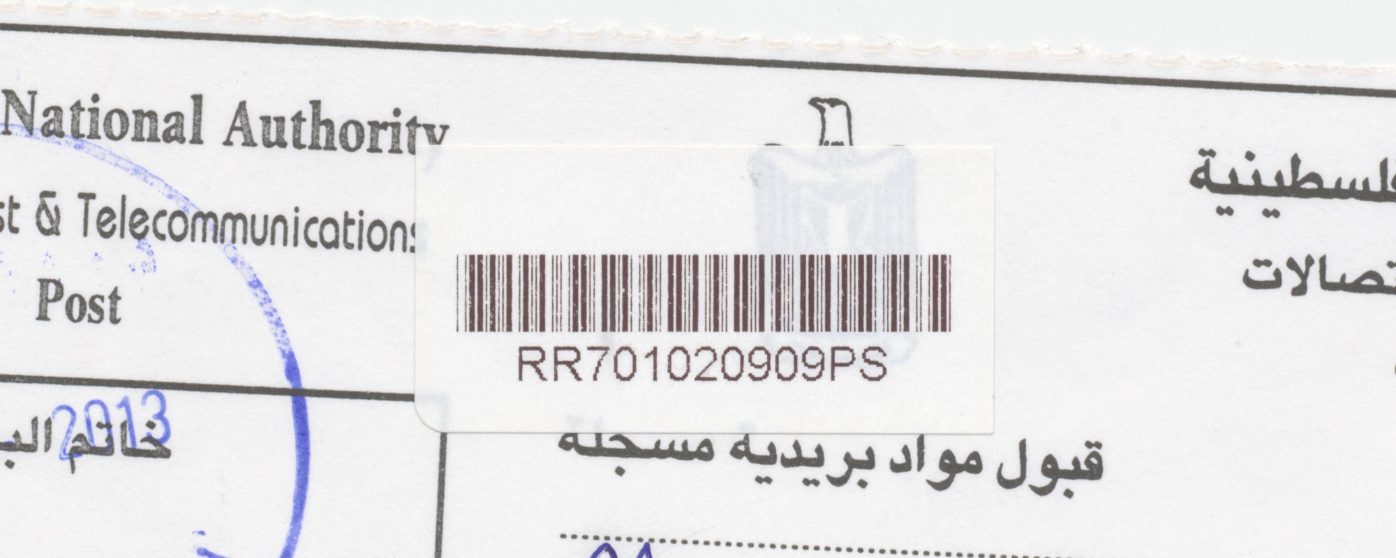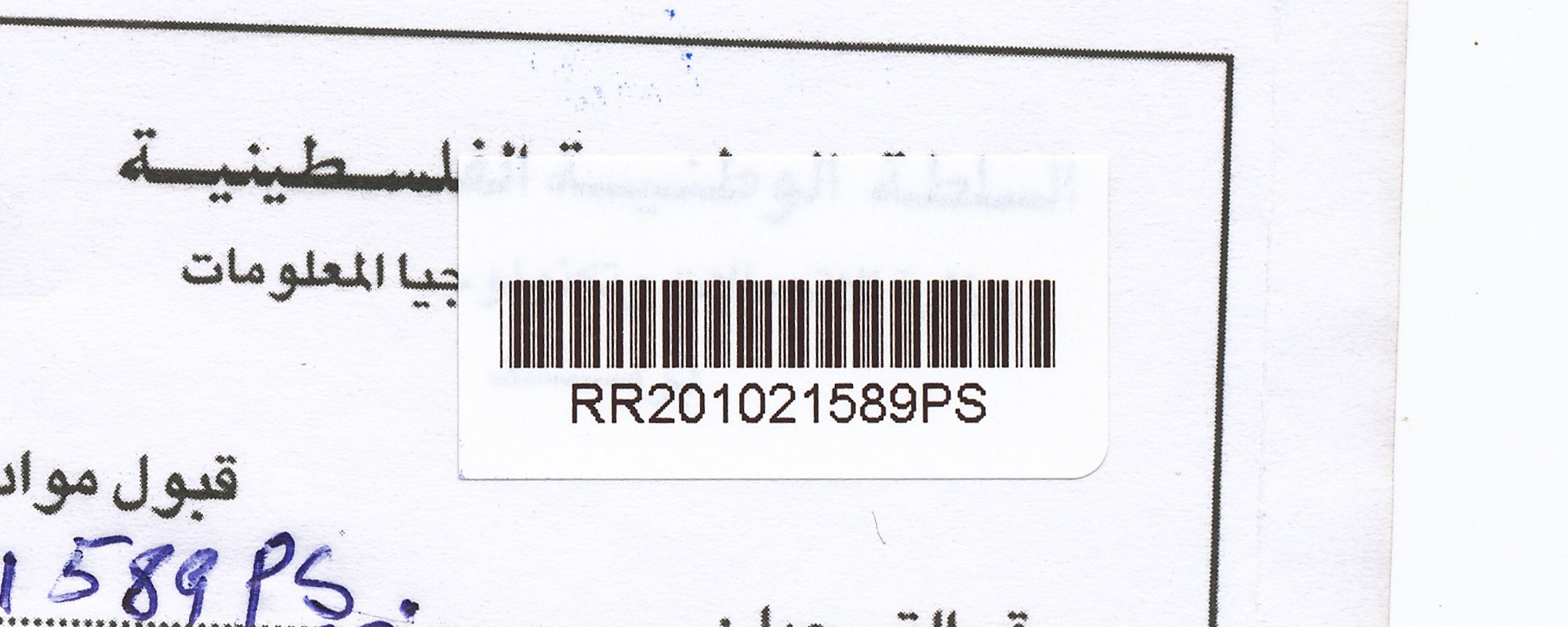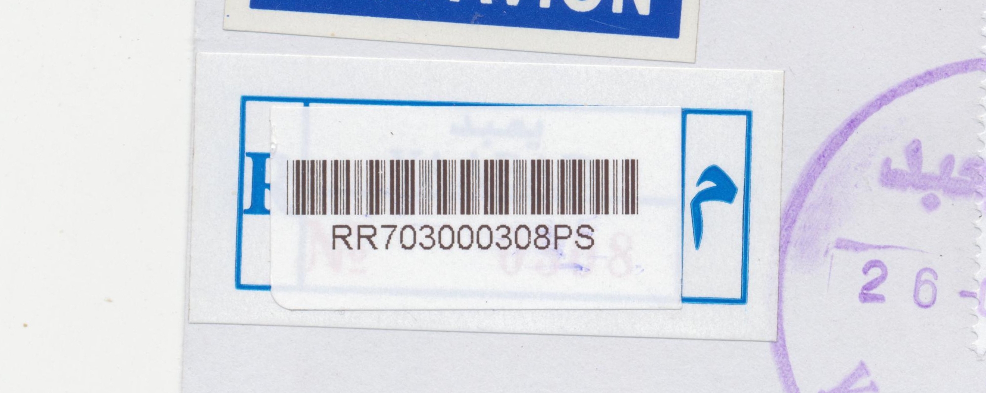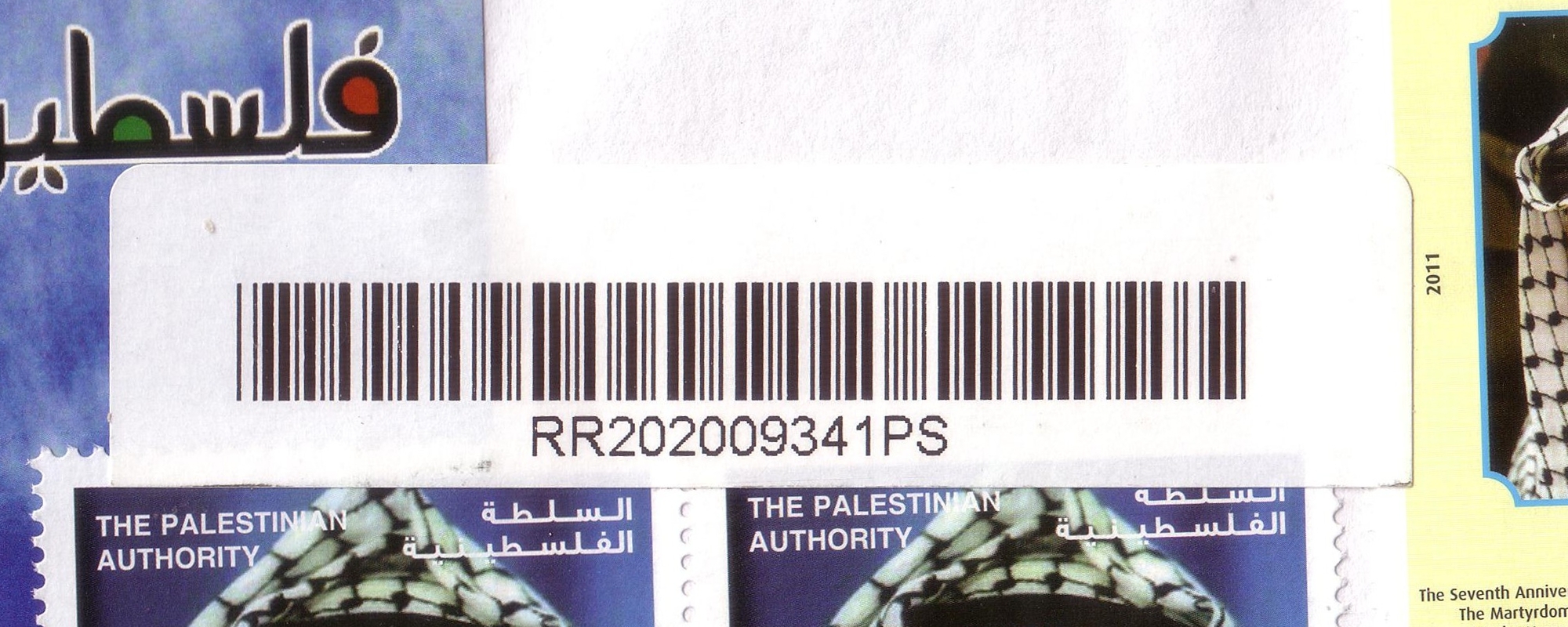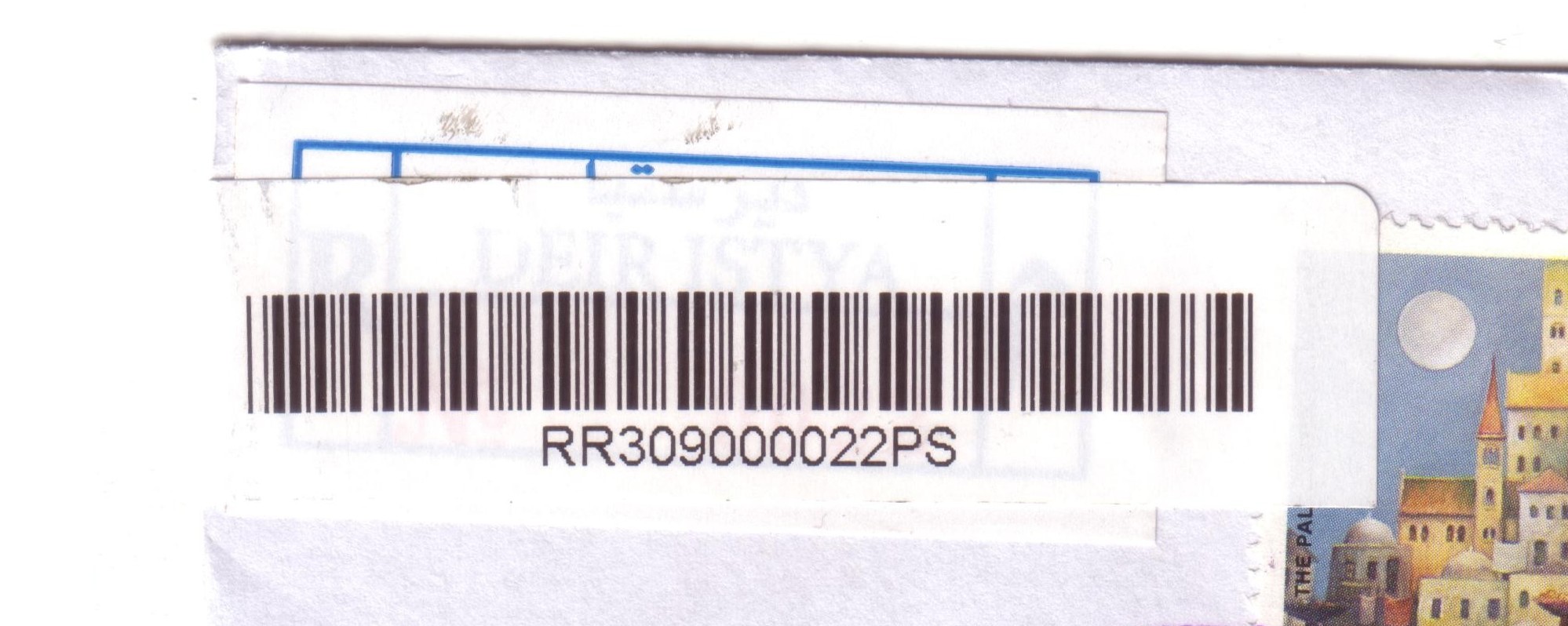 - white self-adhesive labels, printed in black. "IPS Light" linear barcode. With or without "Palestine Post" on top of imprinted numerator (9 digits) with prefixed RR and suffixed PS or ps. Label size varies.