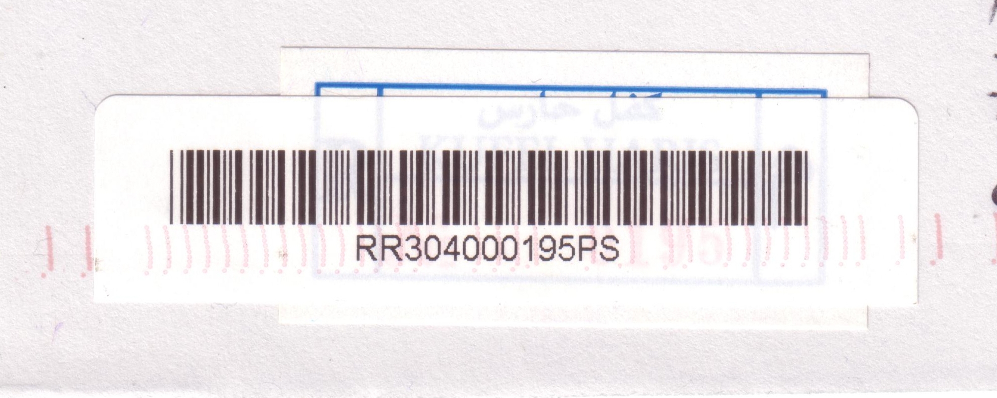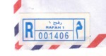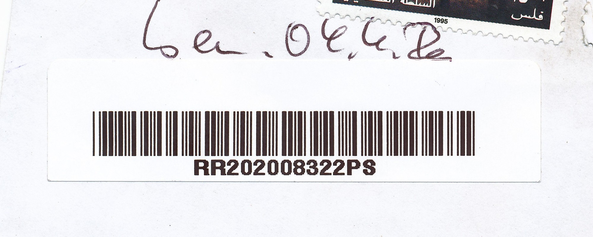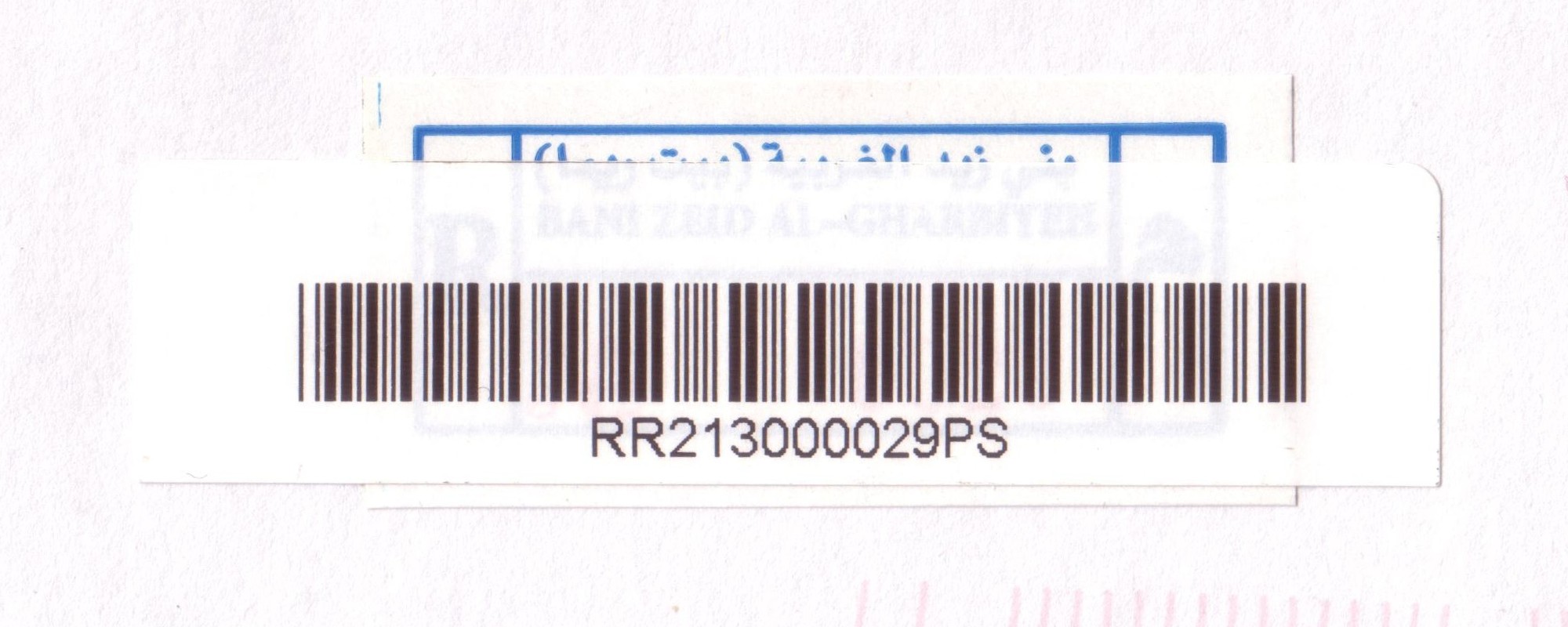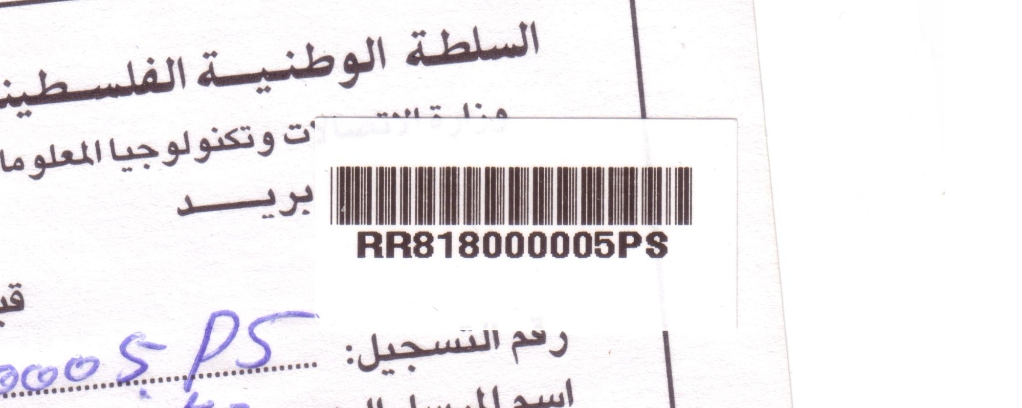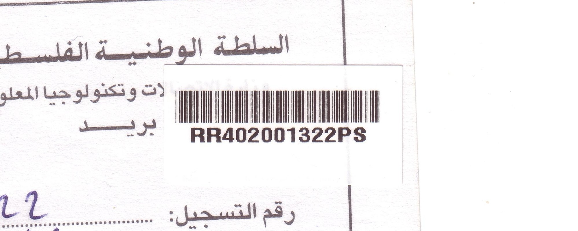 - white self-adhesive labels, printed in black. "IPS Light" linear barcode. With or without "Palestine Post" on top of imprinted numerator (9 digits) with prefixed RR and suffixed PS or ps. Label size varies.