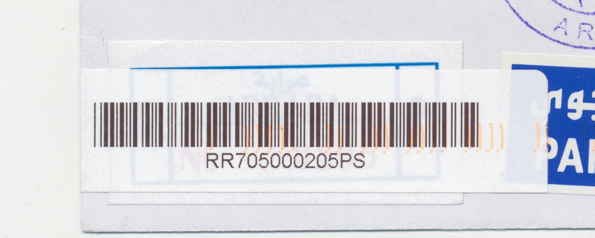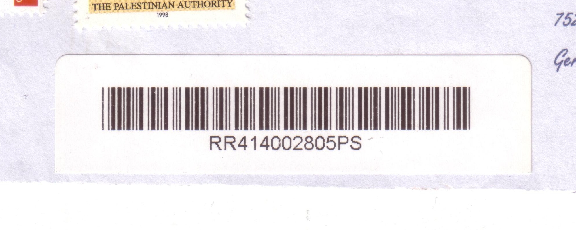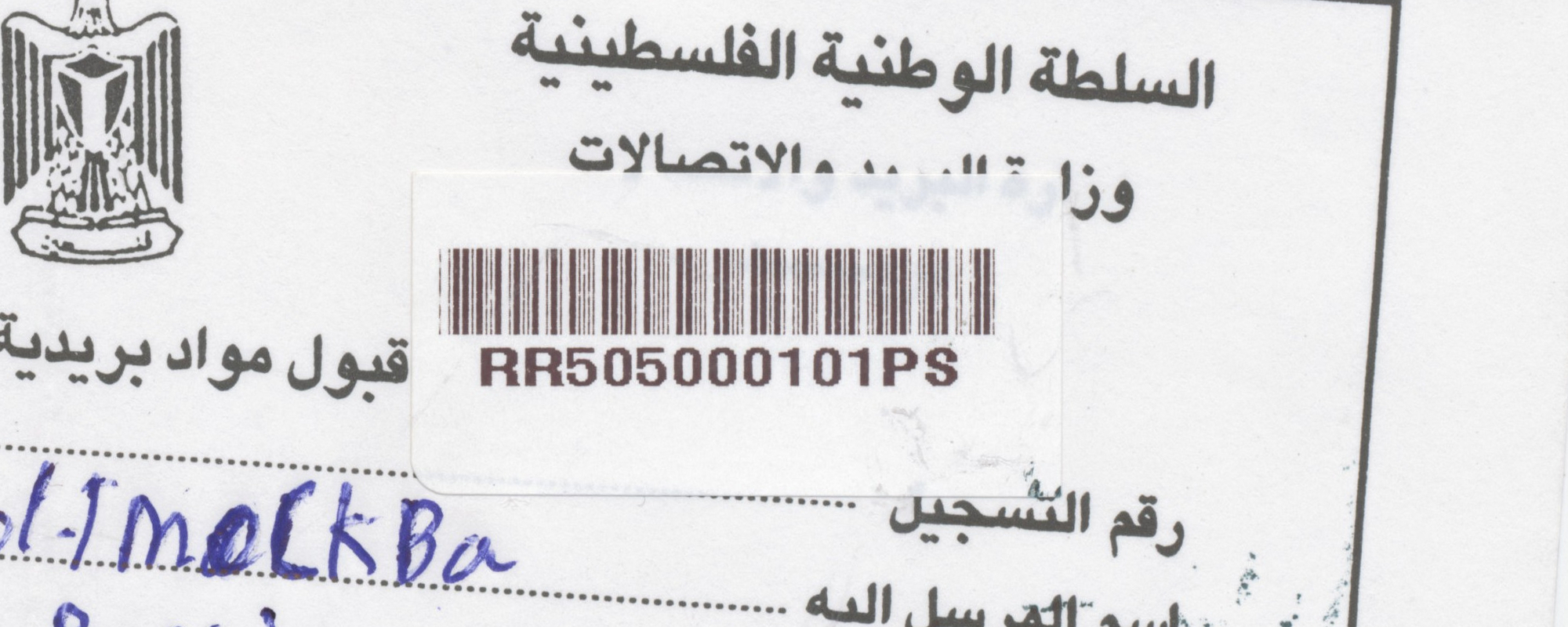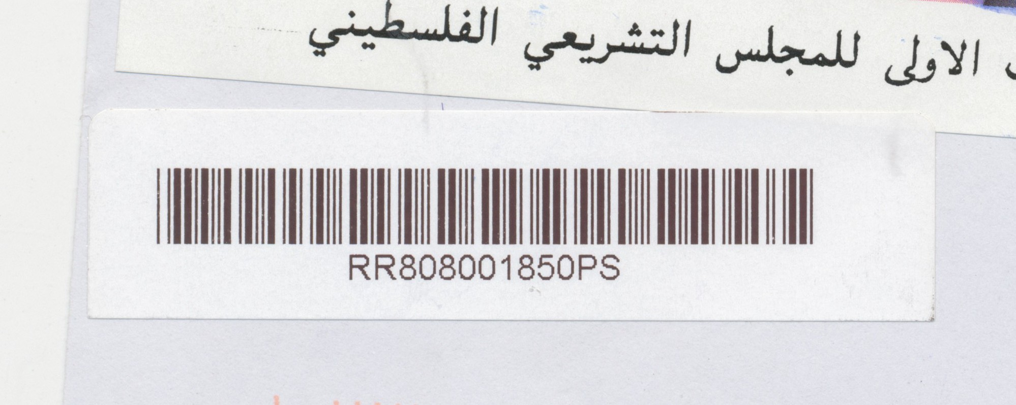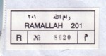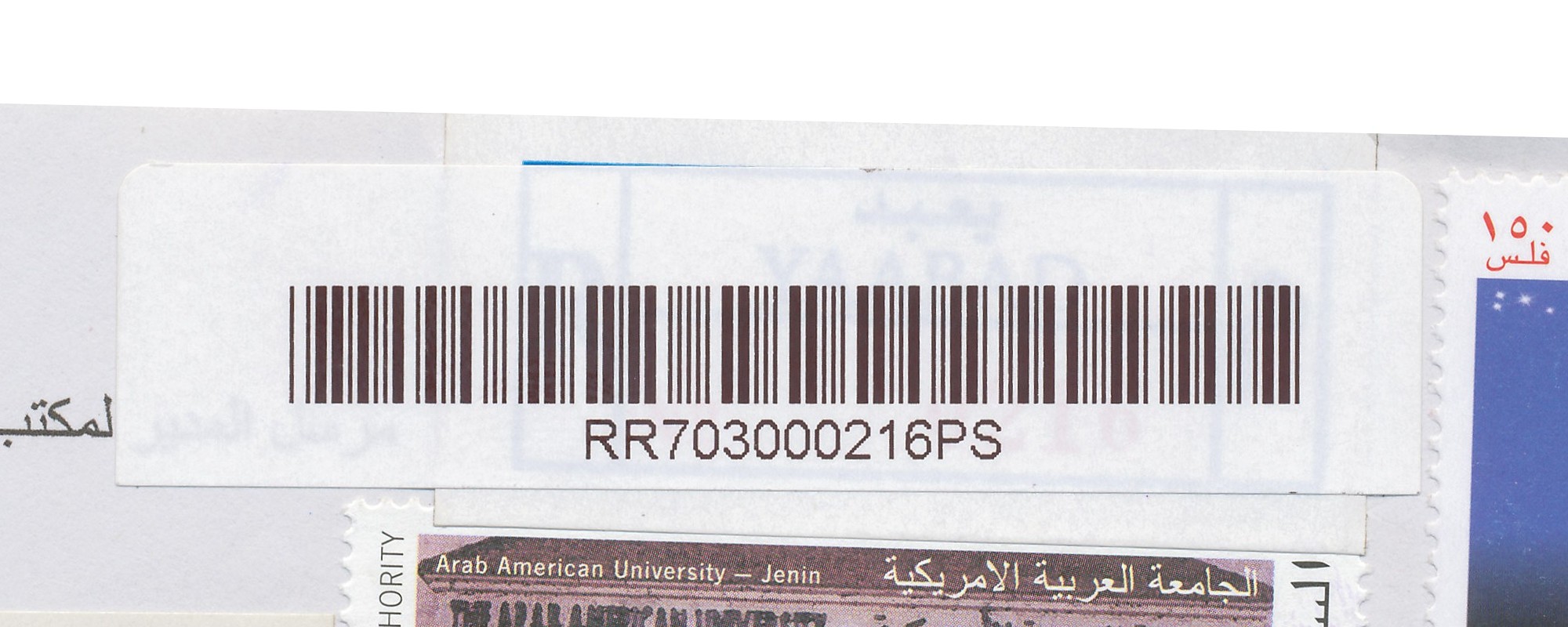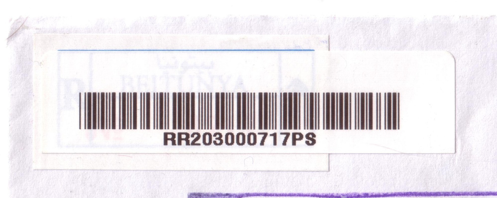 - white self-adhesive labels, printed in black. "IPS Light" linear barcode. With or without "Palestine Post" on top of imprinted numerator (9 digits) with prefixed RR and suffixed PS or ps. Label size varies.