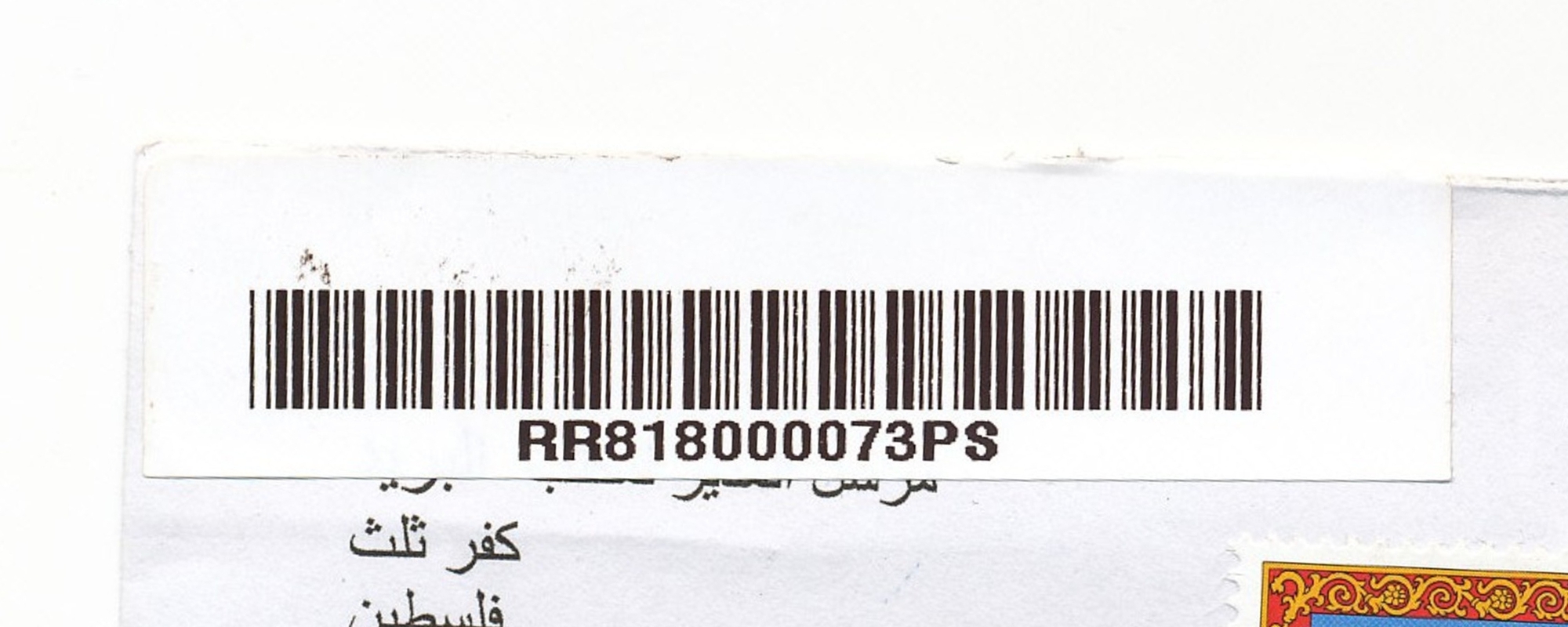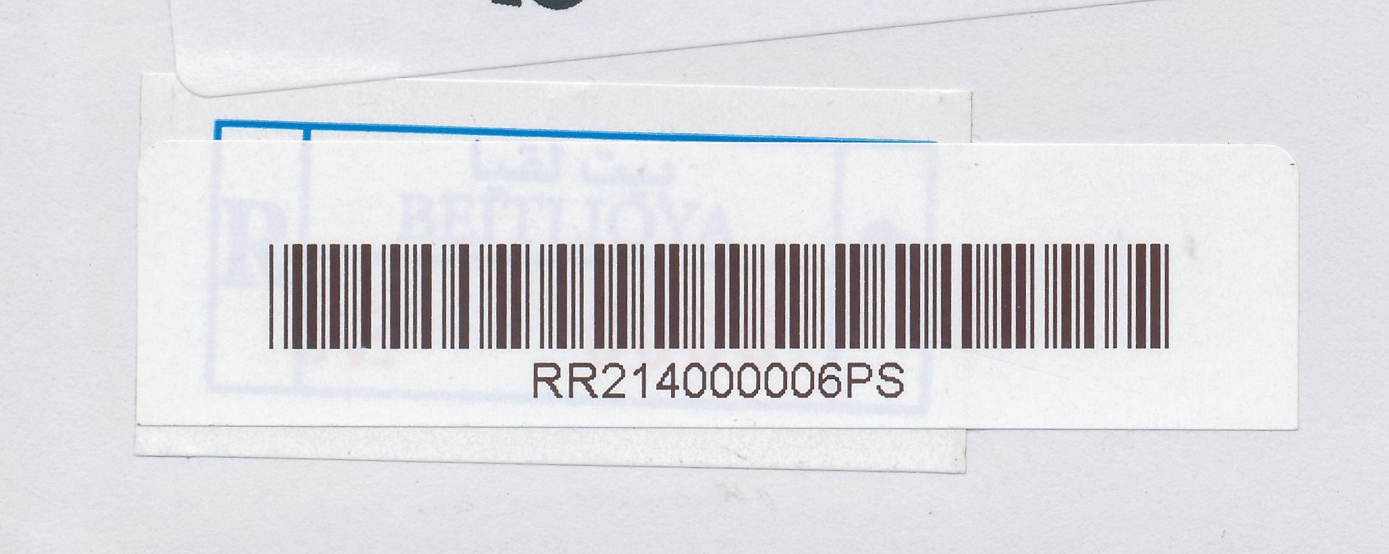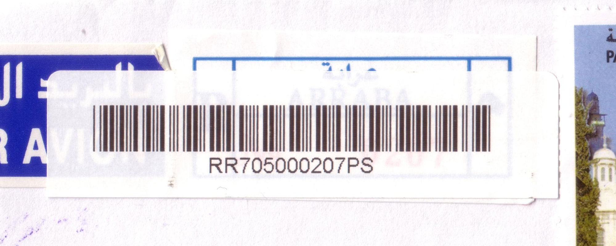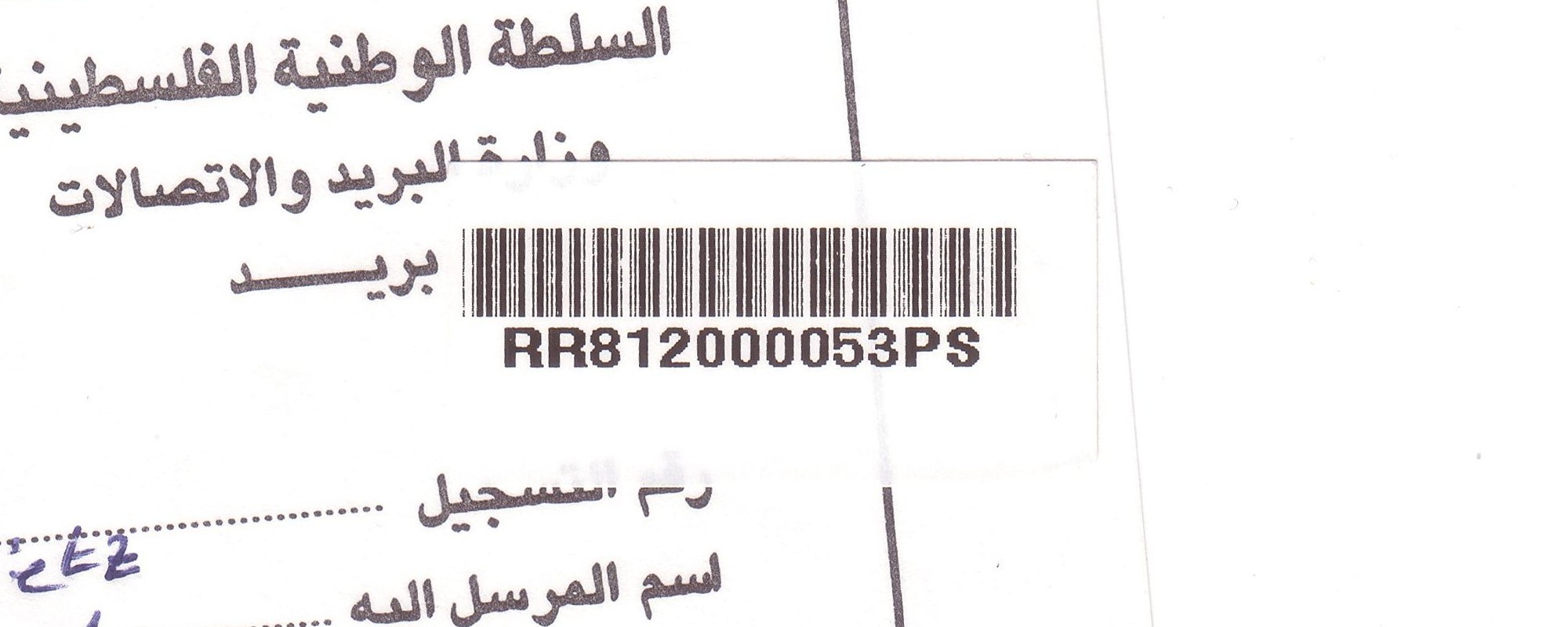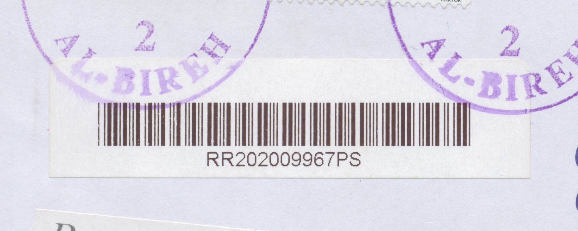 - white self-adhesive labels, printed in black. "IPS Light" linear barcode. With or without "Palestine Post" on top of imprinted numerator (9 digits) with prefixed RR and suffixed PS or ps. Label size varies.
