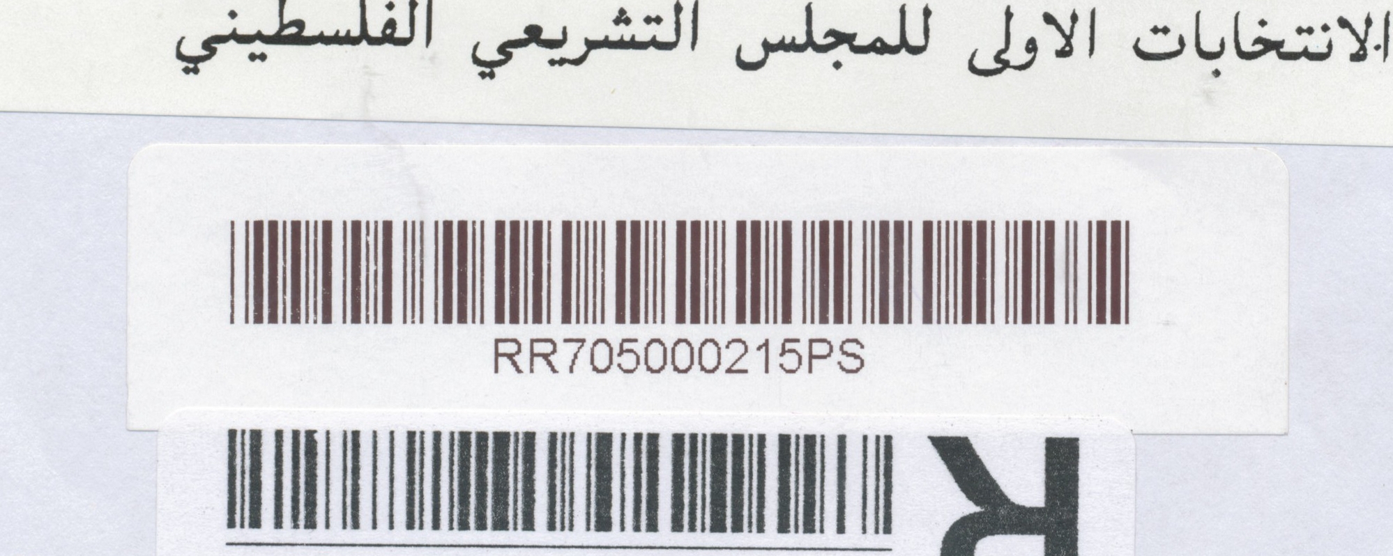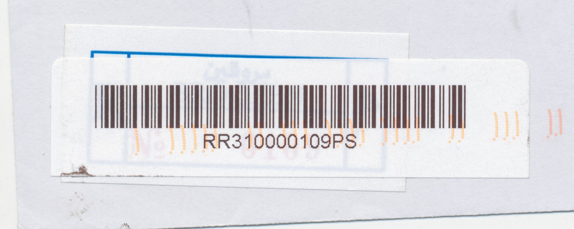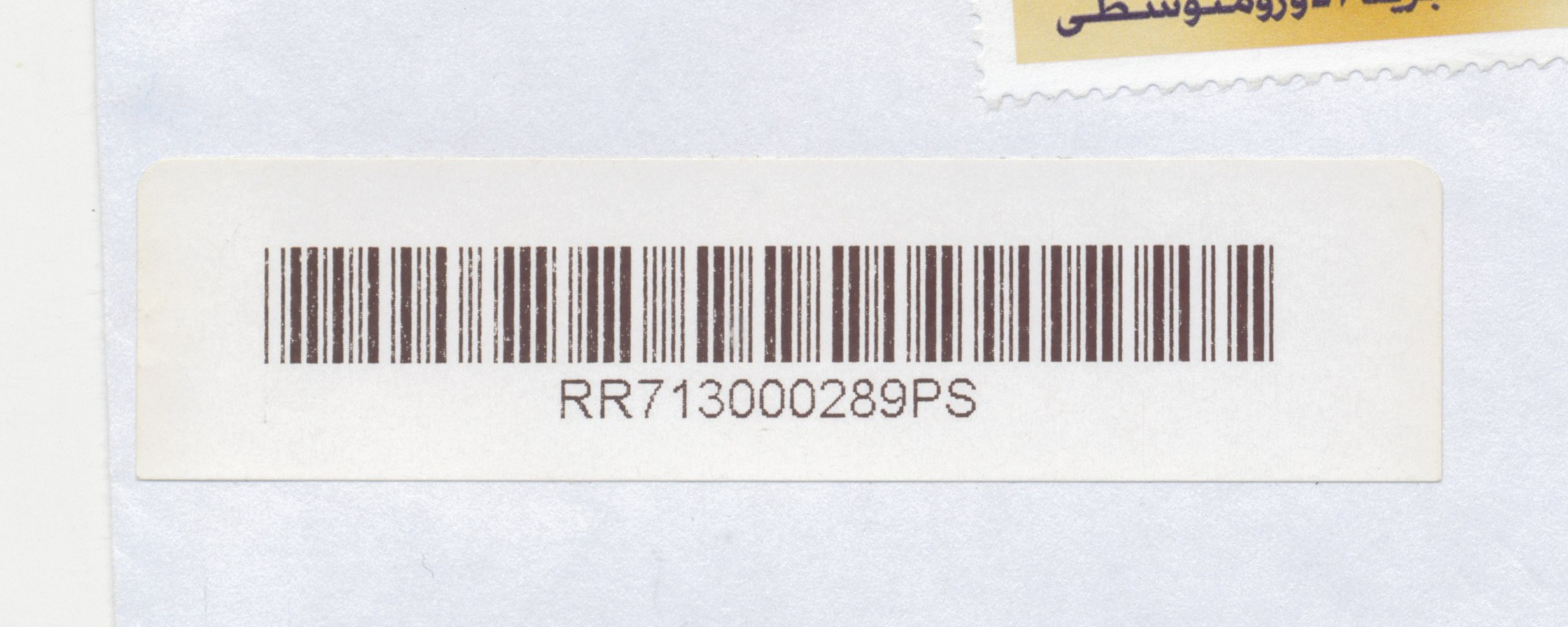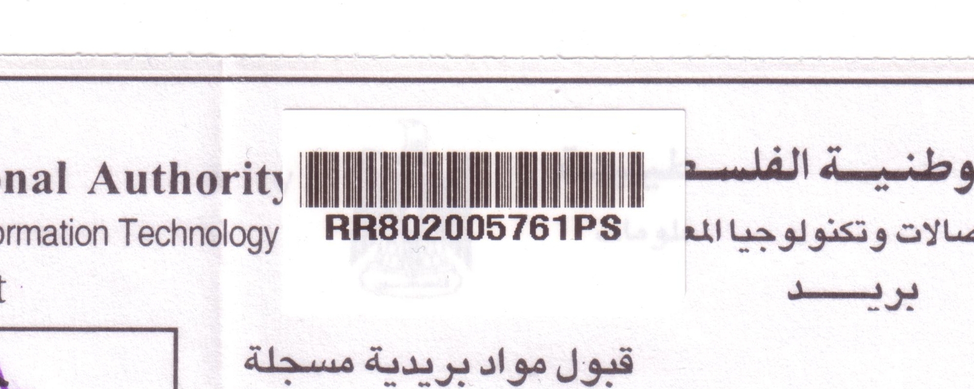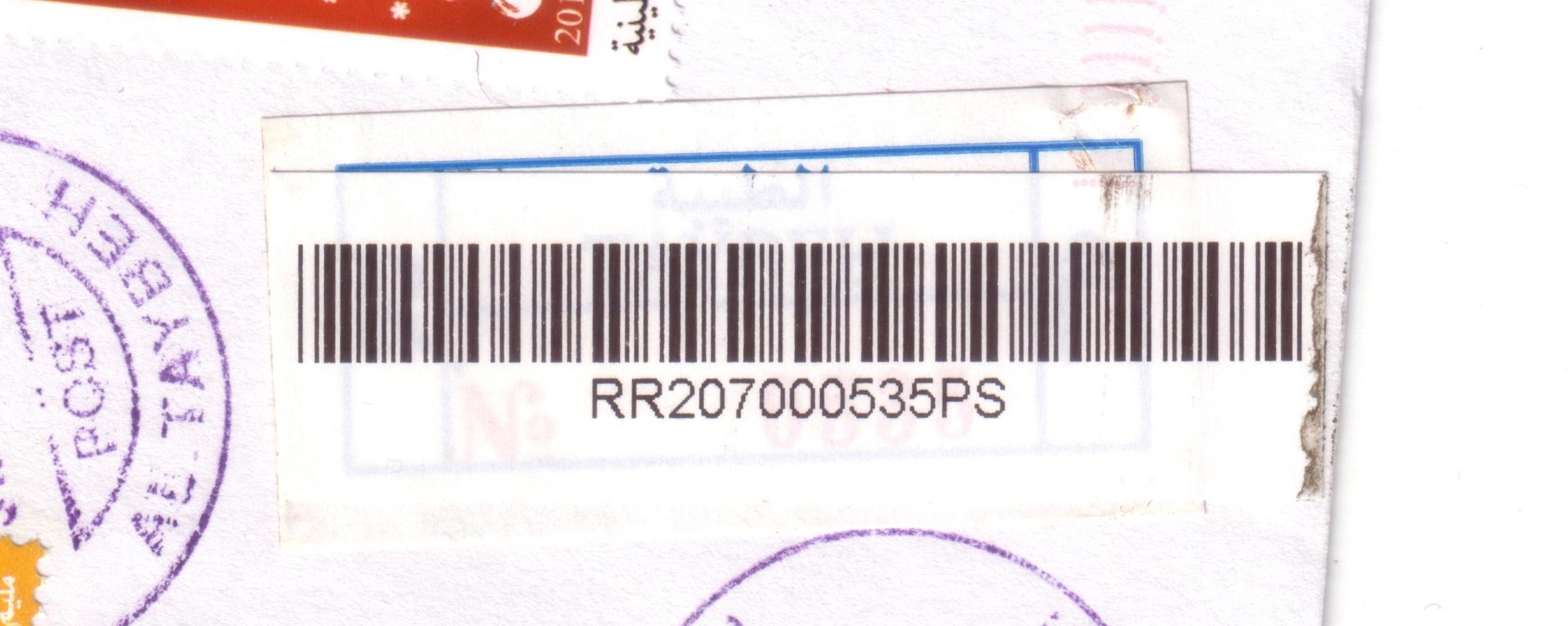 - white self-adhesive labels, printed in black. "IPS Light" linear barcode. With or without "Palestine Post" on top of imprinted numerator (9 digits) with prefixed RR and suffixed PS or ps. Label size varies.