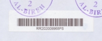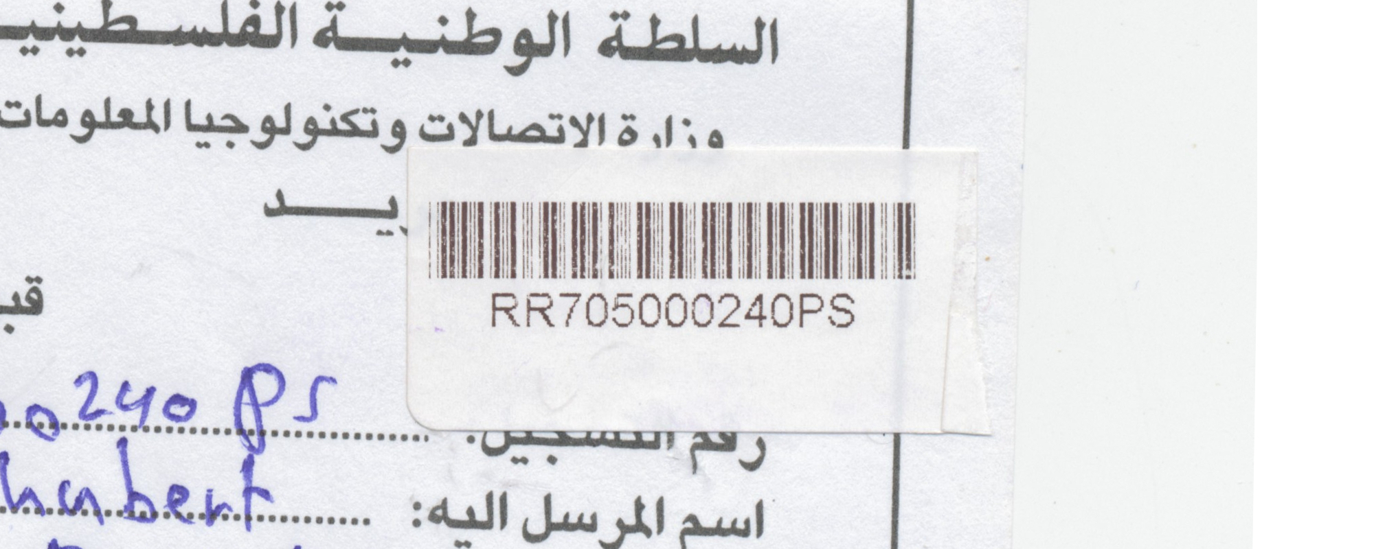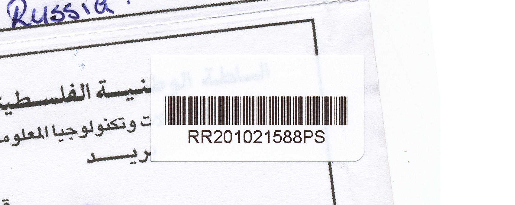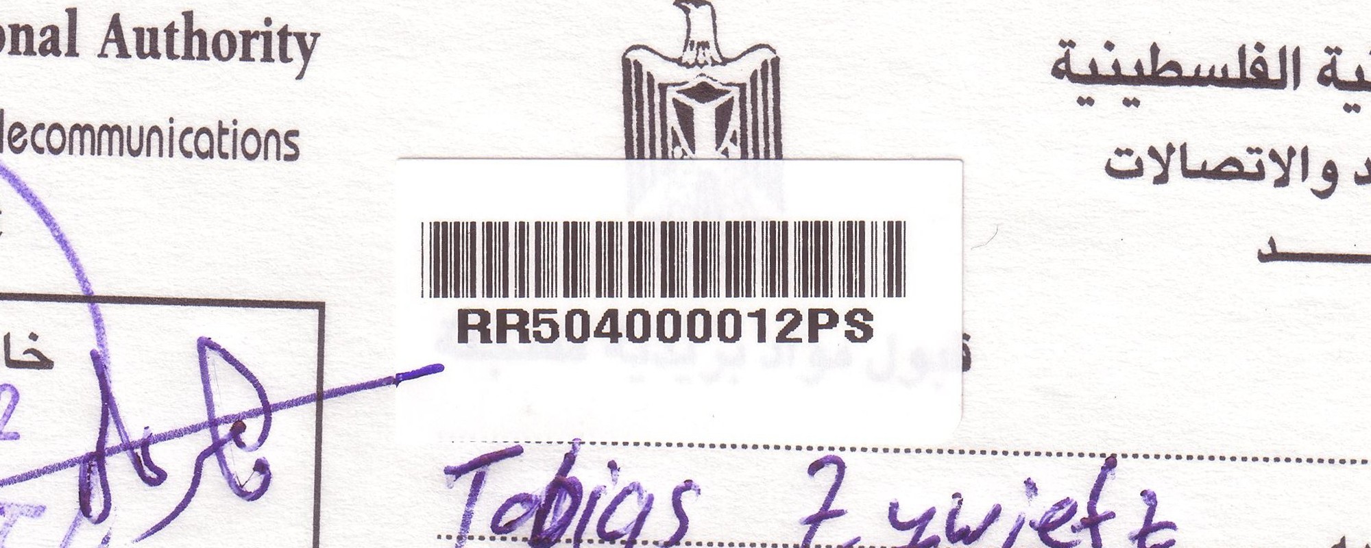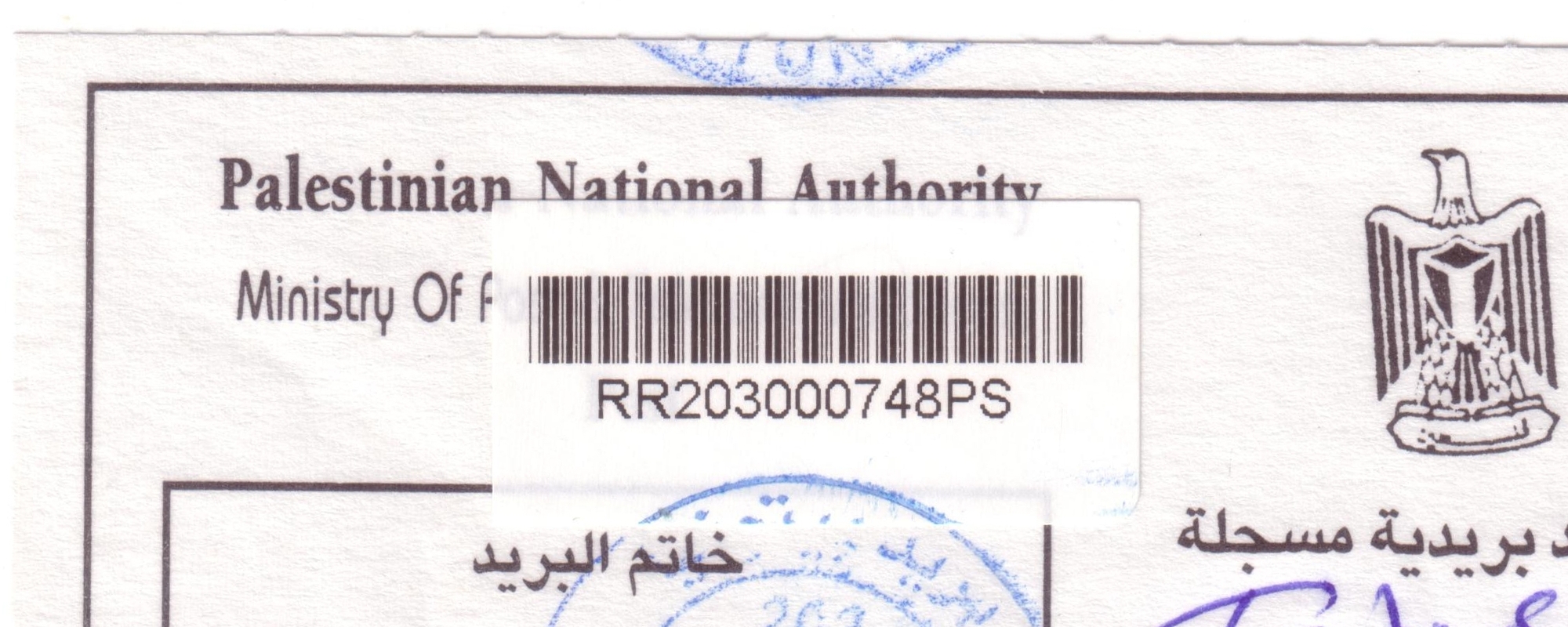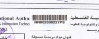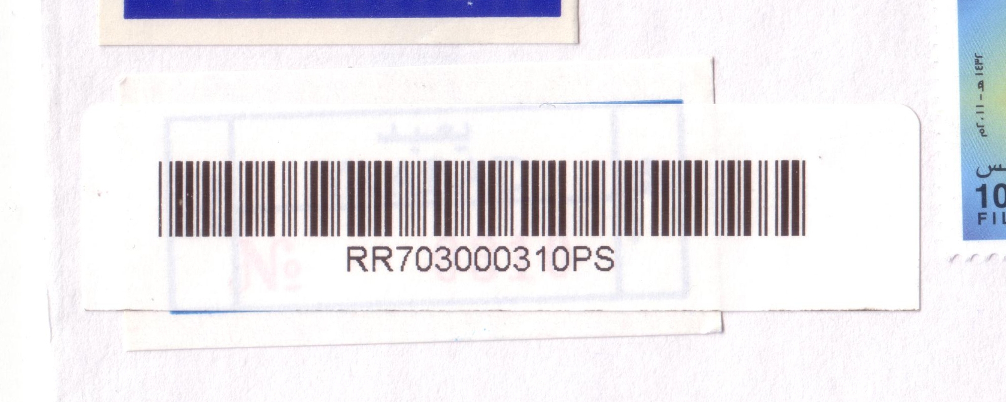- white self-adhesive labels, printed in black. "IPS Light" linear barcode. With or without "Palestine Post" on top of imprinted numerator (9 digits) with prefixed RR and suffixed PS or ps. Label size varies.