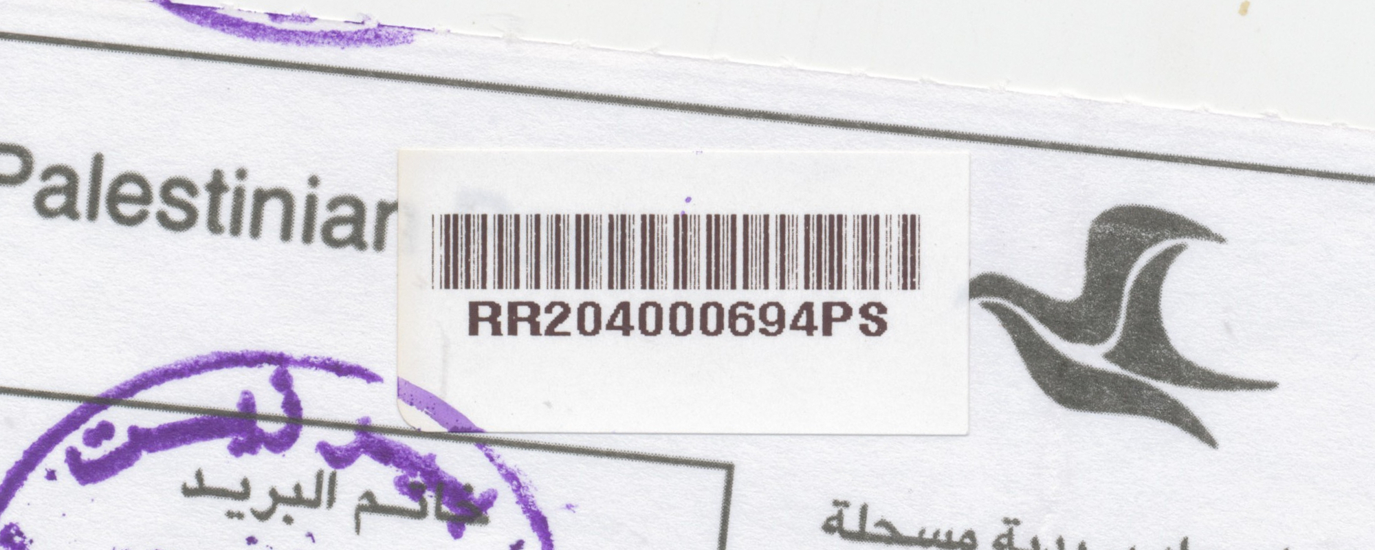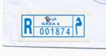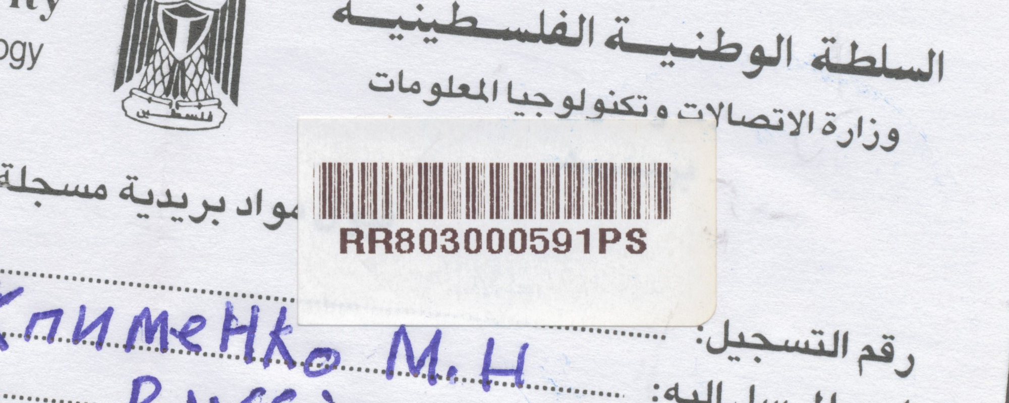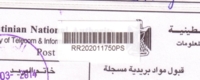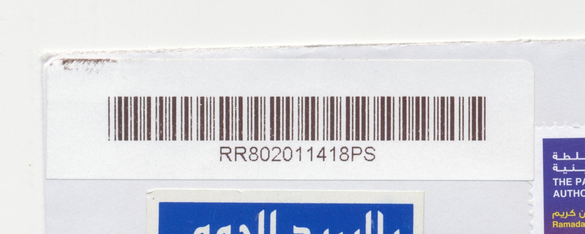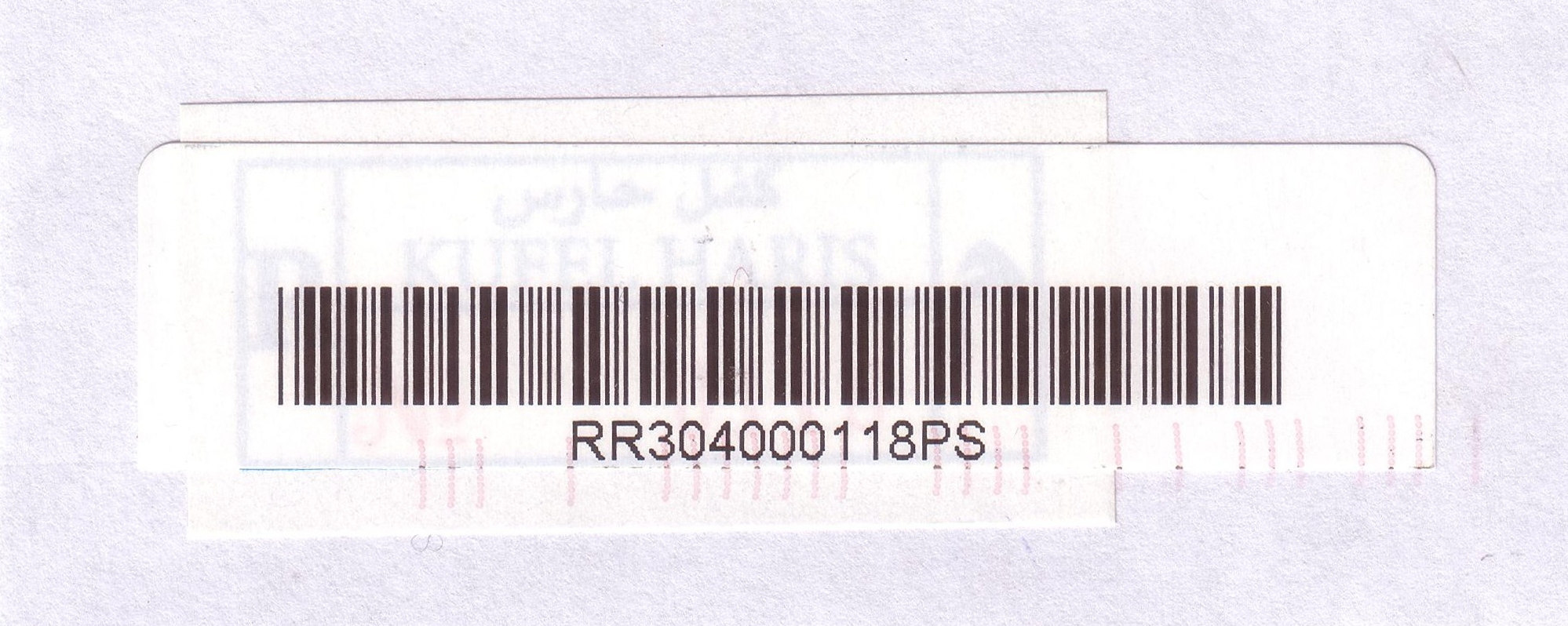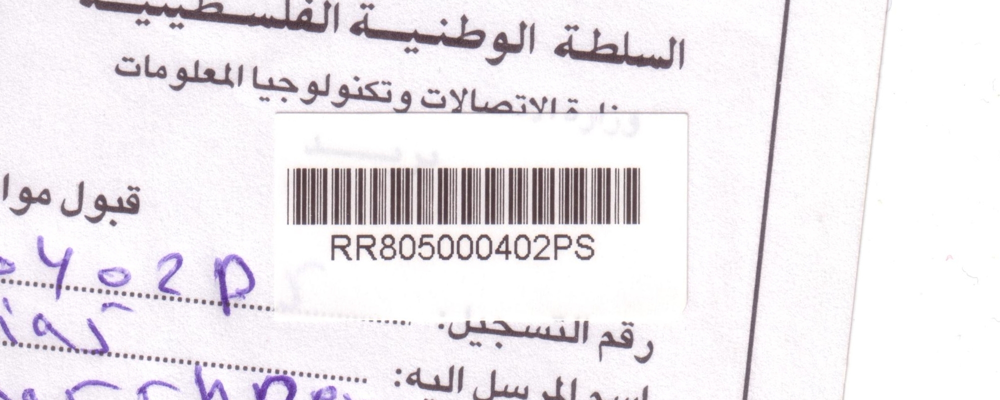 - white self-adhesive labels, printed in black. "IPS Light" linear barcode. With or without "Palestine Post" on top of imprinted numerator (9 digits) with prefixed RR and suffixed PS or ps. Label size varies.