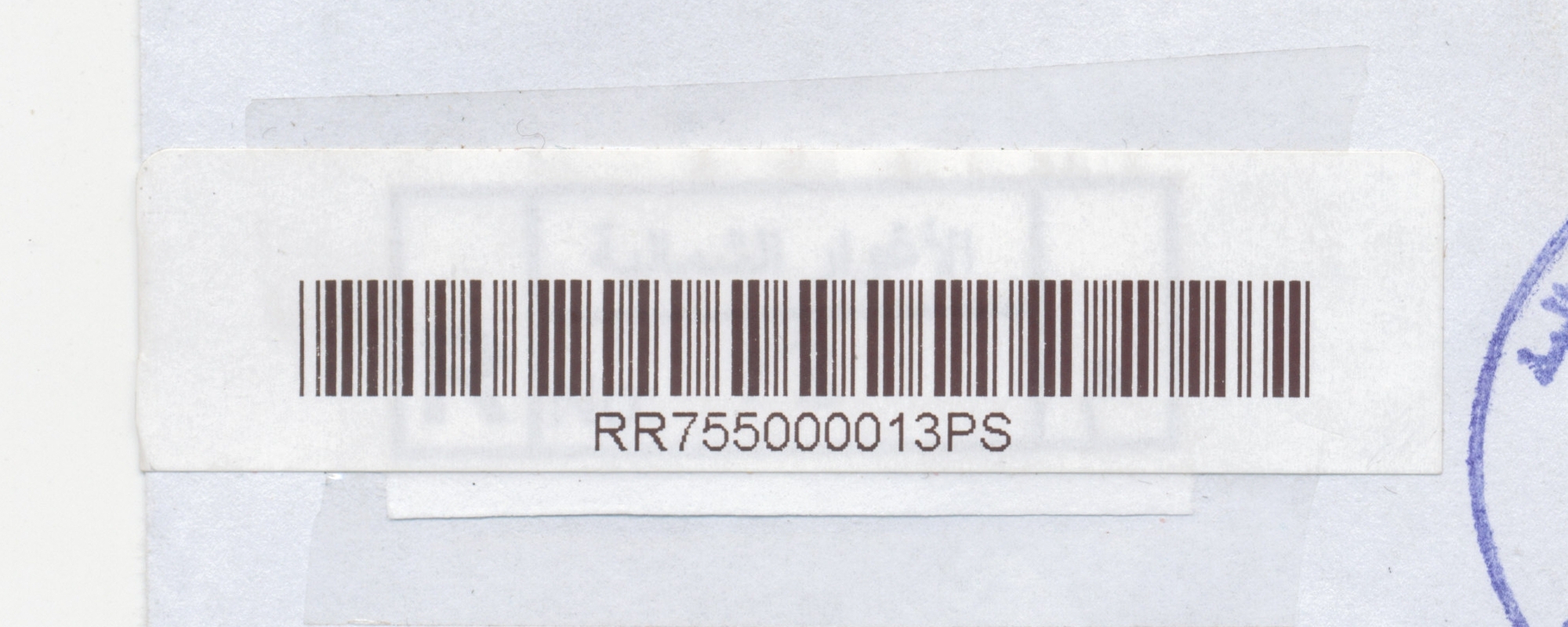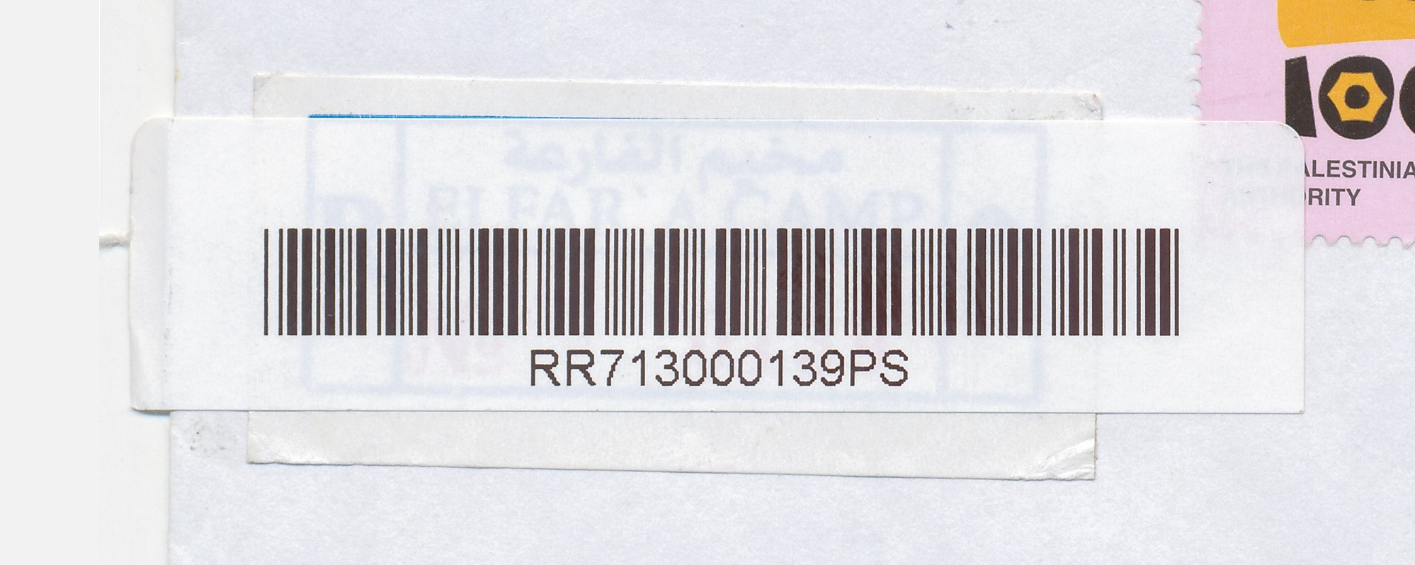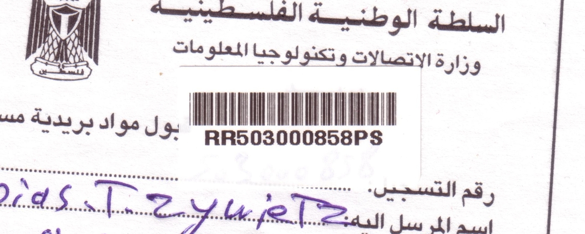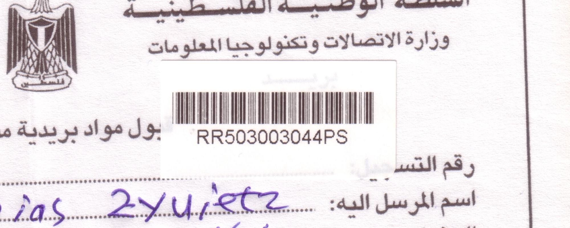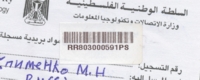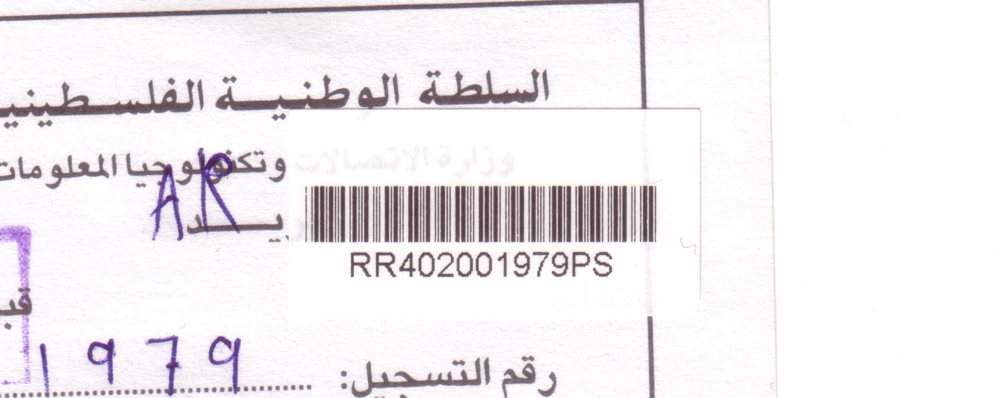 - white self-adhesive labels, printed in black. "IPS Light" linear barcode. With or without "Palestine Post" on top of imprinted numerator (9 digits) with prefixed RR and suffixed PS or ps. Label size varies.