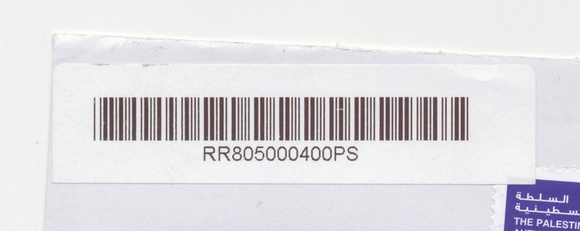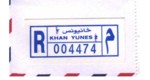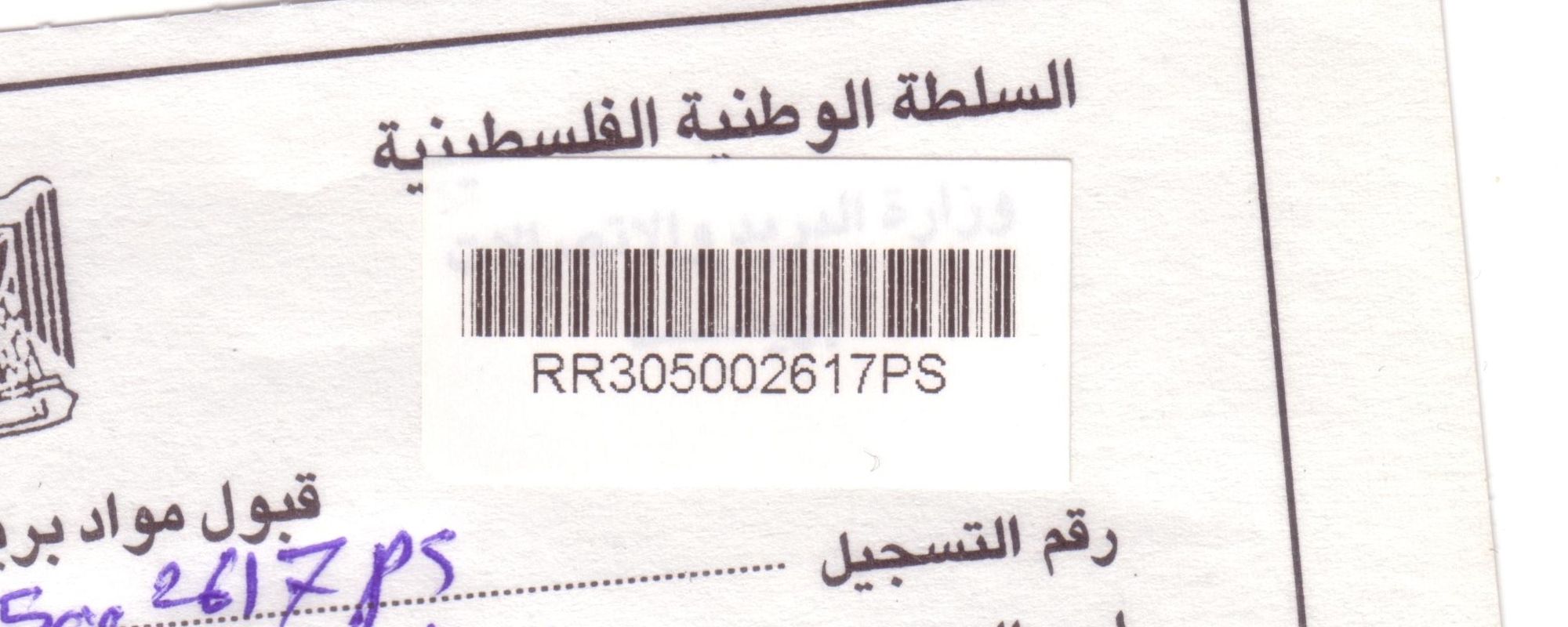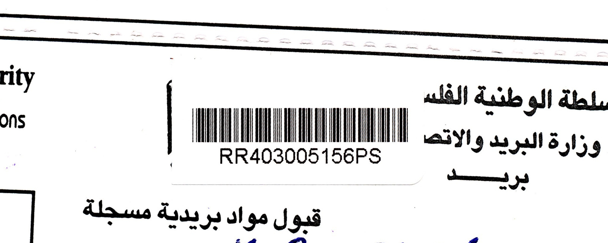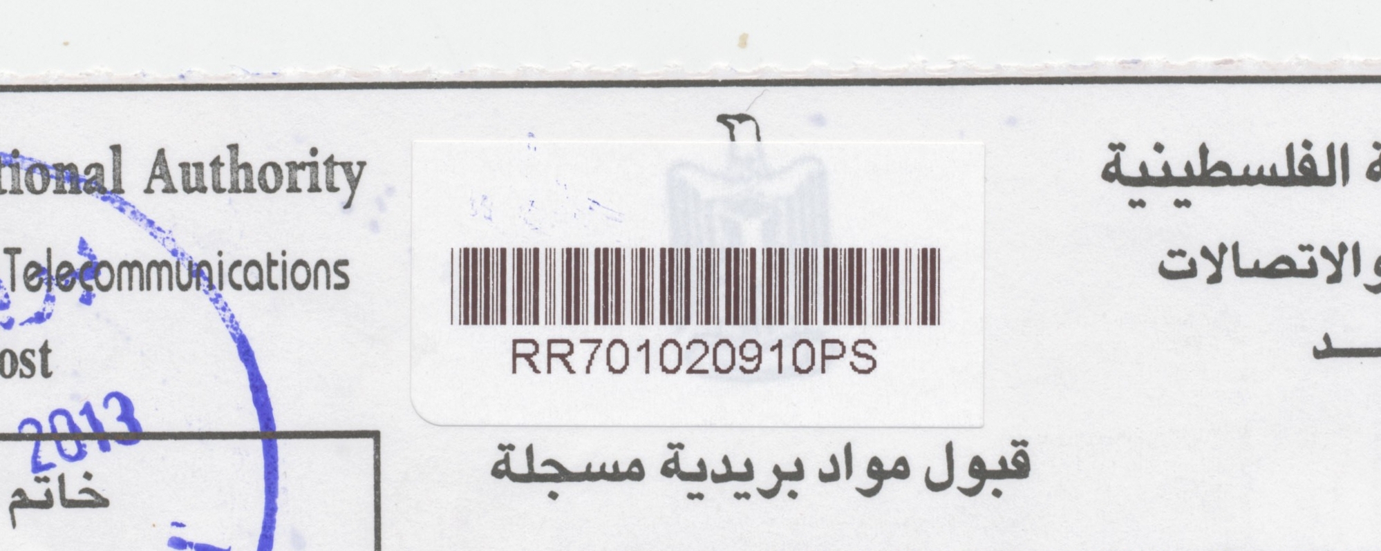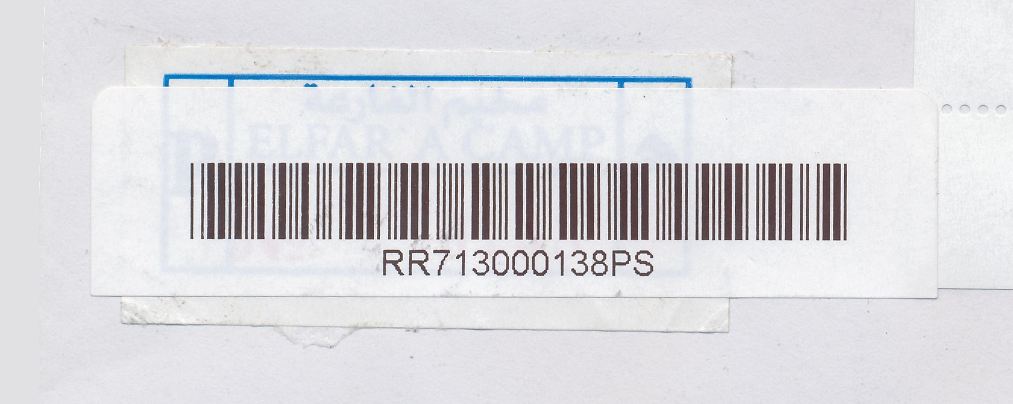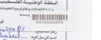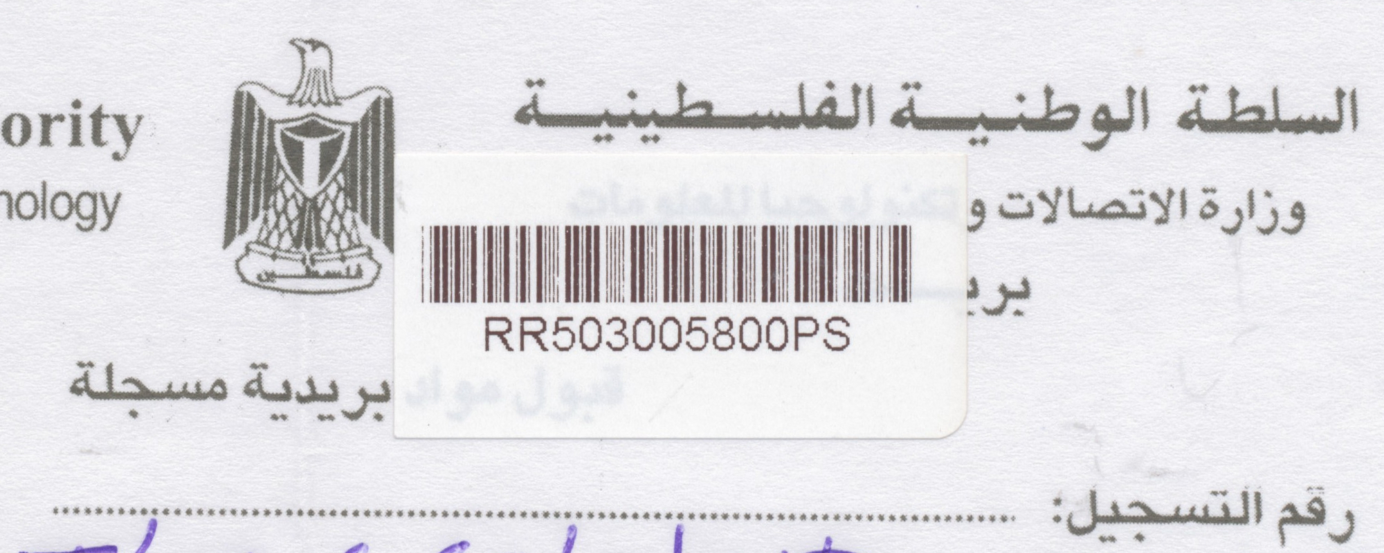 - white self-adhesive labels, printed in black. "IPS Light" linear barcode. With or without "Palestine Post" on top of imprinted numerator (9 digits) with prefixed RR and suffixed PS or ps. Label size varies.