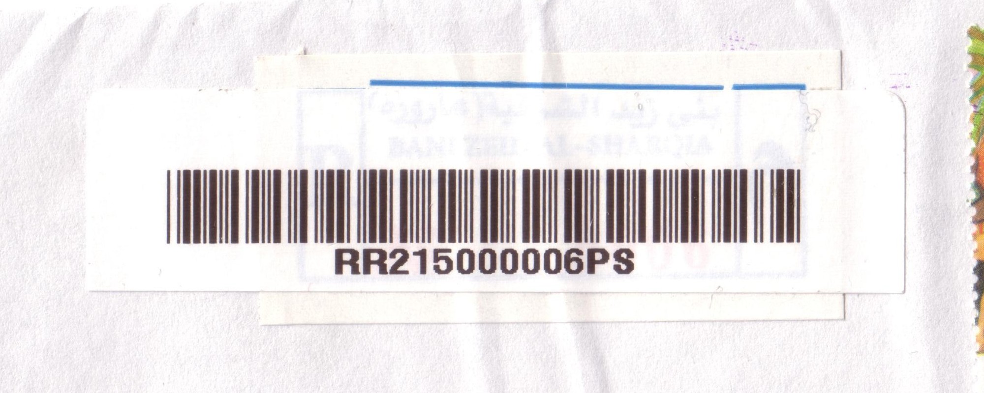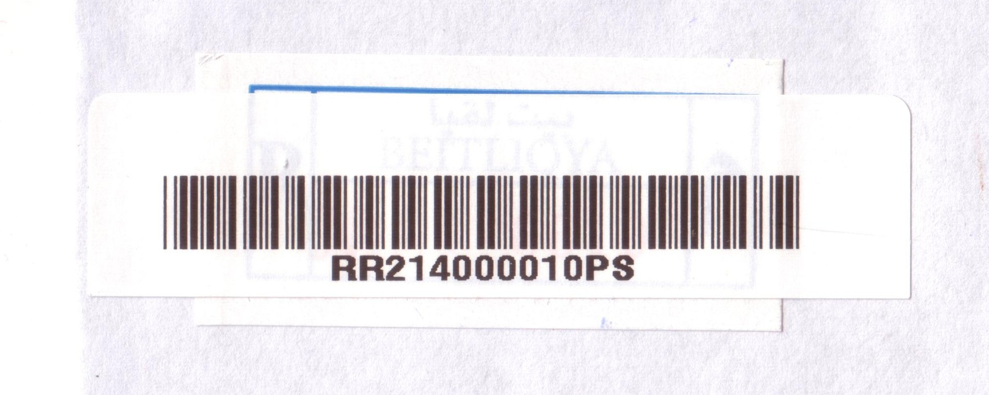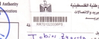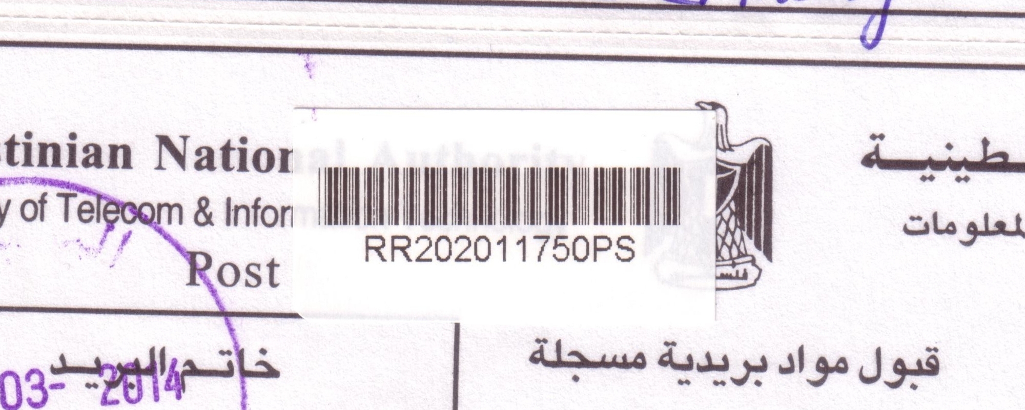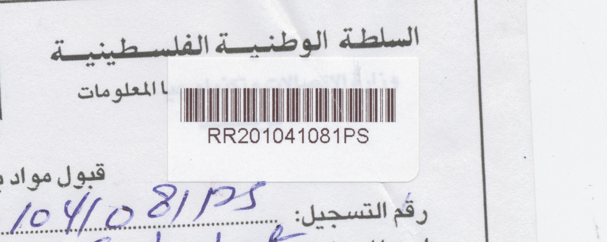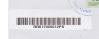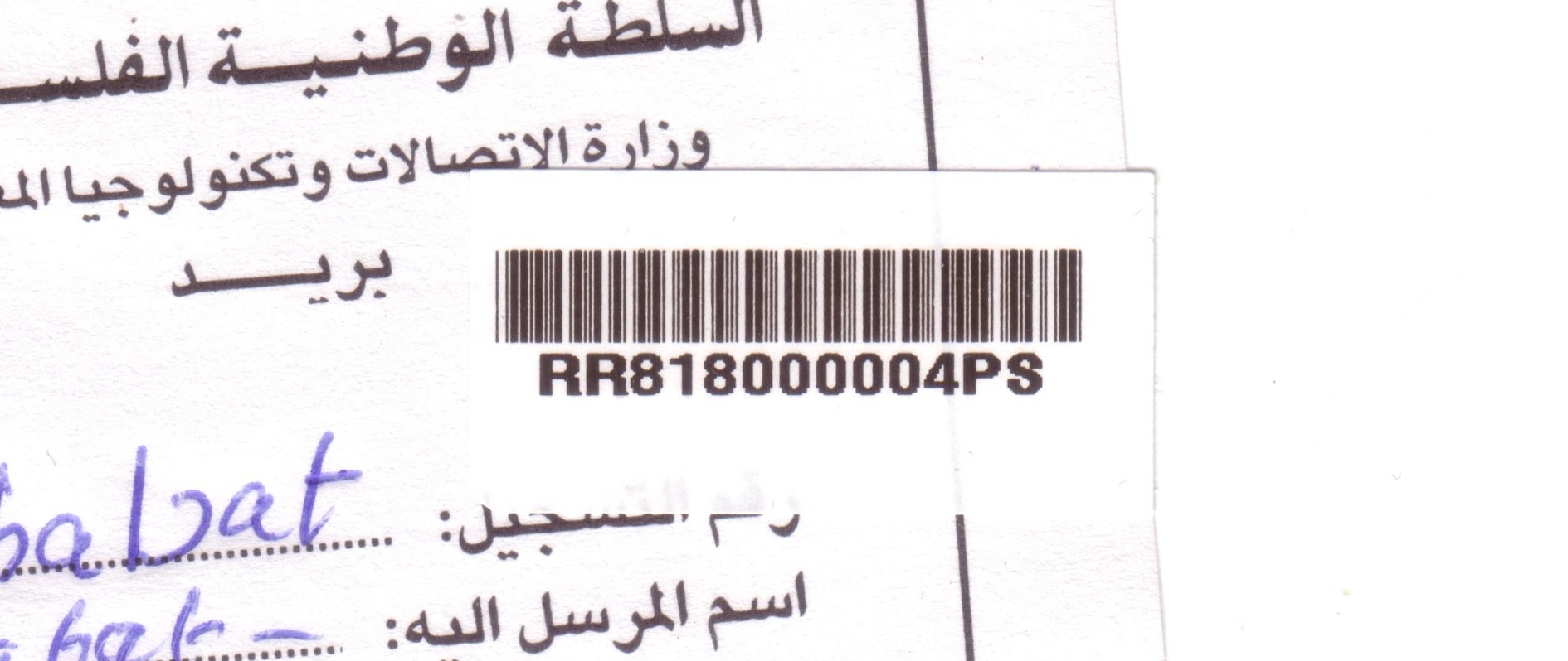- white self-adhesive labels, printed in black. "IPS Light" linear barcode. With or without "Palestine Post" on top of imprinted numerator (9 digits) with prefixed RR and suffixed PS or ps. Label size varies.