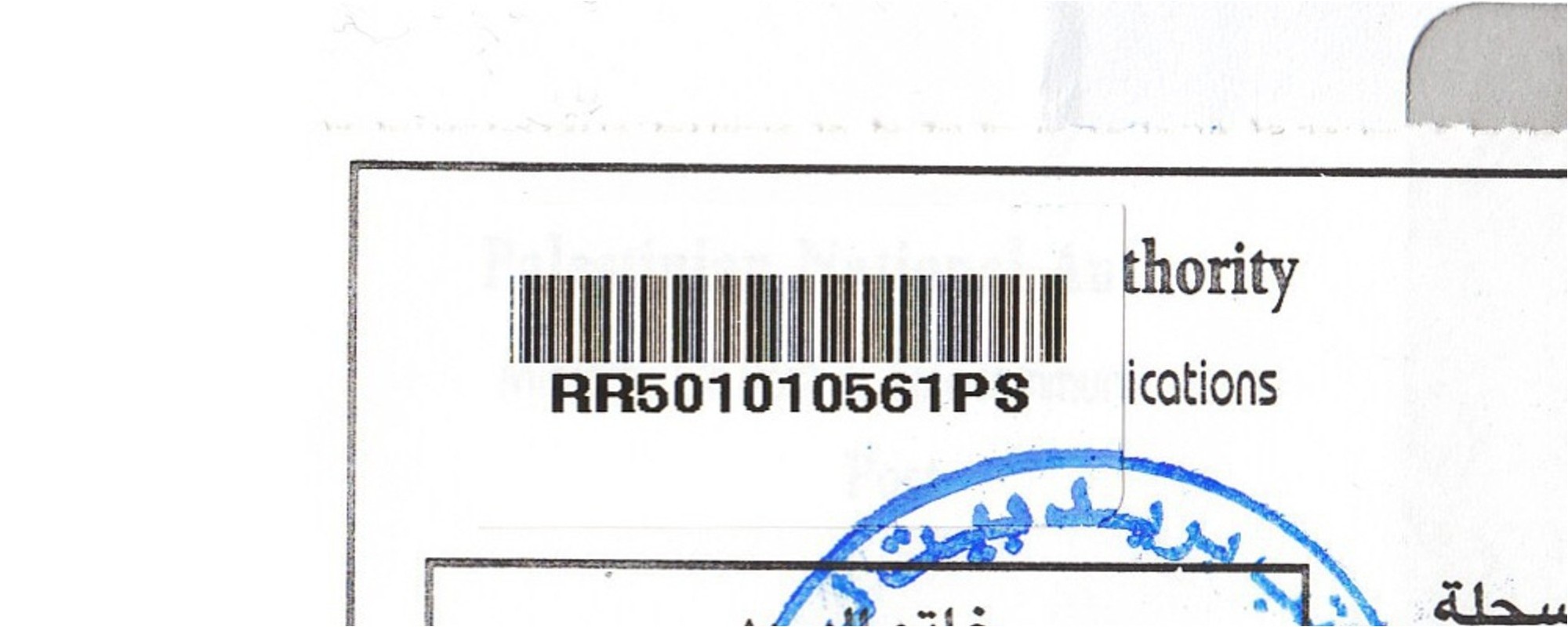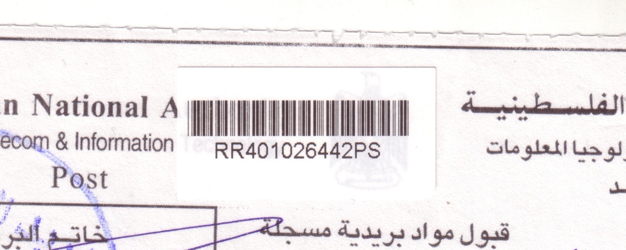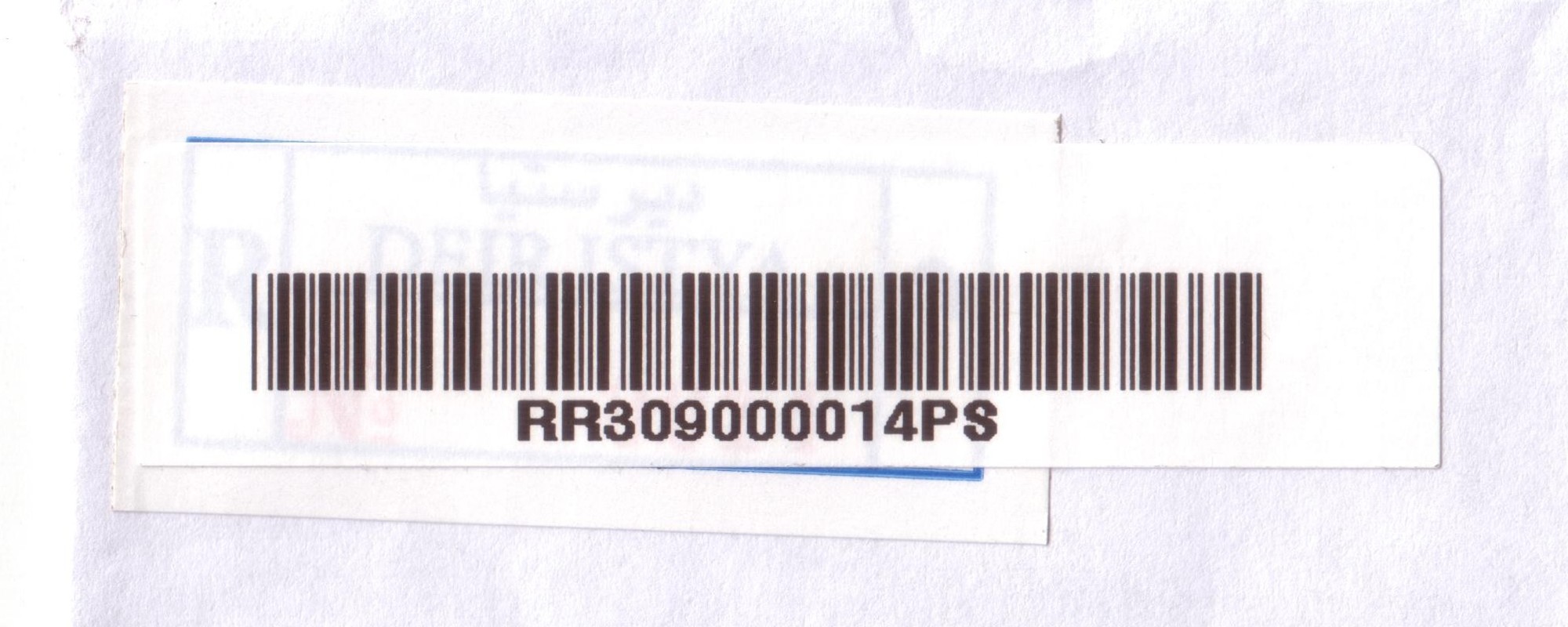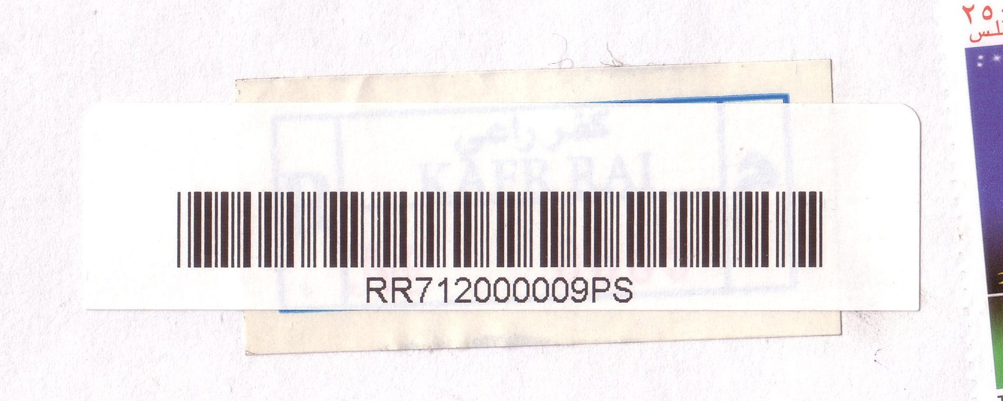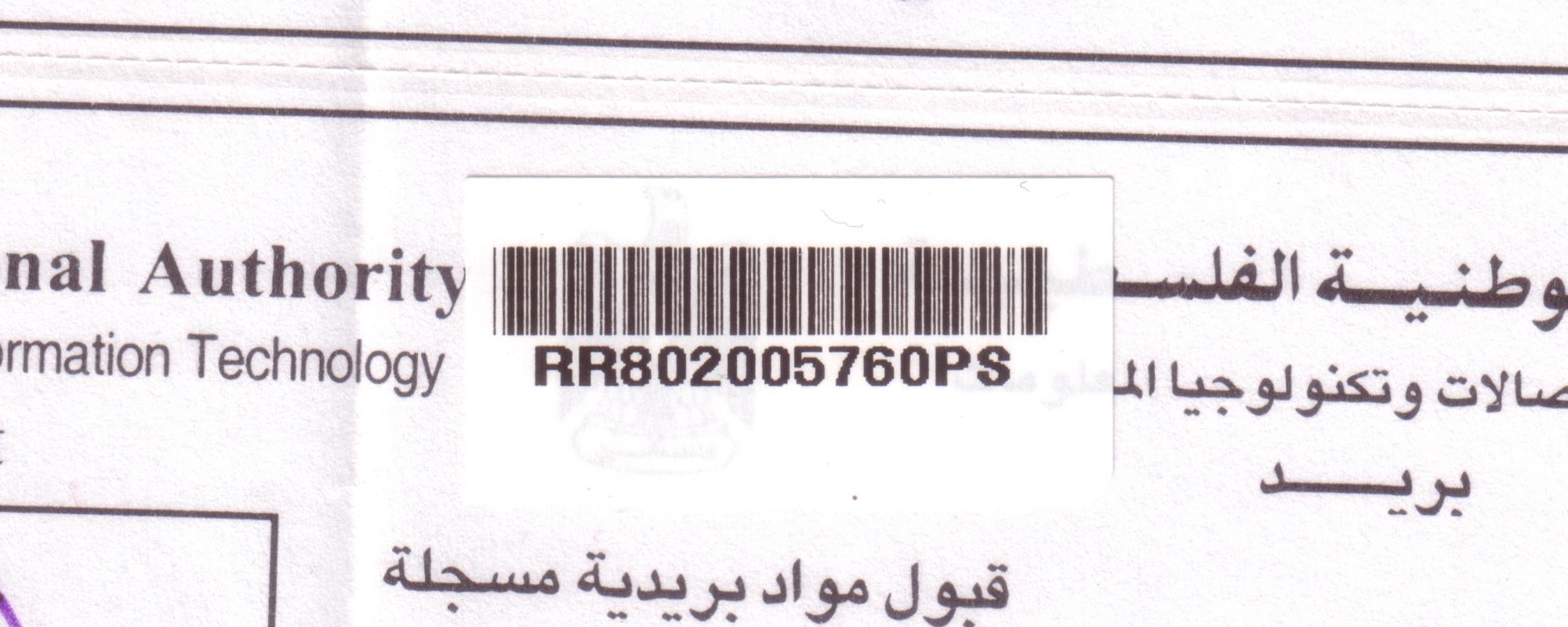 - white self-adhesive labels, printed in black. "IPS Light" linear barcode. With or without "Palestine Post" on top of imprinted numerator (9 digits) with prefixed RR and suffixed PS or ps. Label size varies.