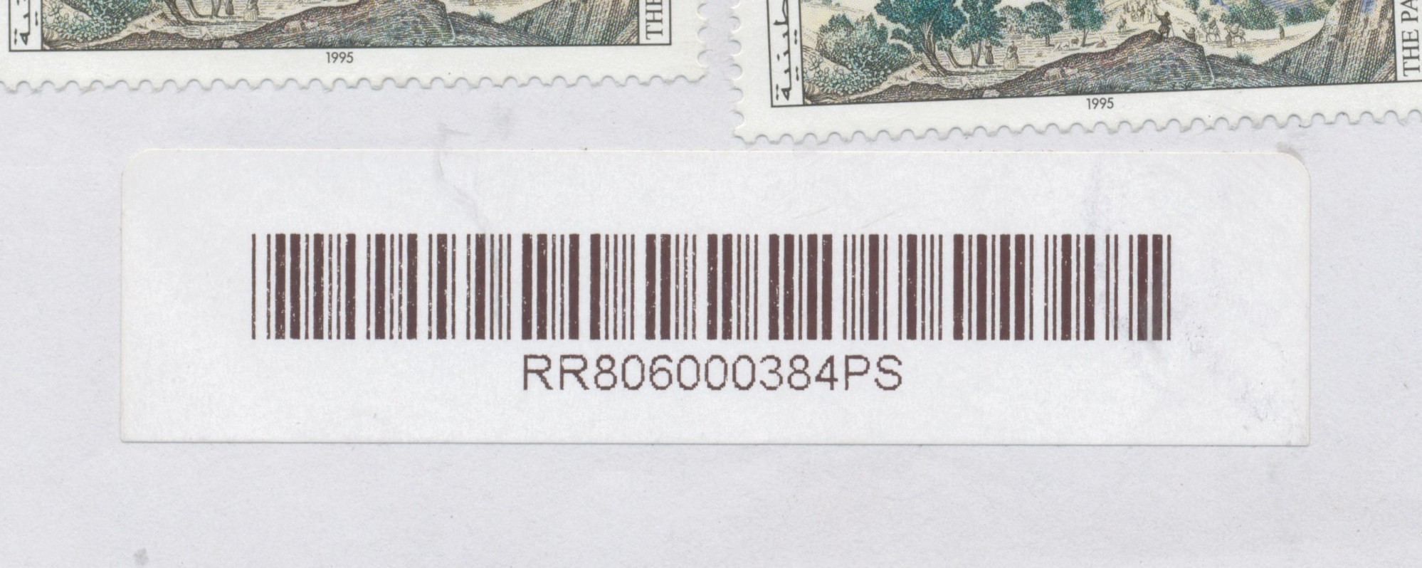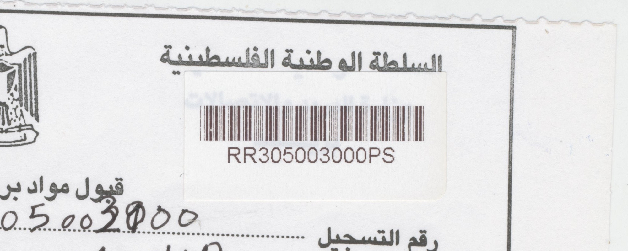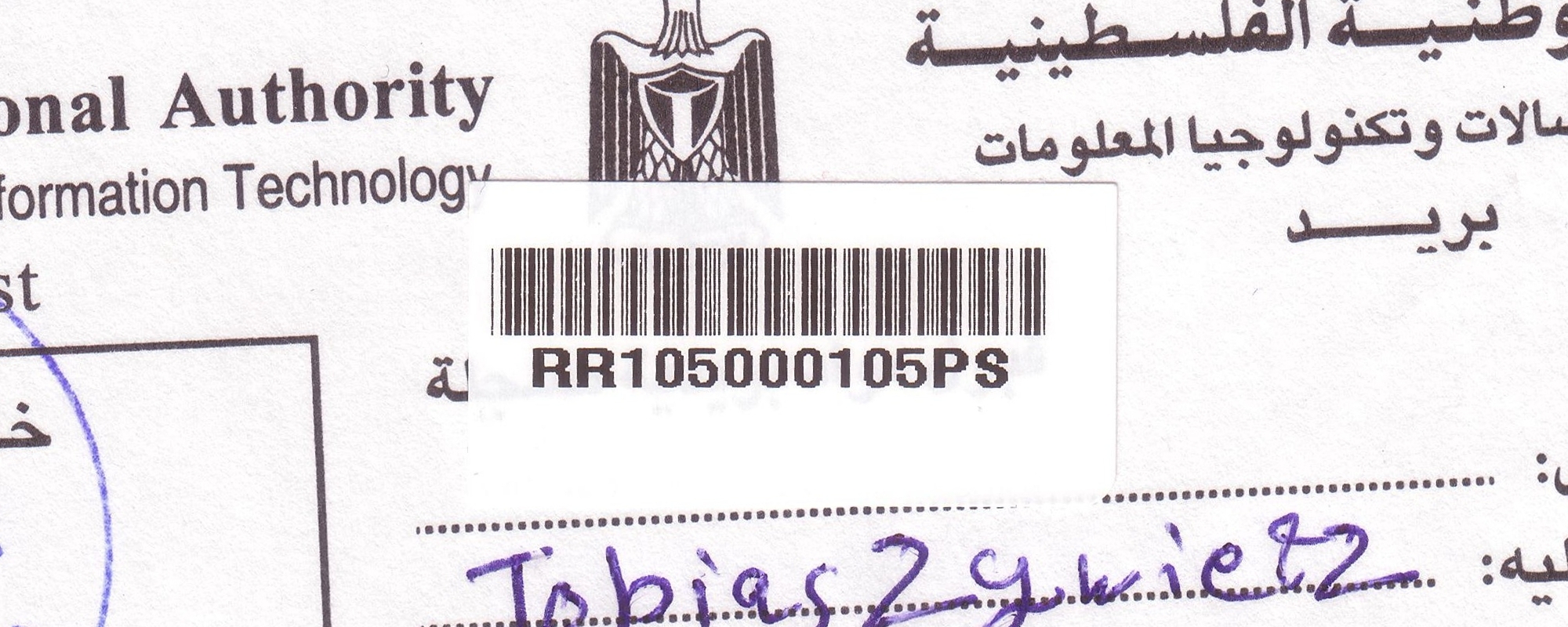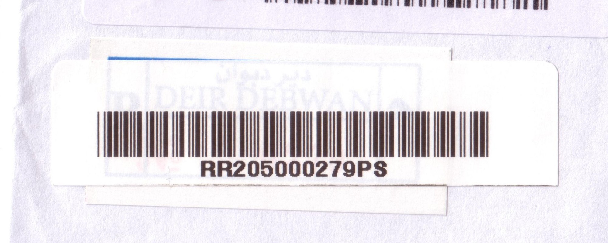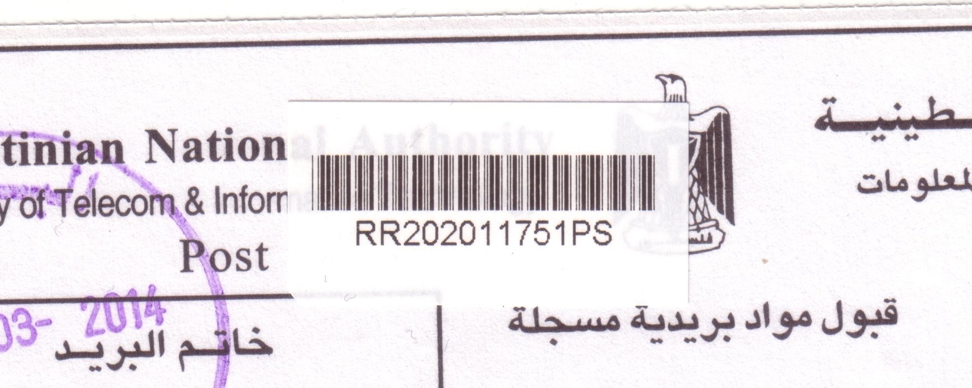 - white self-adhesive labels, printed in black. "IPS Light" linear barcode. With or without "Palestine Post" on top of imprinted numerator (9 digits) with prefixed RR and suffixed PS or ps. Label size varies.