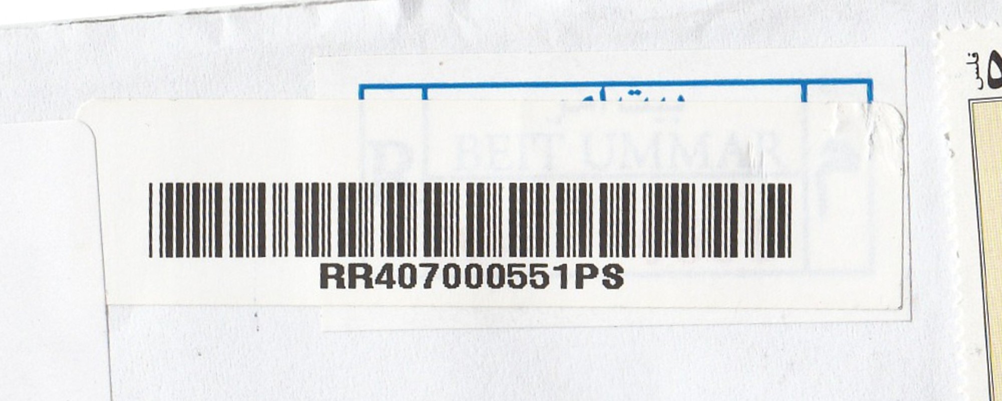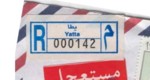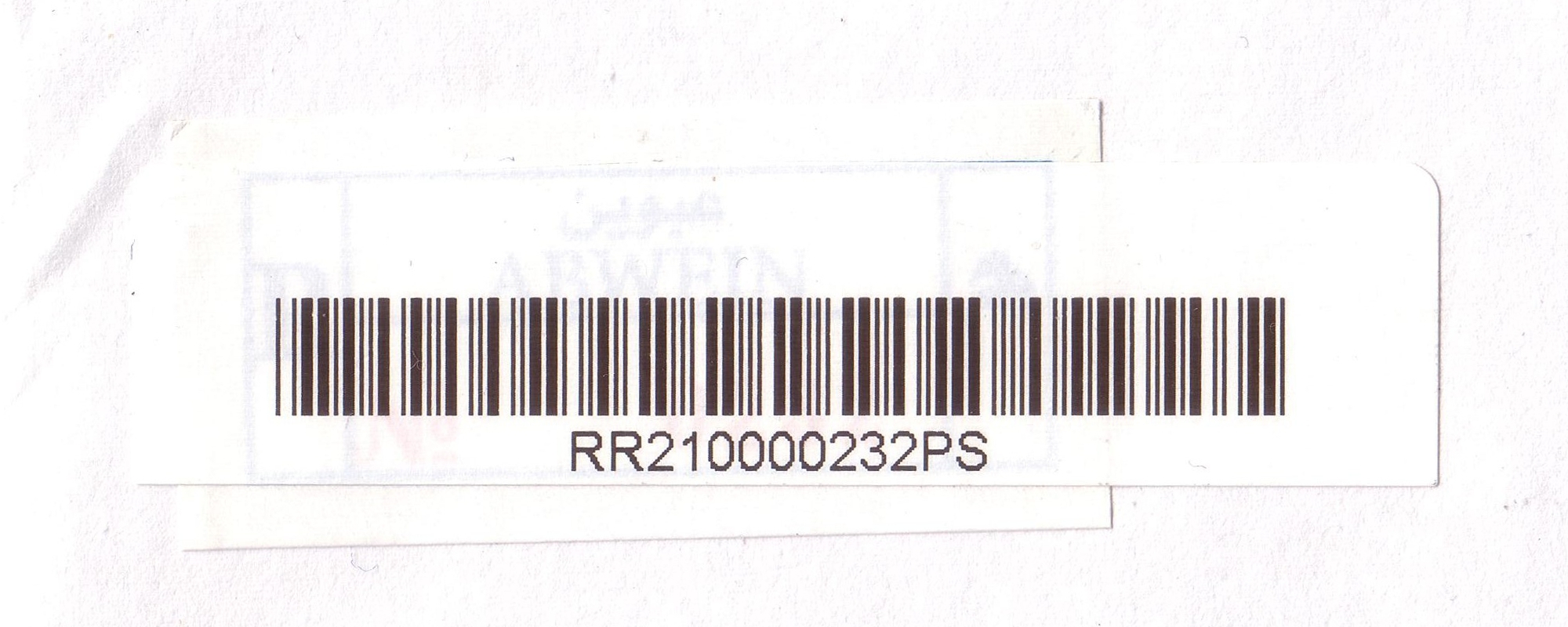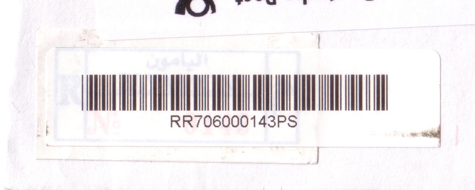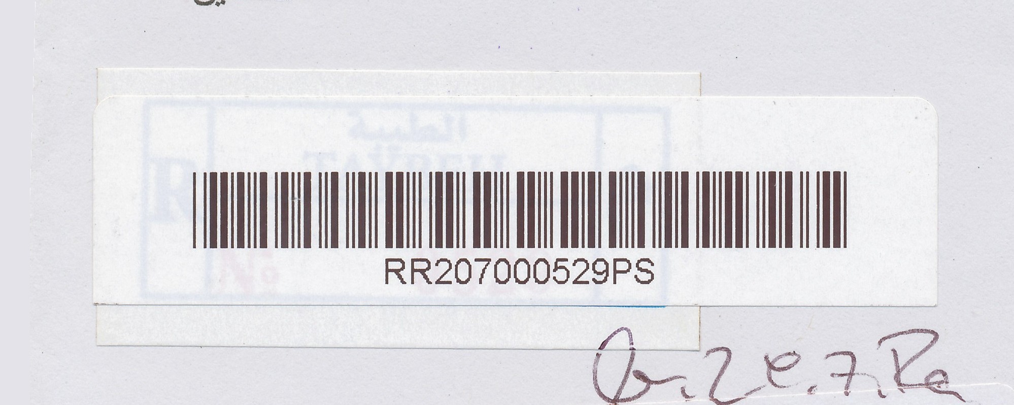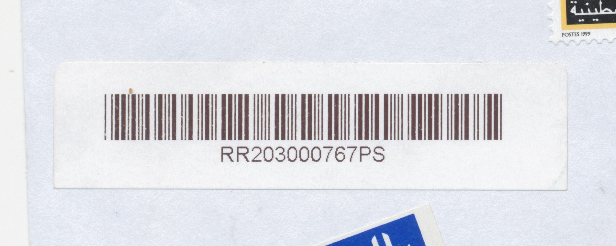 - white self-adhesive labels, printed in black. "IPS Light" linear barcode. With or without "Palestine Post" on top of imprinted numerator (9 digits) with prefixed RR and suffixed PS or ps. Label size varies.