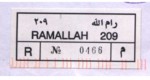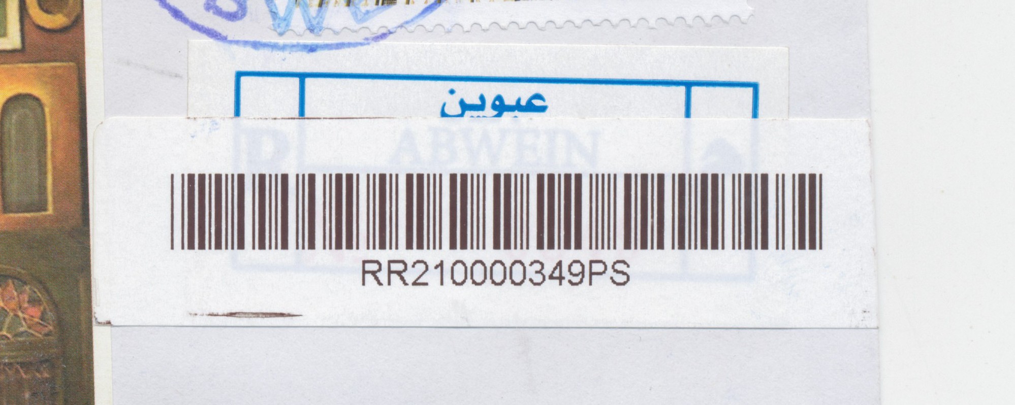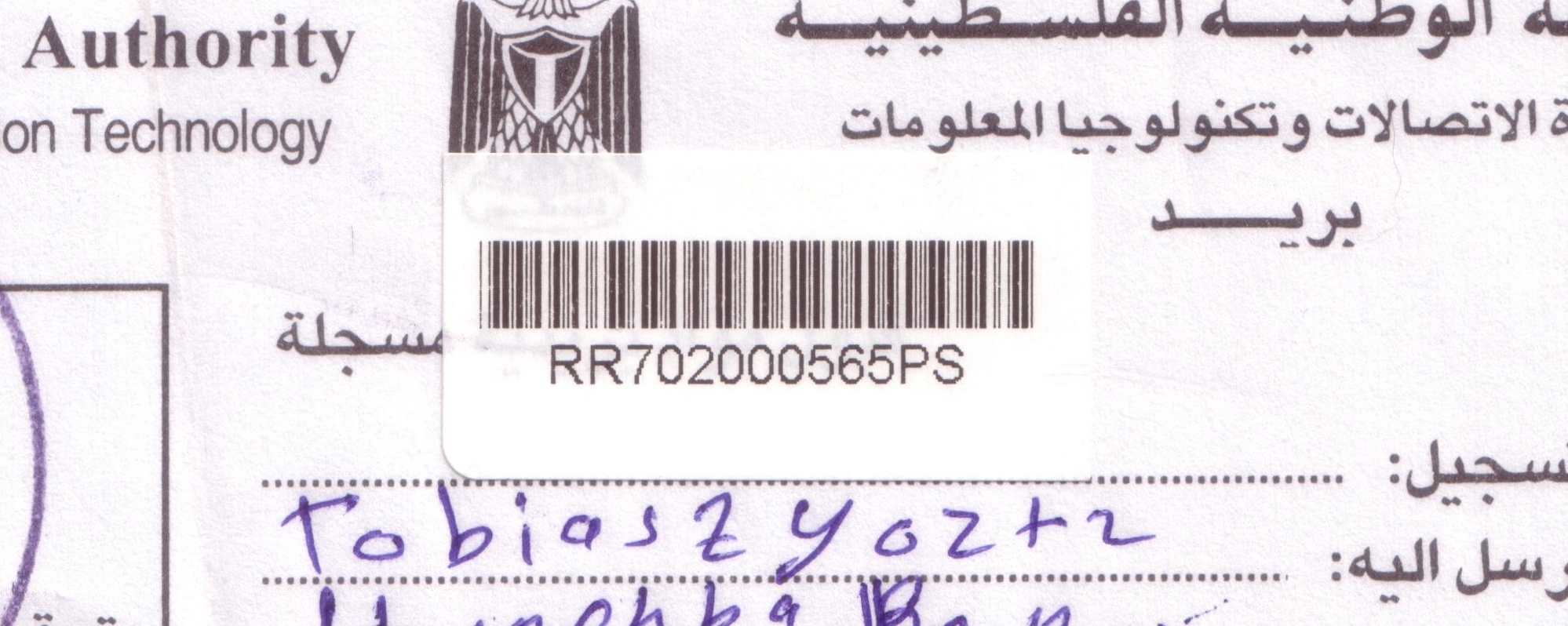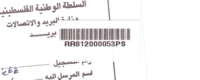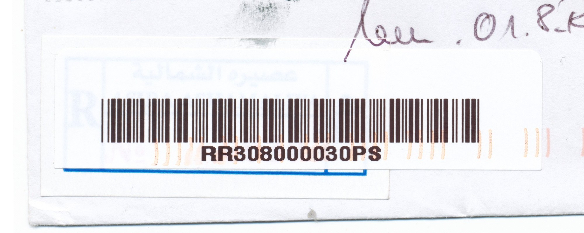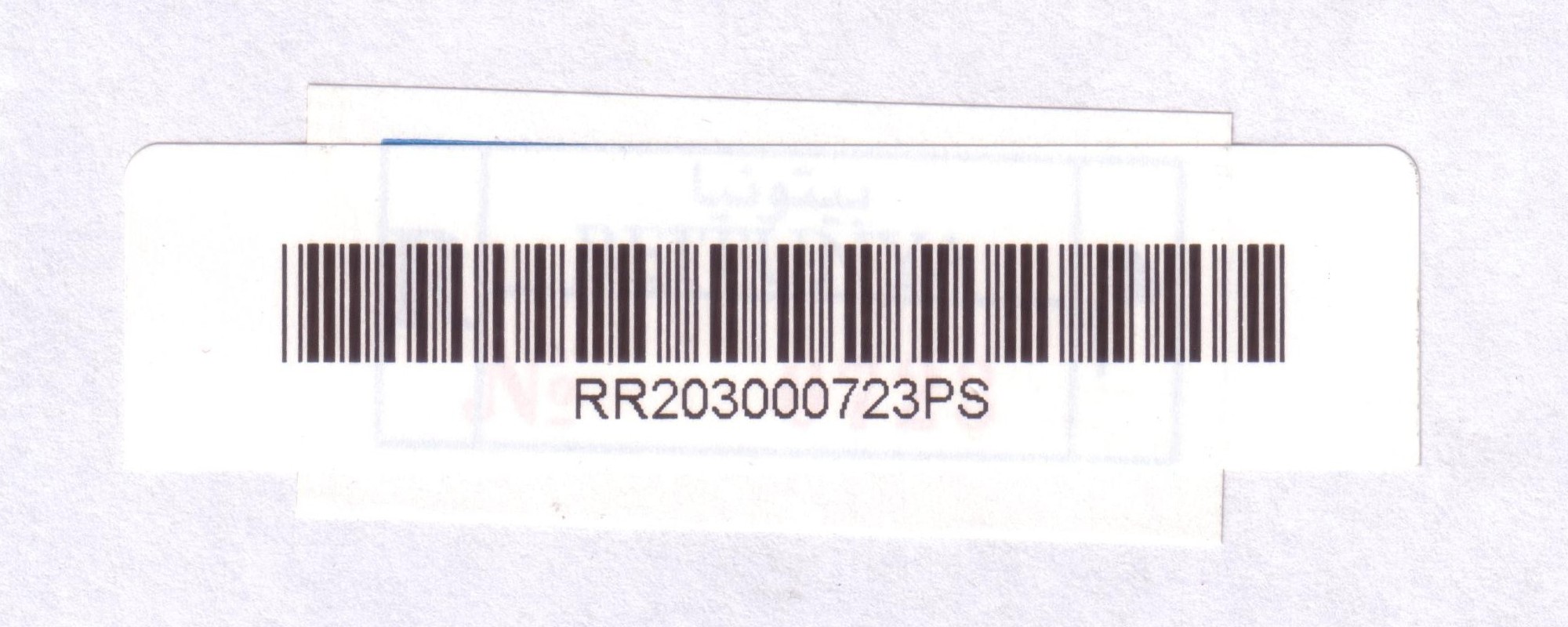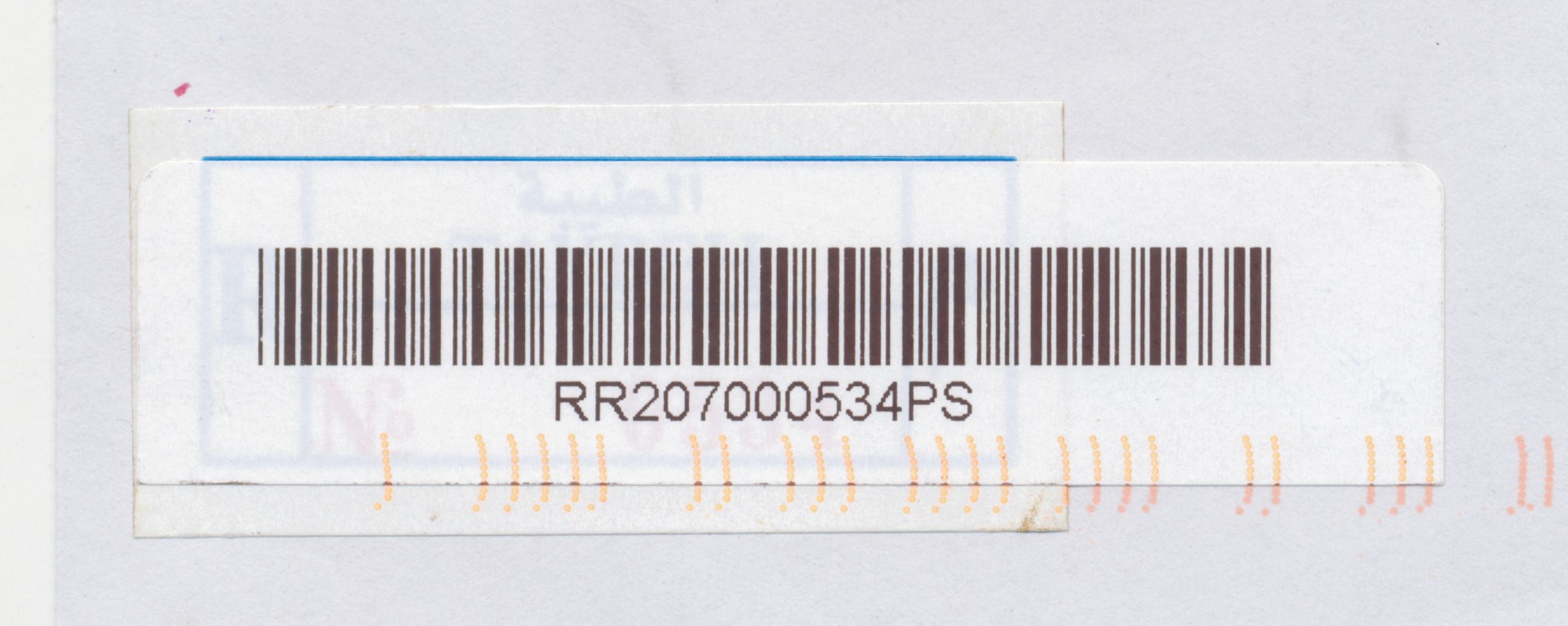 - white self-adhesive labels, printed in black. "IPS Light" linear barcode. With or without "Palestine Post" on top of imprinted numerator (9 digits) with prefixed RR and suffixed PS or ps. Label size varies.
