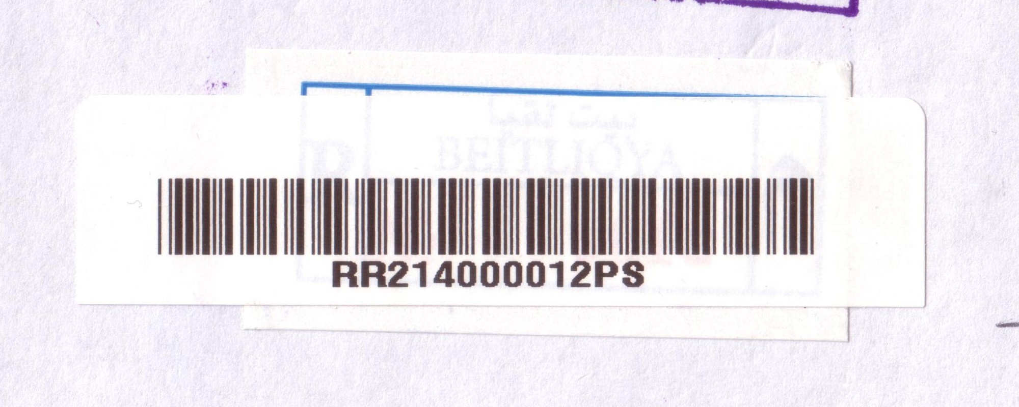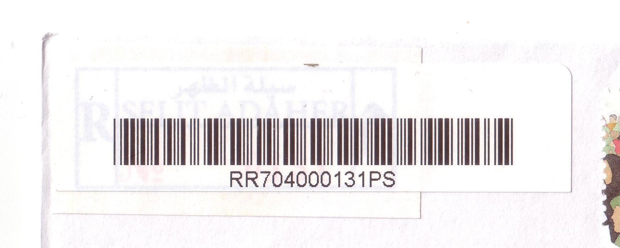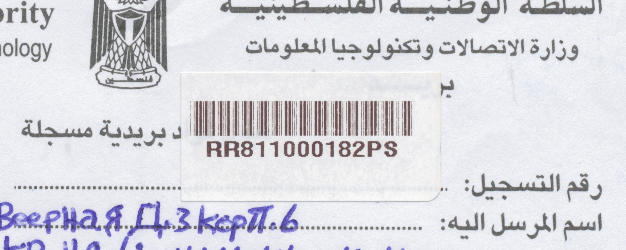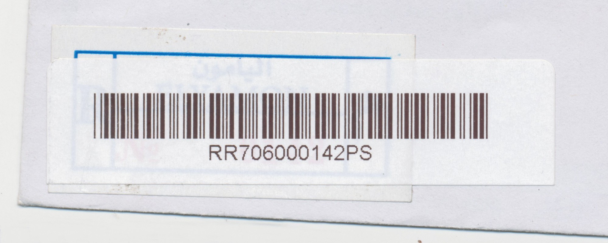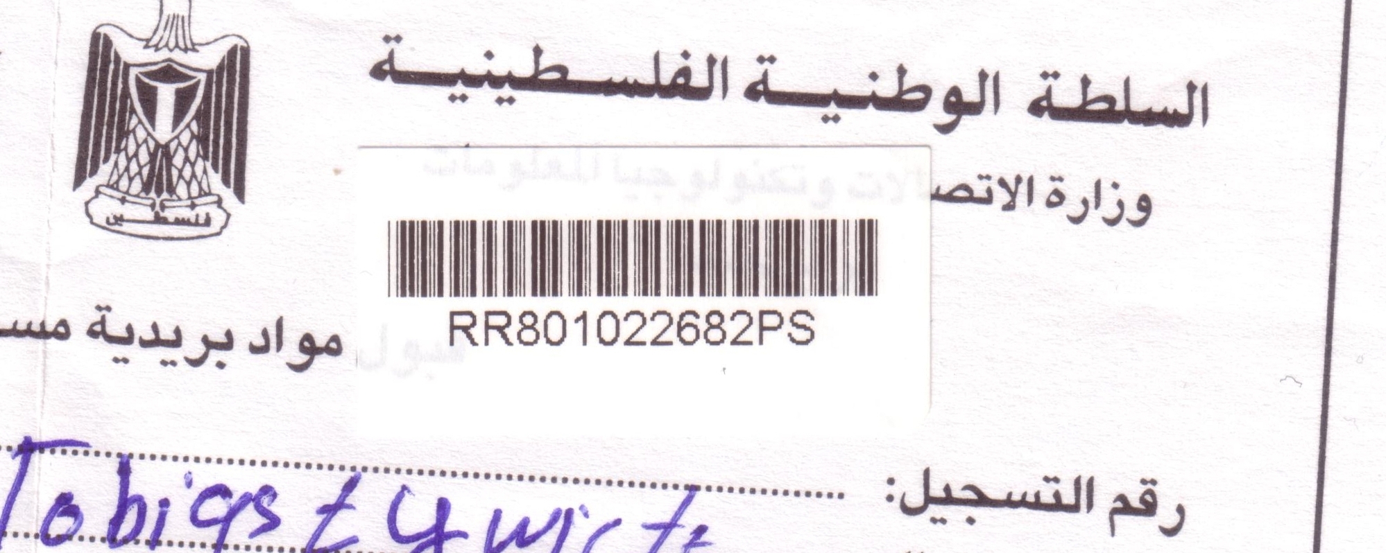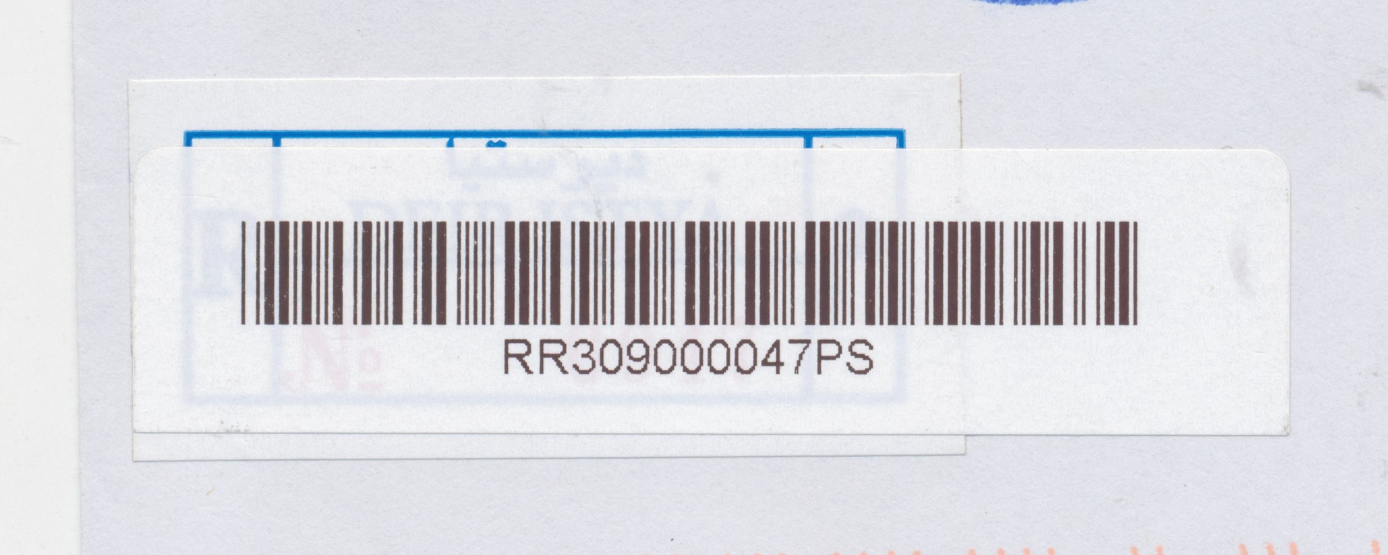 - white self-adhesive labels, printed in black. "IPS Light" linear barcode. With or without "Palestine Post" on top of imprinted numerator (9 digits) with prefixed RR and suffixed PS or ps. Label size varies.