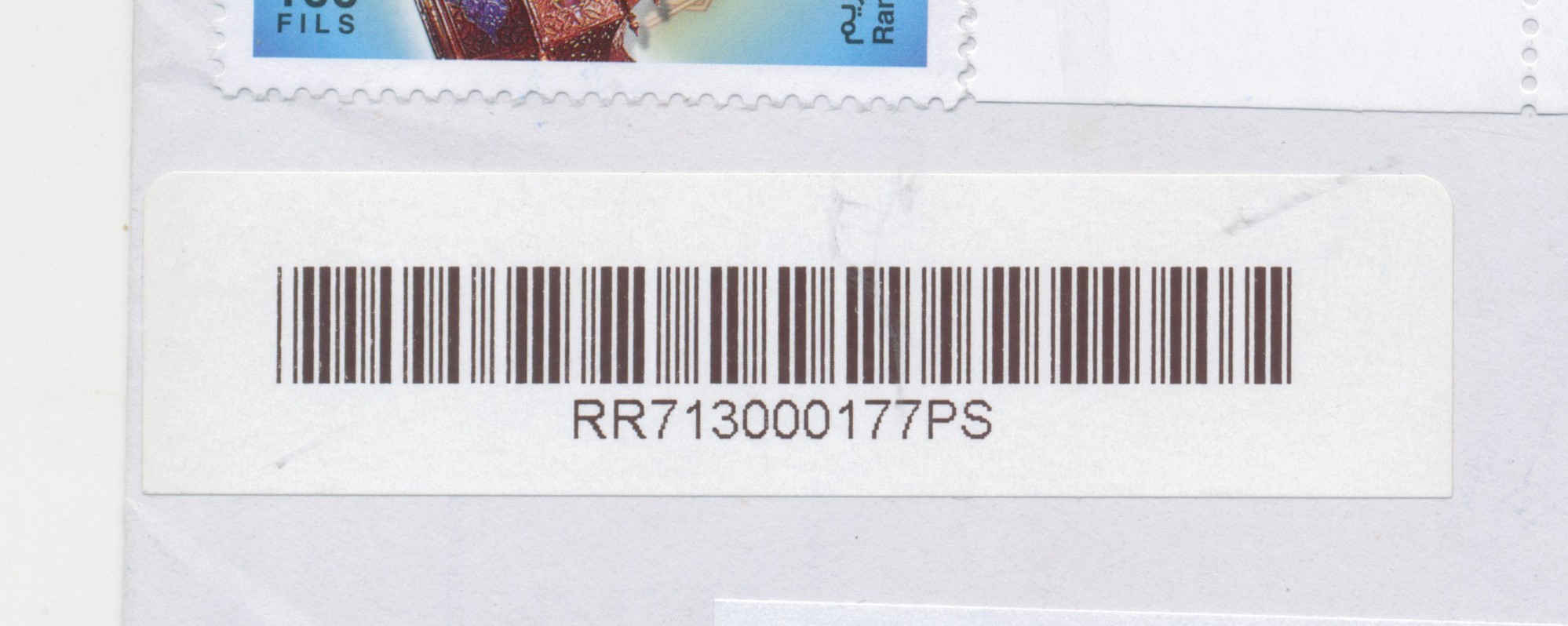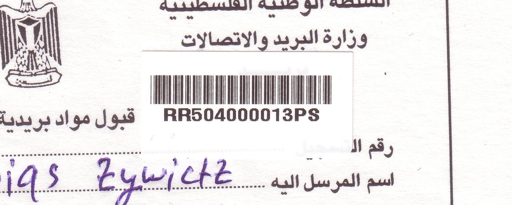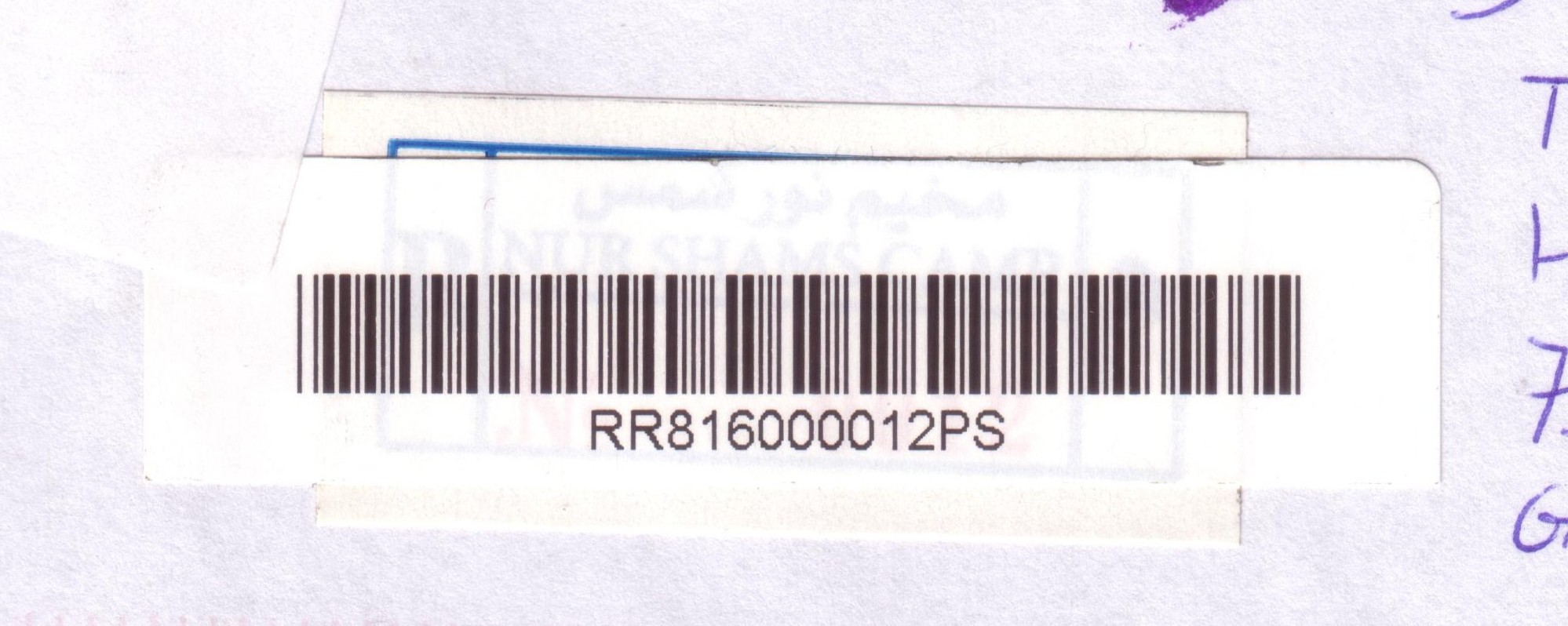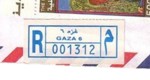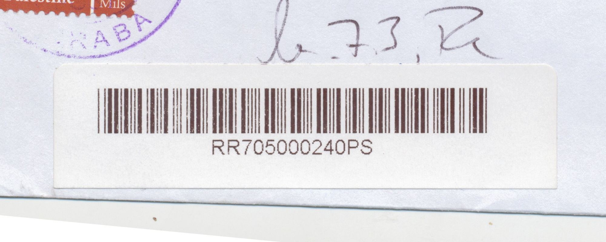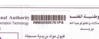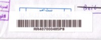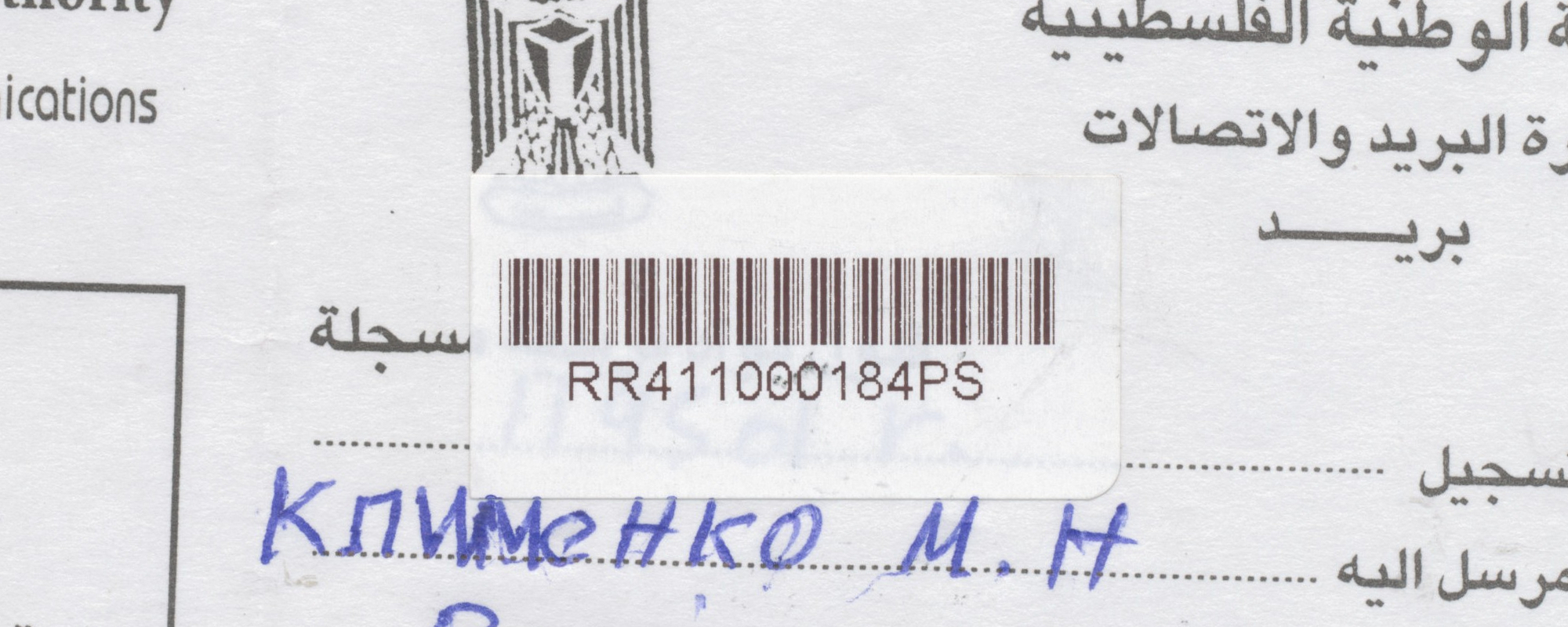 - white self-adhesive labels, printed in black. "IPS Light" linear barcode. With or without "Palestine Post" on top of imprinted numerator (9 digits) with prefixed RR and suffixed PS or ps. Label size varies.