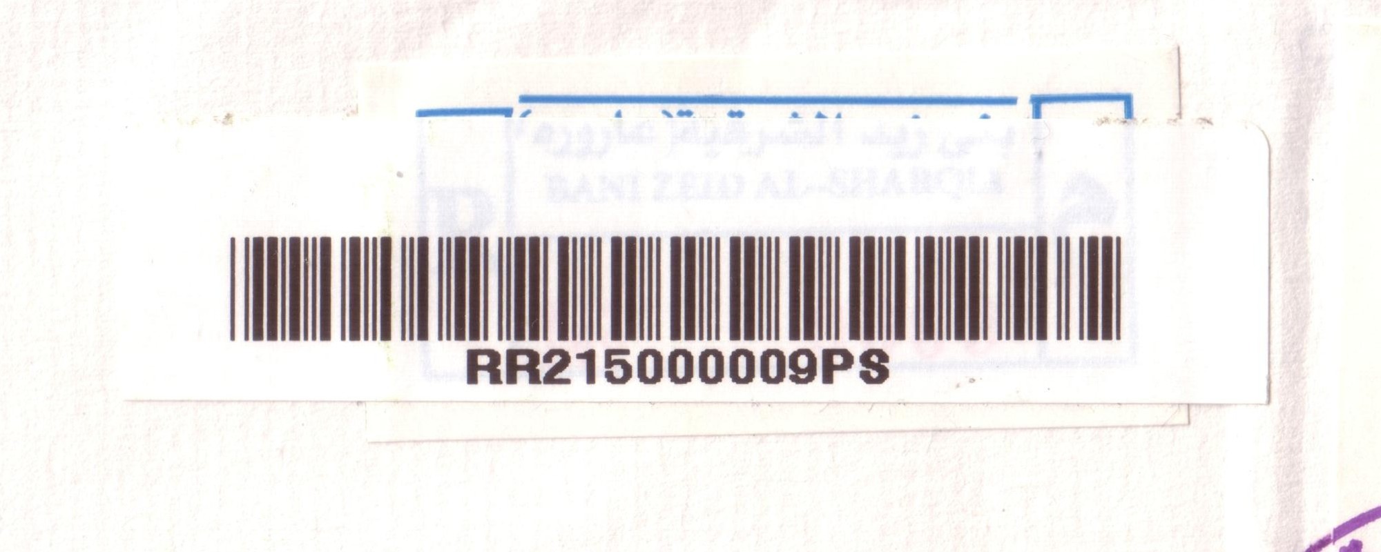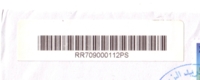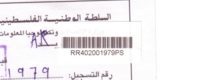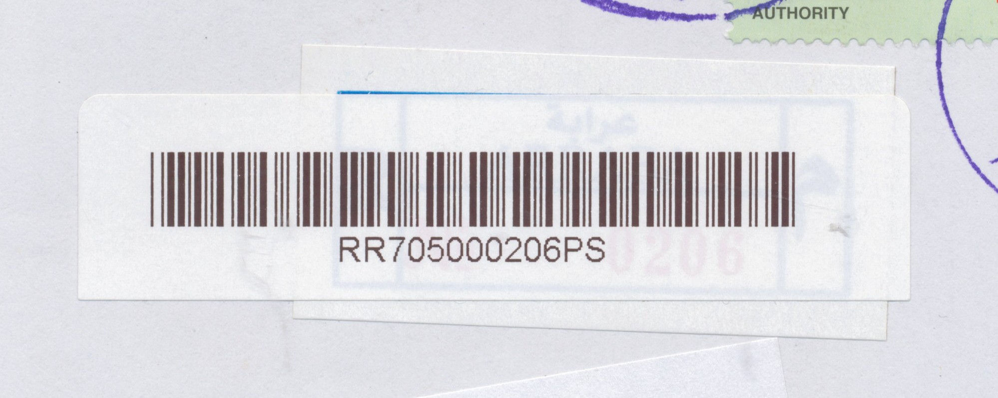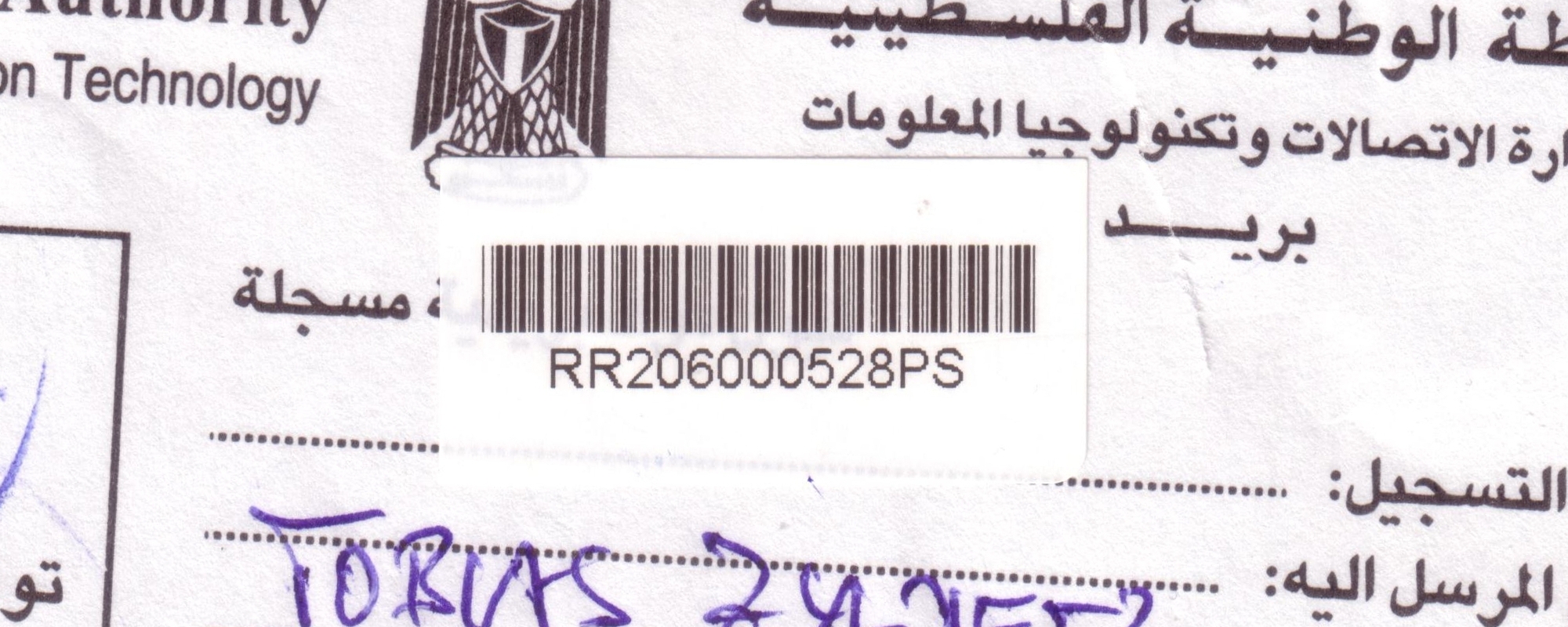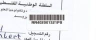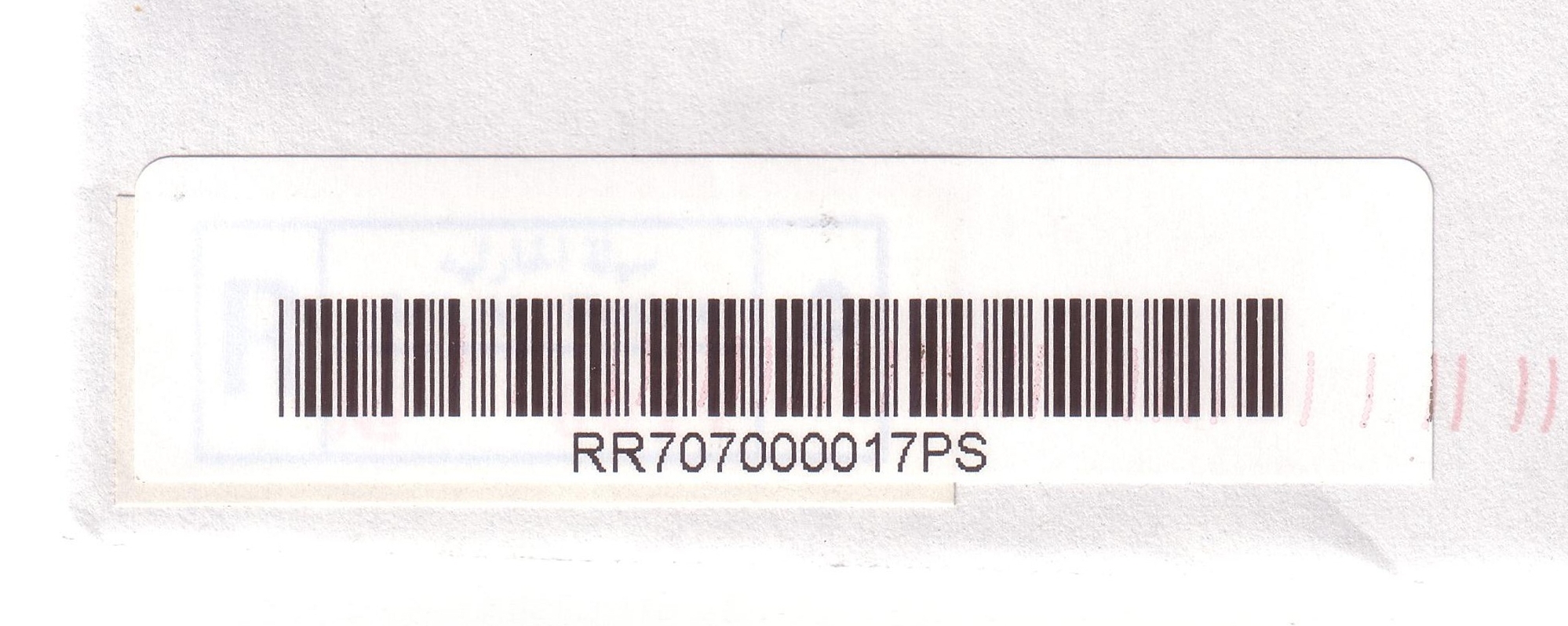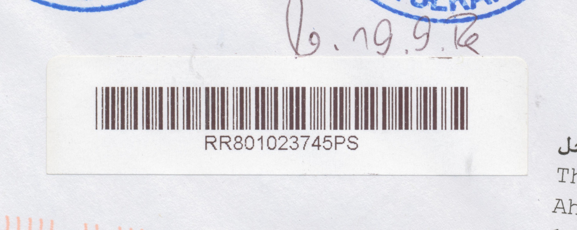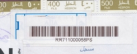 - white self-adhesive labels, printed in black. "IPS Light" linear barcode. With or without "Palestine Post" on top of imprinted numerator (9 digits) with prefixed RR and suffixed PS or ps. Label size varies.