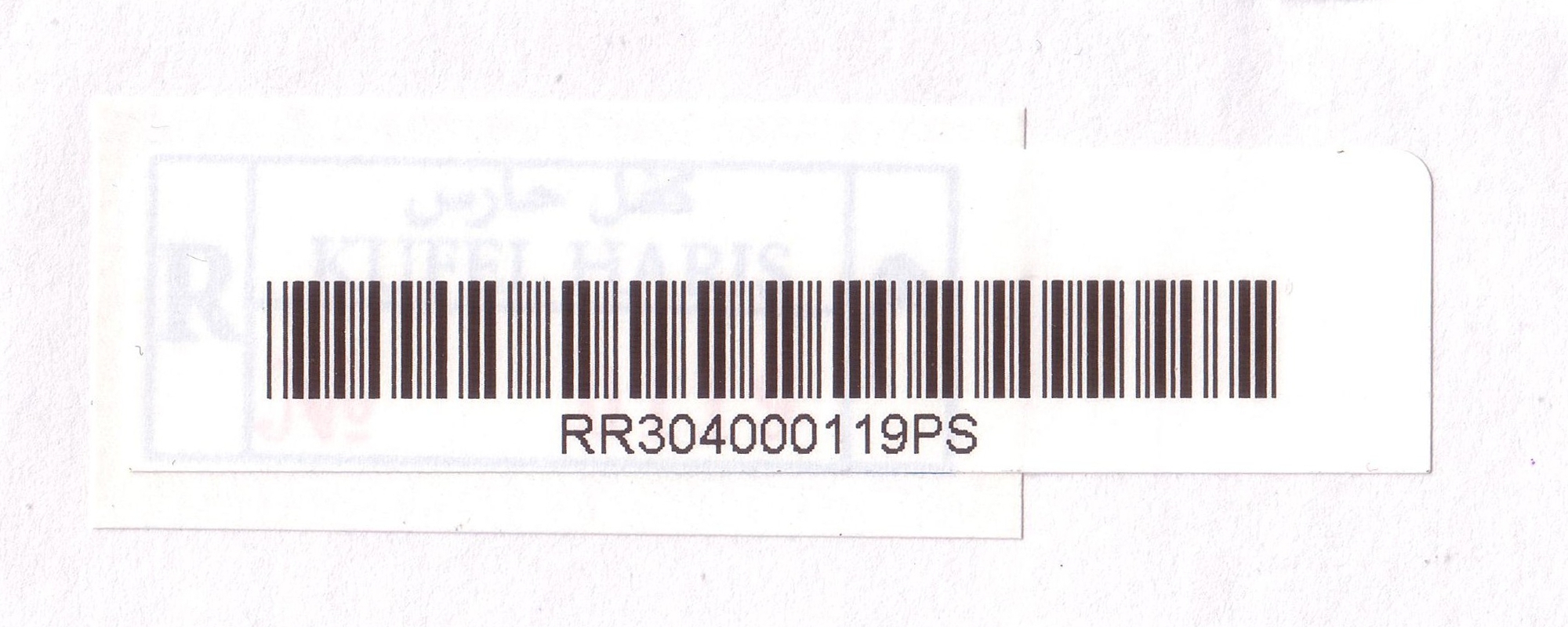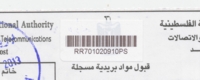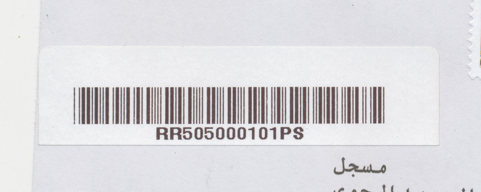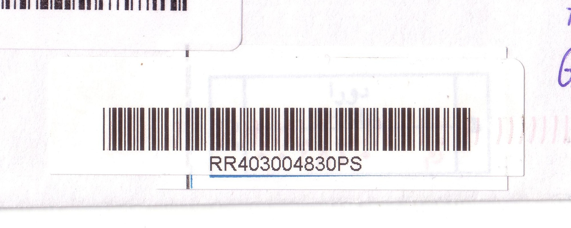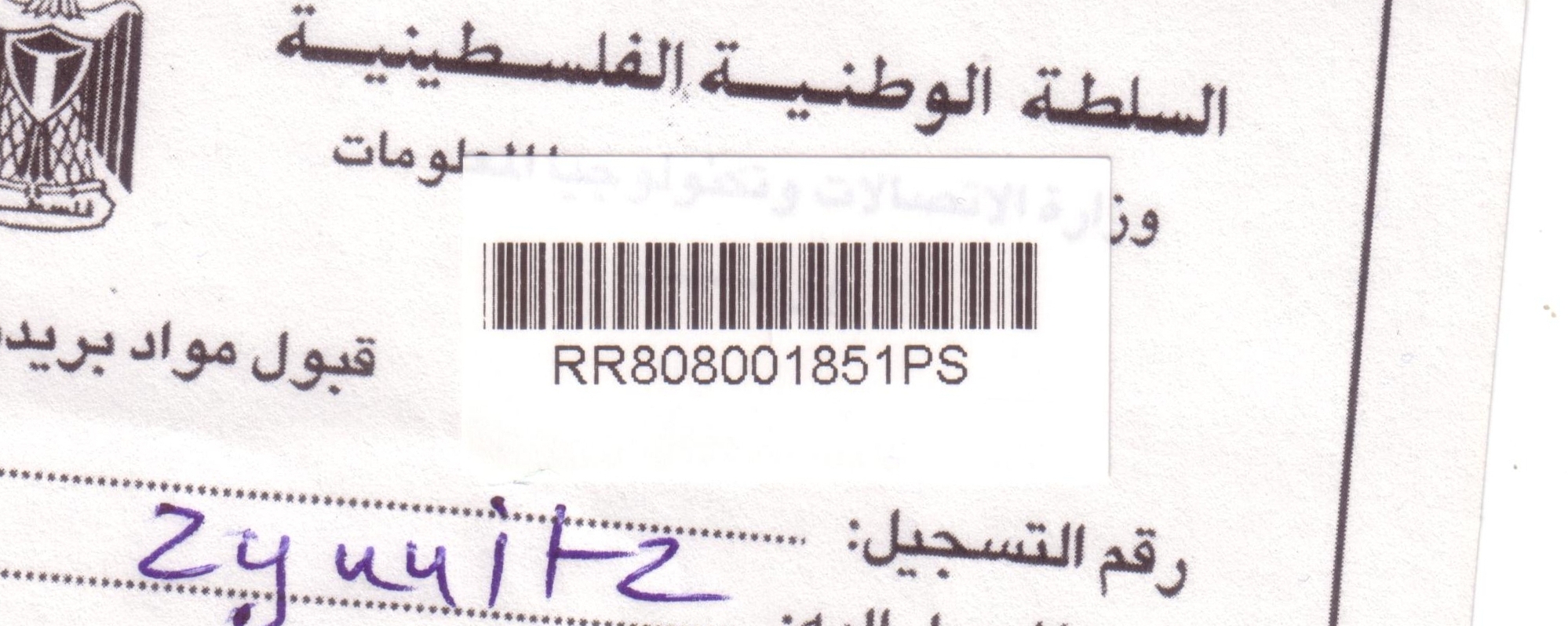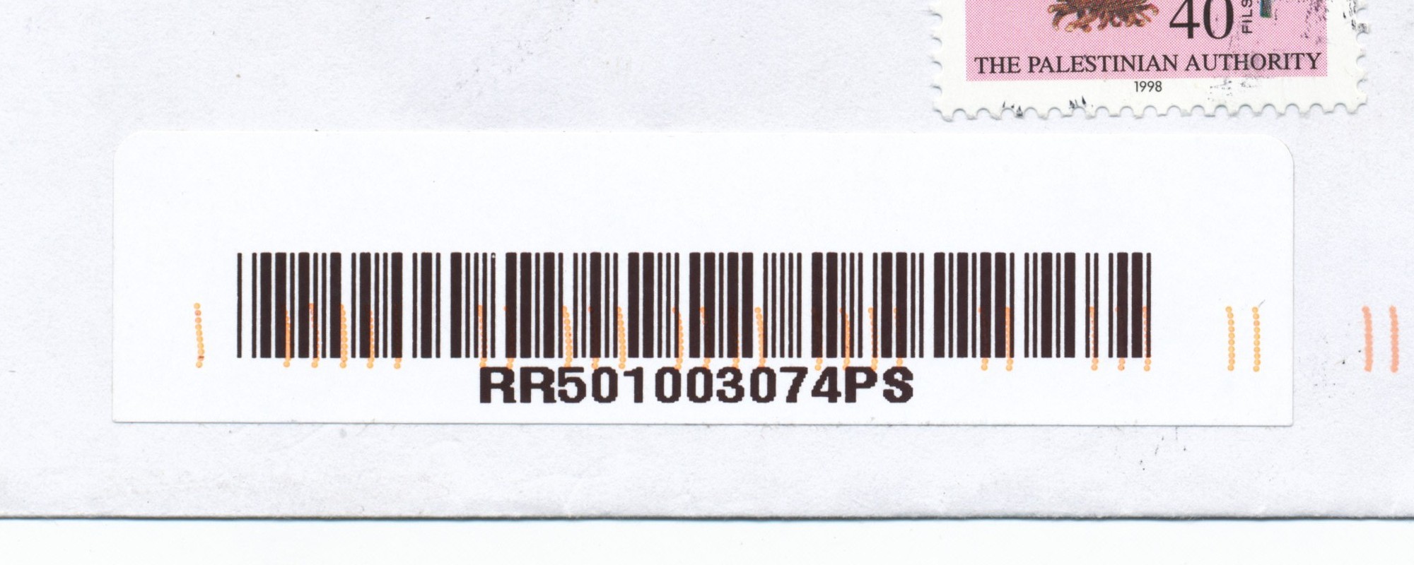 - white self-adhesive labels, printed in black. "IPS Light" linear barcode. With or without "Palestine Post" on top of imprinted numerator (9 digits) with prefixed RR and suffixed PS or ps. Label size varies.