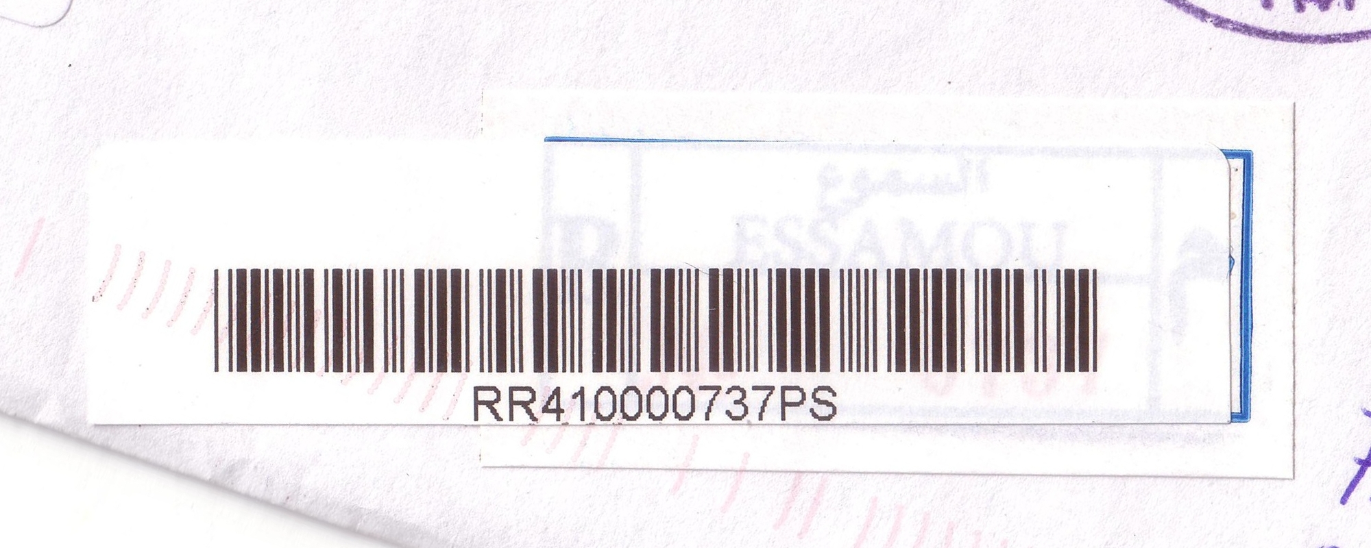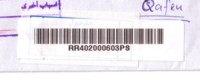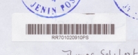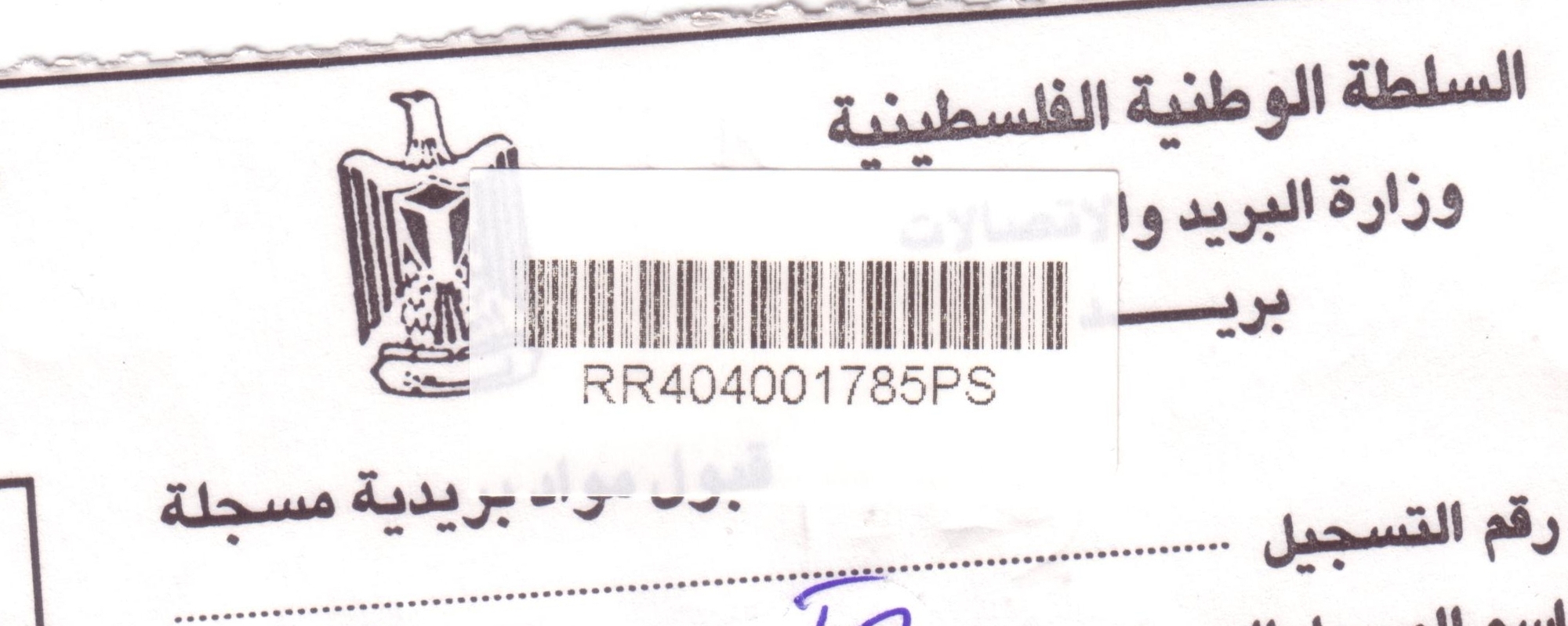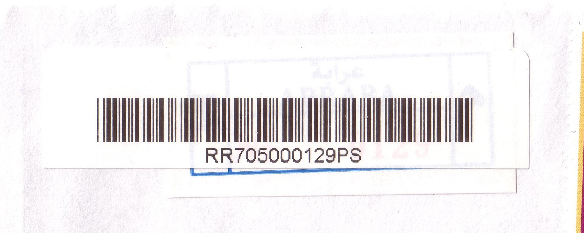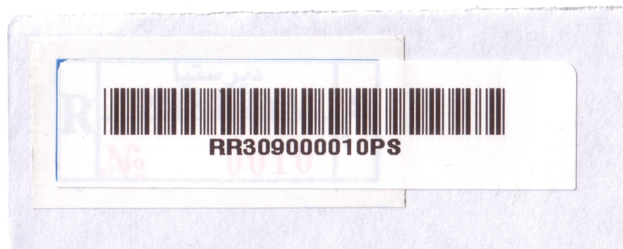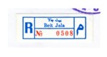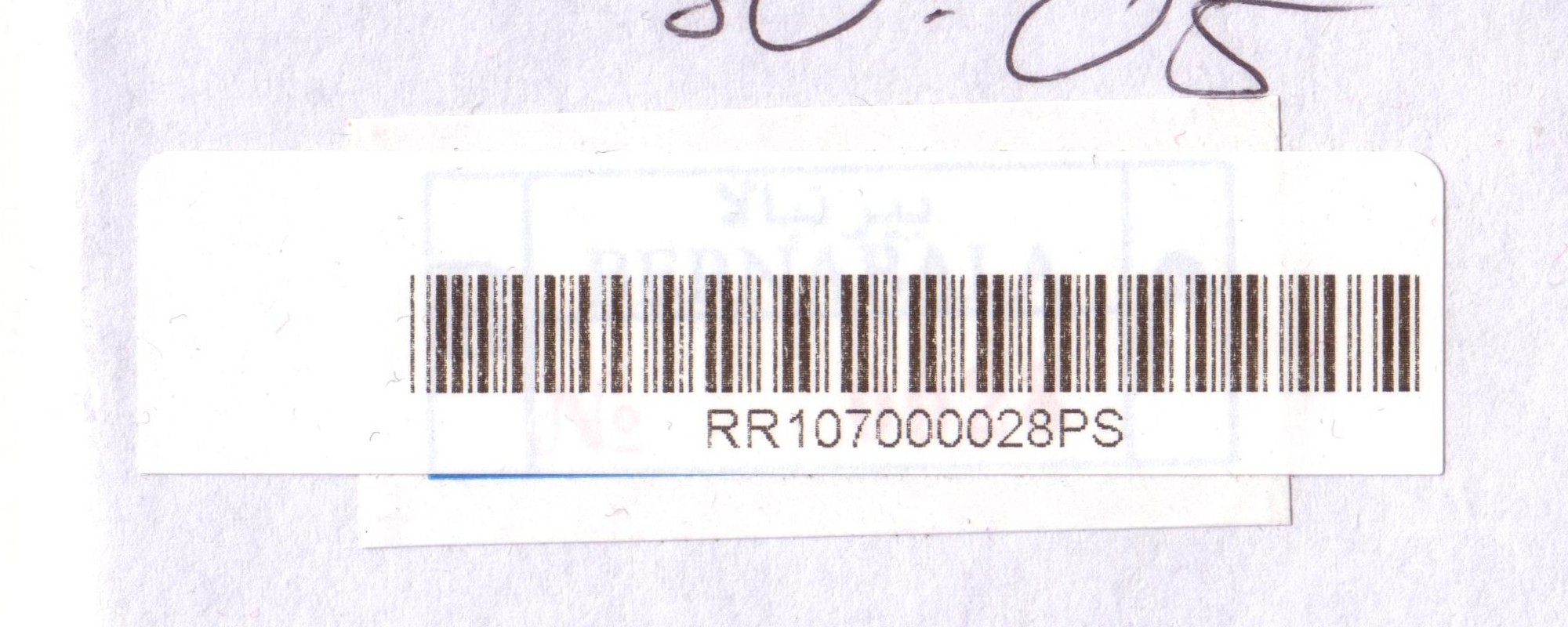 - white self-adhesive labels, printed in black. "IPS Light" linear barcode. With or without "Palestine Post" on top of imprinted numerator (9 digits) with prefixed RR and suffixed PS or ps. Label size varies.