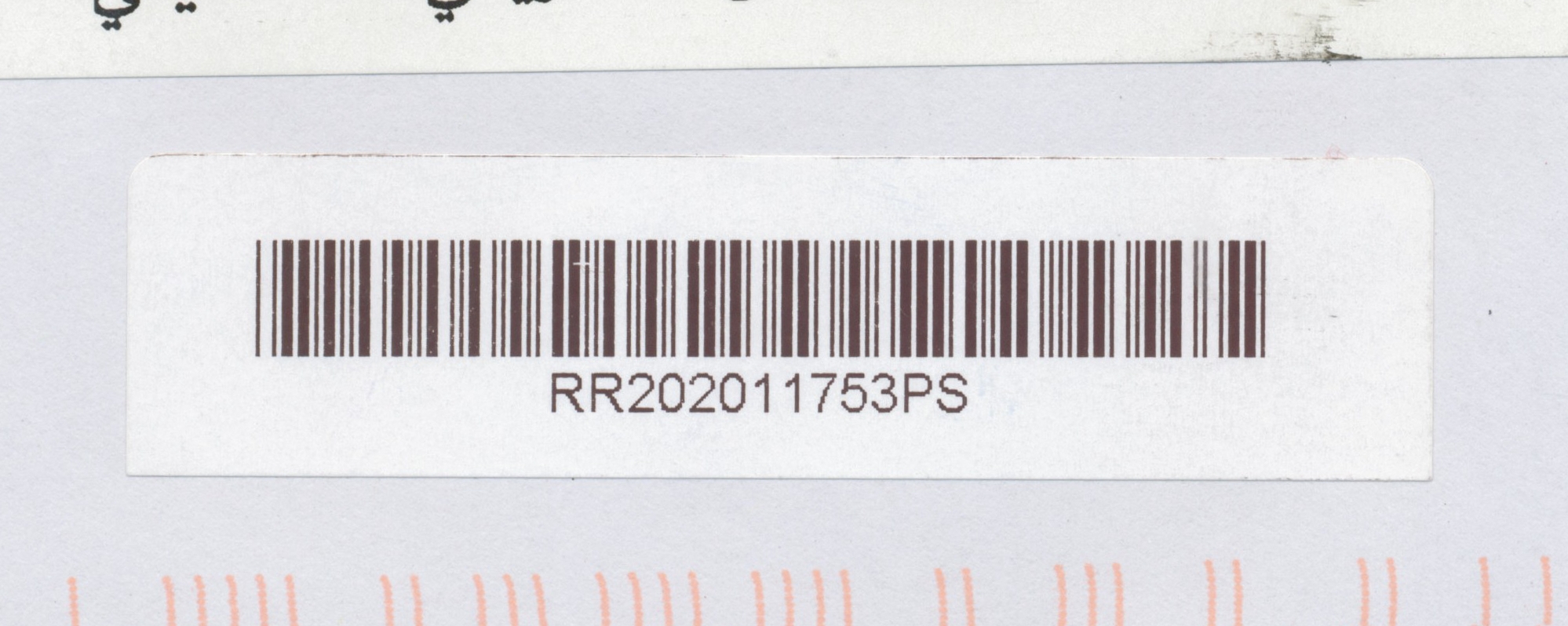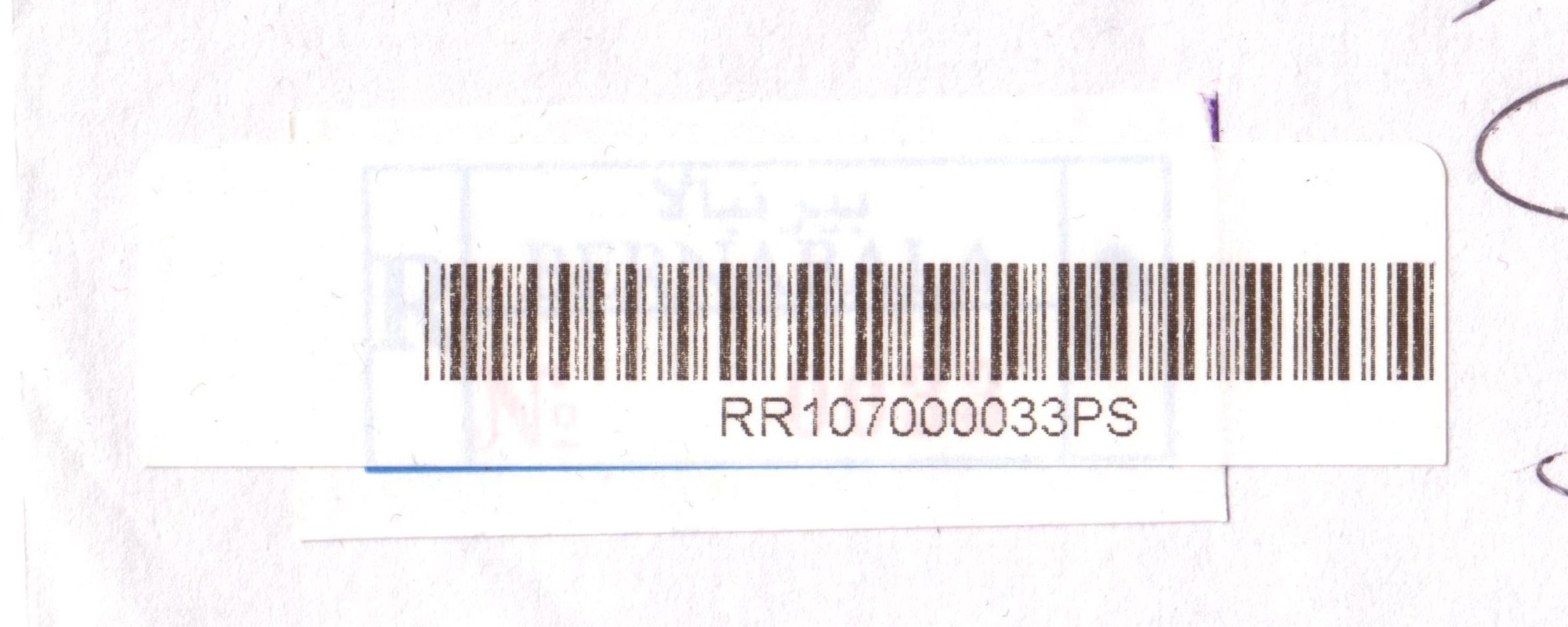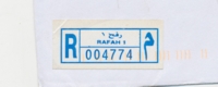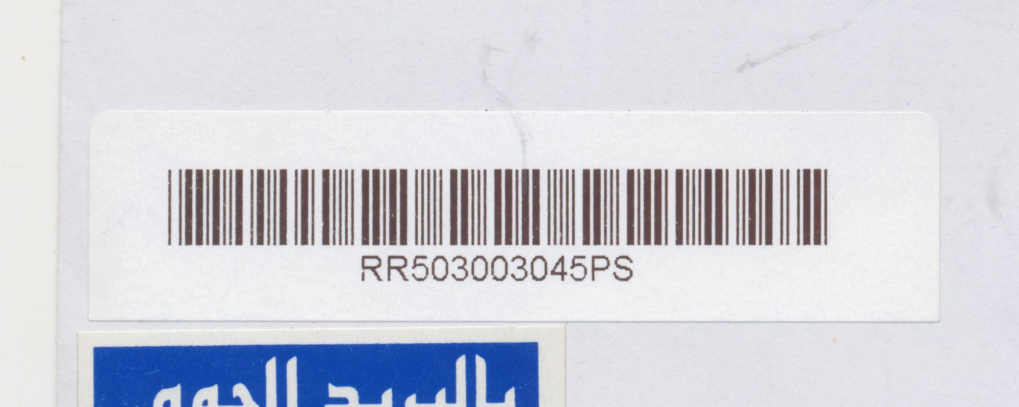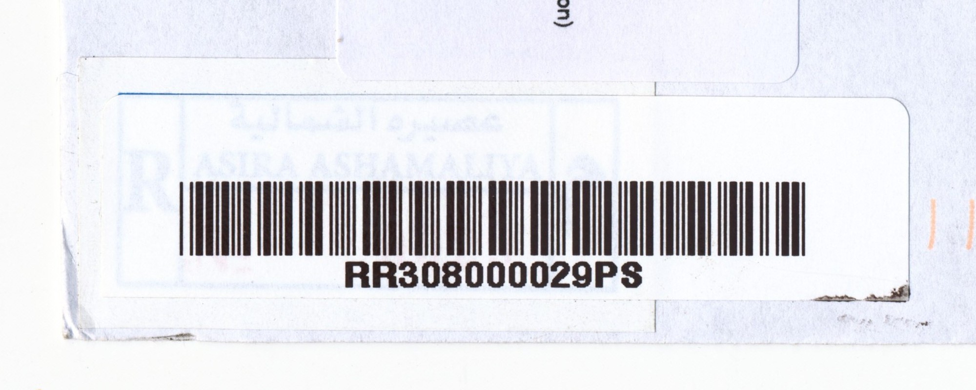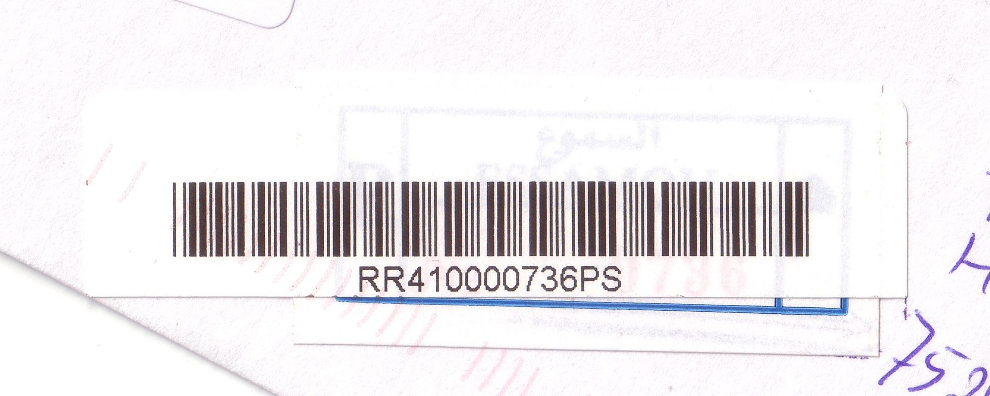 - white self-adhesive labels, printed in black. "IPS Light" linear barcode. With or without "Palestine Post" on top of imprinted numerator (9 digits) with prefixed RR and suffixed PS or ps. Label size varies.