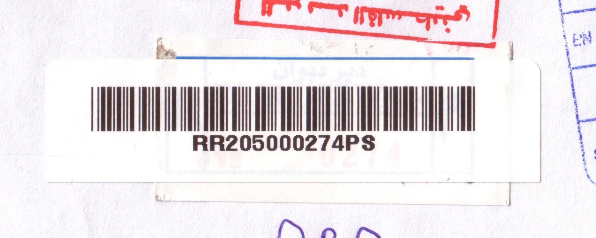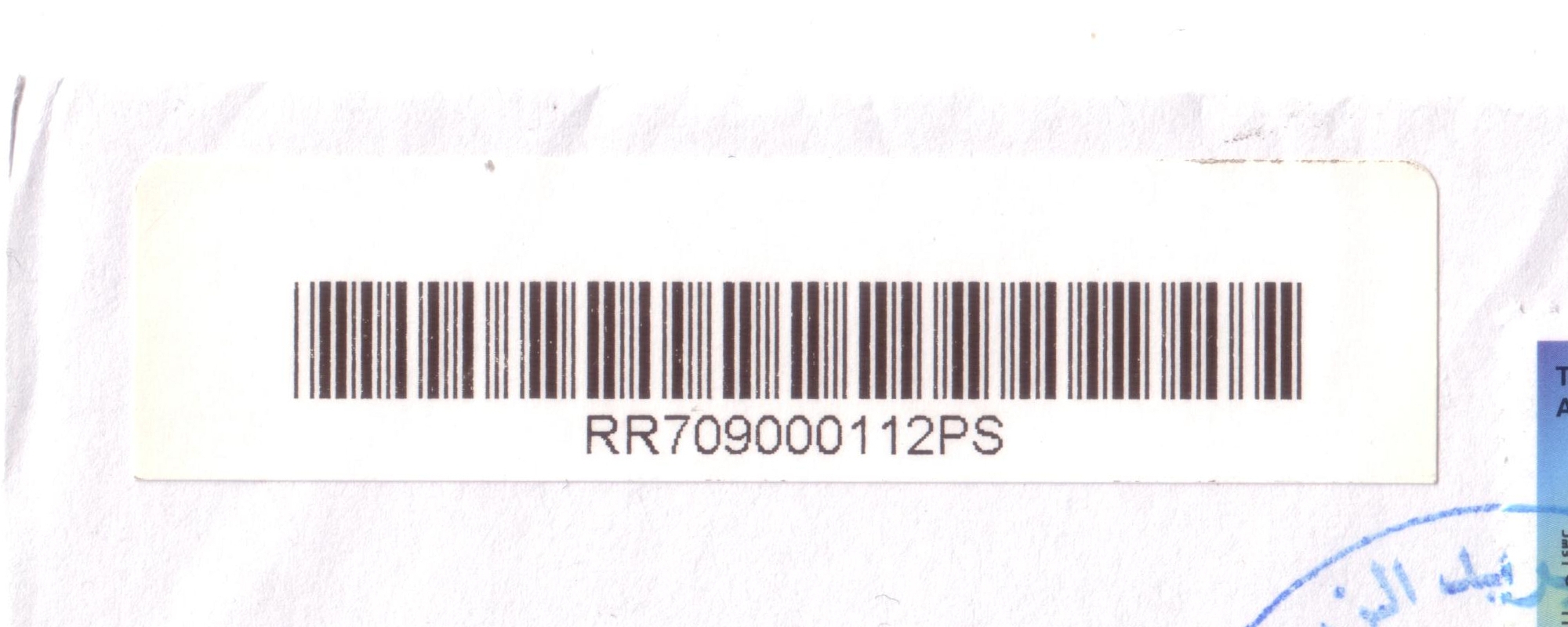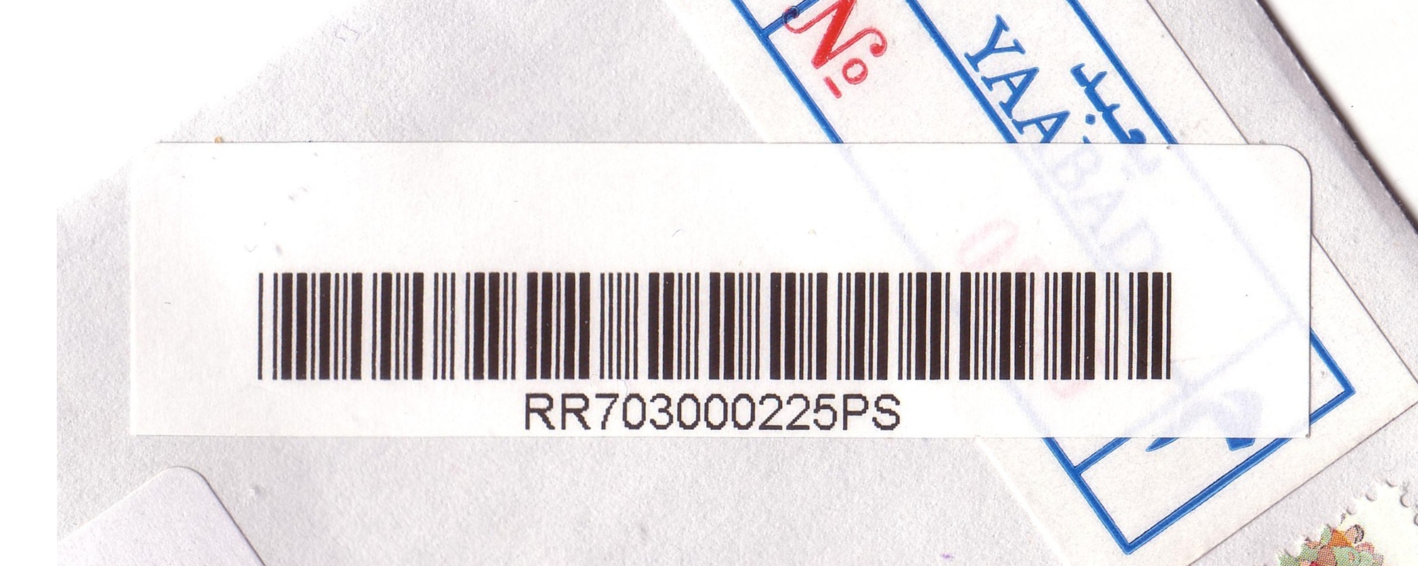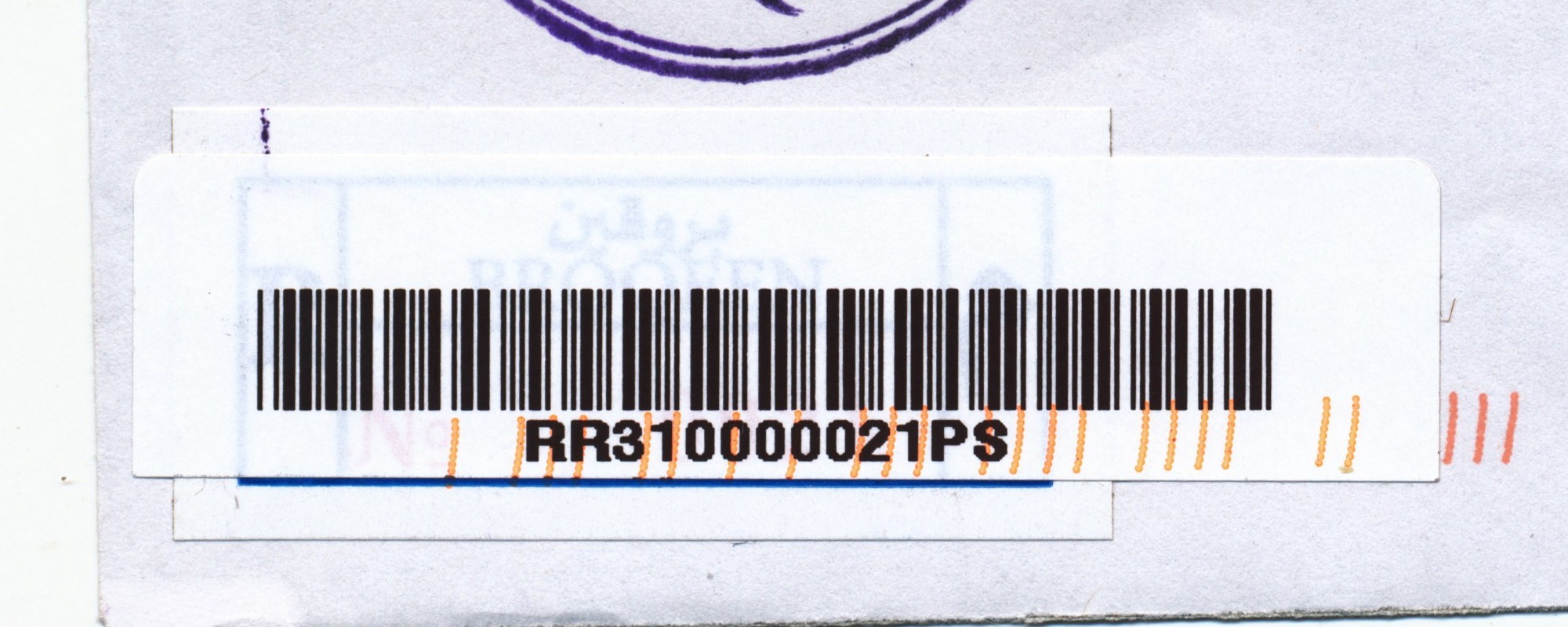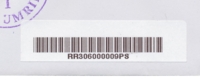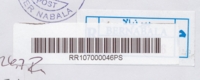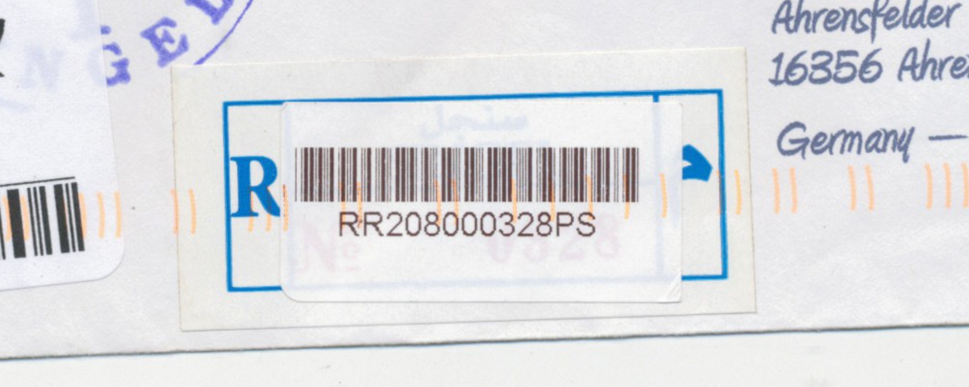 - white self-adhesive labels, printed in black. "IPS Light" linear barcode. With or without "Palestine Post" on top of imprinted numerator (9 digits) with prefixed RR and suffixed PS or ps. Label size varies.