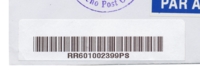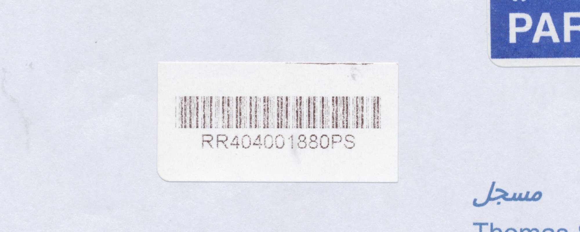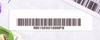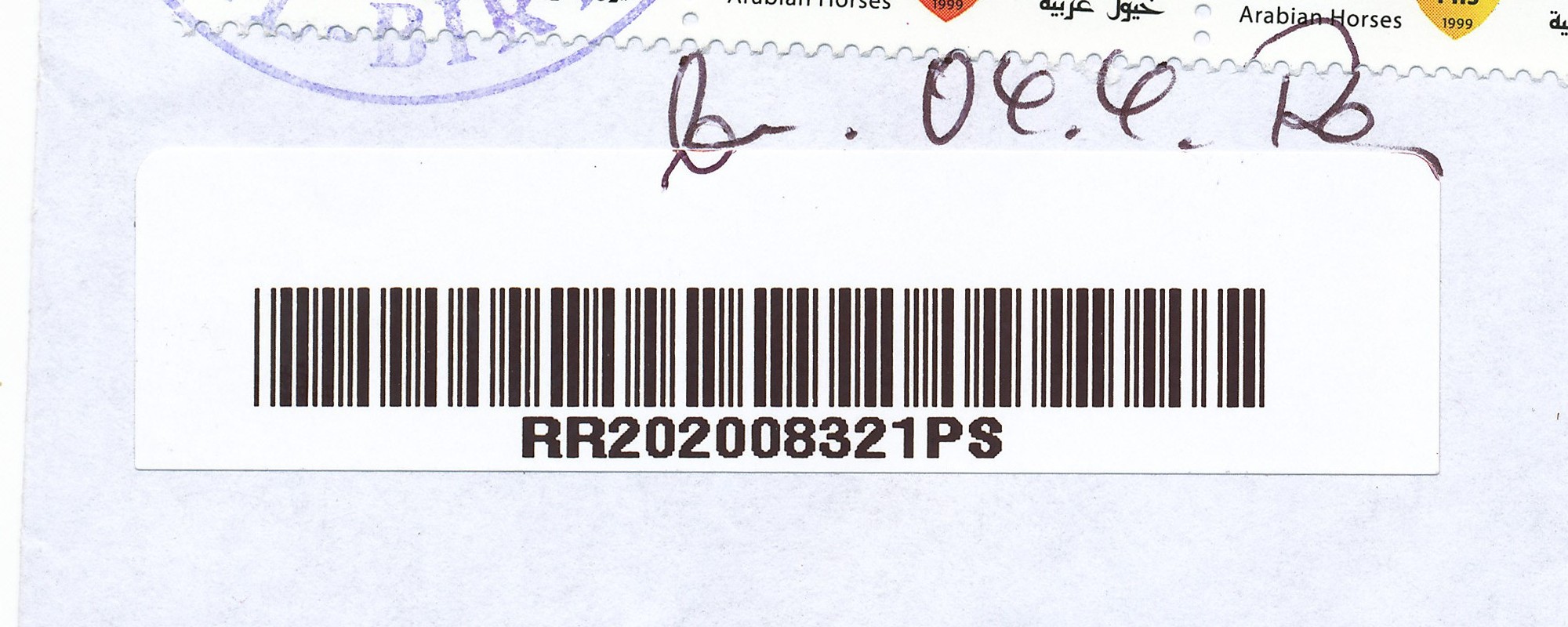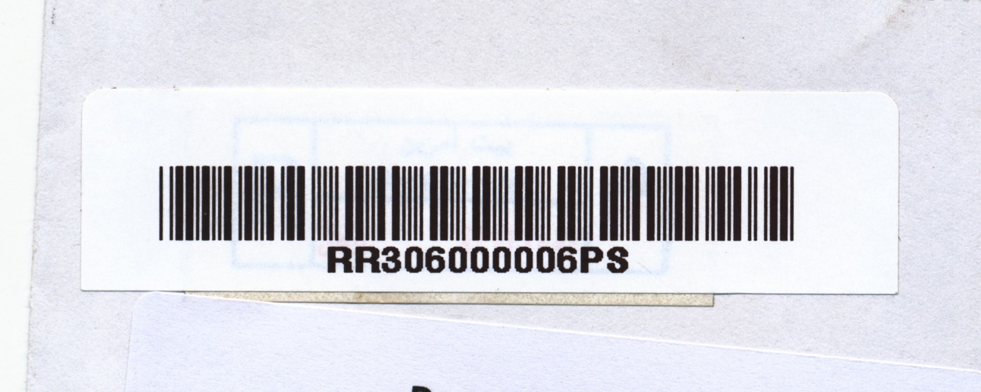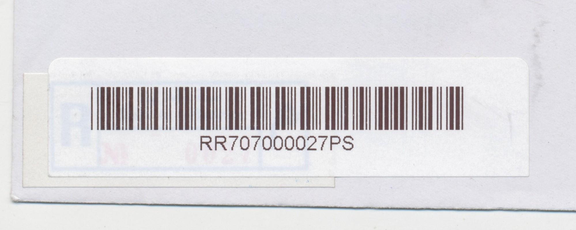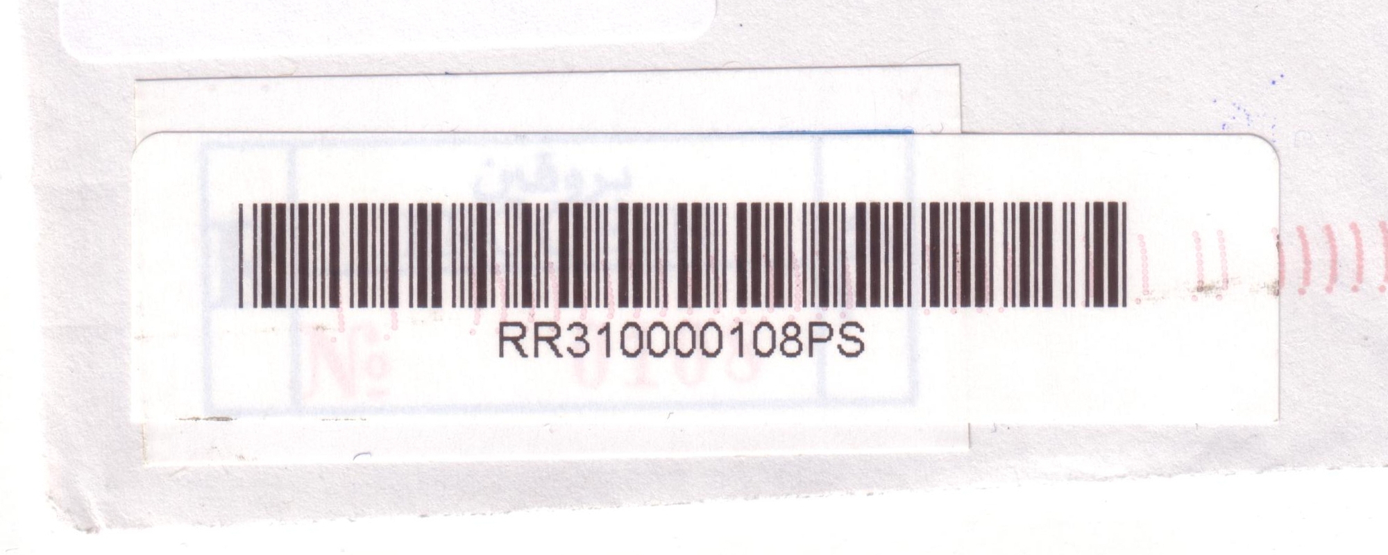 - white self-adhesive labels, printed in black. "IPS Light" linear barcode. With or without "Palestine Post" on top of imprinted numerator (9 digits) with prefixed RR and suffixed PS or ps. Label size varies.