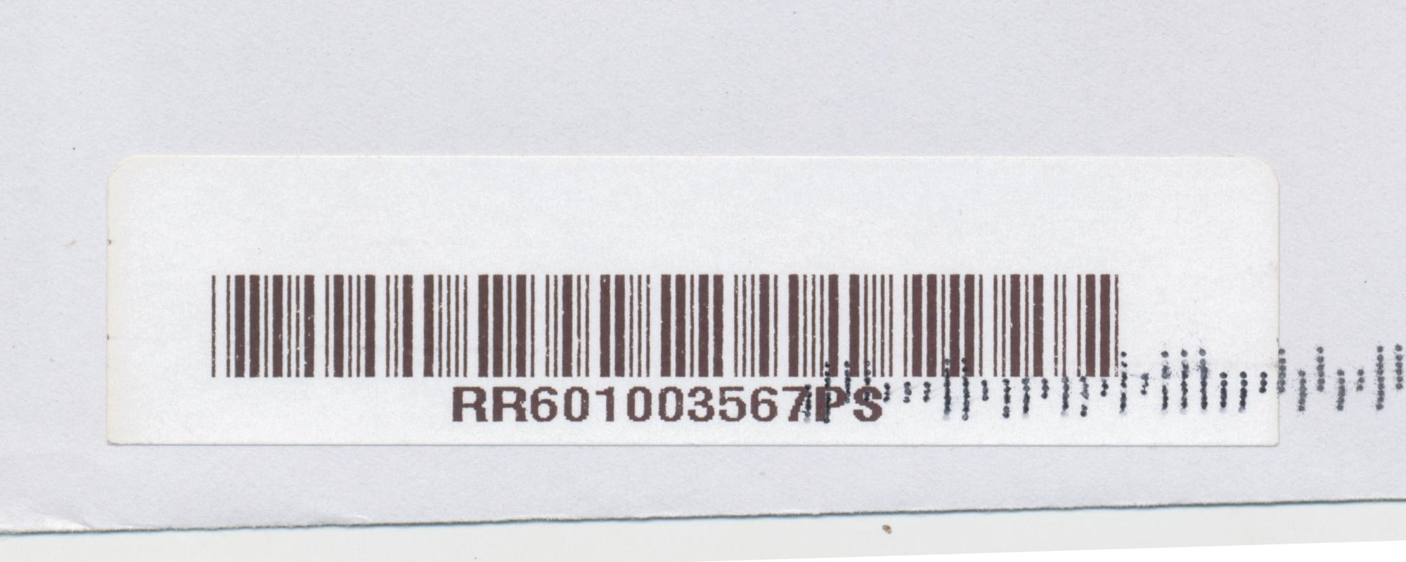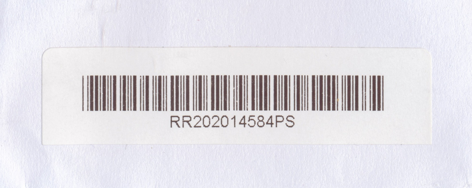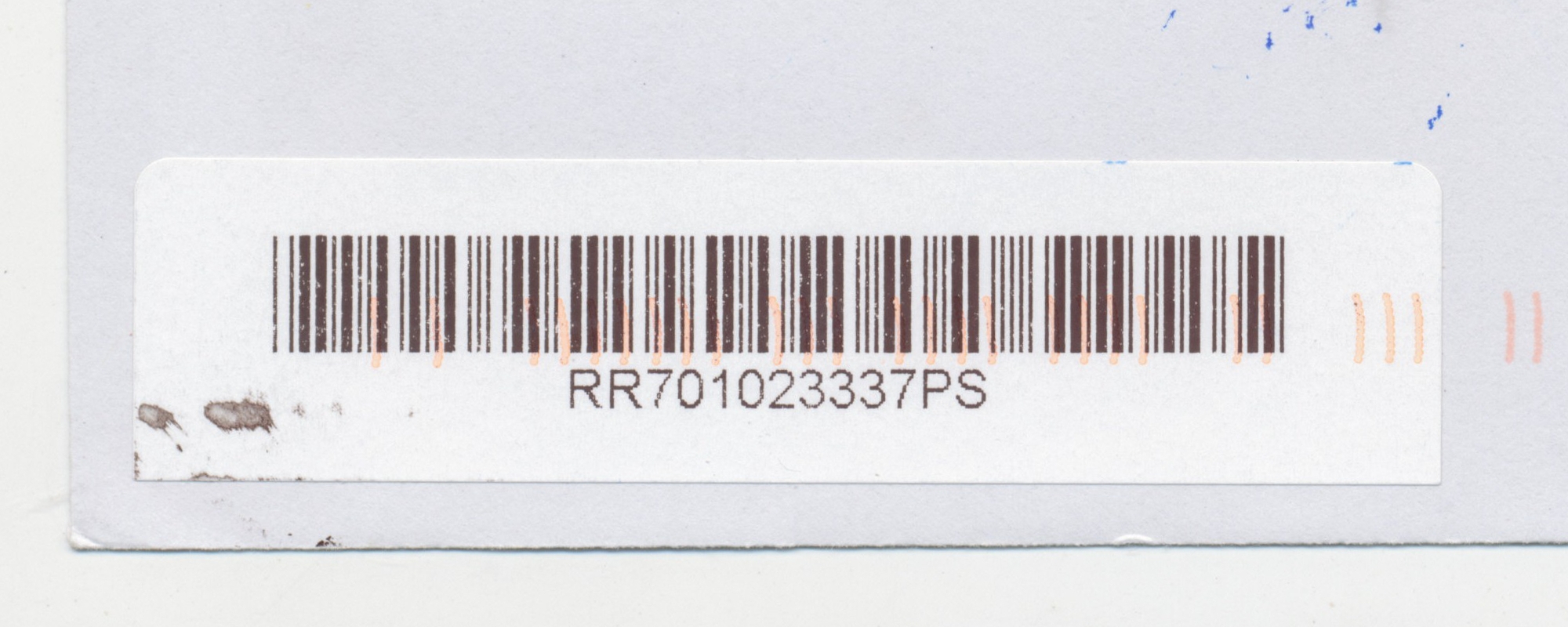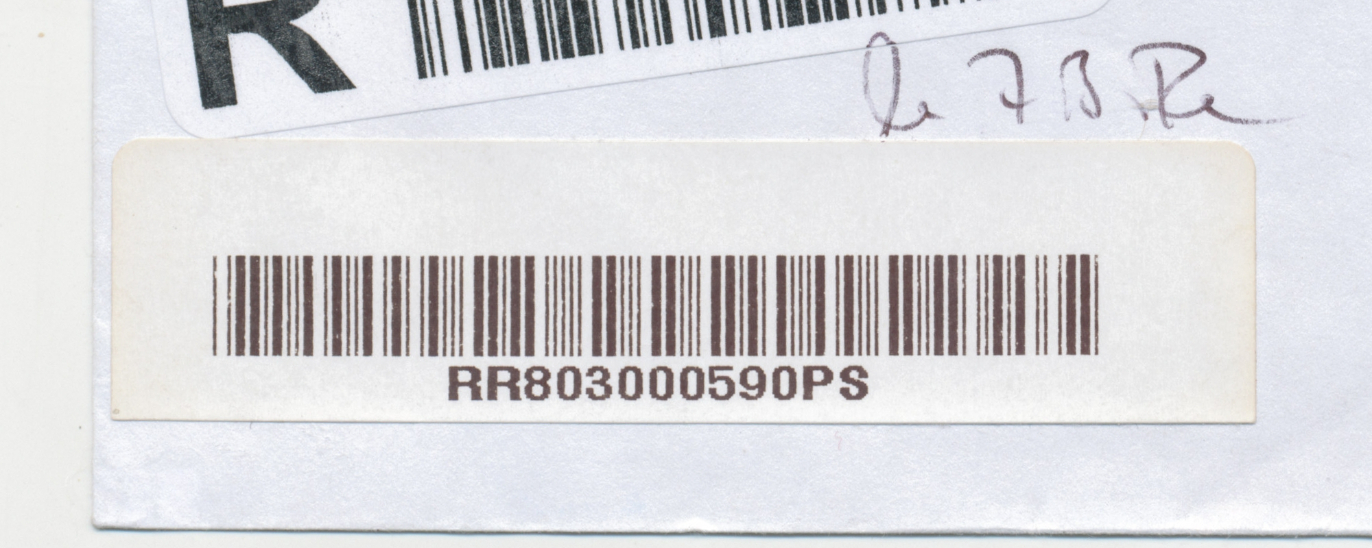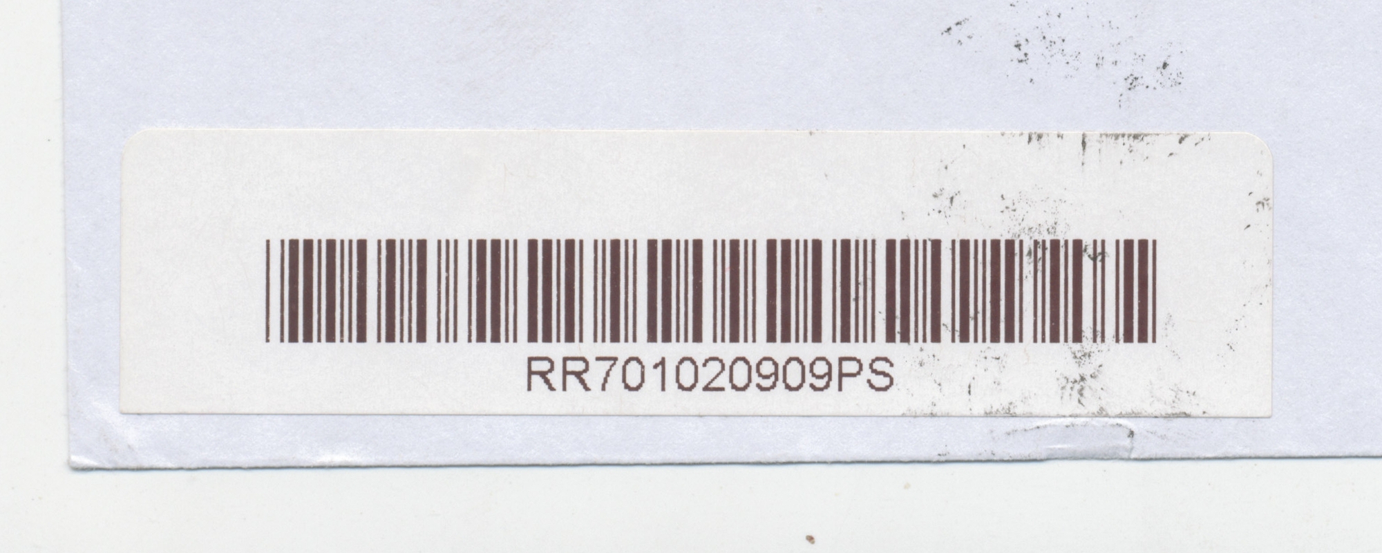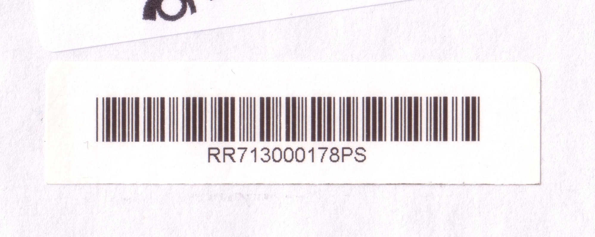 - white self-adhesive labels, printed in black. "IPS Light" linear barcode. With or without "Palestine Post" on top of imprinted numerator (9 digits) with prefixed RR and suffixed PS or ps. Label size varies.