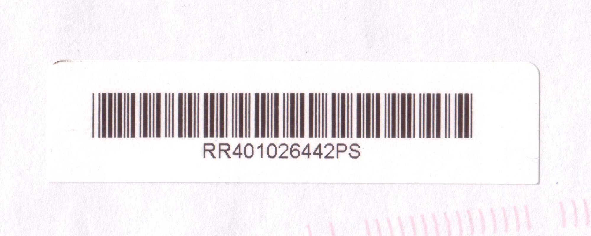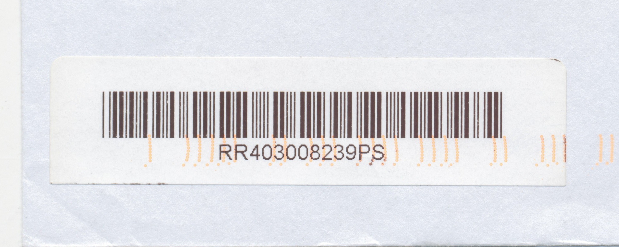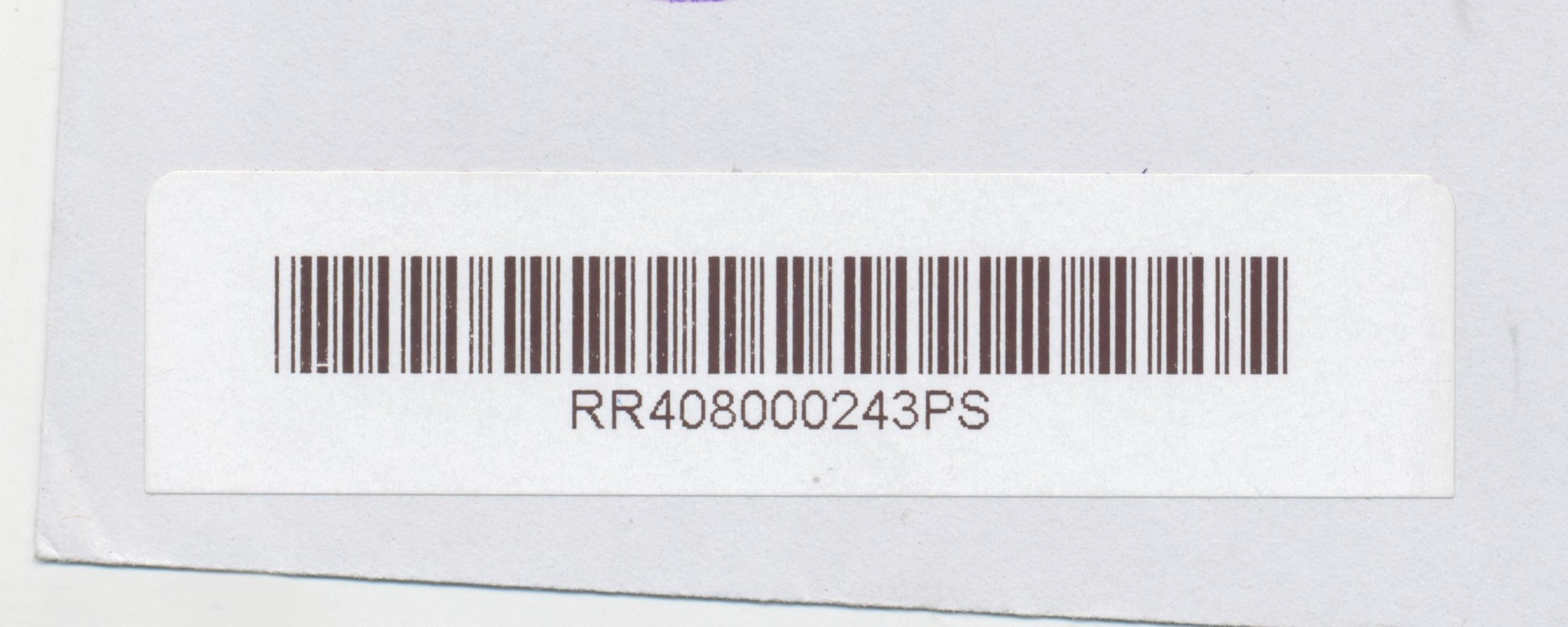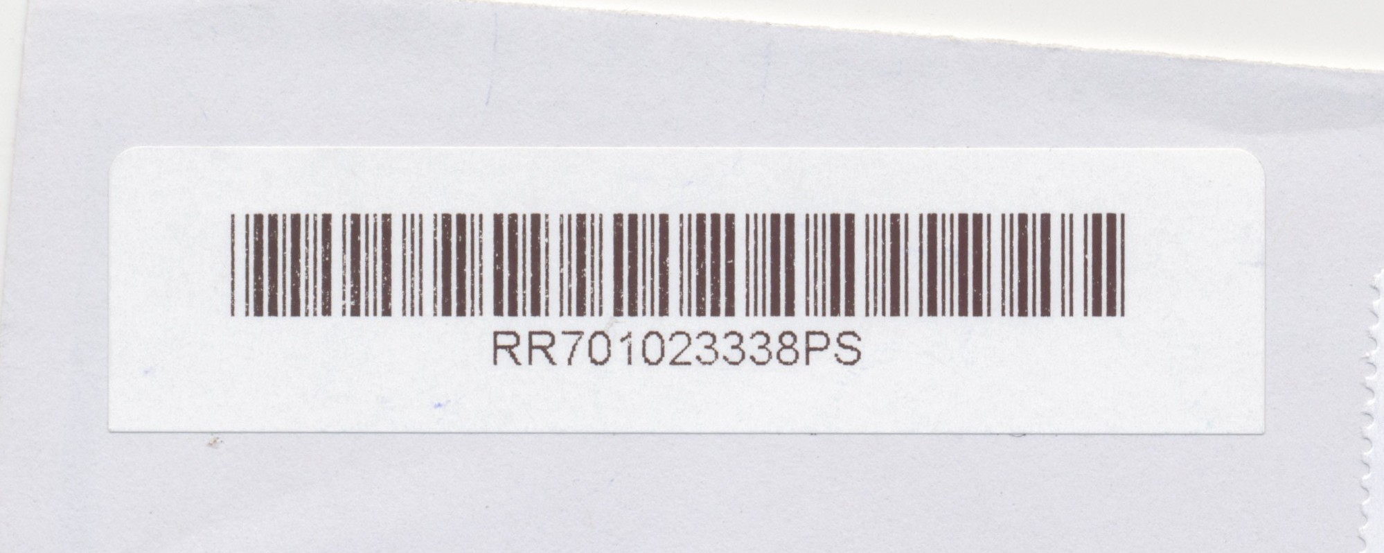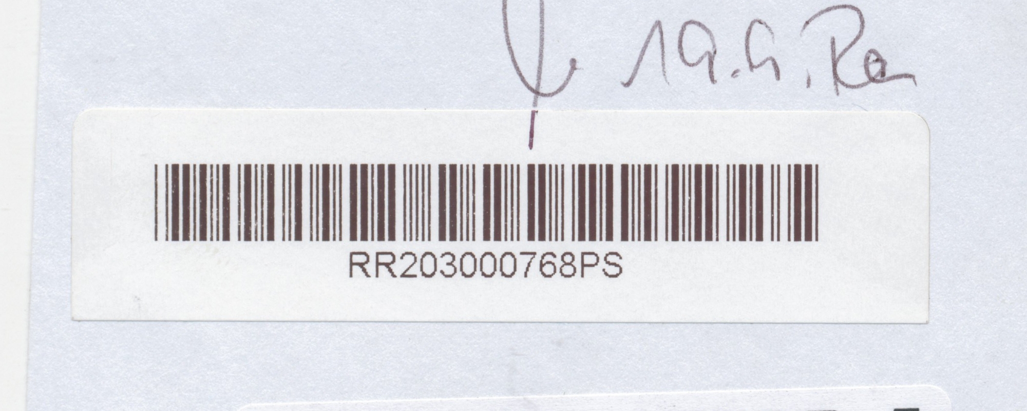 - white self-adhesive labels, printed in black. "IPS Light" linear barcode. With or without "Palestine Post" on top of imprinted numerator (9 digits) with prefixed RR and suffixed PS or ps. Label size varies.