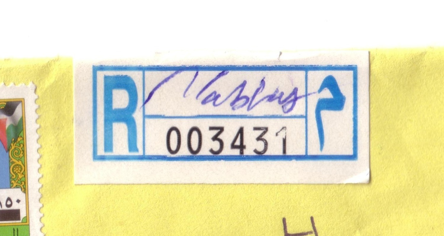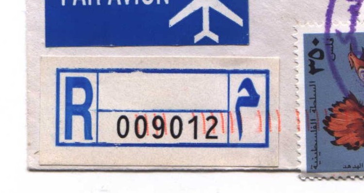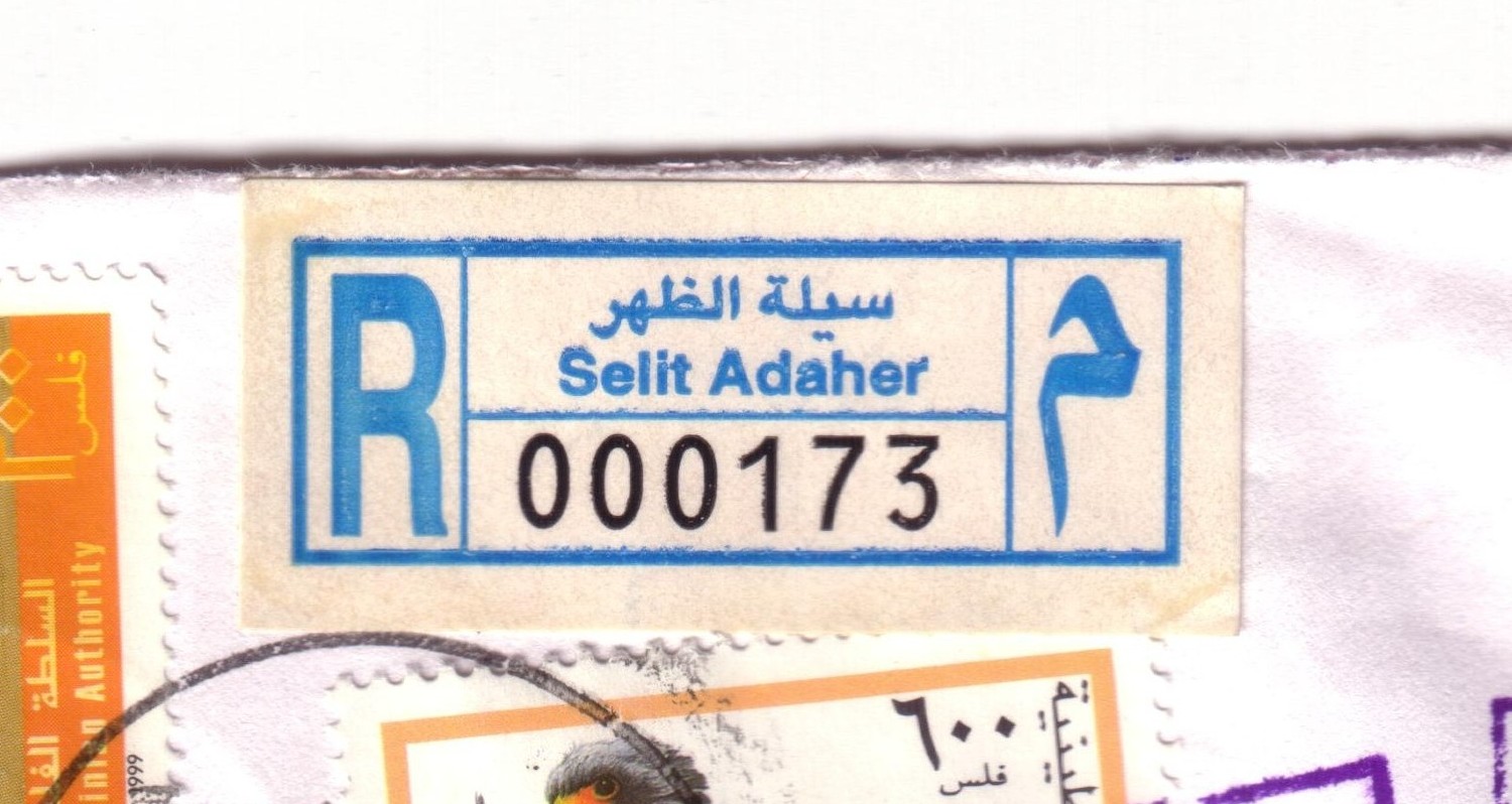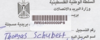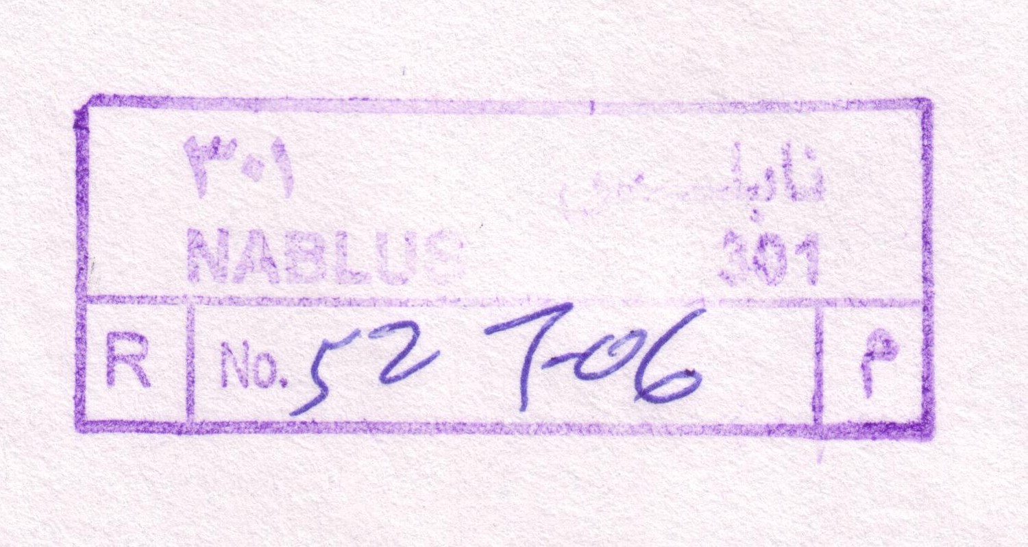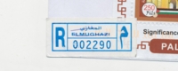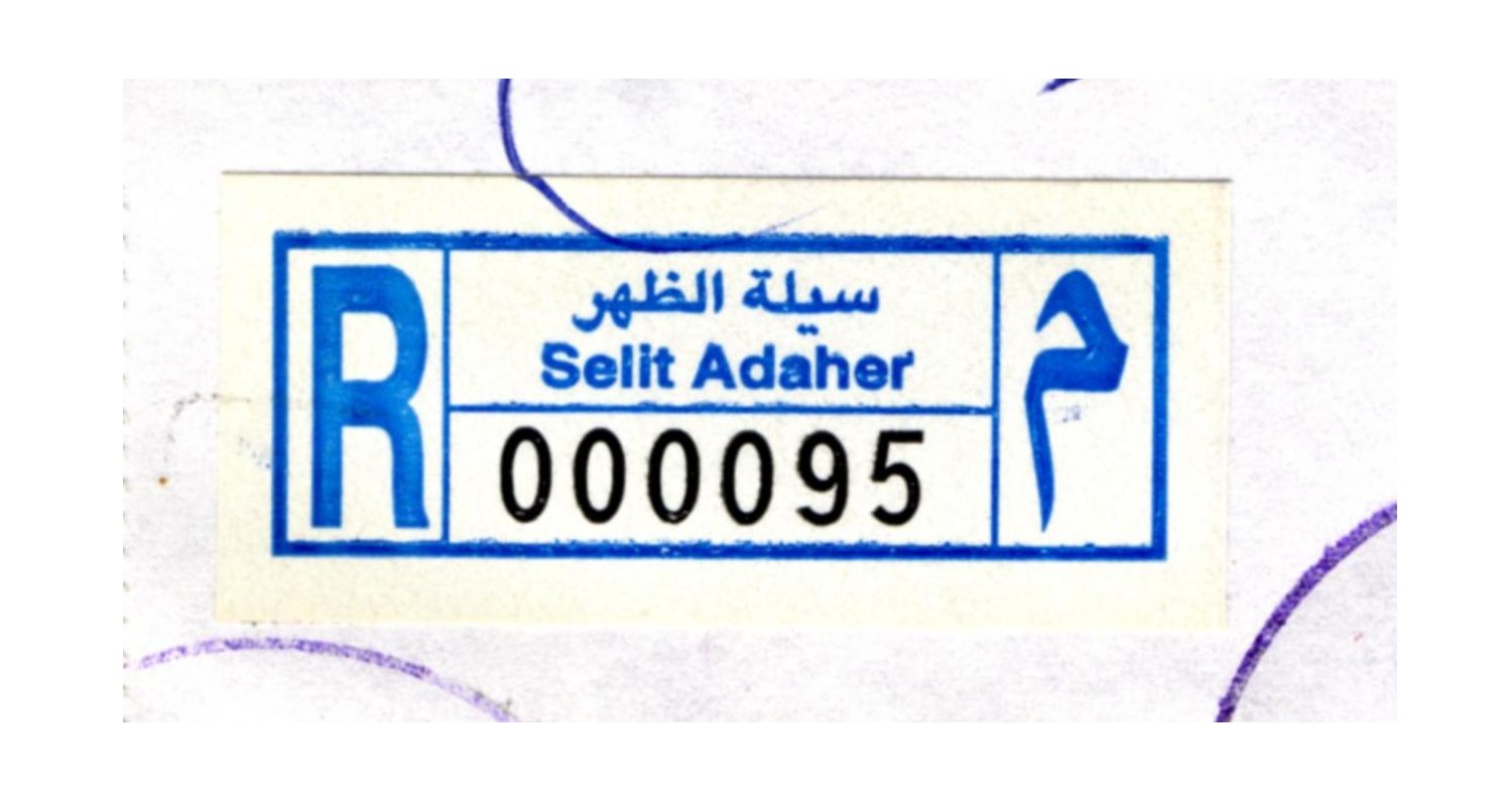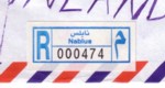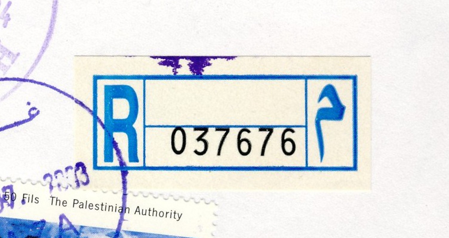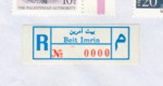 Special markings or labels for "Advice of Delivery" (avis de réception) service are naturally more rare than registration markings. An example for a handwritten marking "AR" (Gaza 8, August 2006) is shown on the right, together with the handstamp that should be available at most post offices. Below front and reverse side of form NB112 (ن ب ١١٢) and a cover from Halhul 2006.