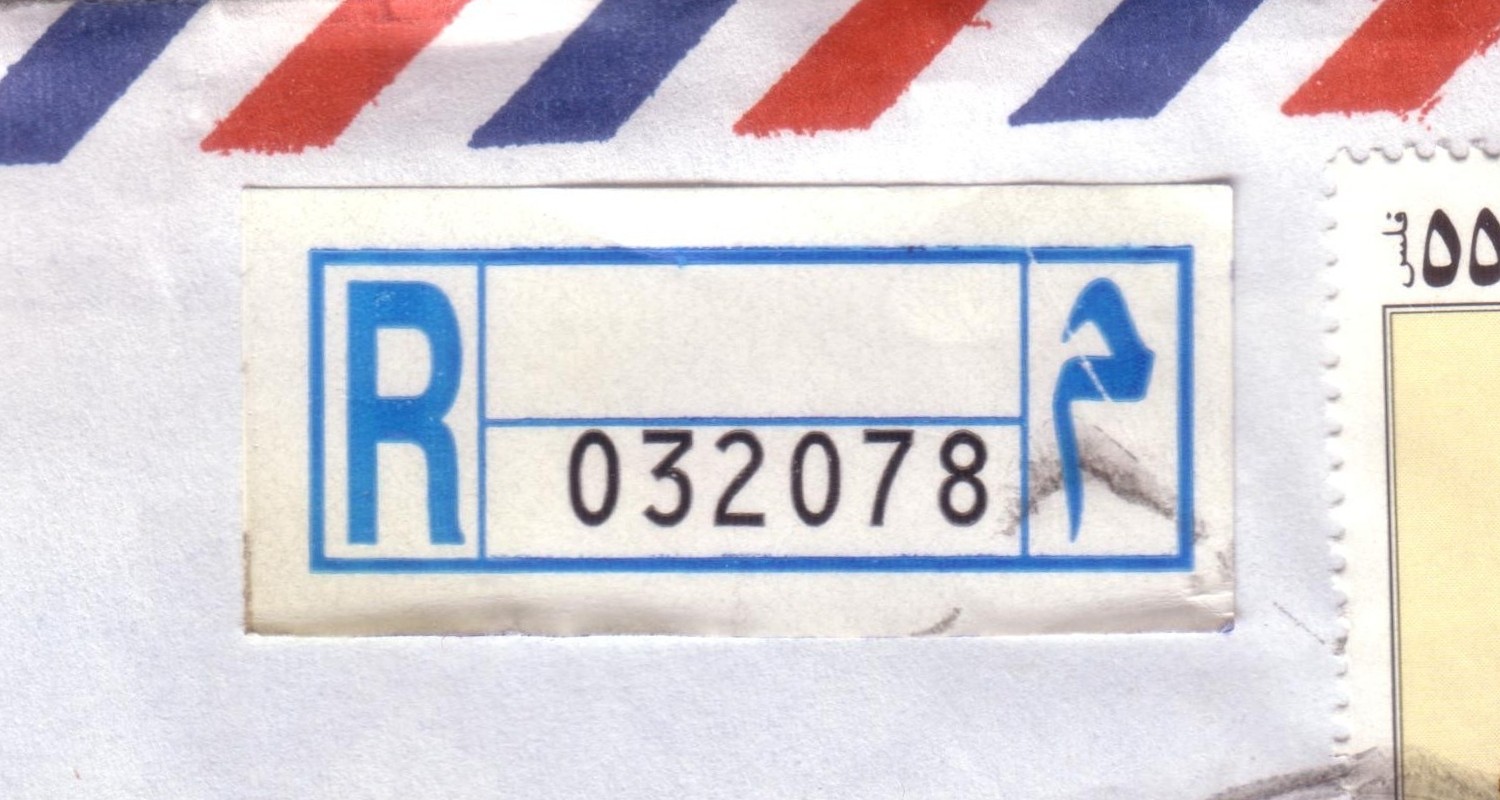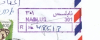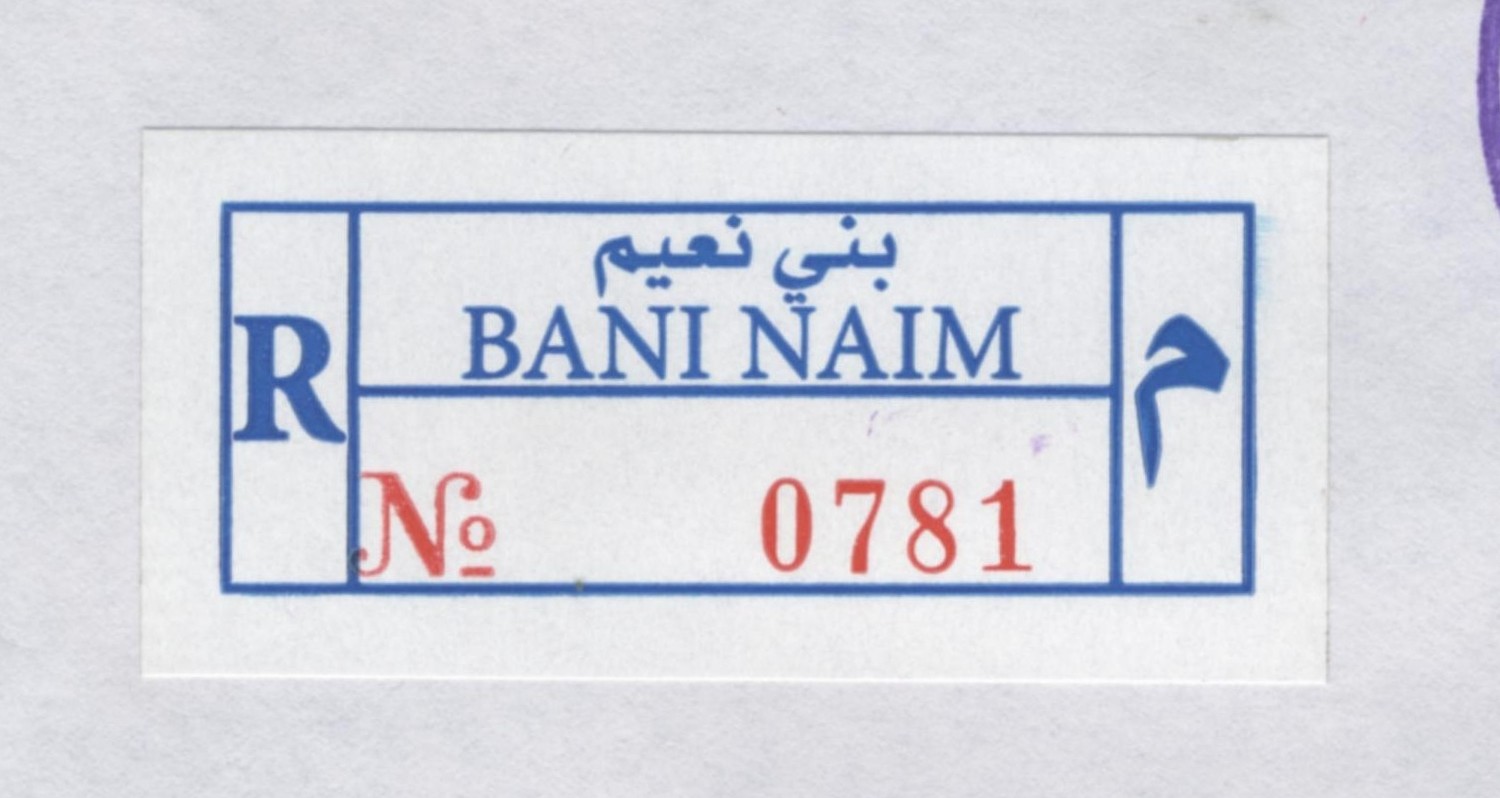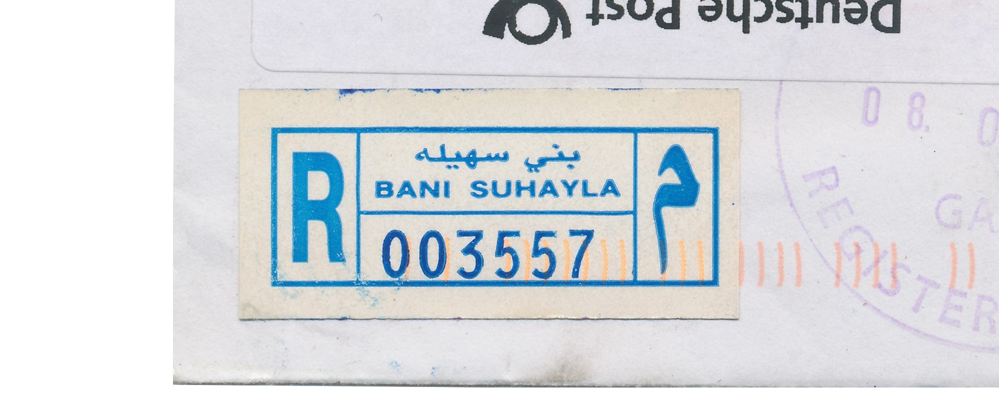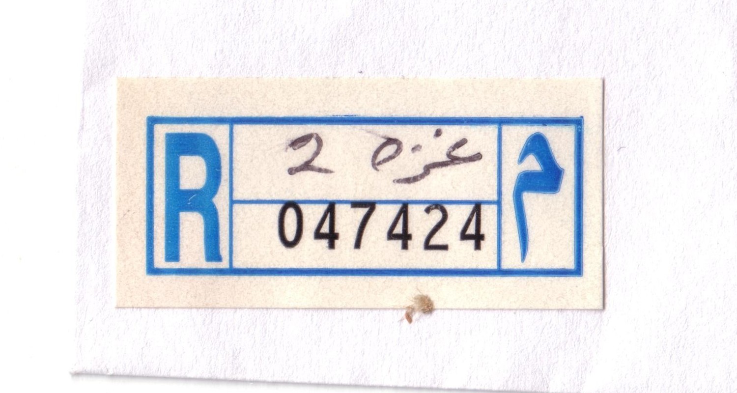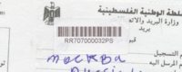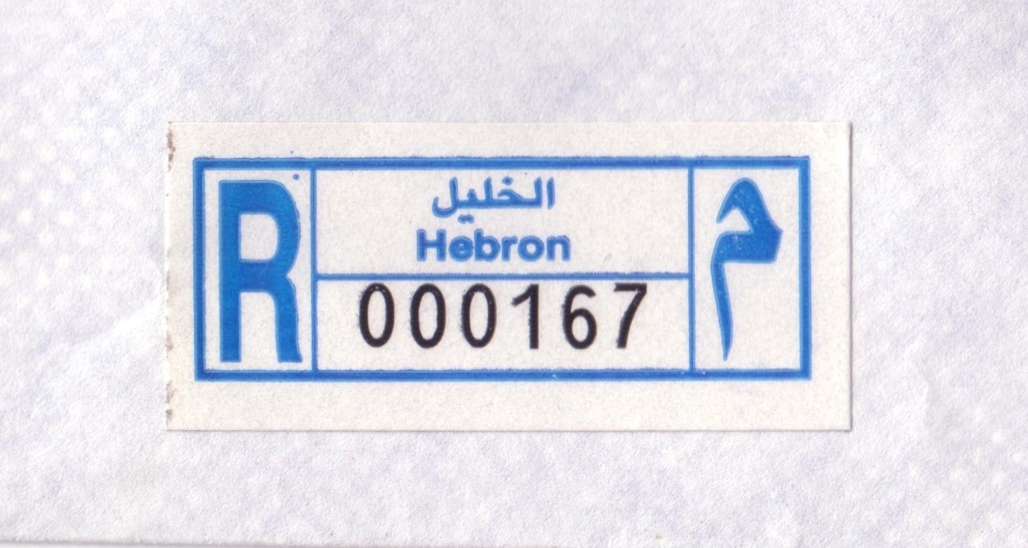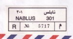 Special markings or labels for "Advice of Delivery" (avis de réception) service are naturally more rare than registration markings. An example for a handwritten marking "AR" (Gaza 8, August 2006) is shown on the right, together with the handstamp that should be available at most post offices. Below front and reverse side of form NB112 (ن ب ١١٢) and a cover from Halhul 2006.