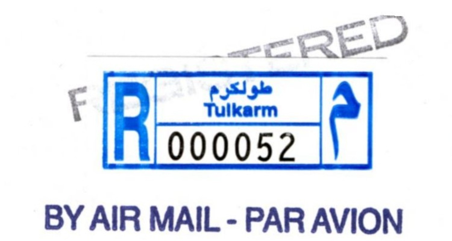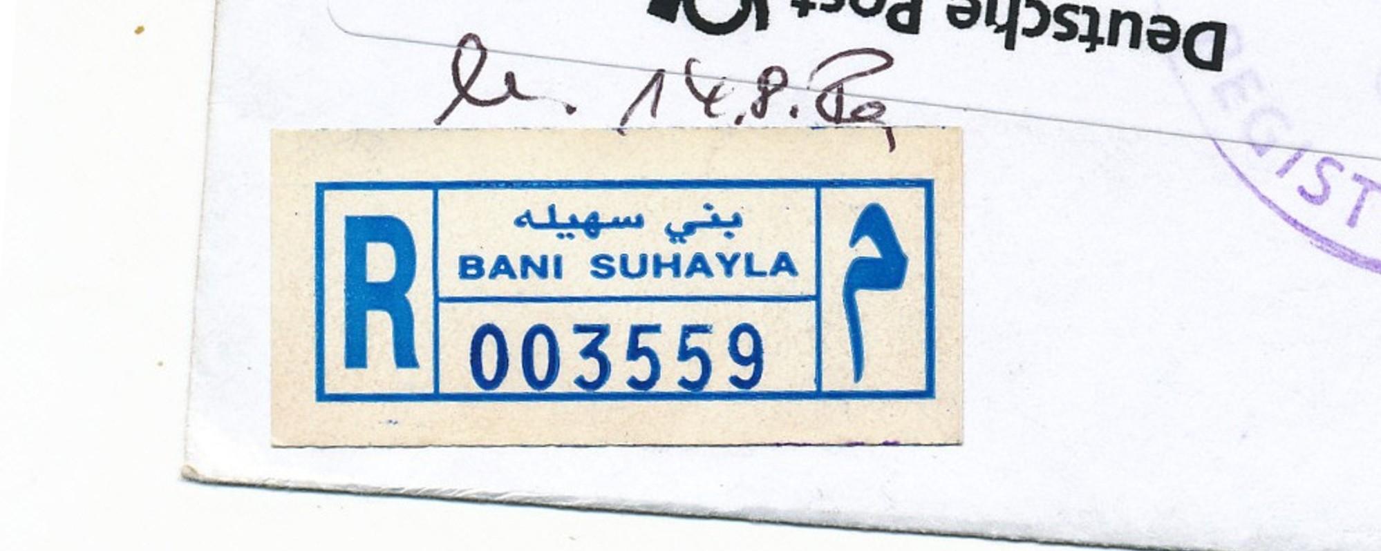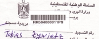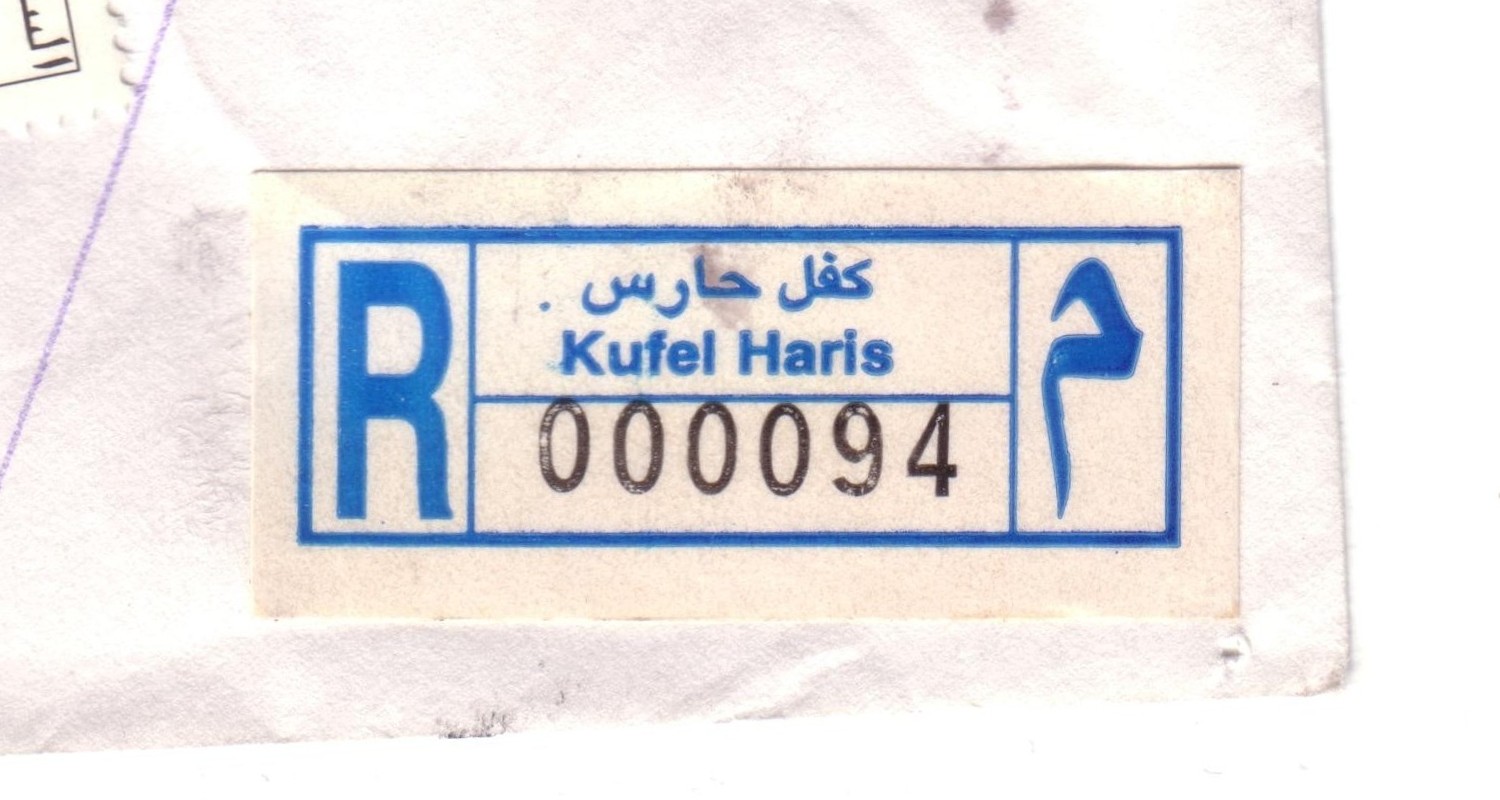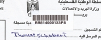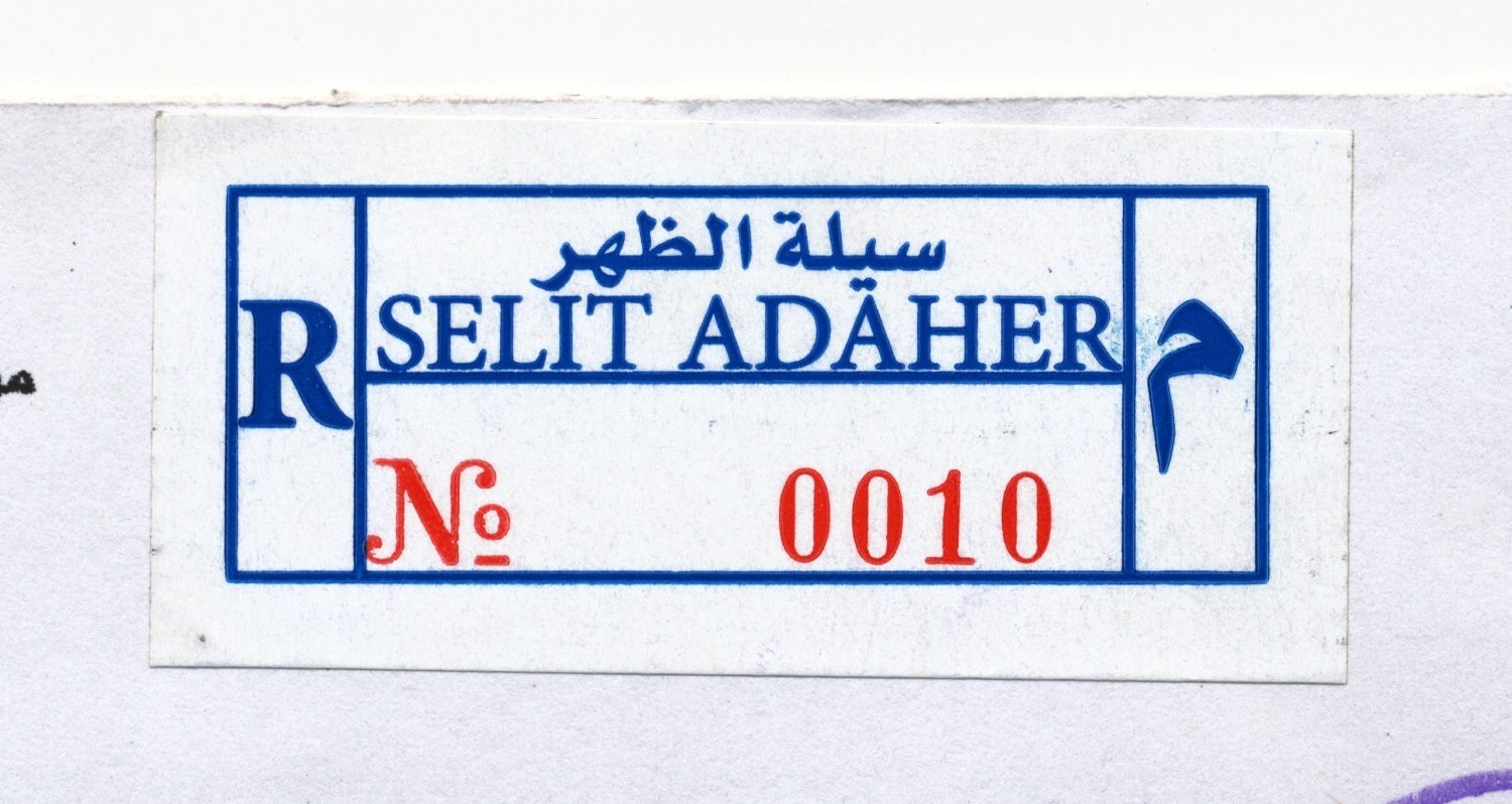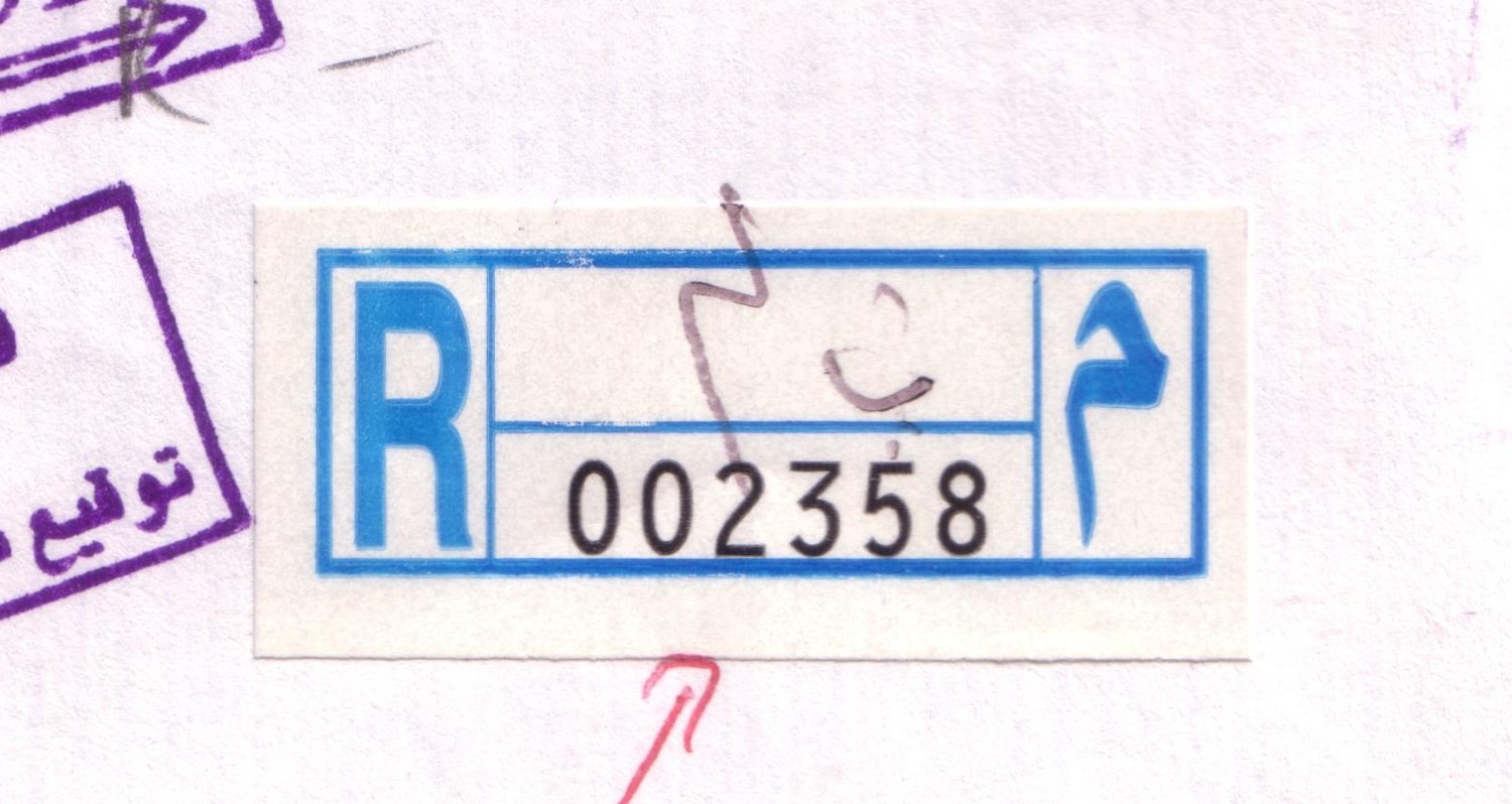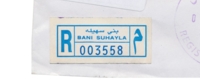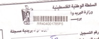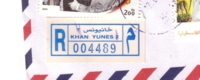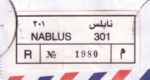 Special markings or labels for "Advice of Delivery" (avis de réception) service are naturally more rare than registration markings. An example for a handwritten marking "AR" (Gaza 8, August 2006) is shown on the right, together with the handstamp that should be available at most post offices. Below front and reverse side of form NB112 (ن ب ١١٢) and a cover from Halhul 2006.