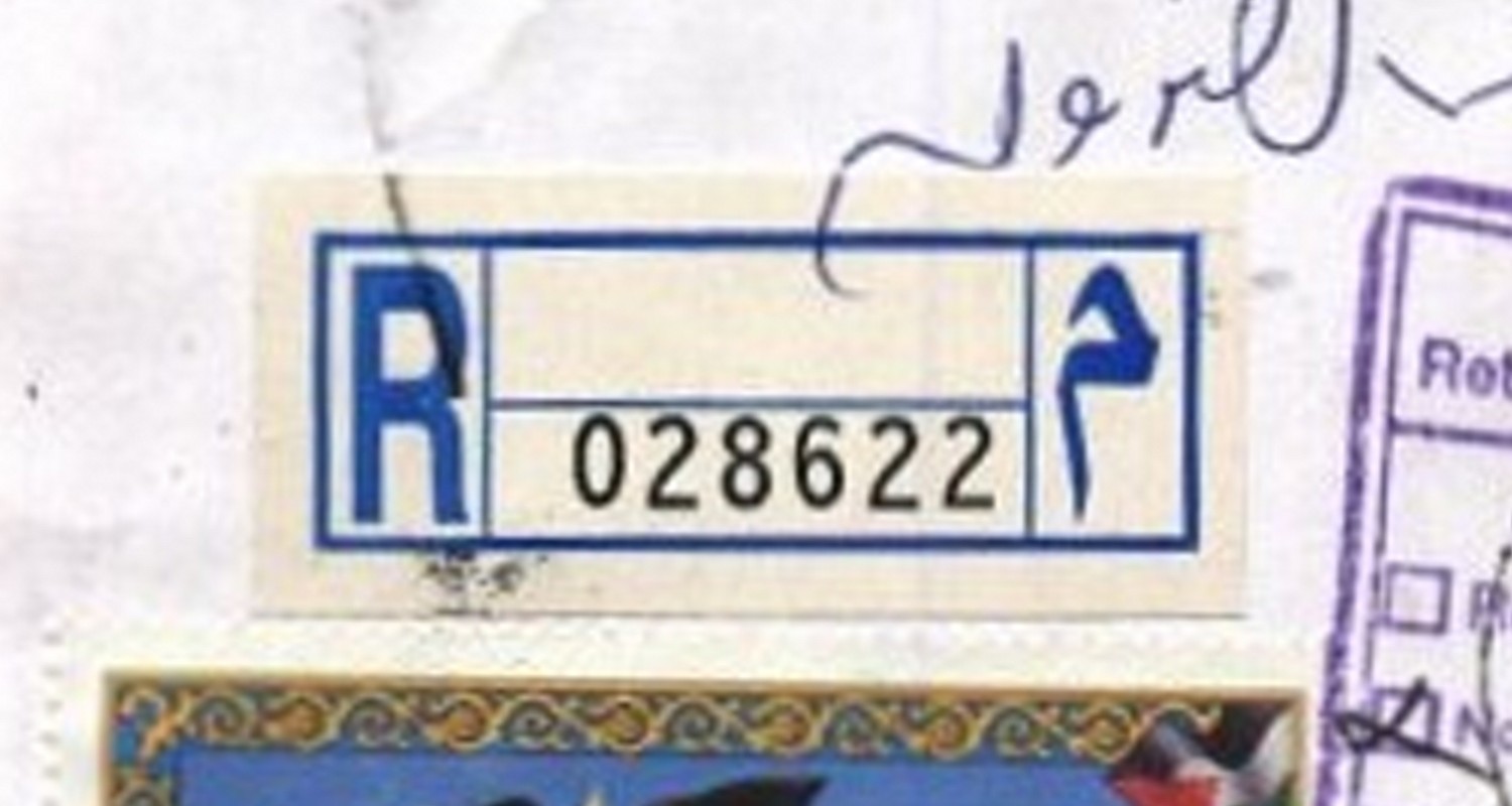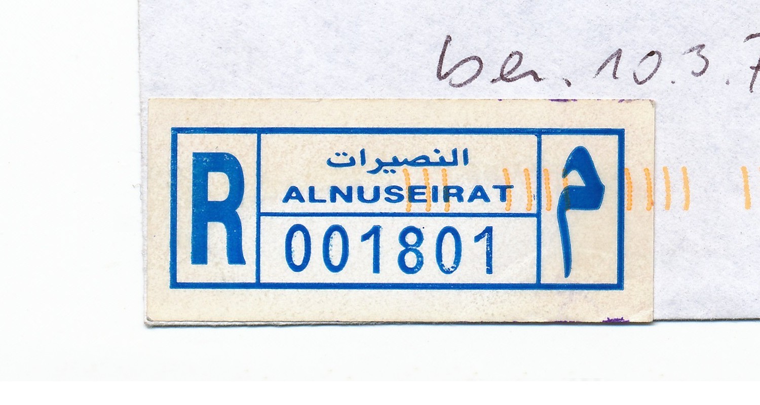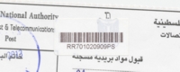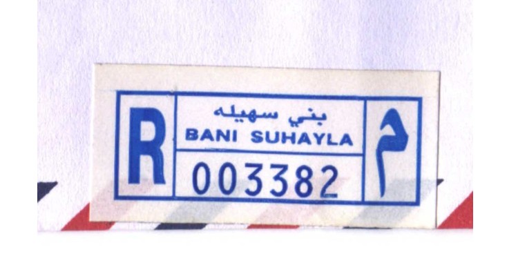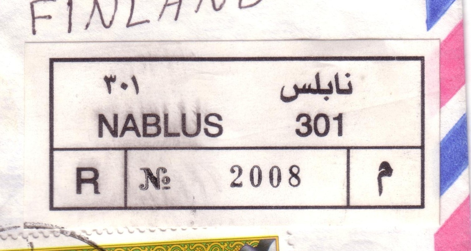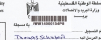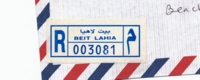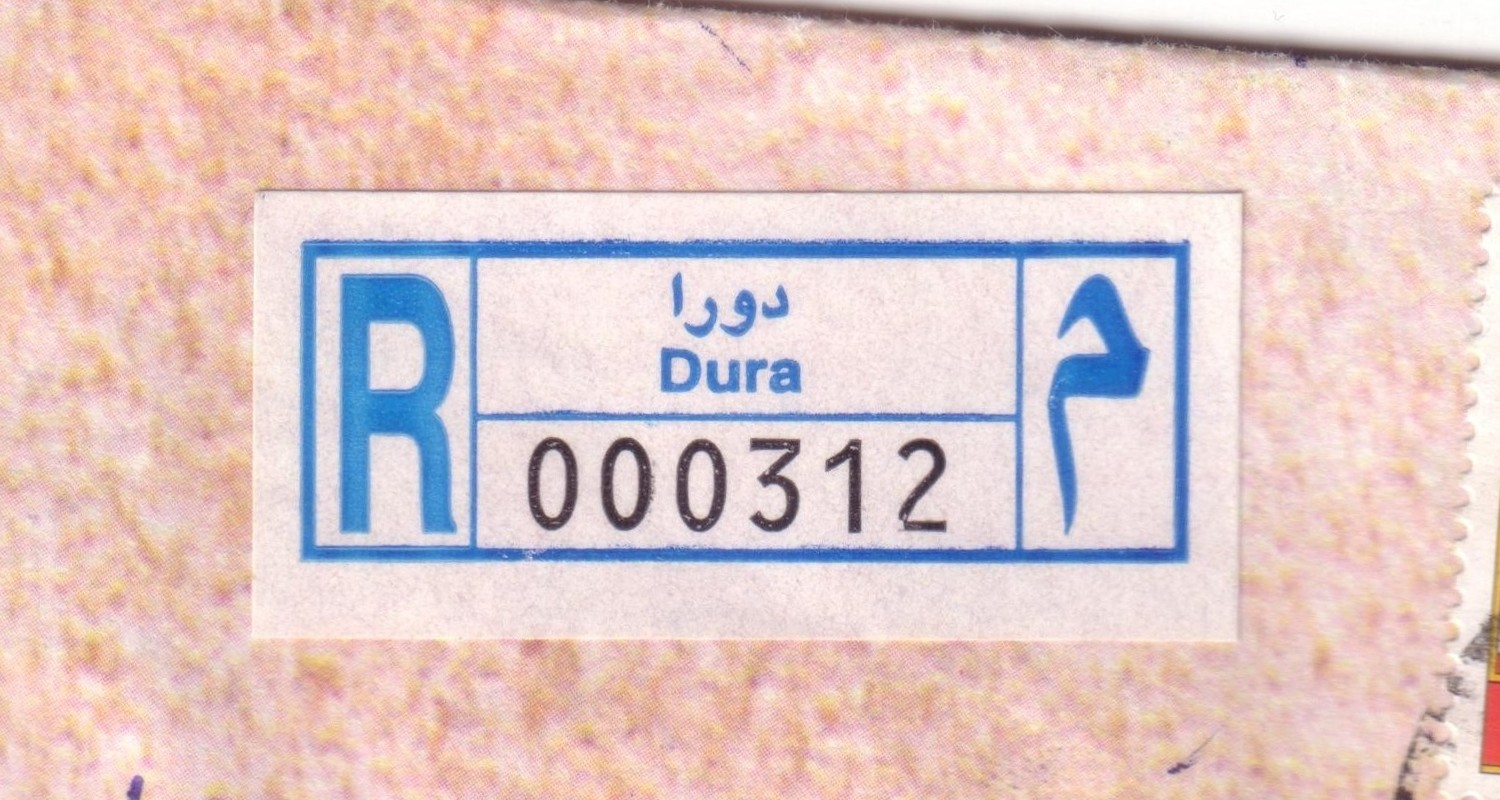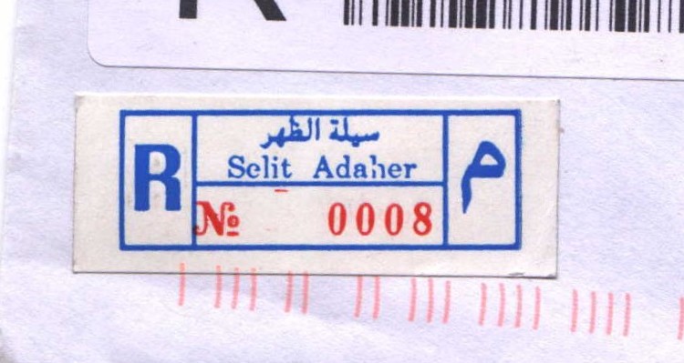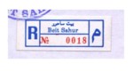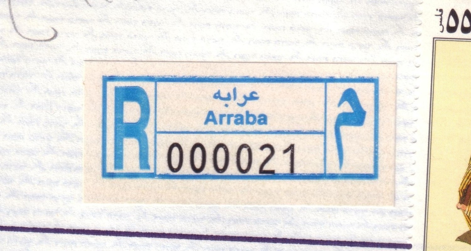 Special markings or labels for "Advice of Delivery" (avis de réception) service are naturally more rare than registration markings. An example for a handwritten marking "AR" (Gaza 8, August 2006) is shown on the right, together with the handstamp that should be available at most post offices. Below front and reverse side of form NB112 (ن ب ١١٢) and a cover from Halhul 2006.