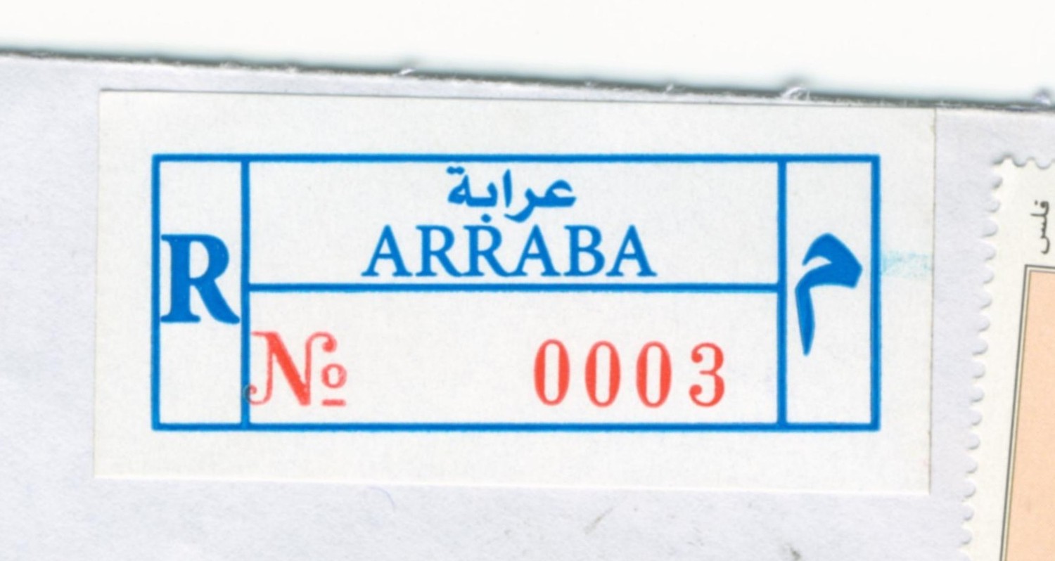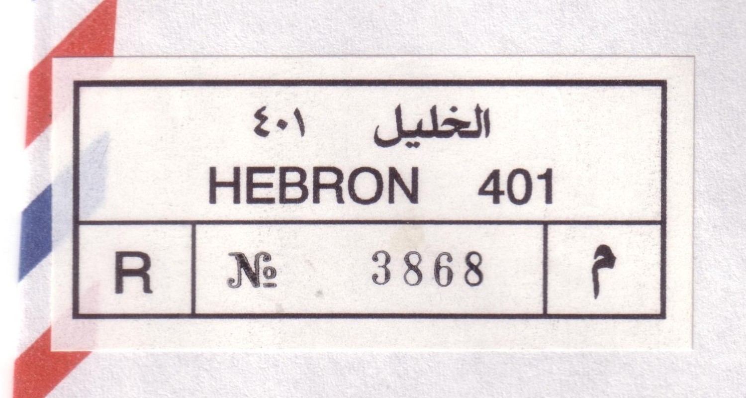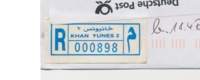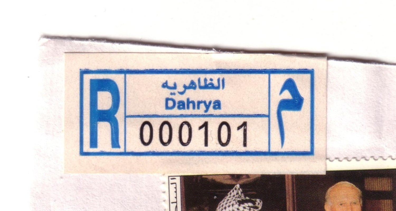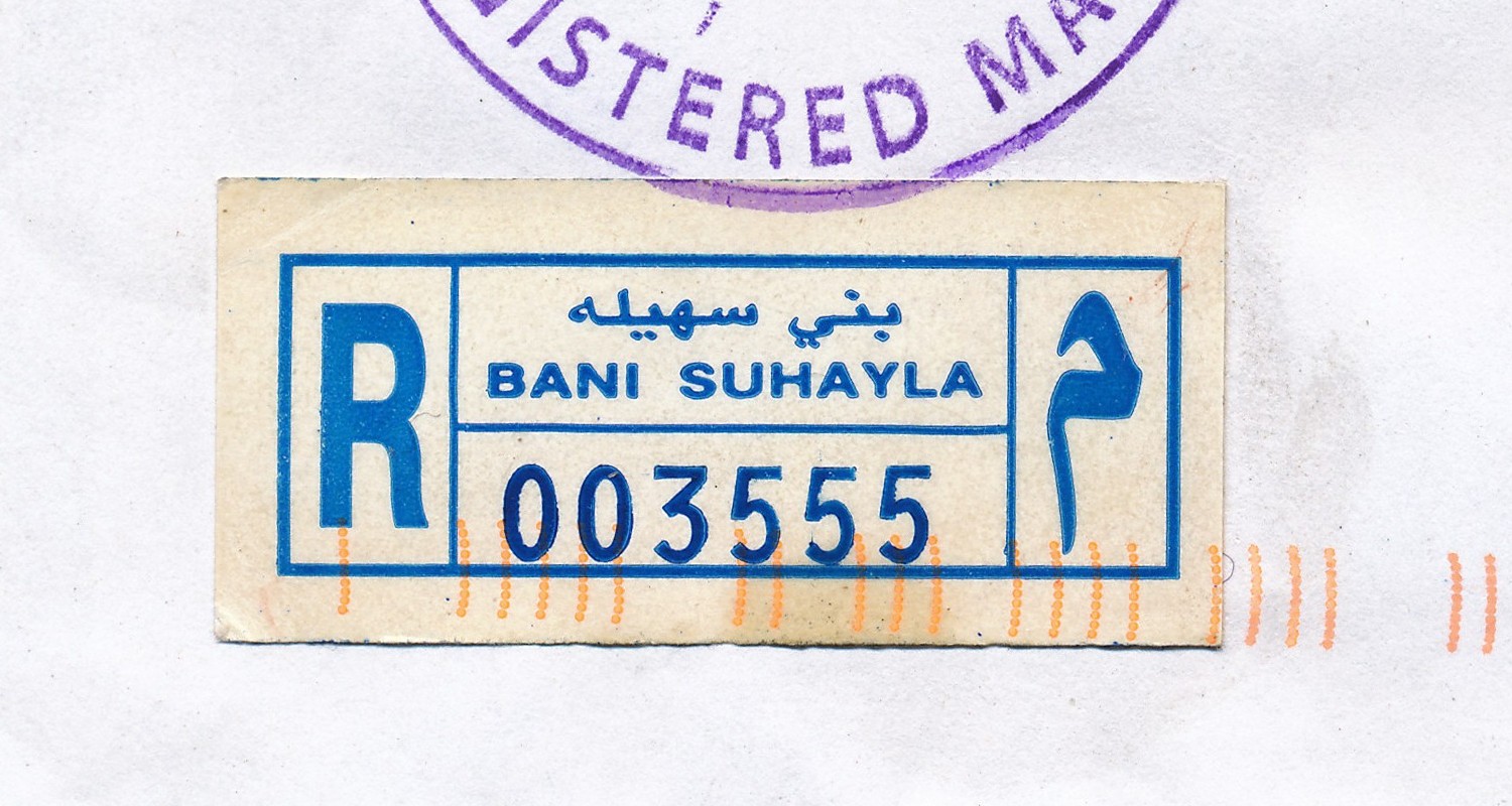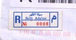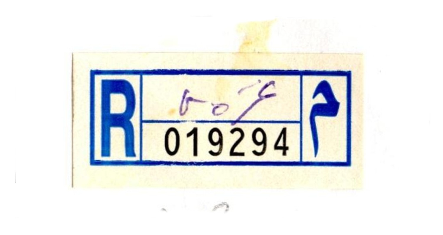 Special markings or labels for "Advice of Delivery" (avis de réception) service are naturally more rare than registration markings. An example for a handwritten marking "AR" (Gaza 8, August 2006) is shown on the right, together with the handstamp that should be available at most post offices. Below front and reverse side of form NB112 (ن ب ١١٢) and a cover from Halhul 2006.