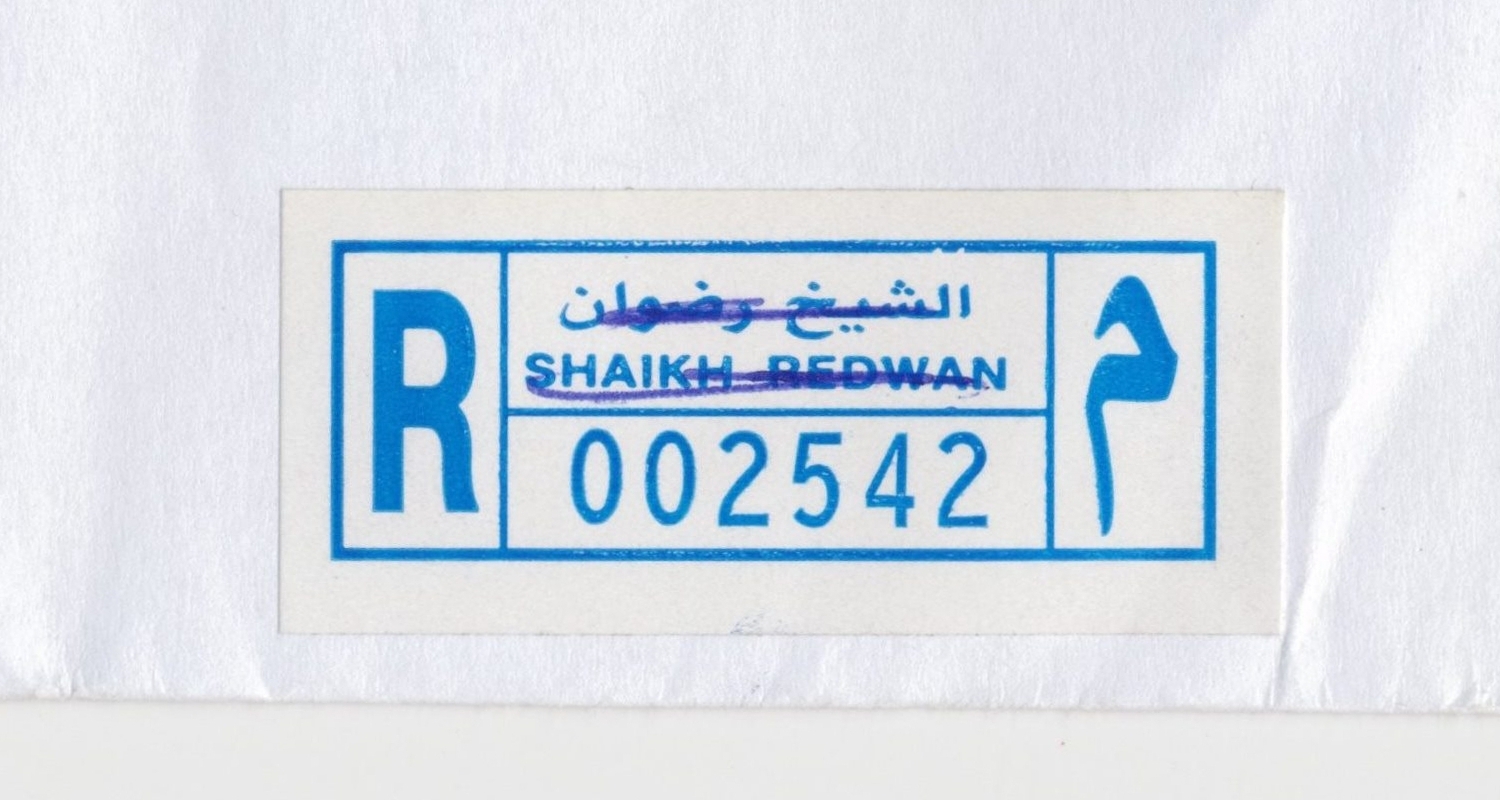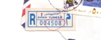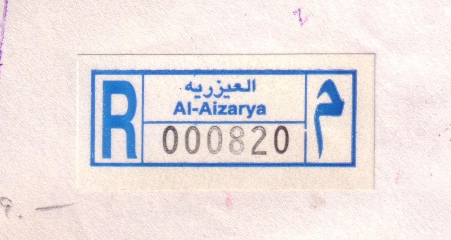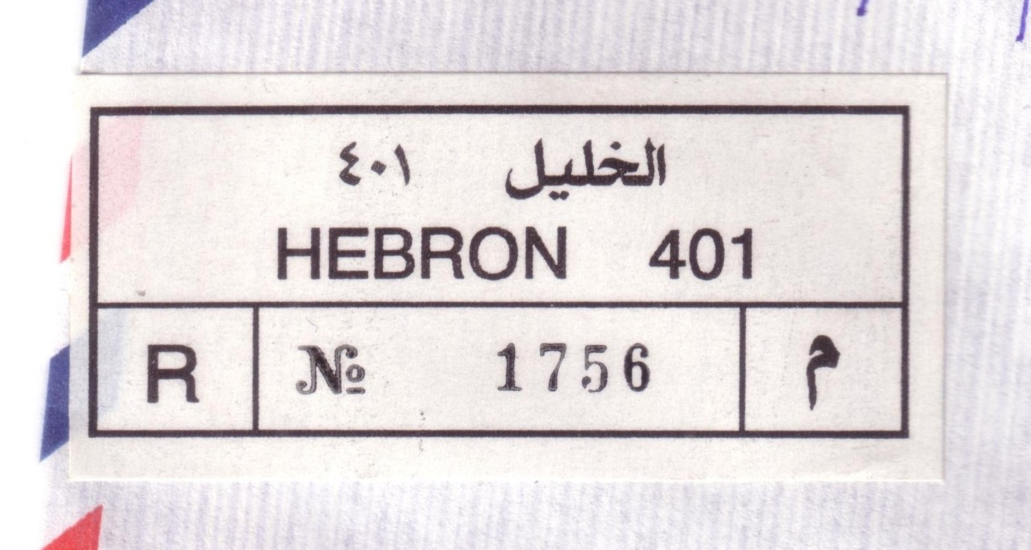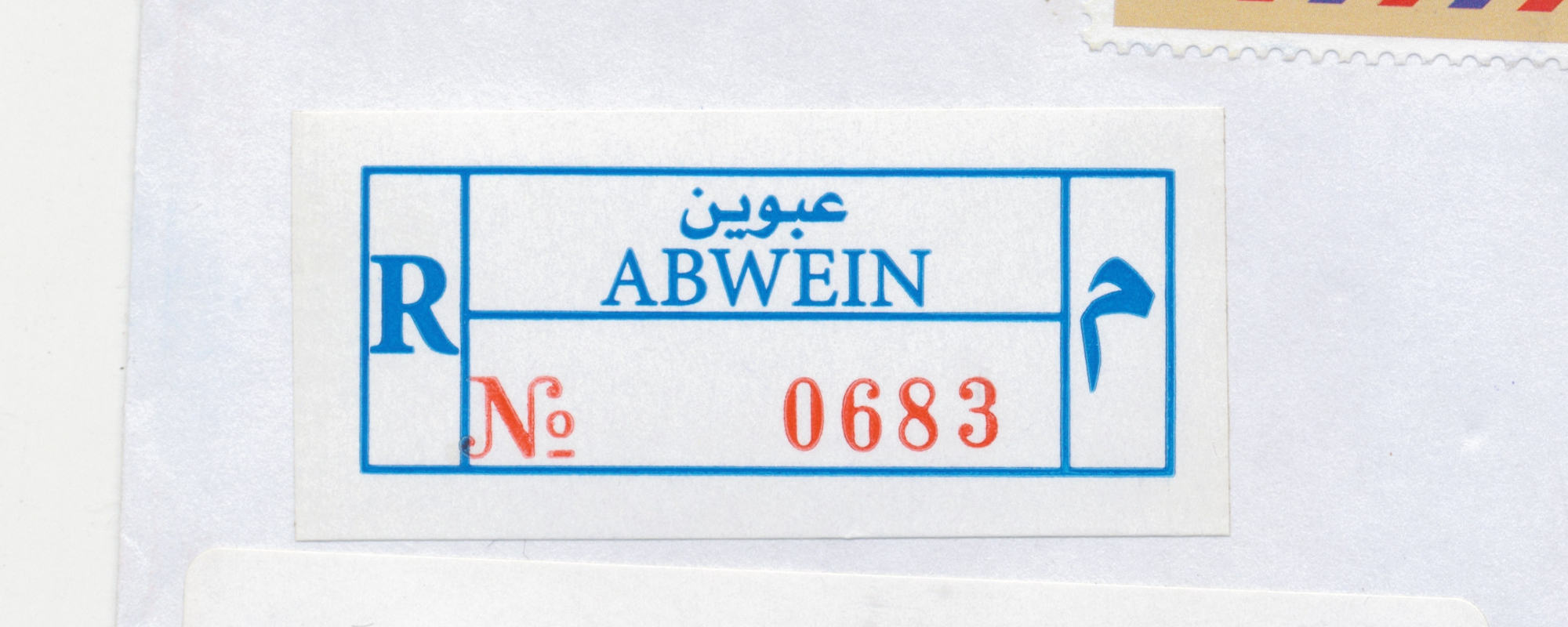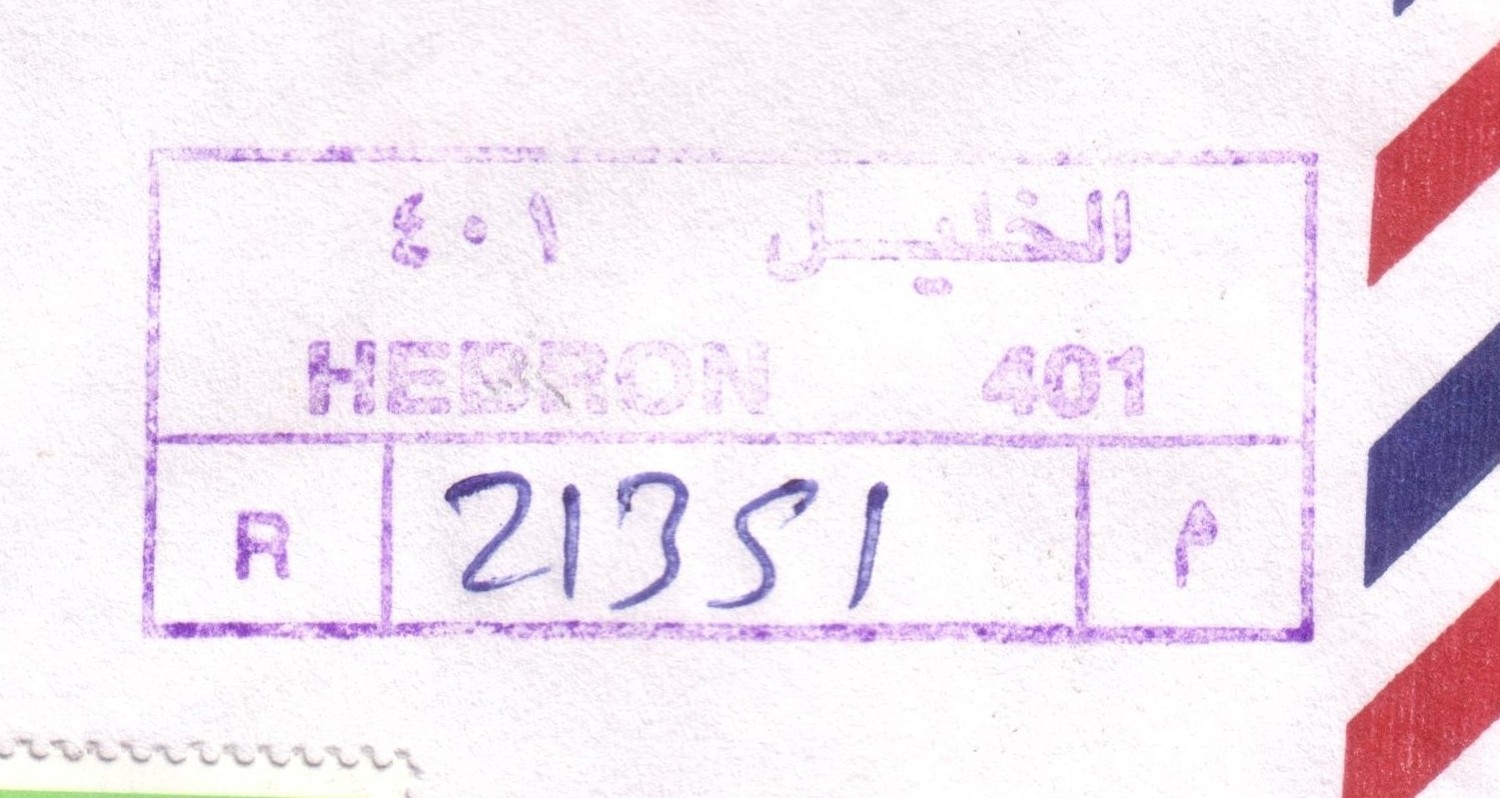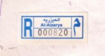 Special markings or labels for "Advice of Delivery" (avis de réception) service are naturally more rare than registration markings. An example for a handwritten marking "AR" (Gaza 8, August 2006) is shown on the right, together with the handstamp that should be available at most post offices. Below front and reverse side of form NB112 (ن ب ١١٢) and a cover from Halhul 2006.