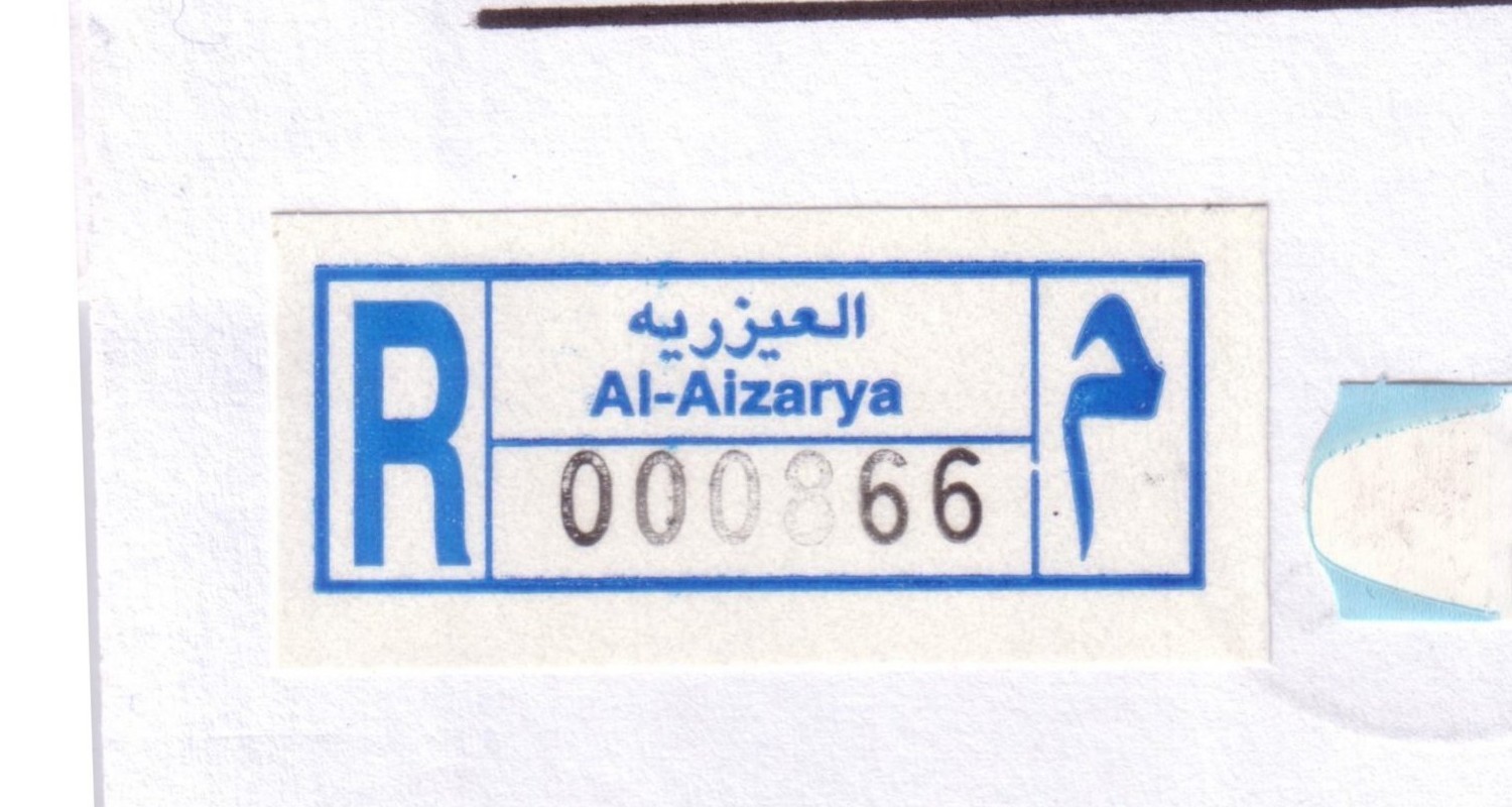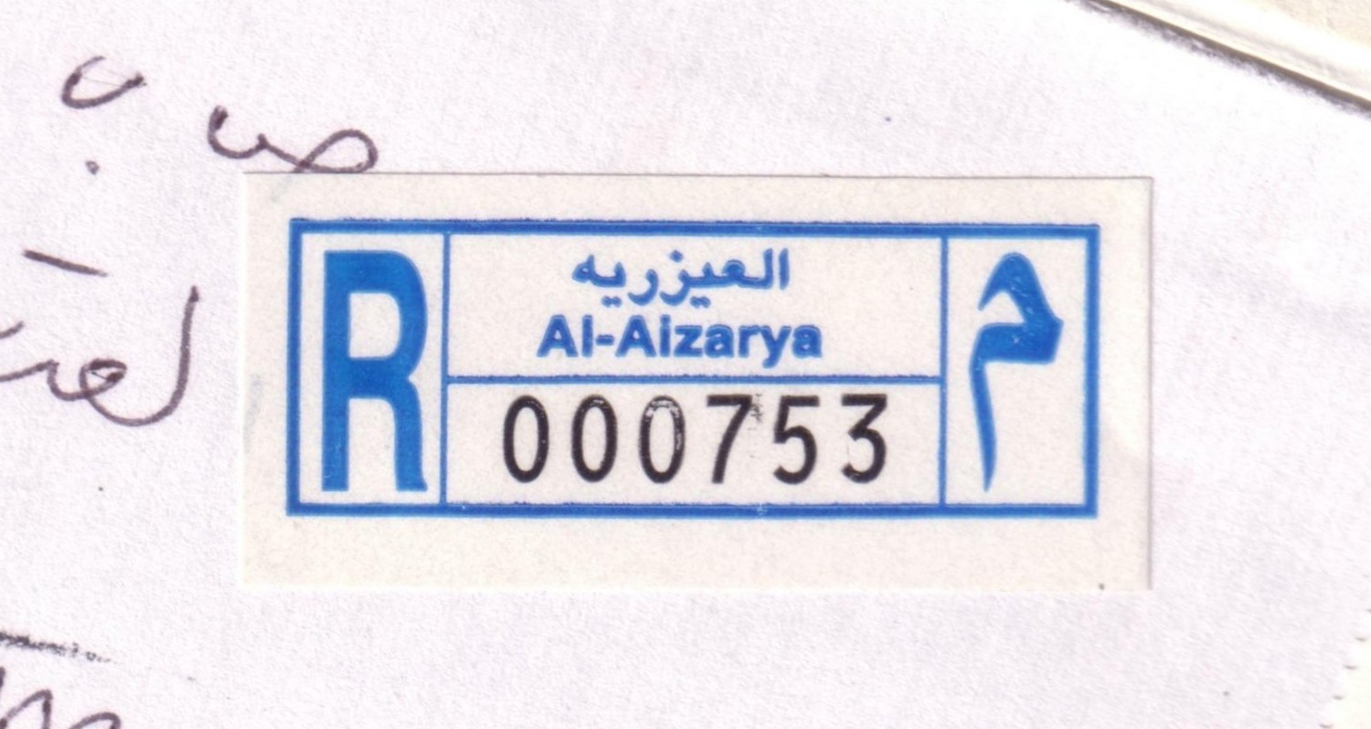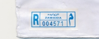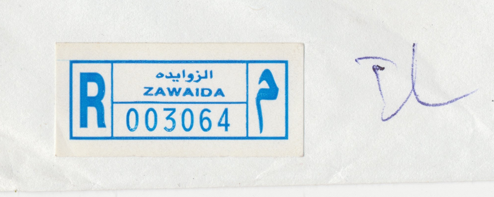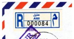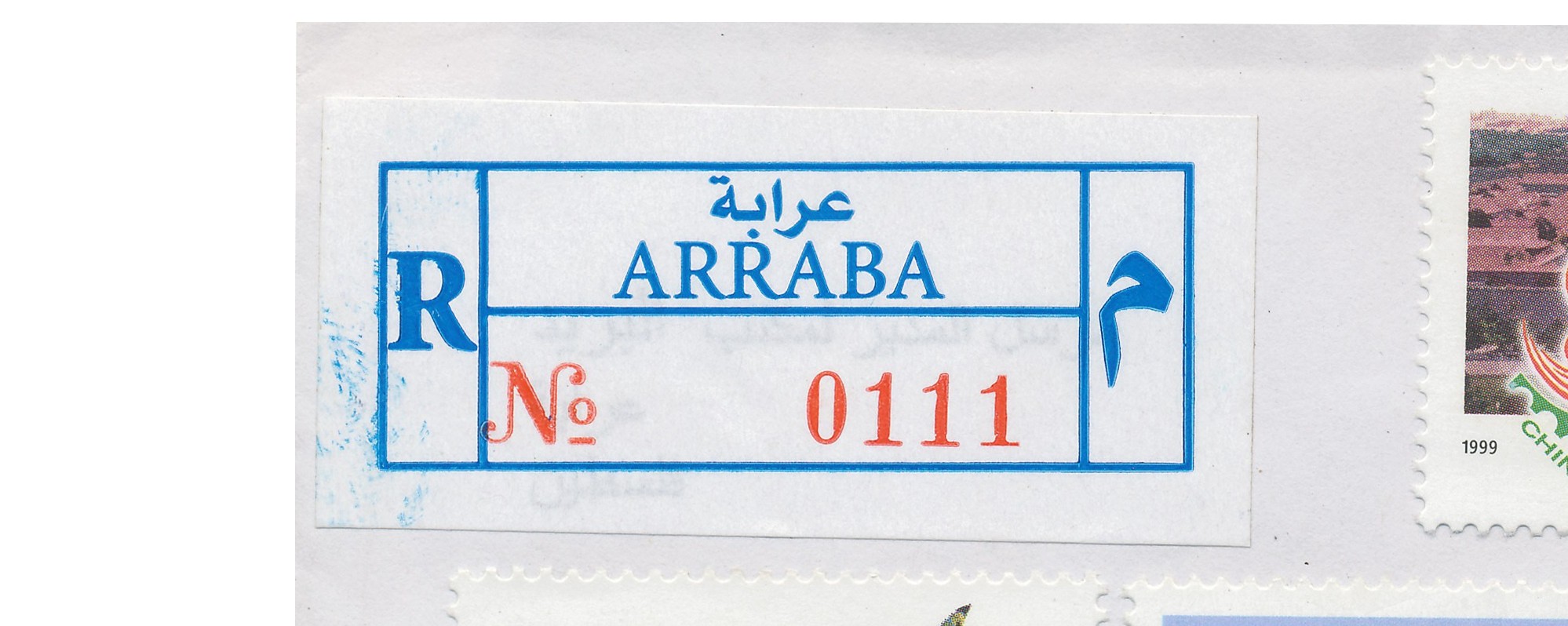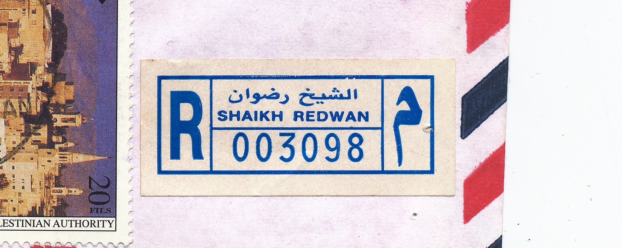 Special markings or labels for "Advice of Delivery" (avis de réception) service are naturally more rare than registration markings. An example for a handwritten marking "AR" (Gaza 8, August 2006) is shown on the right, together with the handstamp that should be available at most post offices. Below front and reverse side of form NB112 (ن ب ١١٢) and a cover from Halhul 2006.