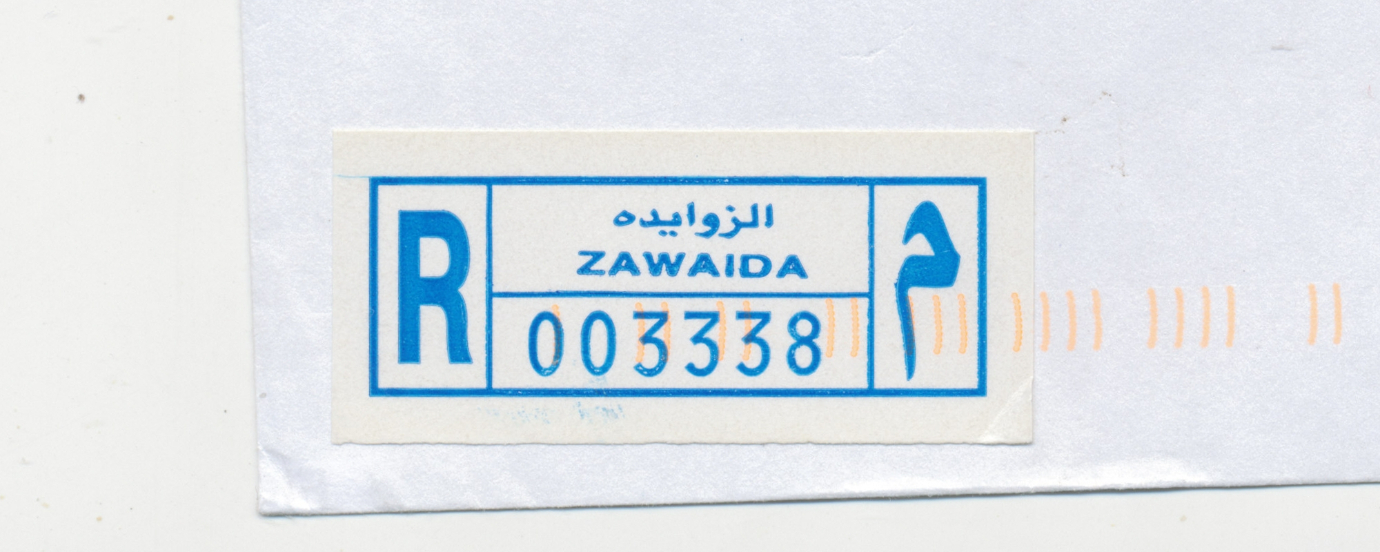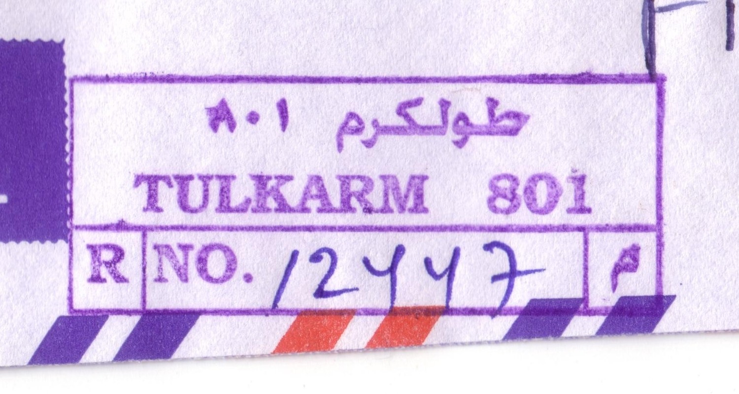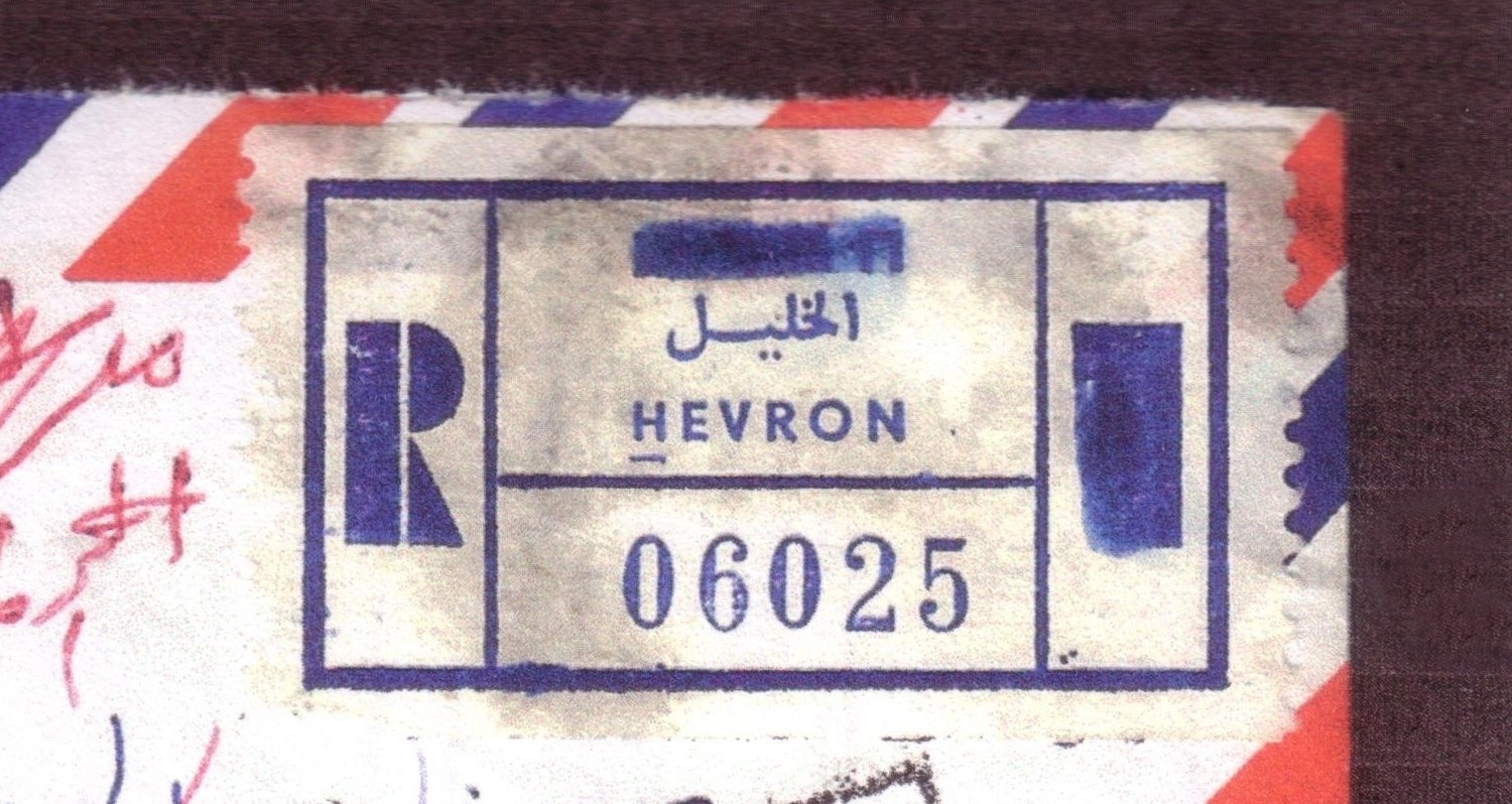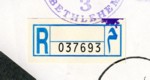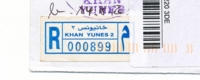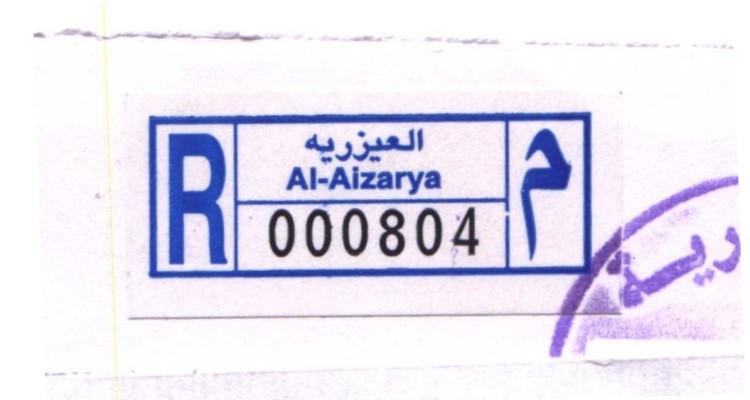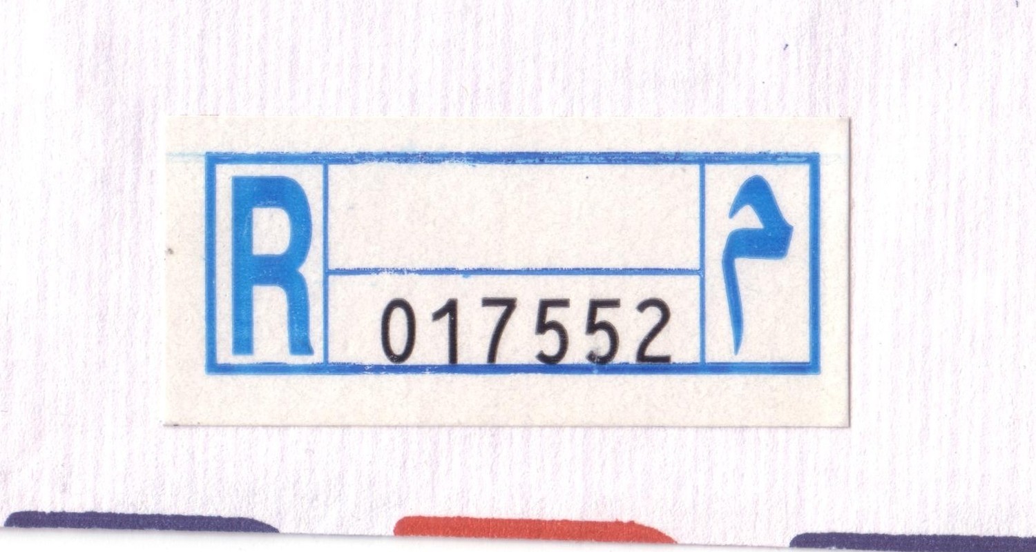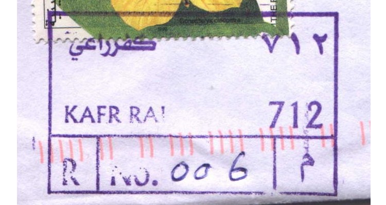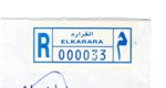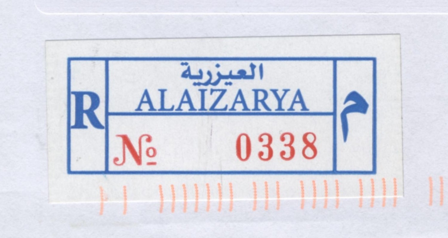 Special markings or labels for "Advice of Delivery" (avis de réception) service are naturally more rare than registration markings. An example for a handwritten marking "AR" (Gaza 8, August 2006) is shown on the right, together with the handstamp that should be available at most post offices. Below front and reverse side of form NB112 (ن ب ١١٢) and a cover from Halhul 2006.