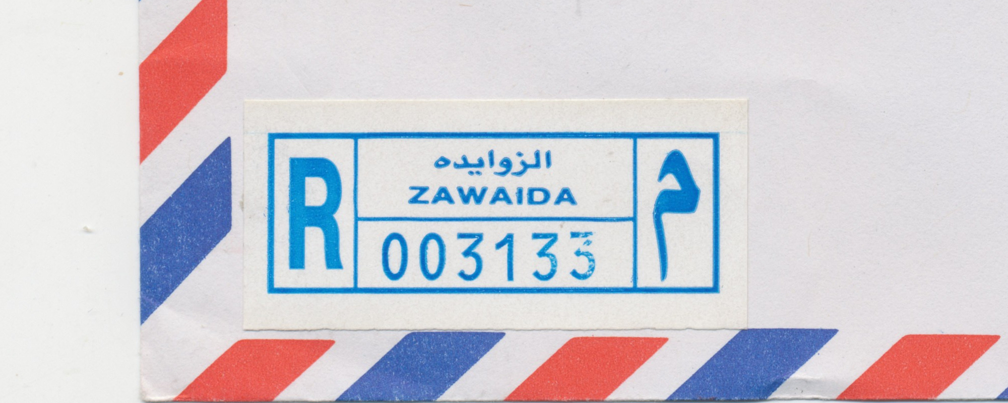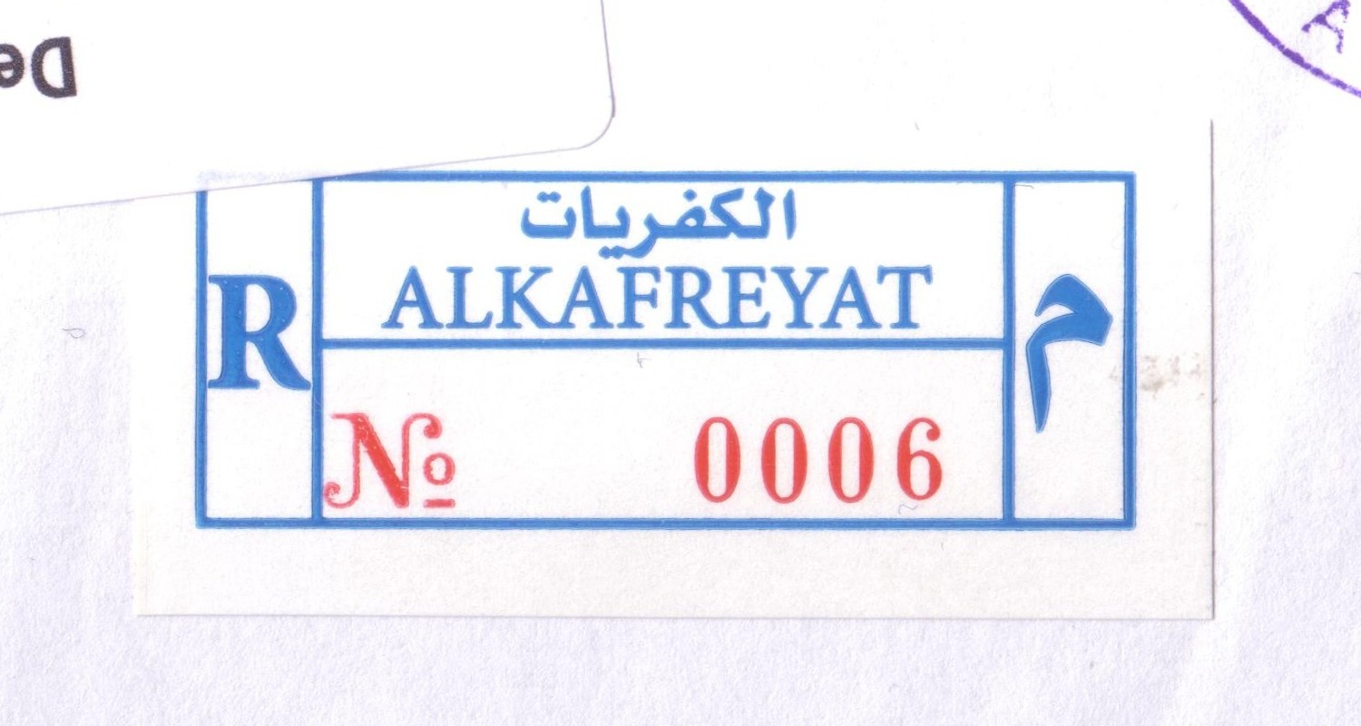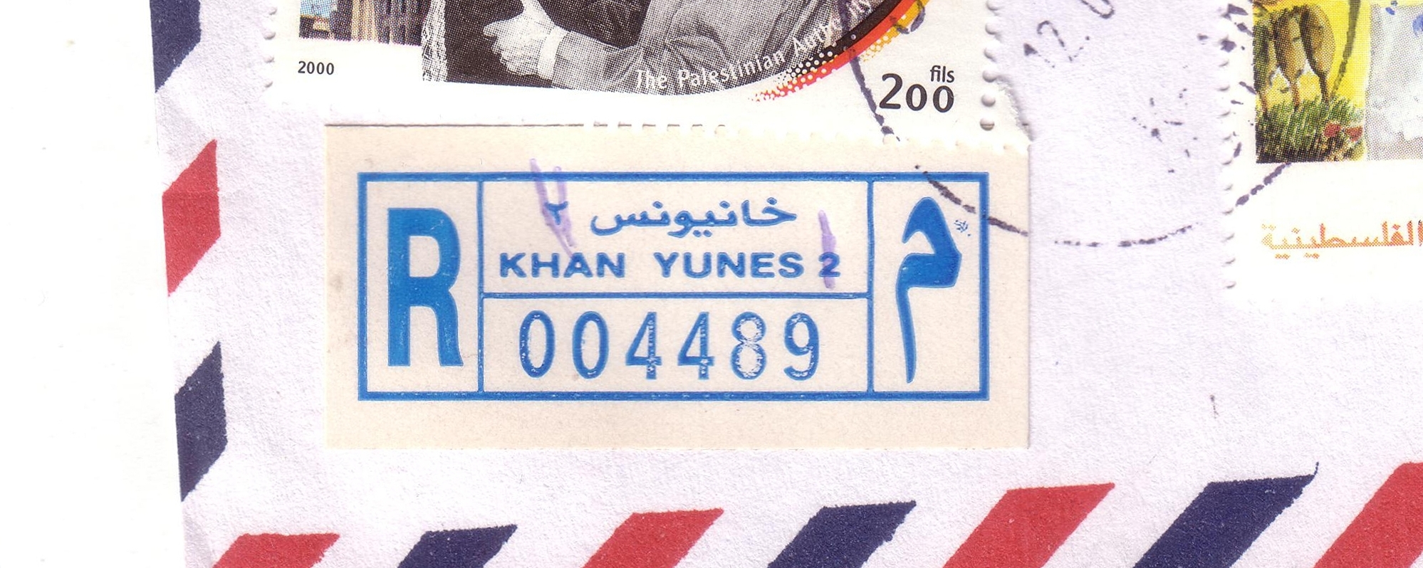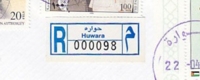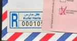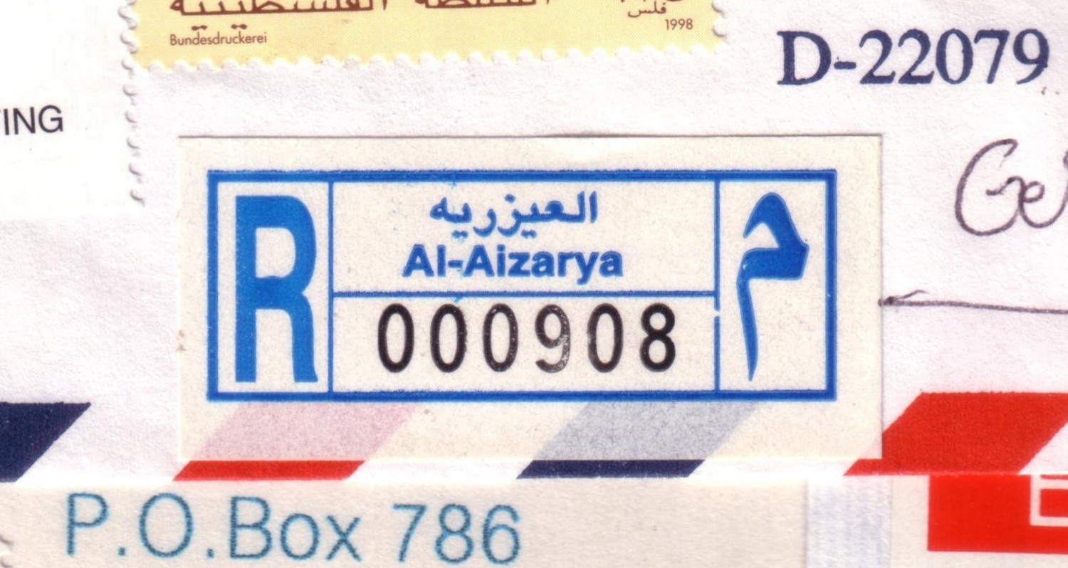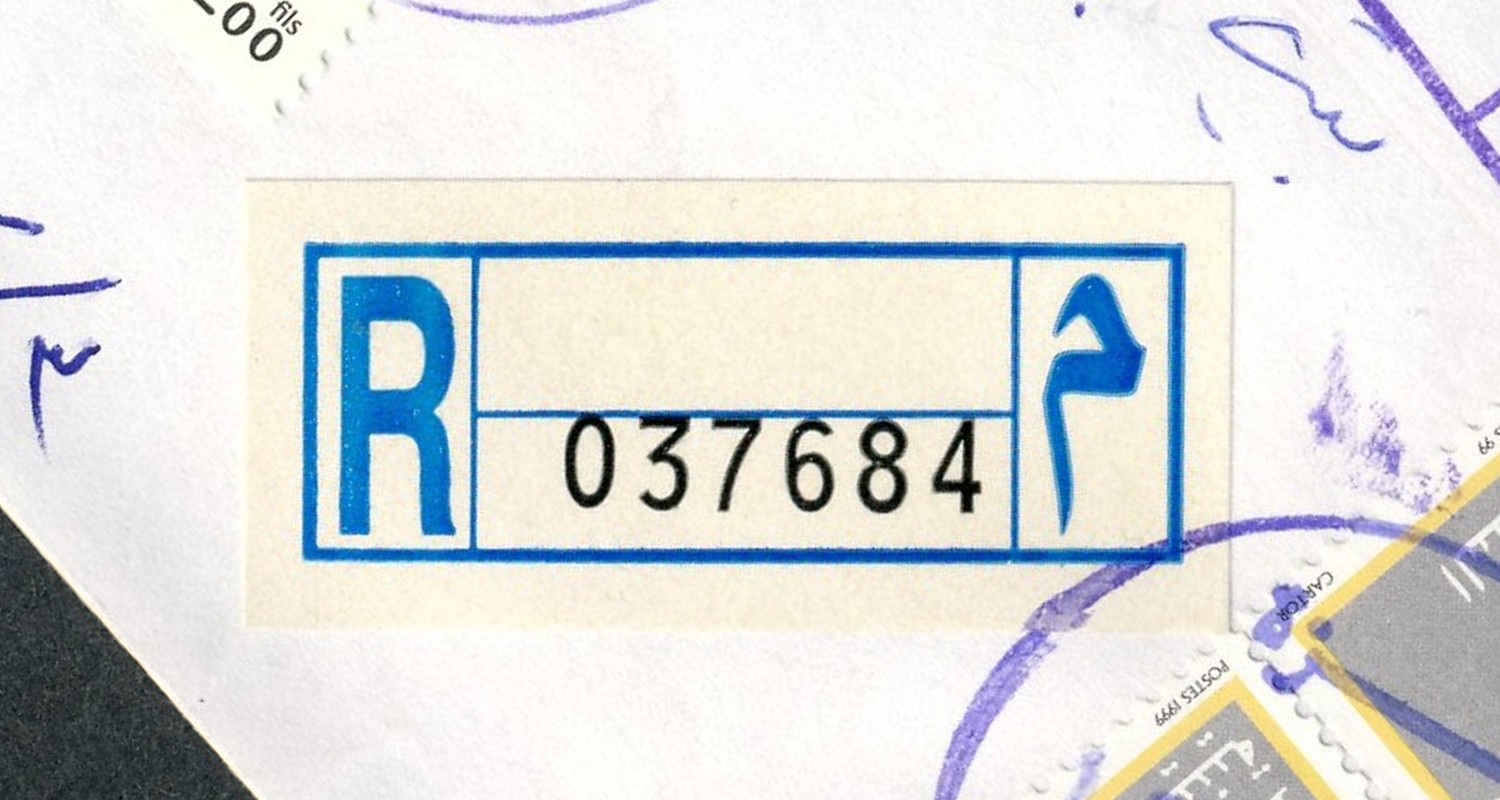 Special markings or labels for "Advice of Delivery" (avis de réception) service are naturally more rare than registration markings. An example for a handwritten marking "AR" (Gaza 8, August 2006) is shown on the right, together with the handstamp that should be available at most post offices. Below front and reverse side of form NB112 (ن ب ١١٢) and a cover from Halhul 2006.