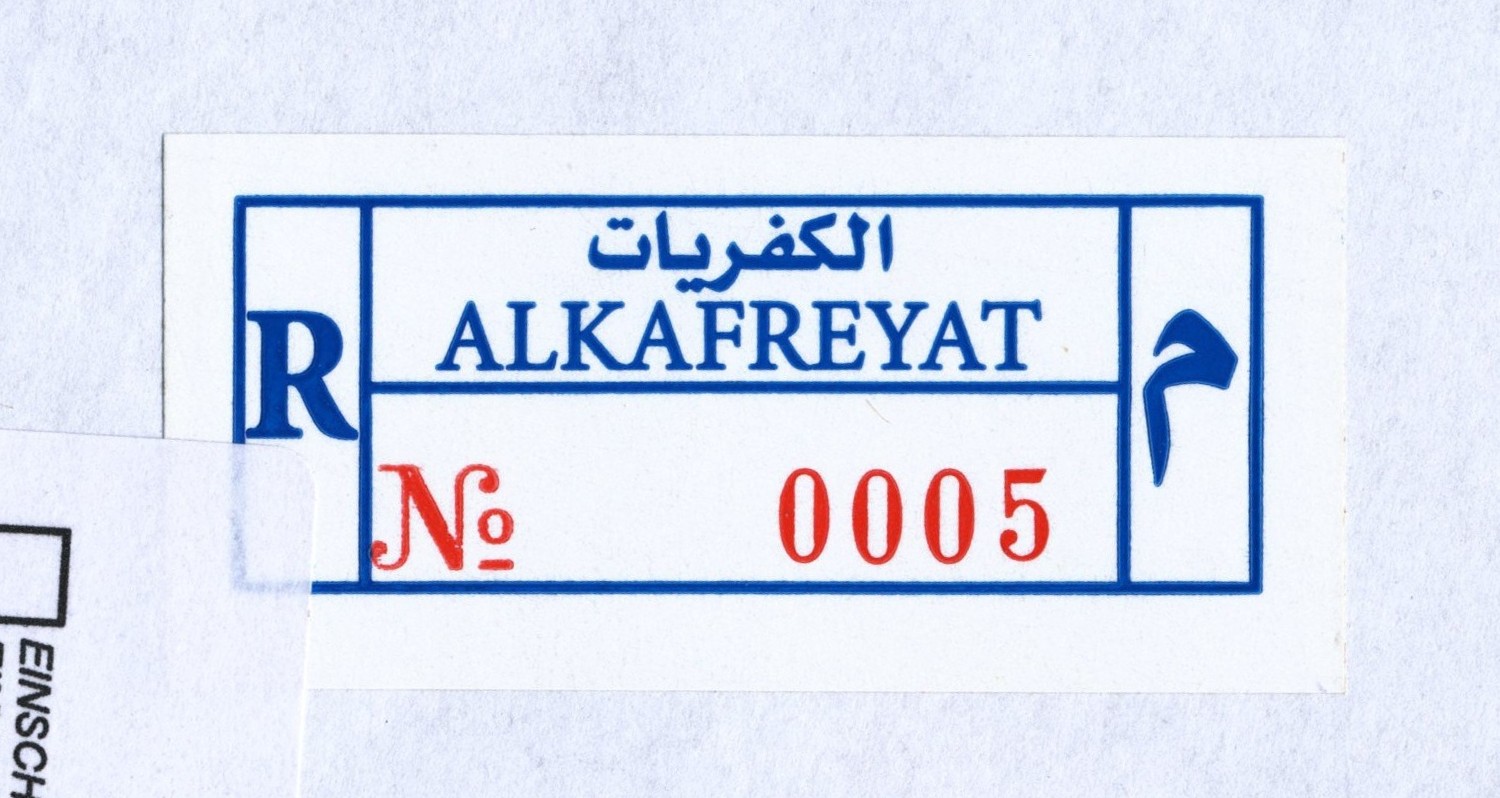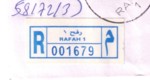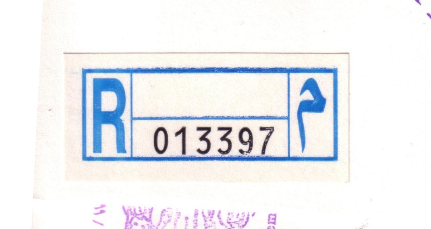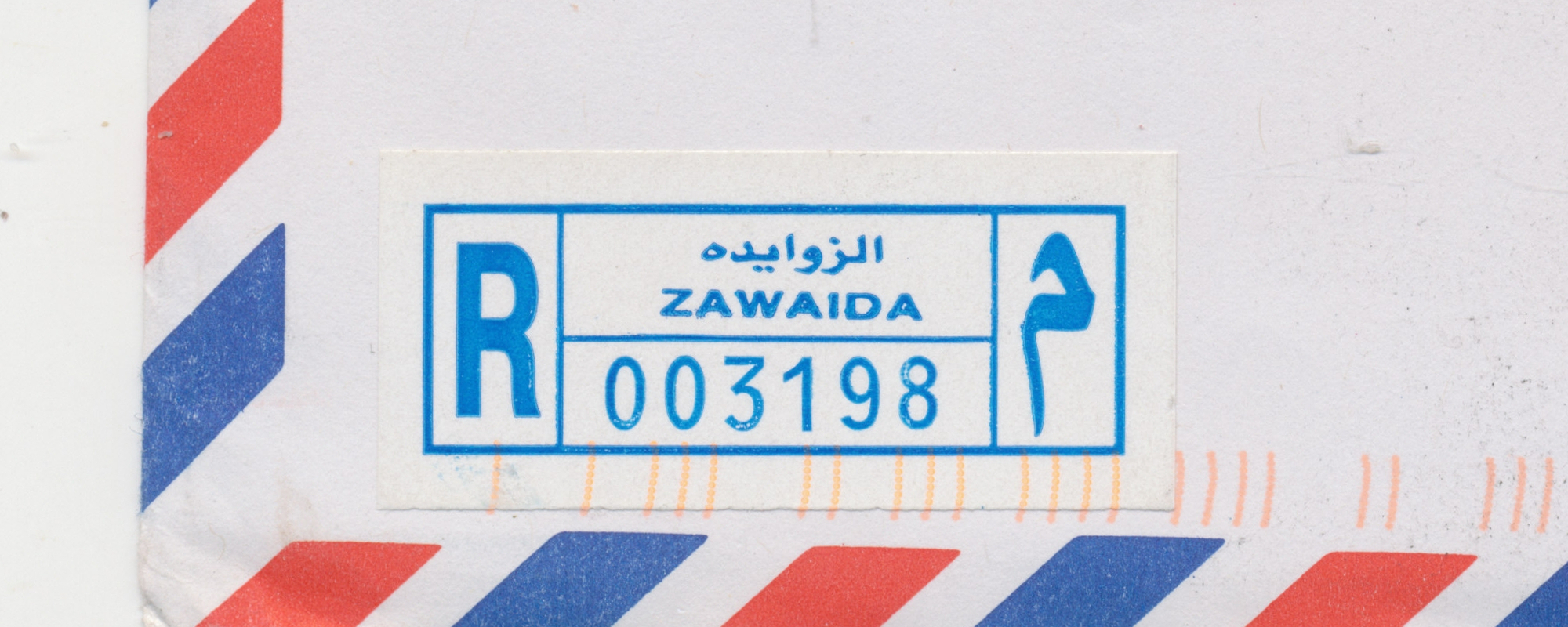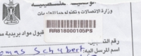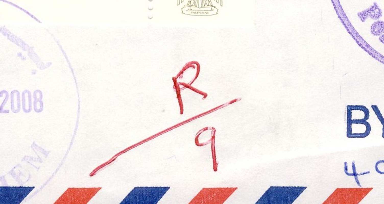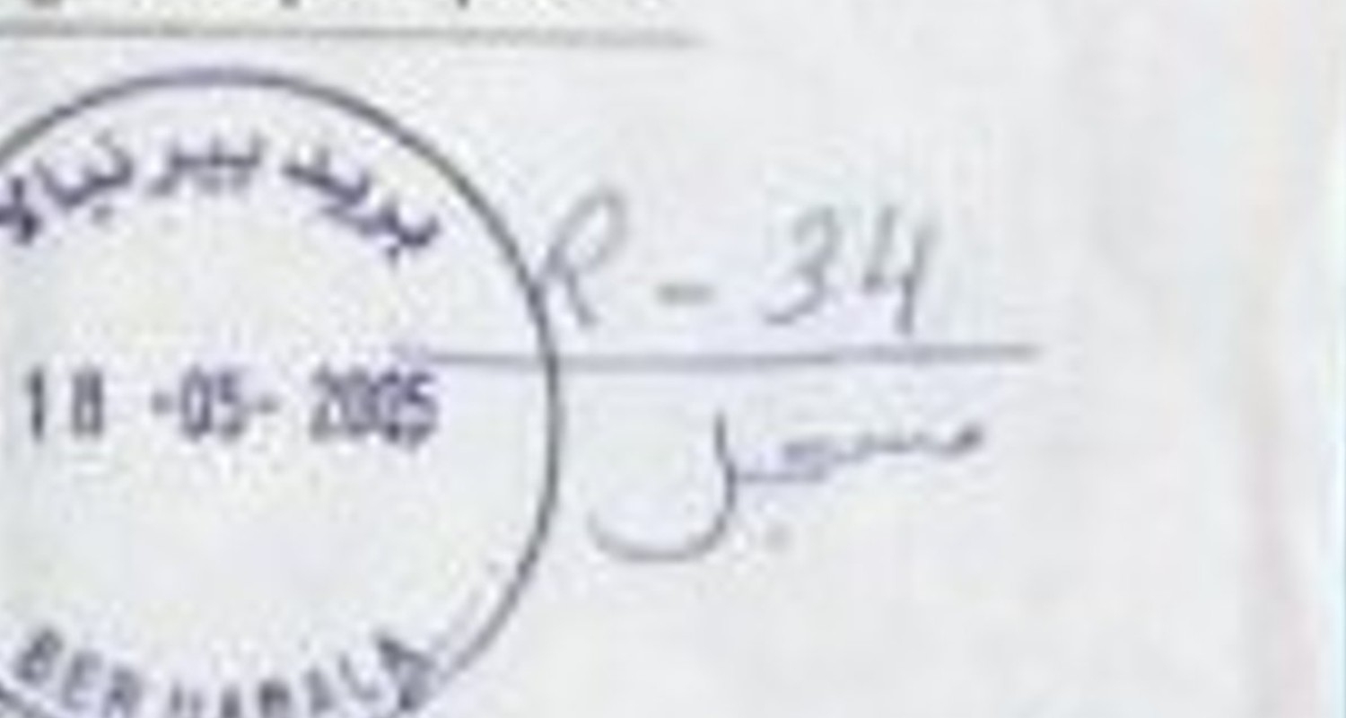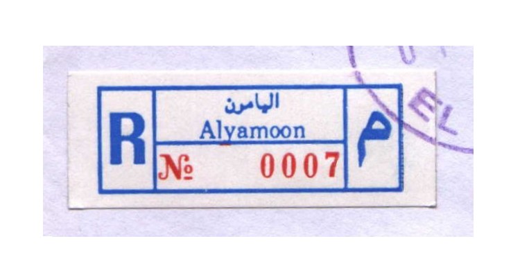 Special markings or labels for "Advice of Delivery" (avis de réception) service are naturally more rare than registration markings. An example for a handwritten marking "AR" (Gaza 8, August 2006) is shown on the right, together with the handstamp that should be available at most post offices. Below front and reverse side of form NB112 (ن ب ١١٢) and a cover from Halhul 2006.