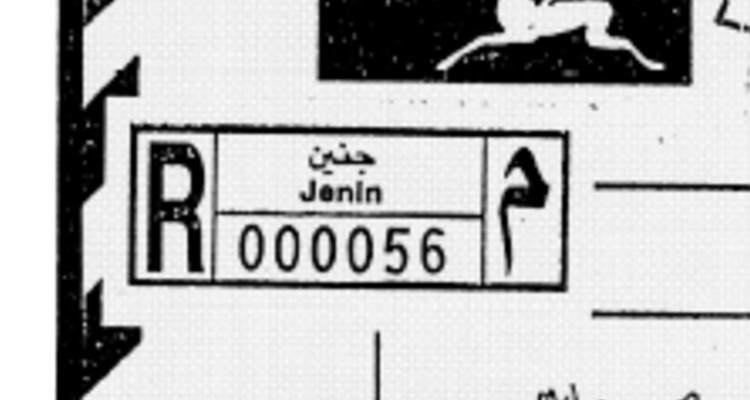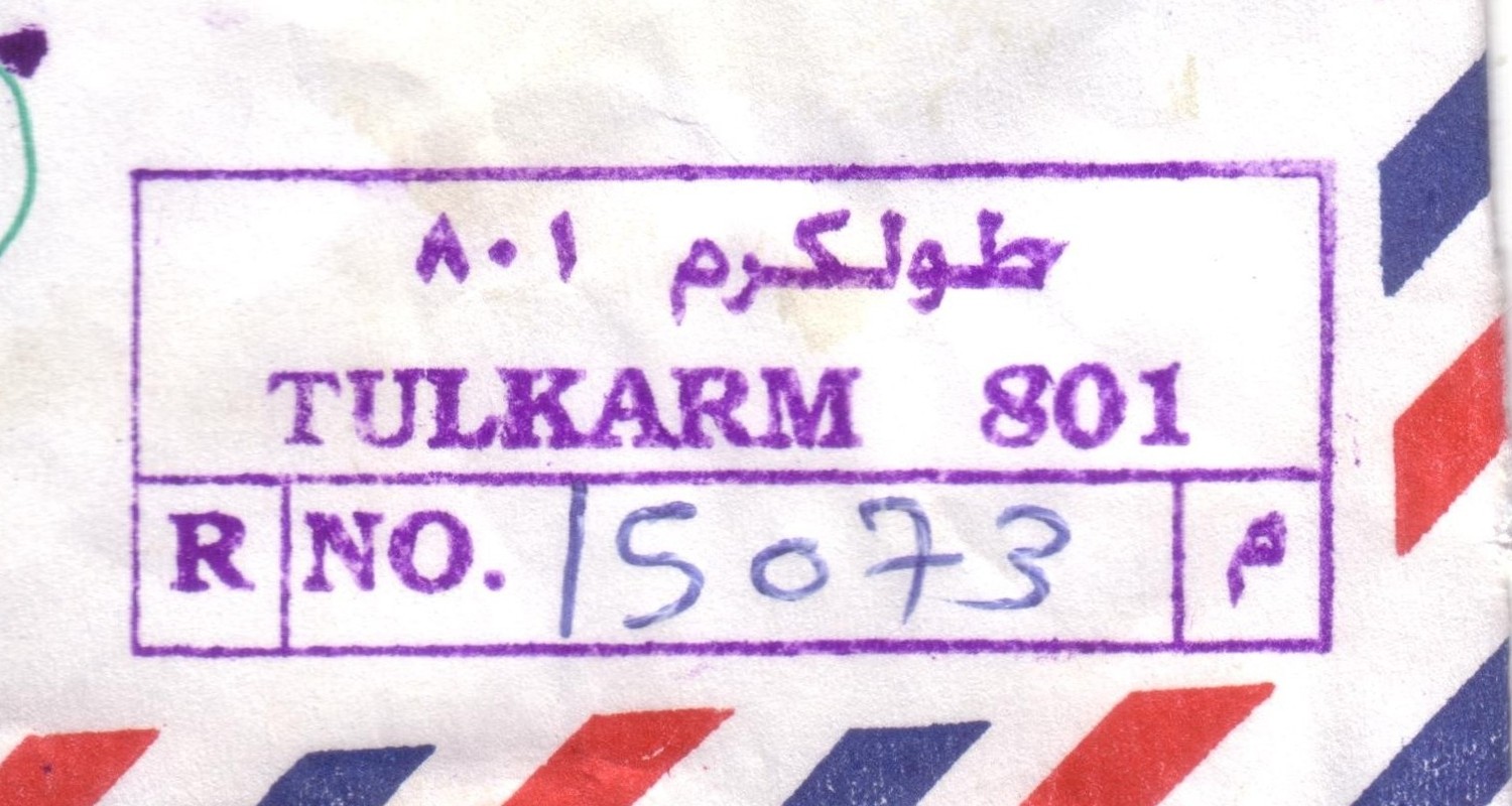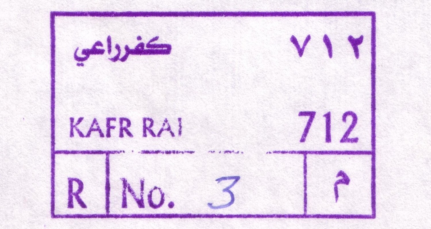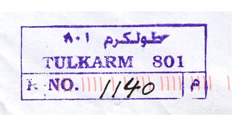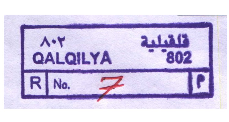 Note the variations in box size and/or font for Jenin (47.2x28.1mm), Kafr Rai (46.7x29.2mm), Qafen (49.5x19.6mm), Sourief (48.7x21.2mm), Qalqilya (51.3x18.5mm), and Tulkarm (50x19.7mm, serifed)